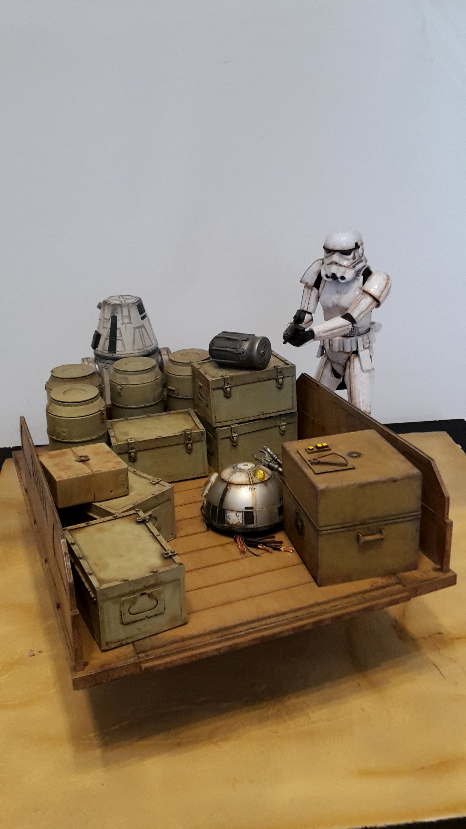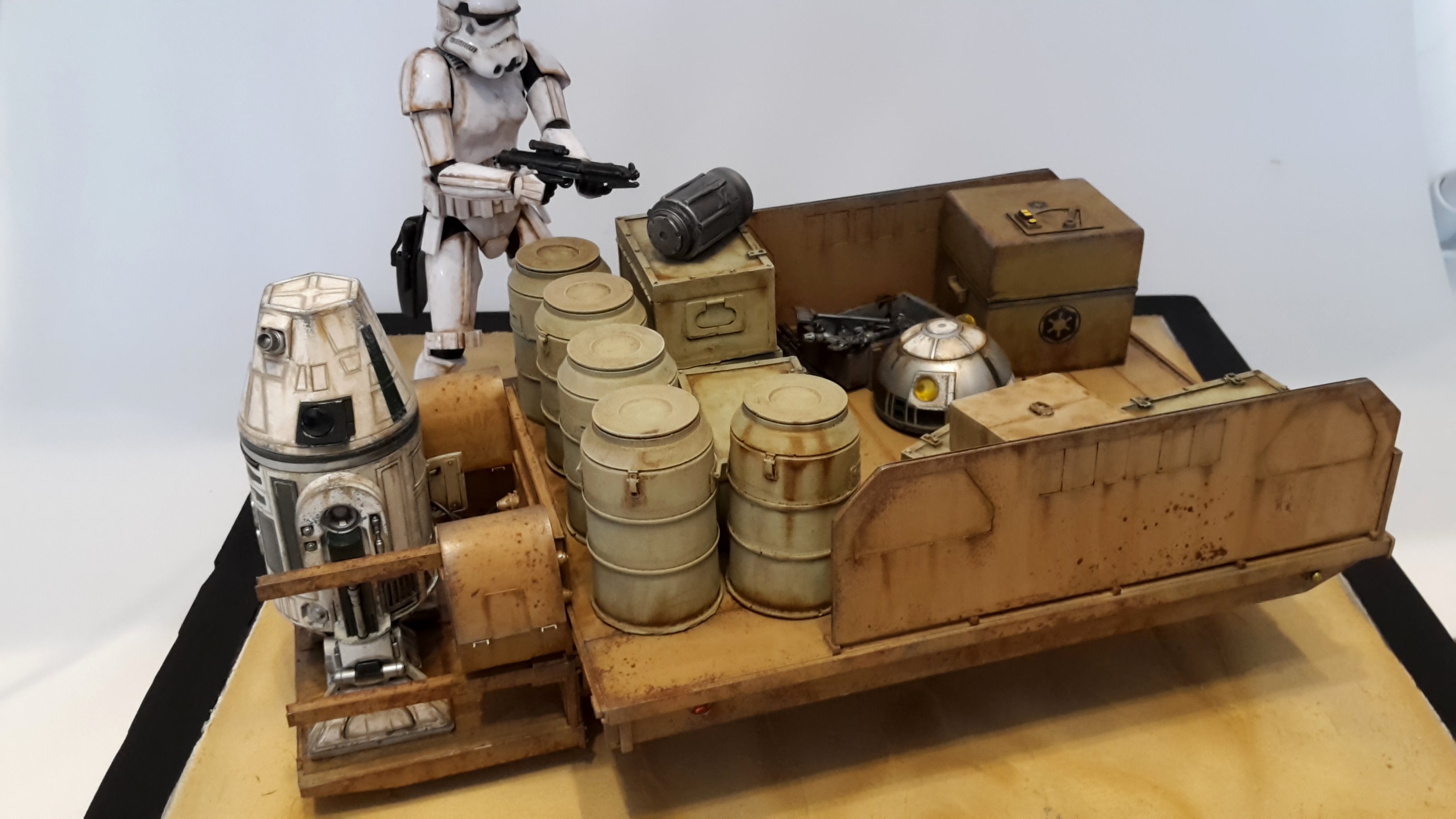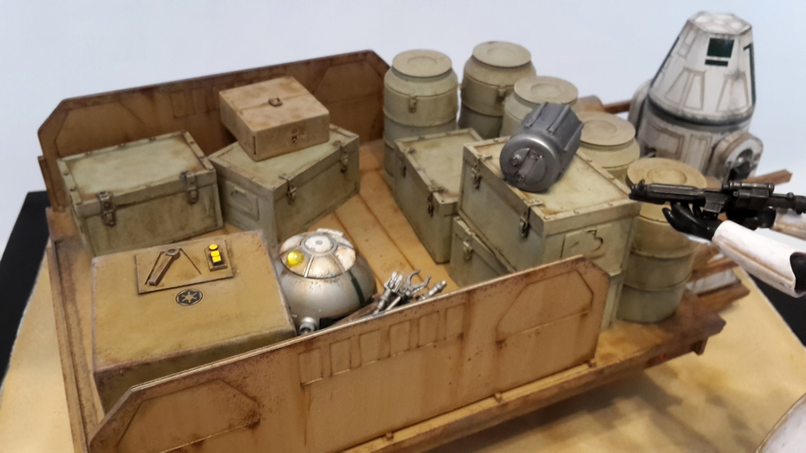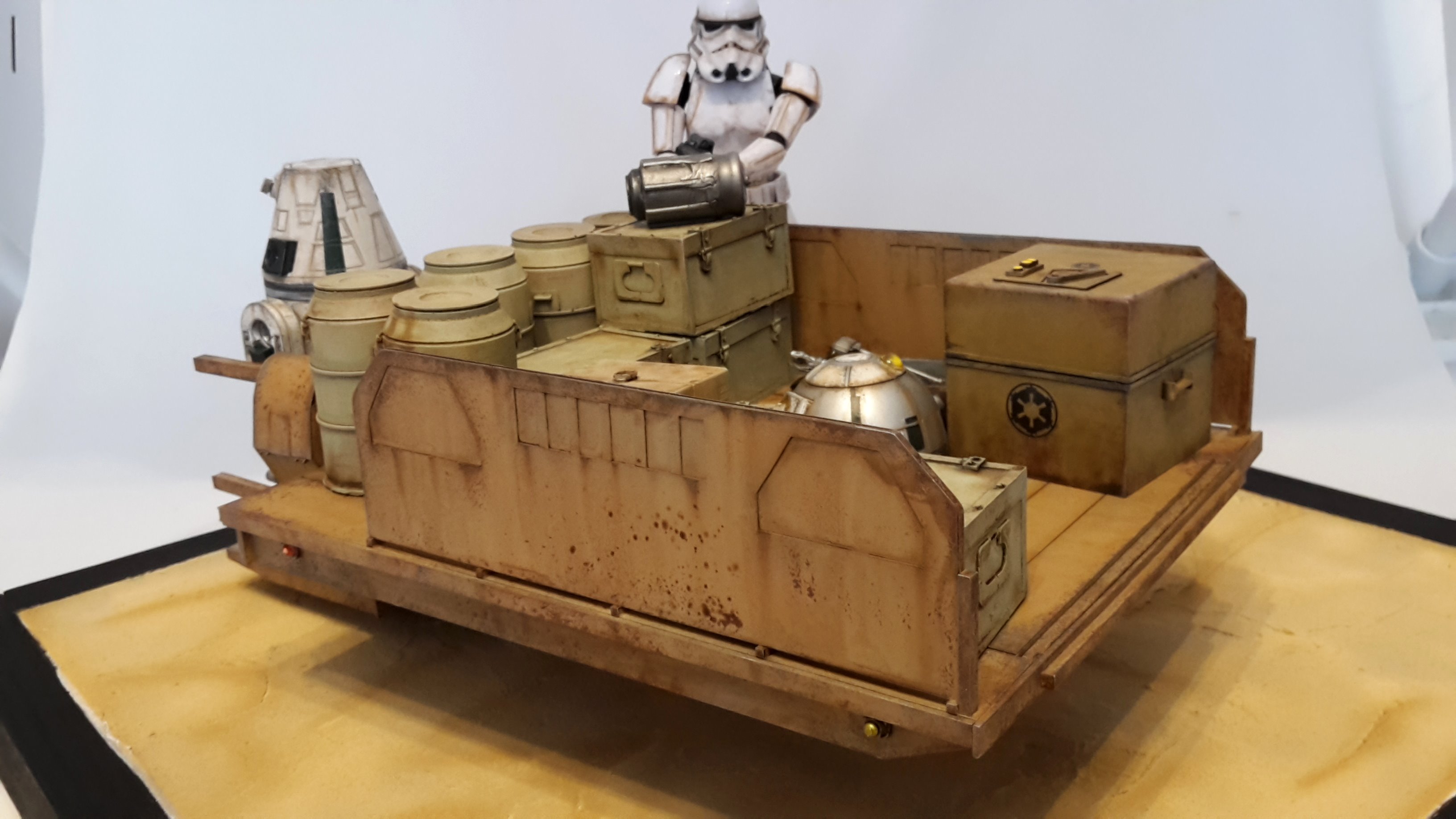 Here is my new model creation, a small transporter that you can seen in the Mandalorian series on Disney+! It’s a scratch built model, with the Droid and Stormtrooper being from the 1/12 BanDai models.