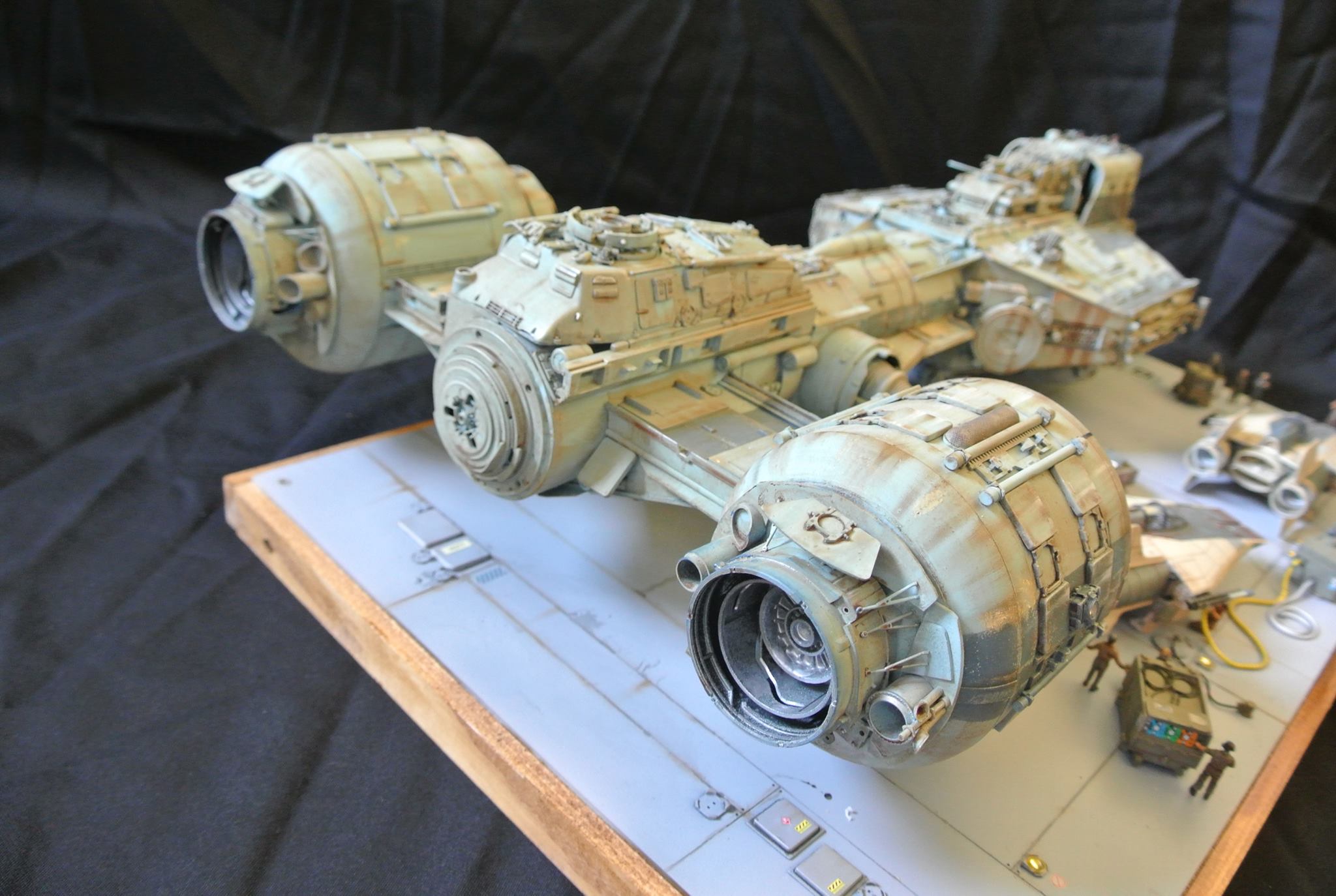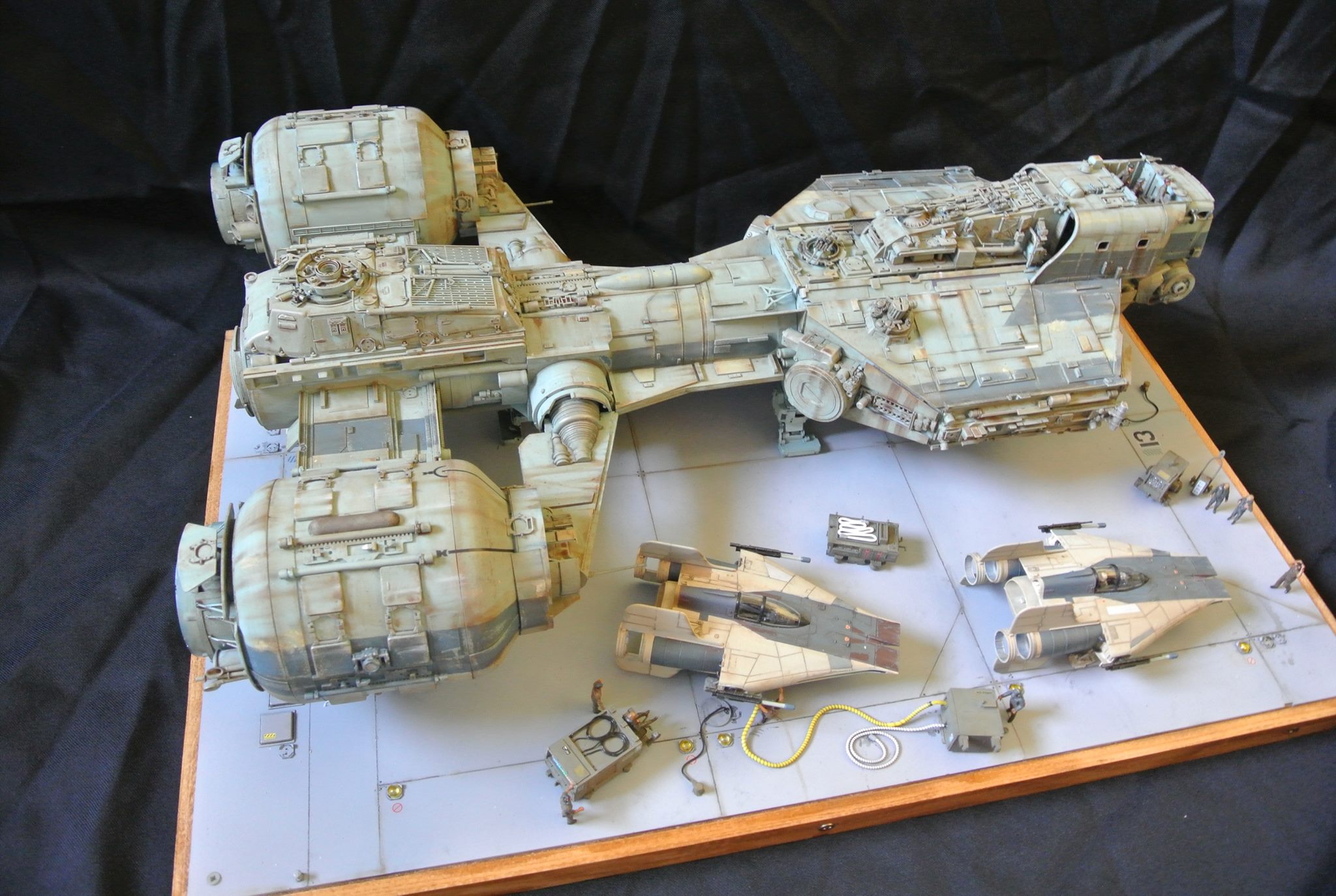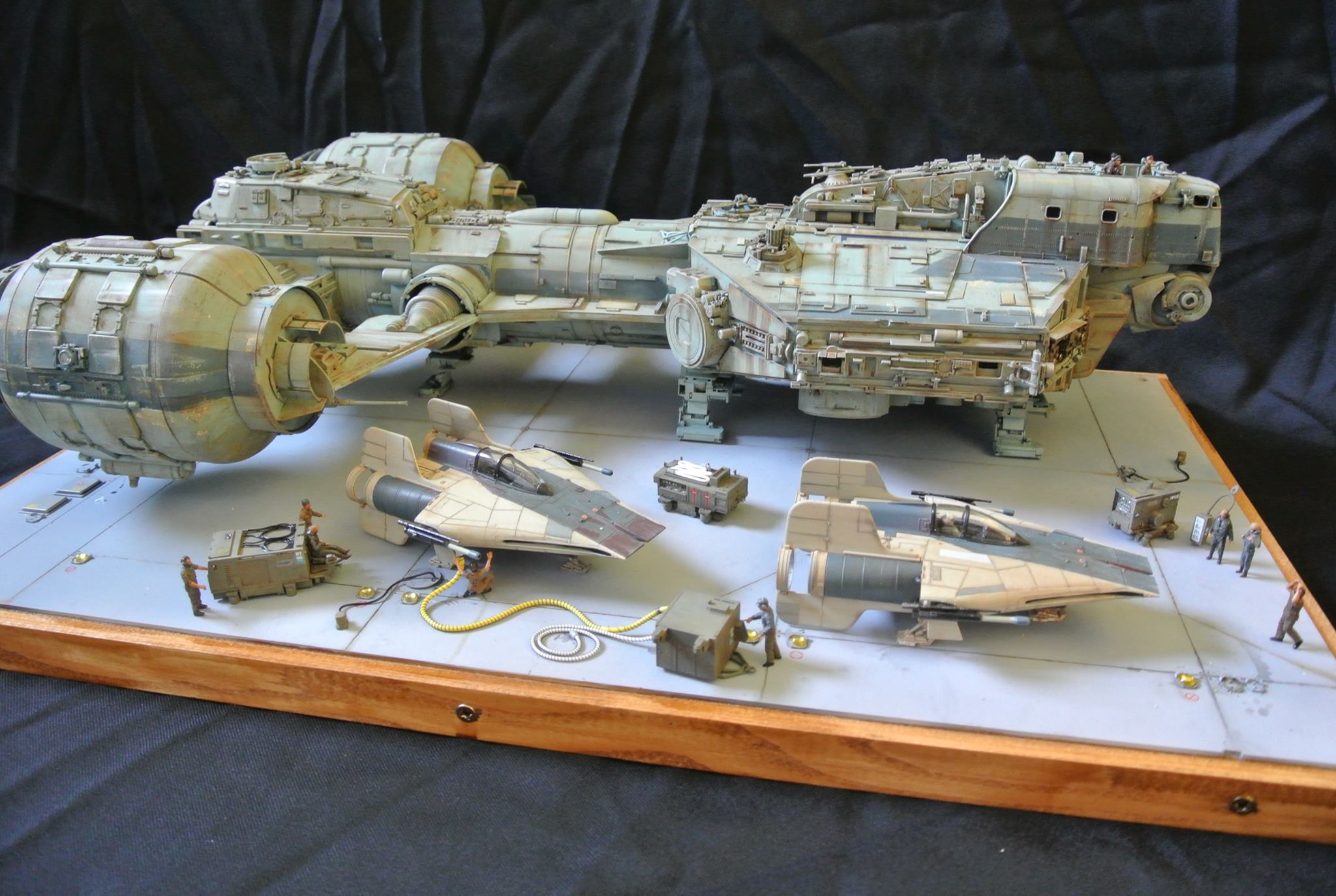 I present you my new model. It is a creation inspired by the drawings of the radiant of Doug Chiang. I integrated it into the universe Star wars…the A-Wing’s are a BandaÏ kits, and the scale is 1/72.