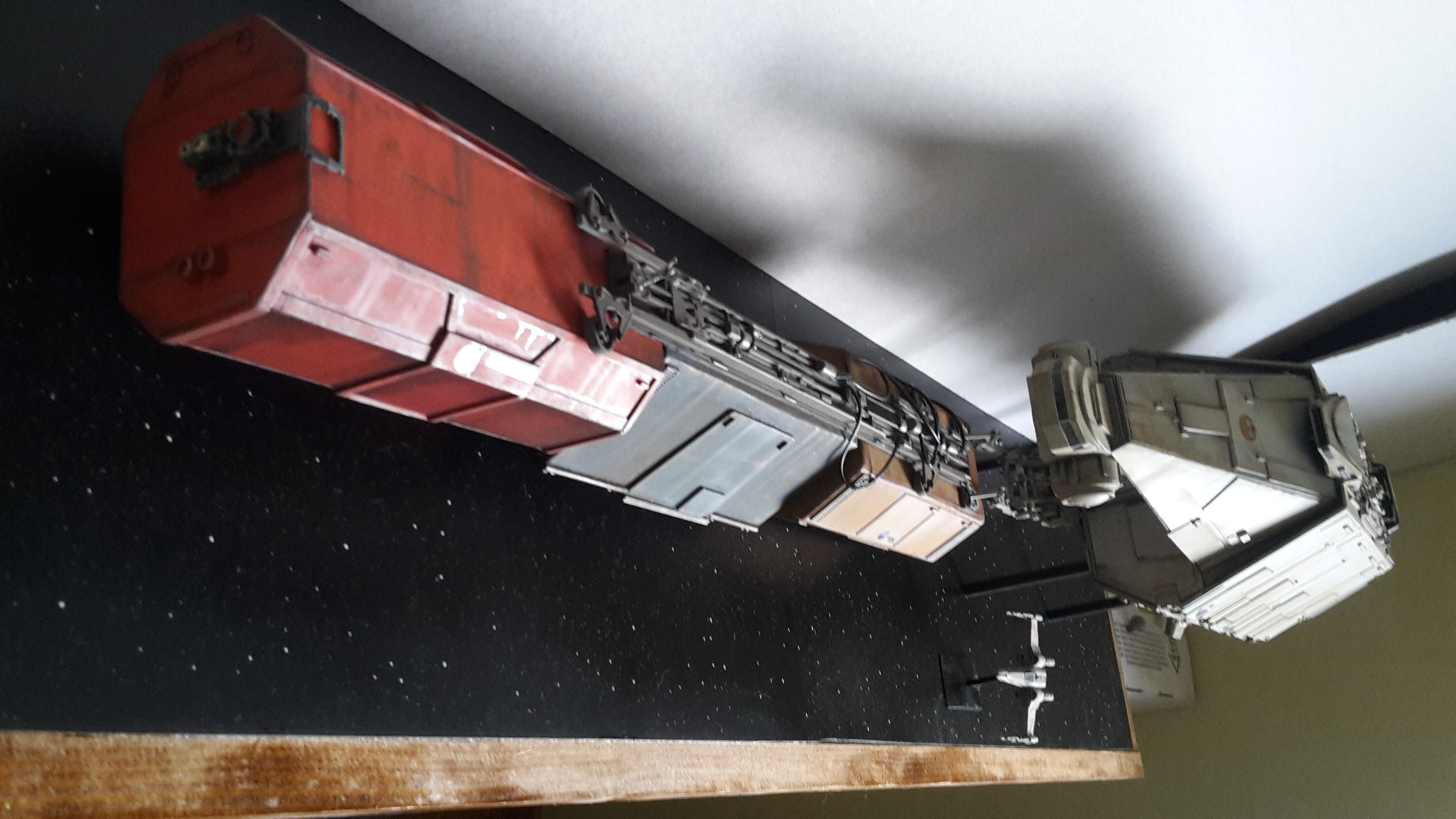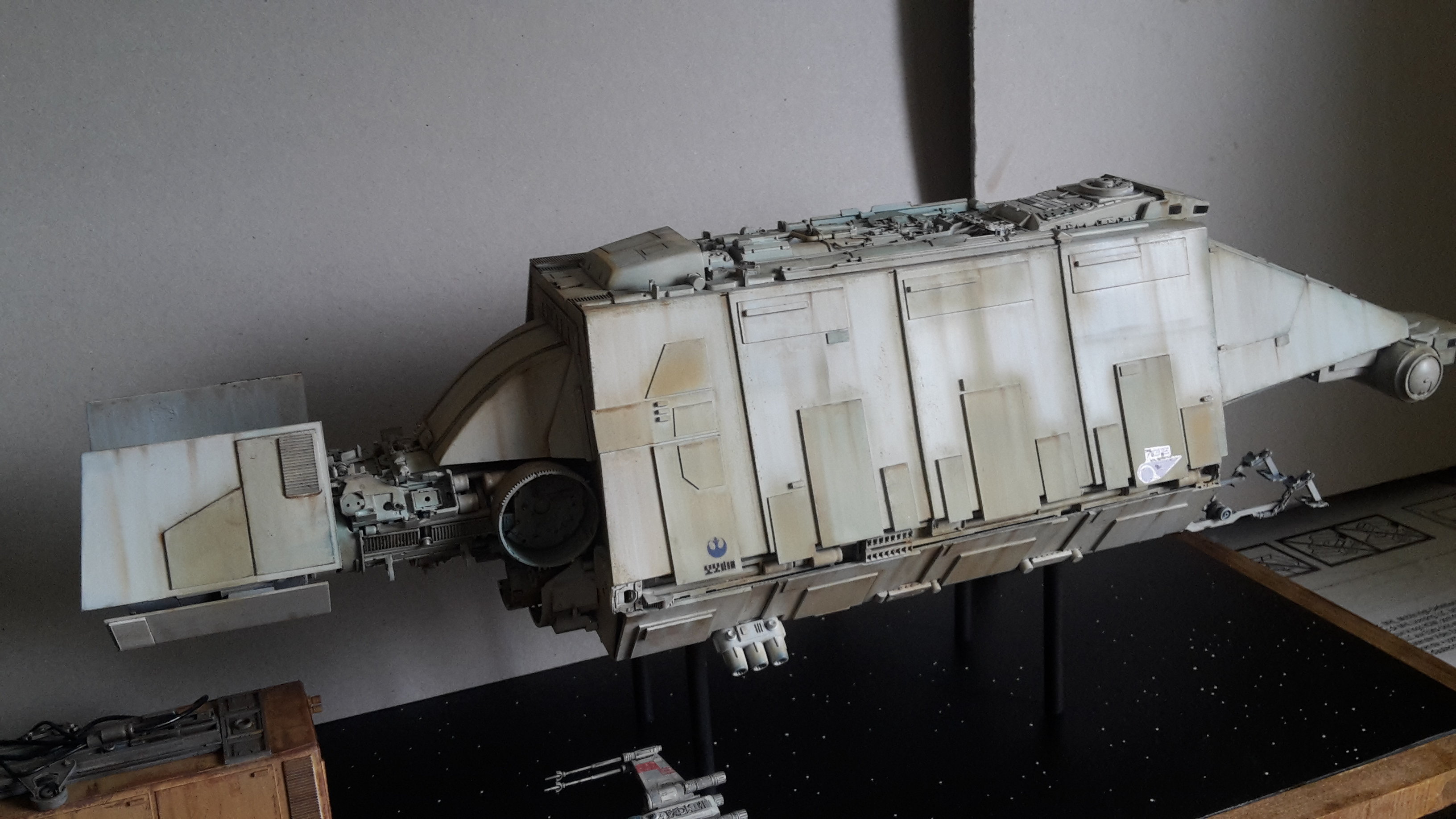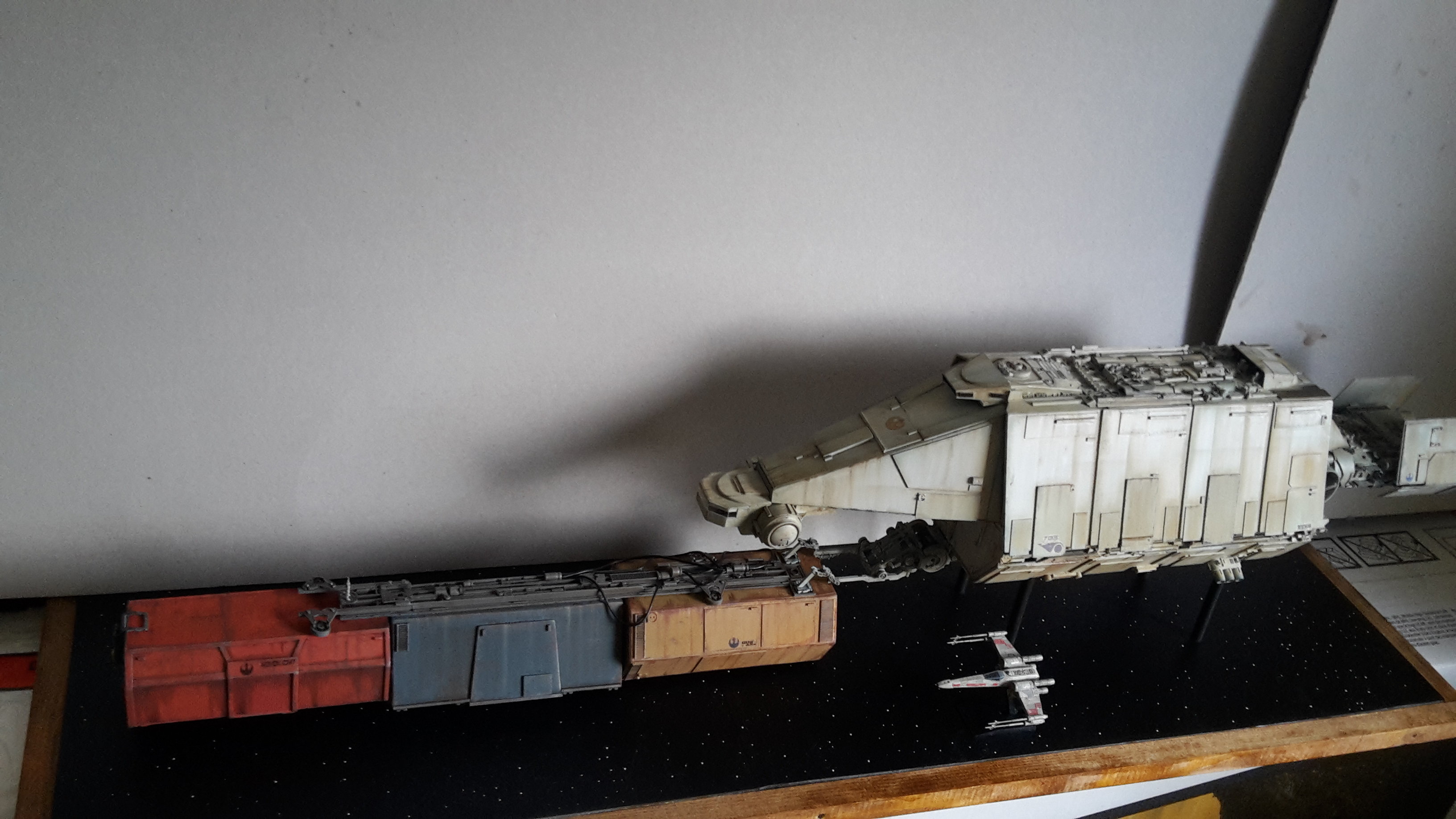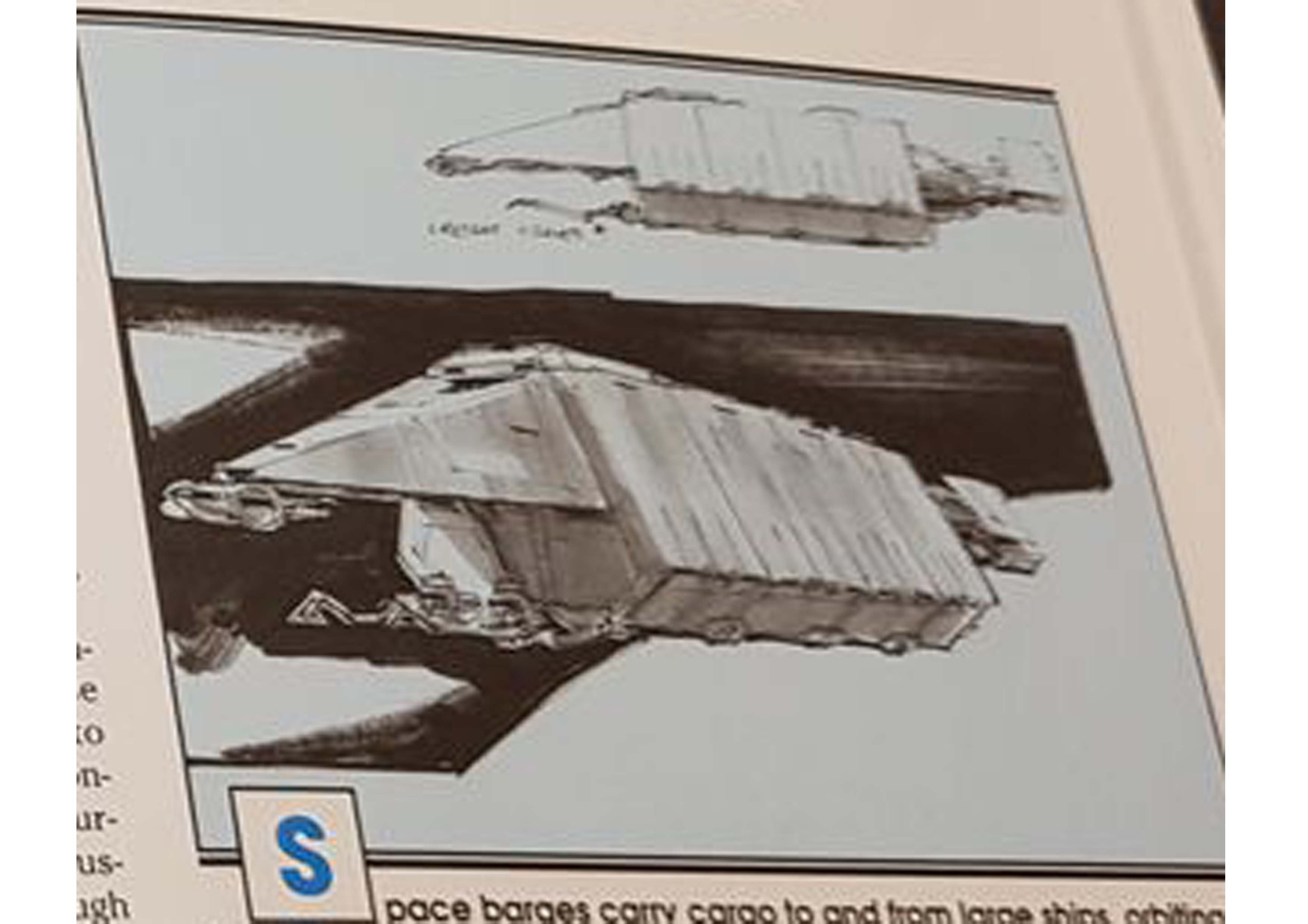 I started a new model drawn from the Star Wars Universe star wars. I created this piece from a rare illustration by Joe Johnston. To my knowledge, it appeared only in a book of role plays (some of you may have more information on this….). In this book, it is explained that it is a Barge which is the link between the planets and the big cargo ship, so I imagined the vessel pushing containers to a cargo ship under the protection of hunters. The model is in scratch at 1/144 ….