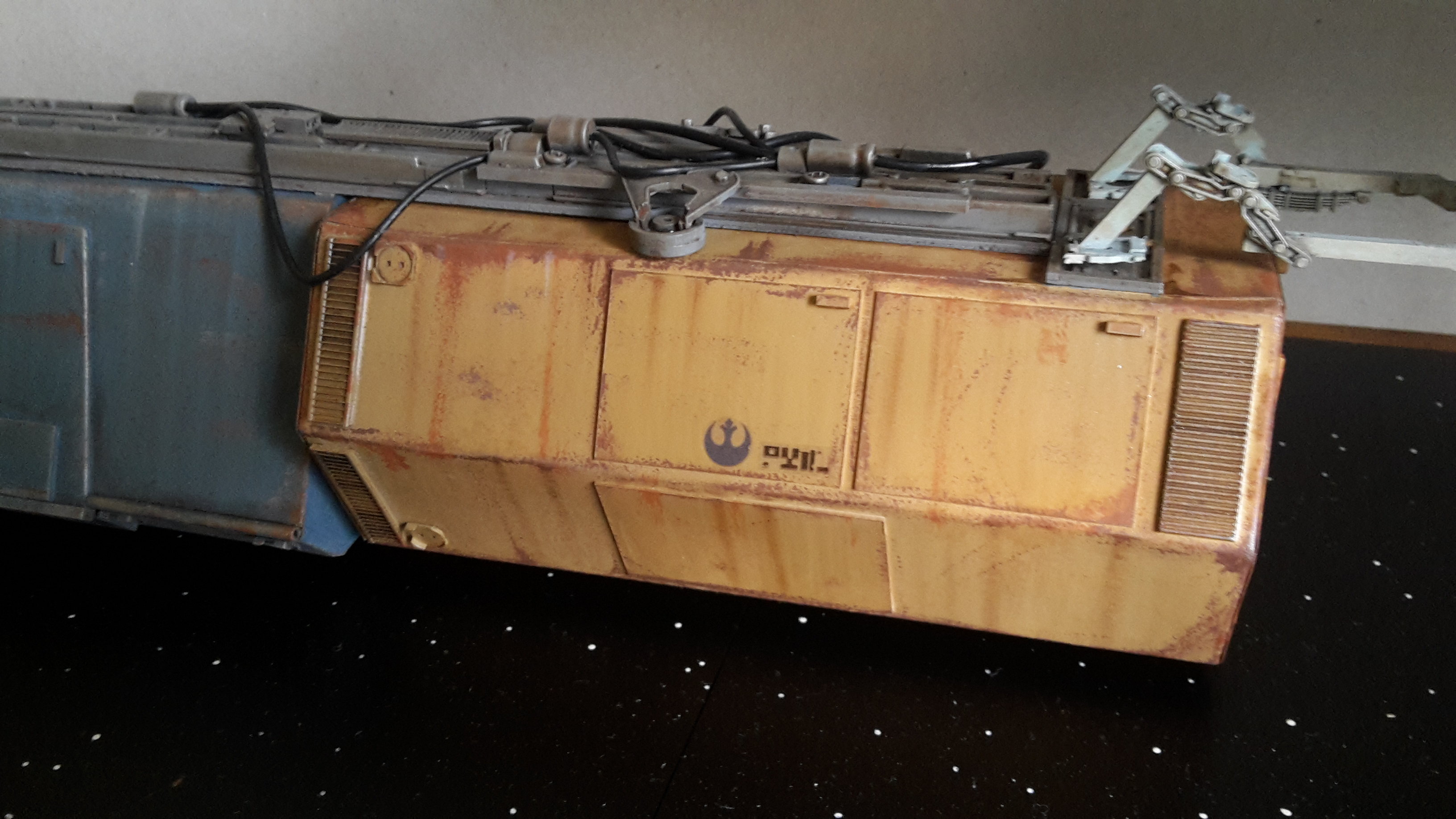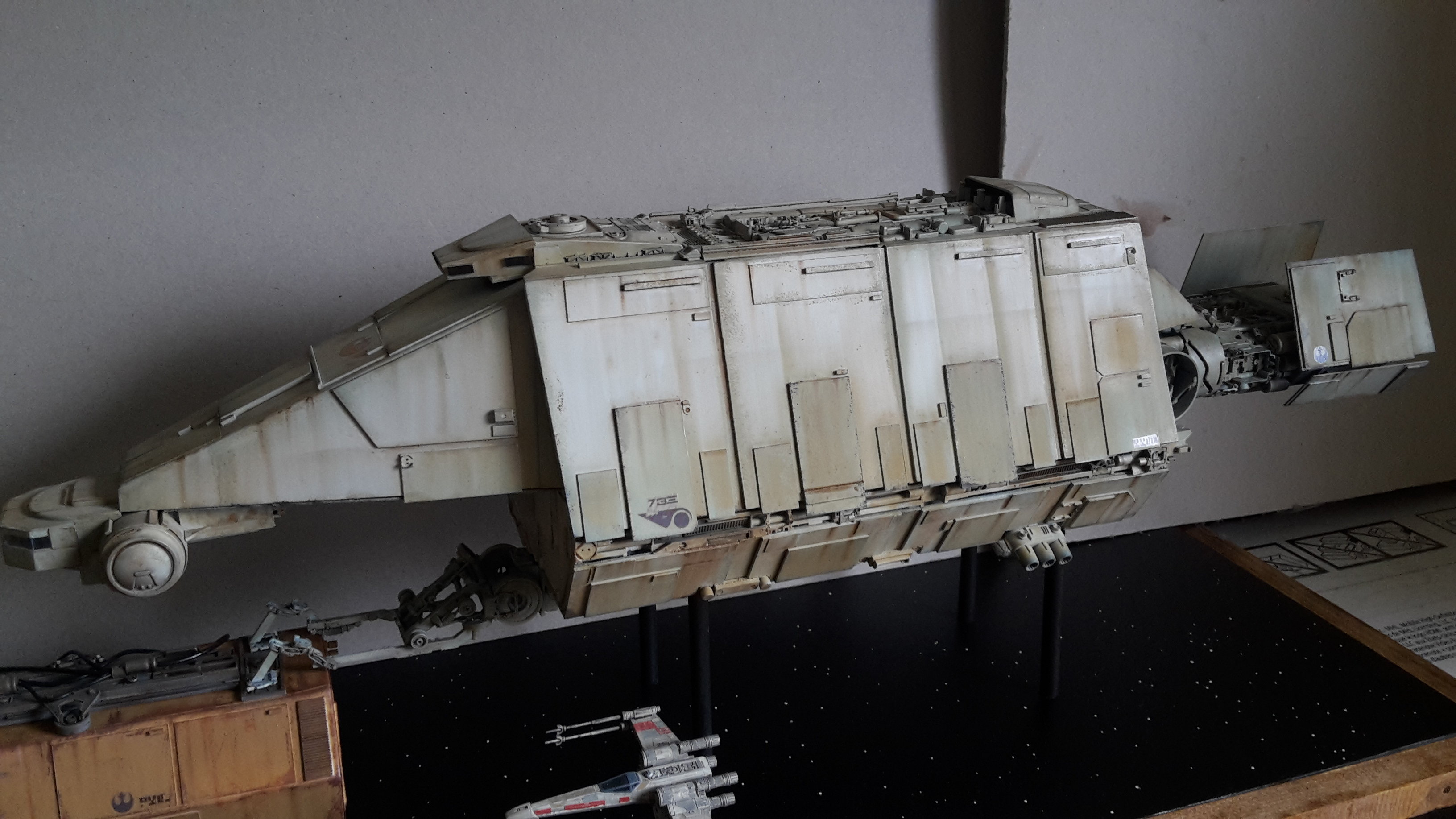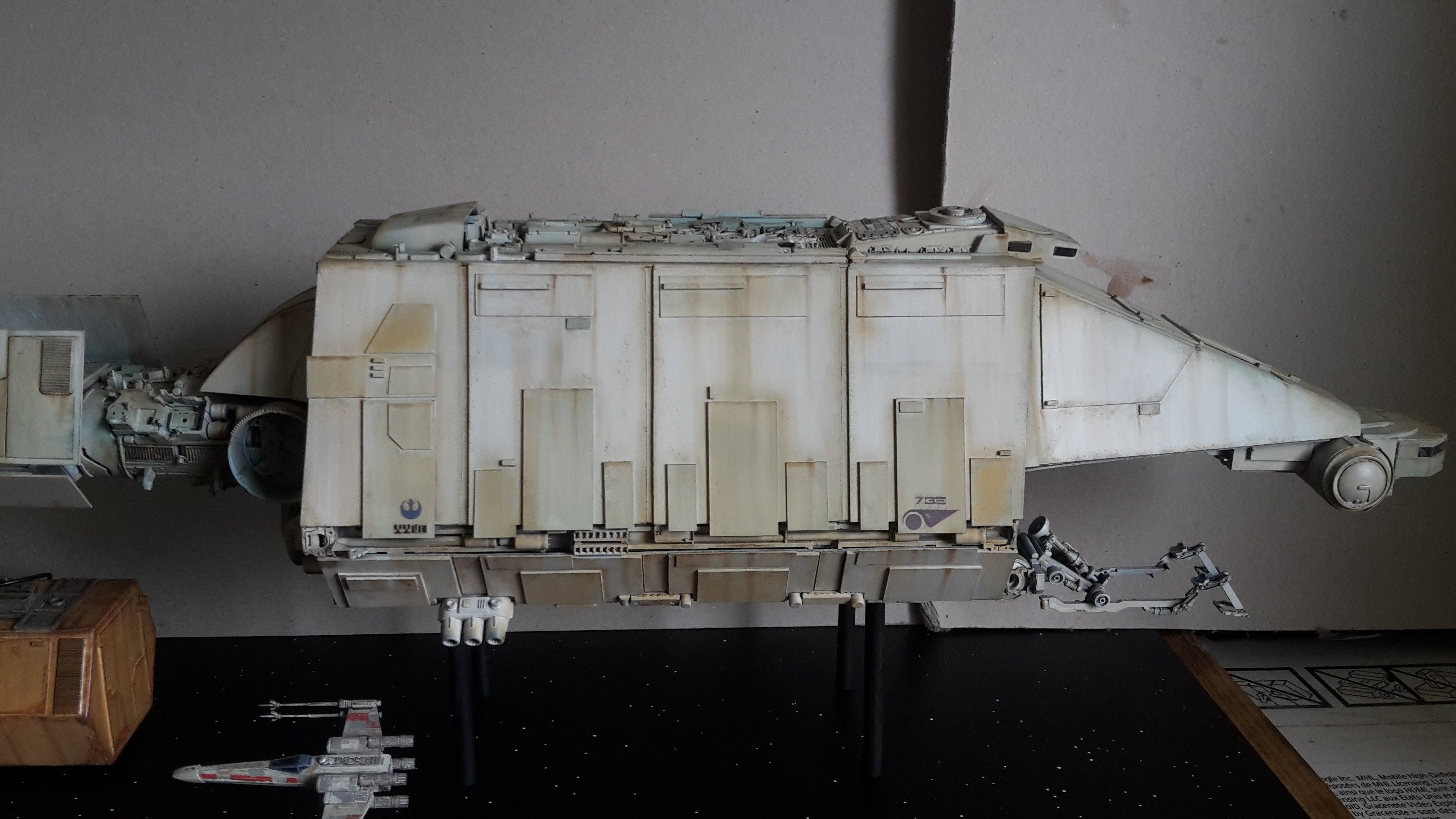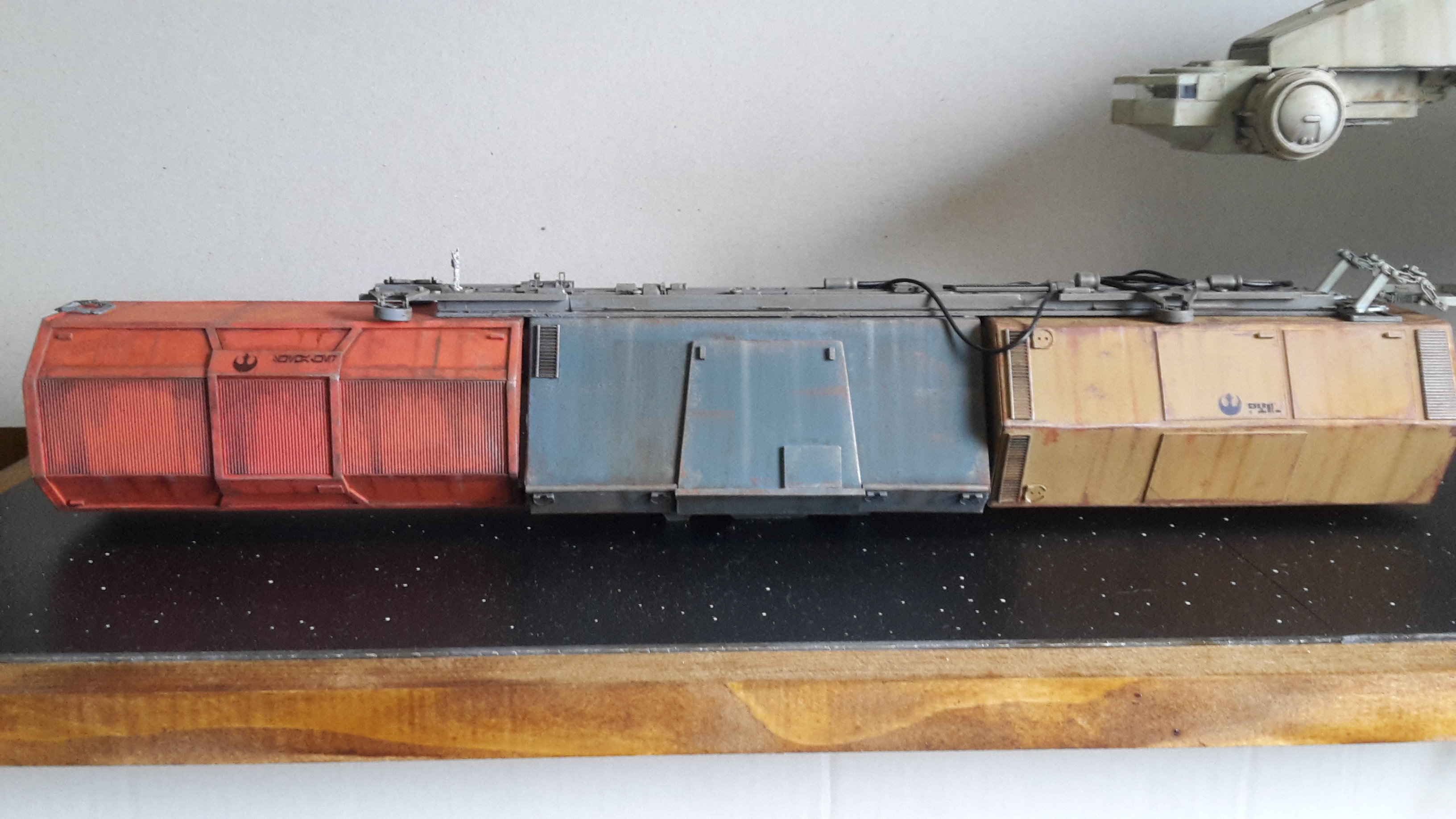 I started a new model drawn from the Star Wars Universe star wars. I created this piece from a rare illustration by Joe Johnston. To my knowledge, it appeared only in a book of role plays (some of you may have more information on this….). In this book, it is explained that it is a Barge which is the link between the planets and the big cargo ship, so I imagined the vessel pushing containers to a cargo ship under the protection of hunters. The model is in scratch at 1/144 ….