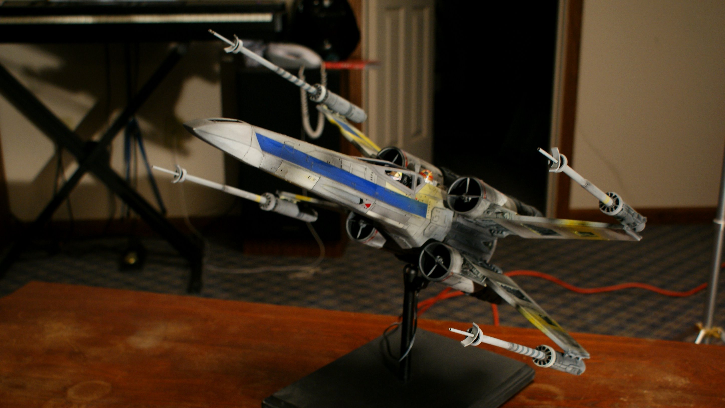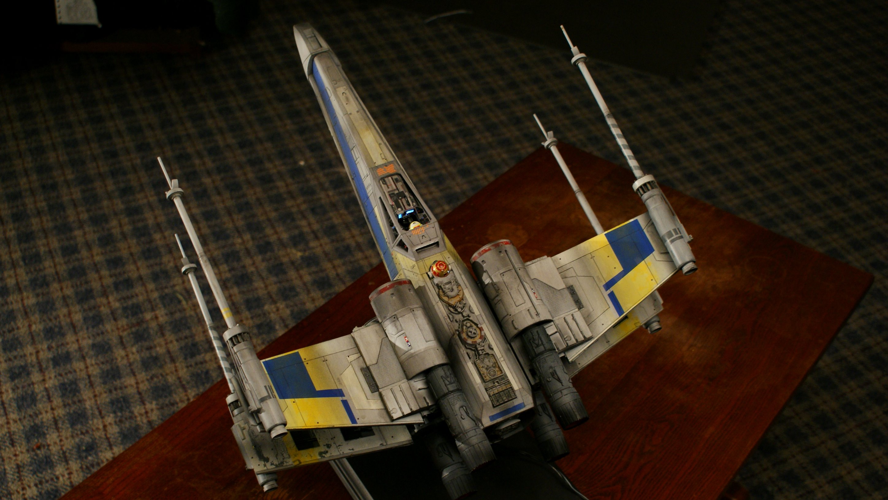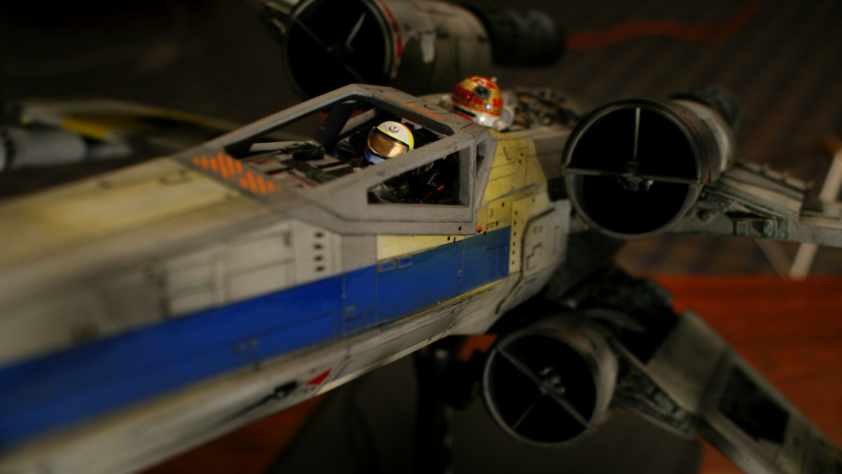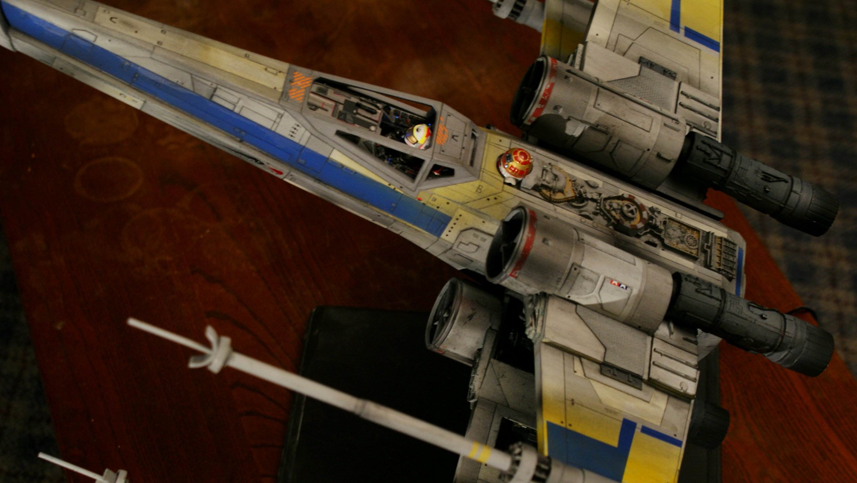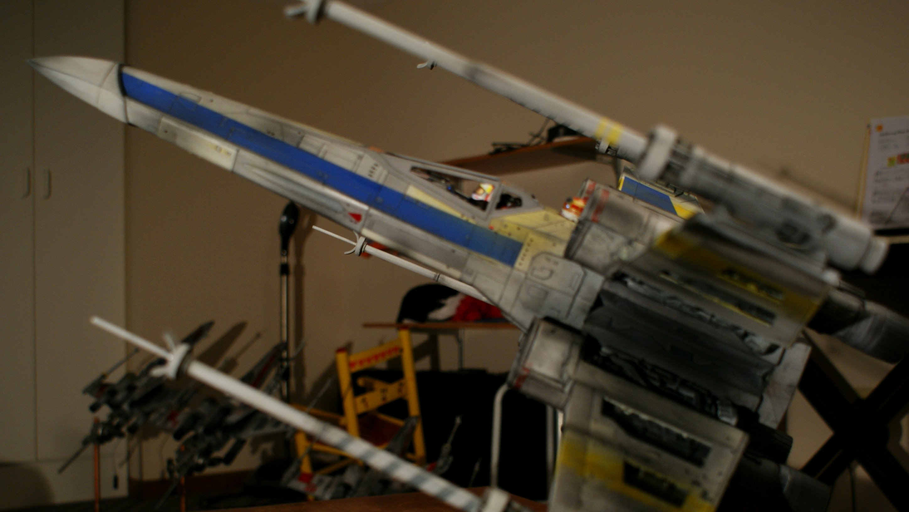 Originally the Yavin attack force was to be Blue Squadron, but the blue markings created too many problems with the compositing process. The first X-Wing model to be made was Blue-1, which was painted and sent to London to be used in the building of the full sized prop. This model represents the original Blue-1, but has been weathered to better match the final look of the filming models. (BTW: The Blue-1 model was repainted and became the Red-2 Hero Model. It was on tour with the Star Wars museum exhibit. The decals and much of the original paint can still be seen).