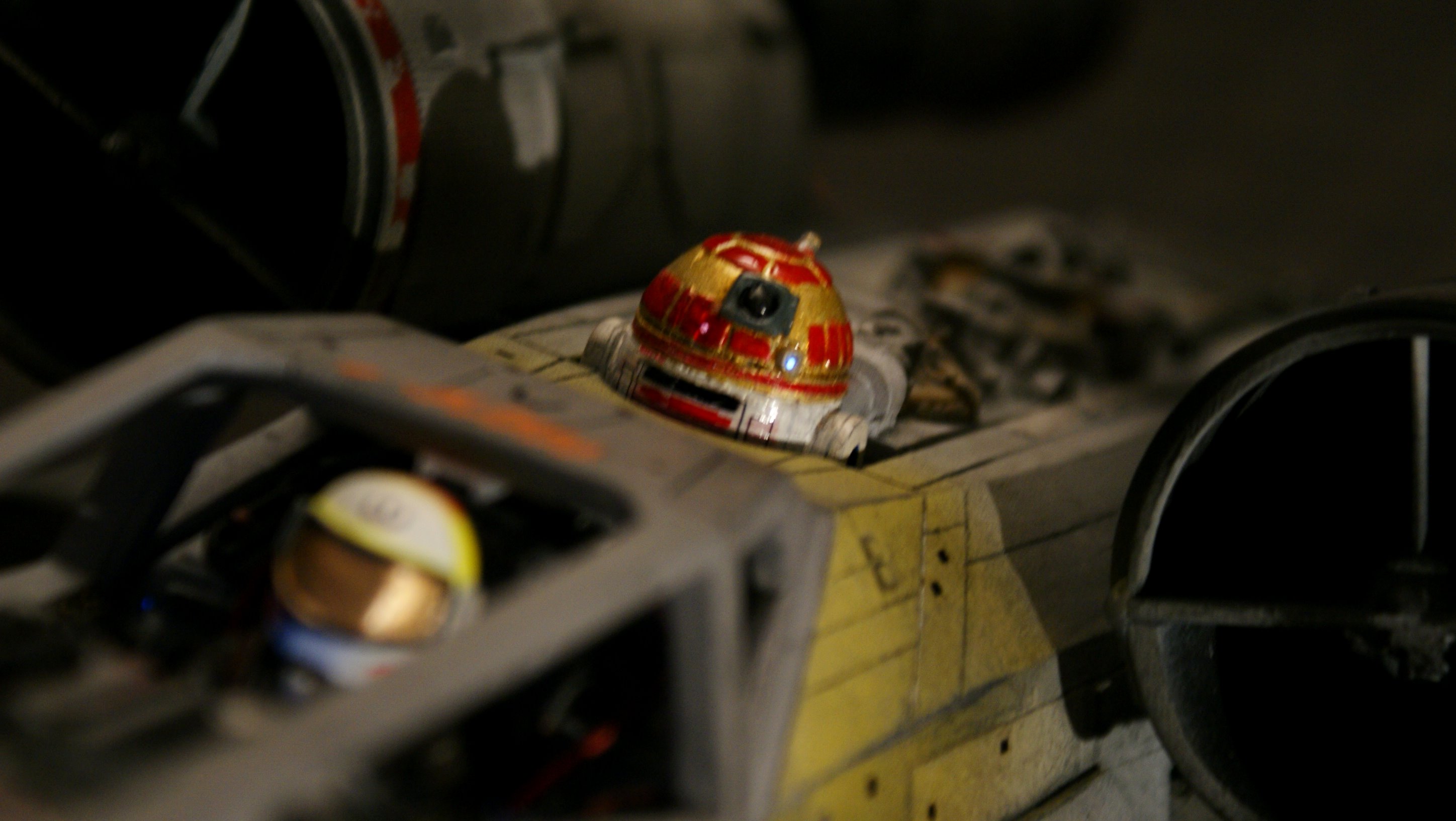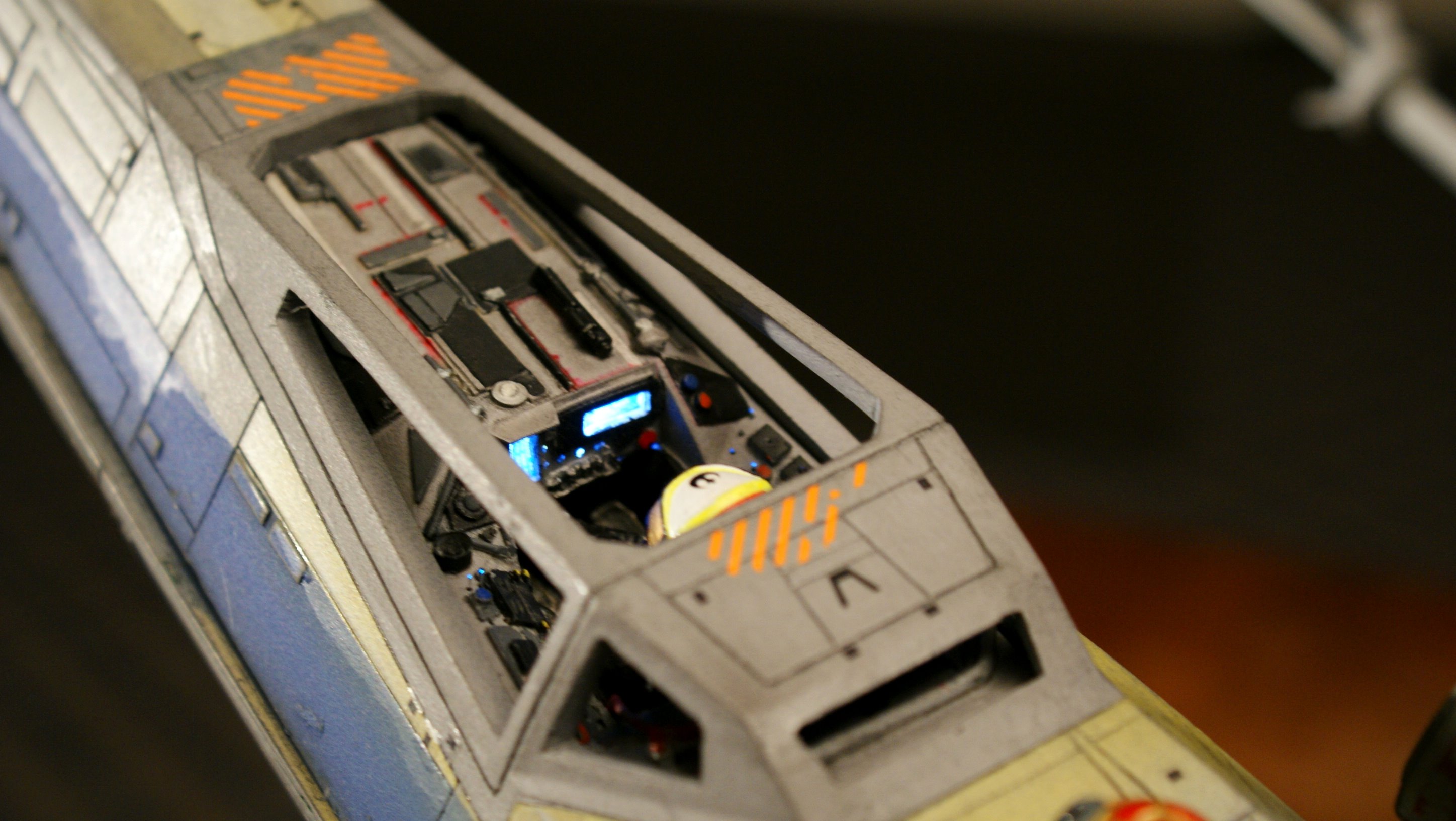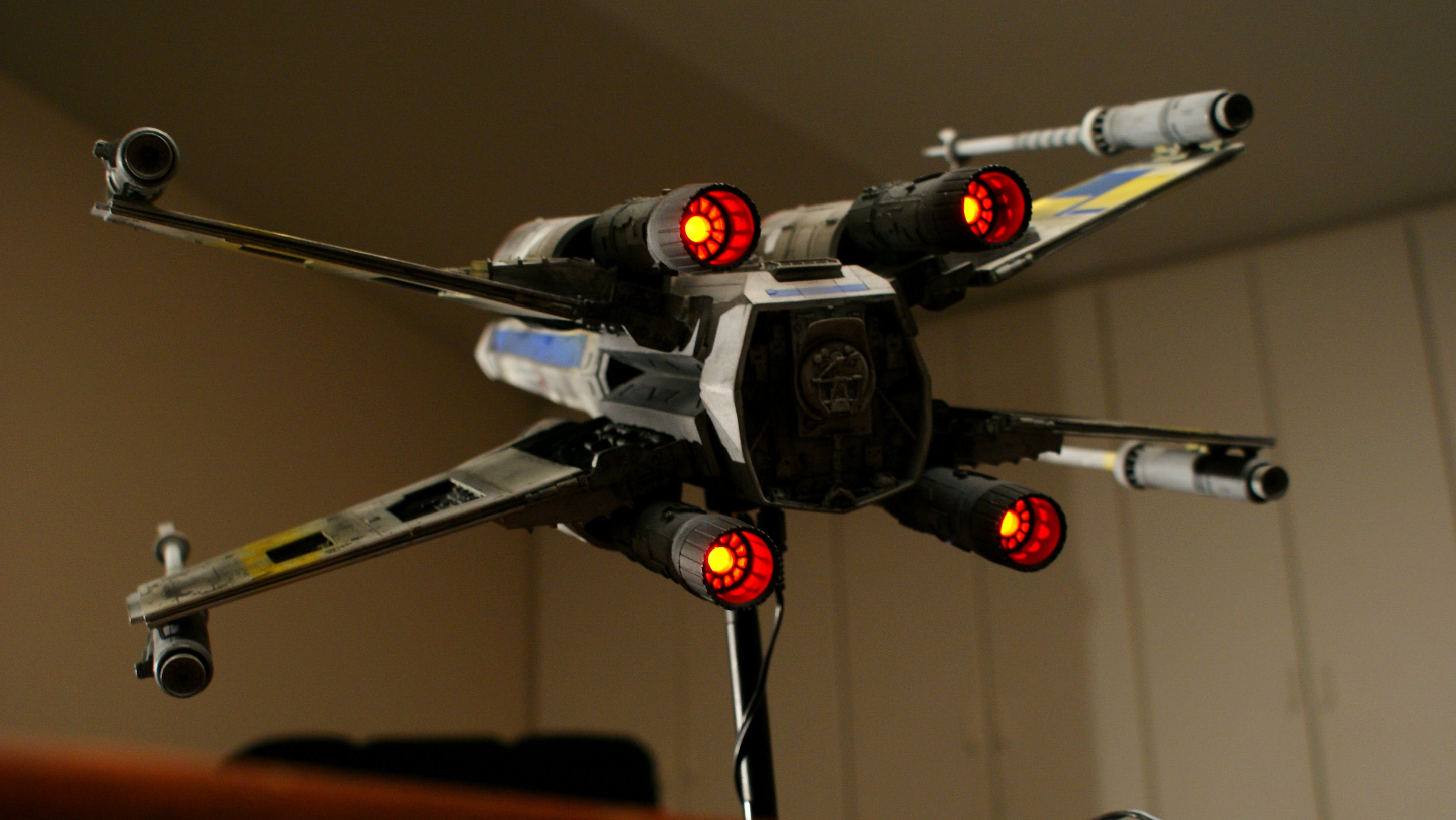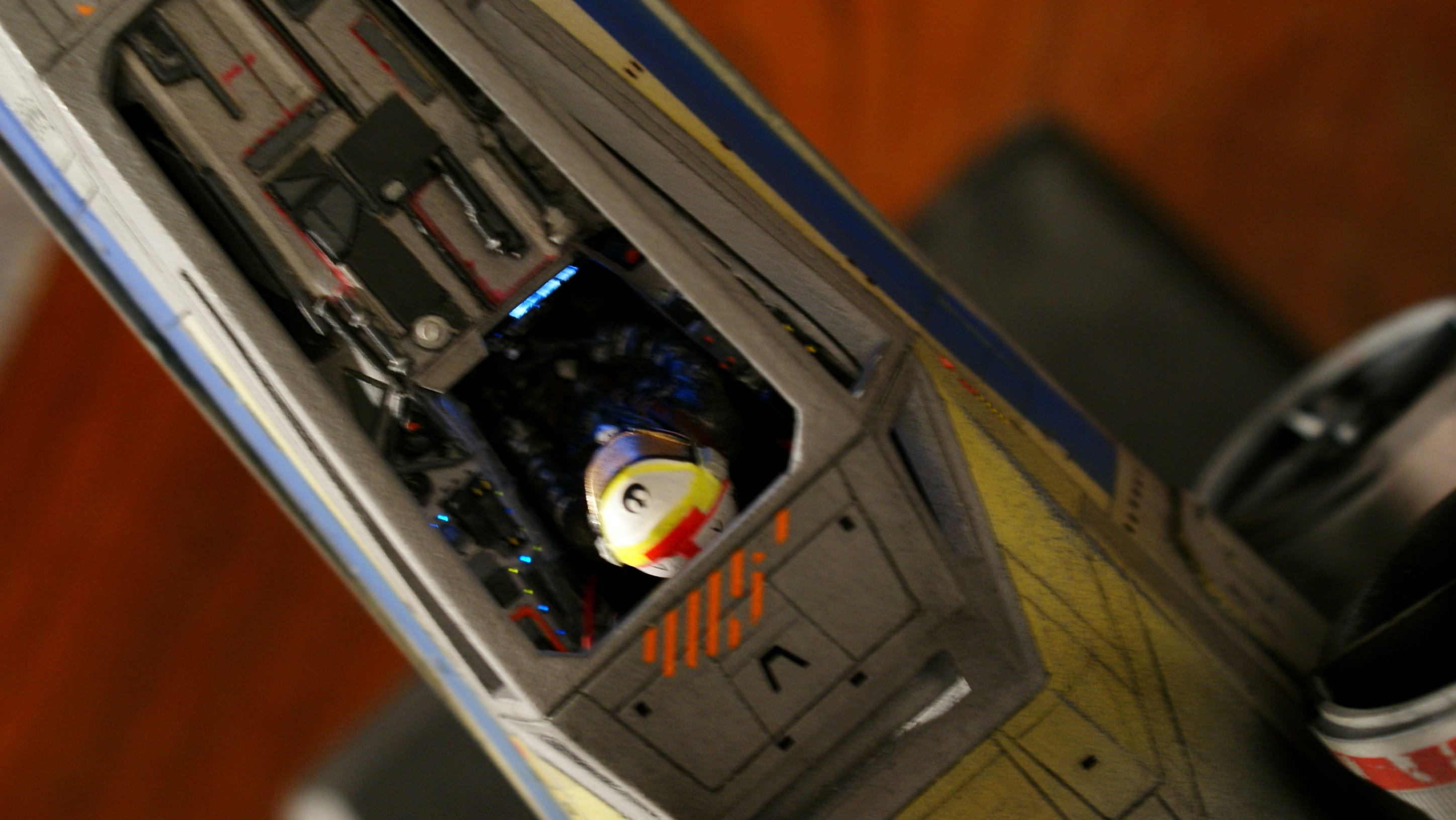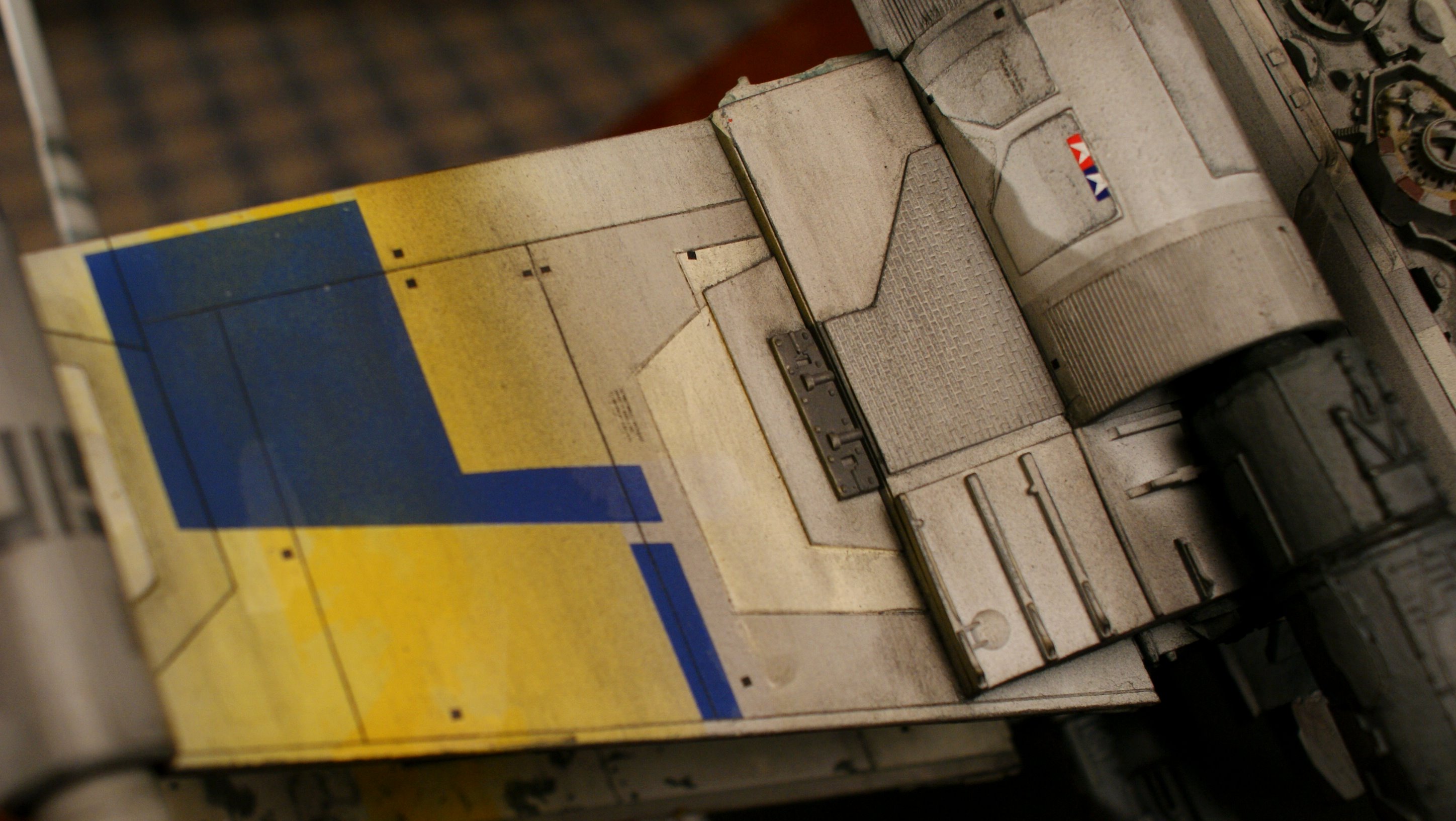 Originally the Yavin attack force was to be Blue Squadron, but the blue markings created too many problems with the compositing process. The first X-Wing model to be made was Blue-1, which was painted and sent to London to be used in the building of the full sized prop. This model represents the original Blue-1, but has been weathered to better match the final look of the filming models. (BTW: The Blue-1 model was repainted and became the Red-2 Hero Model. It was on tour with the Star Wars museum exhibit. The decals and much of the original paint can still be seen).