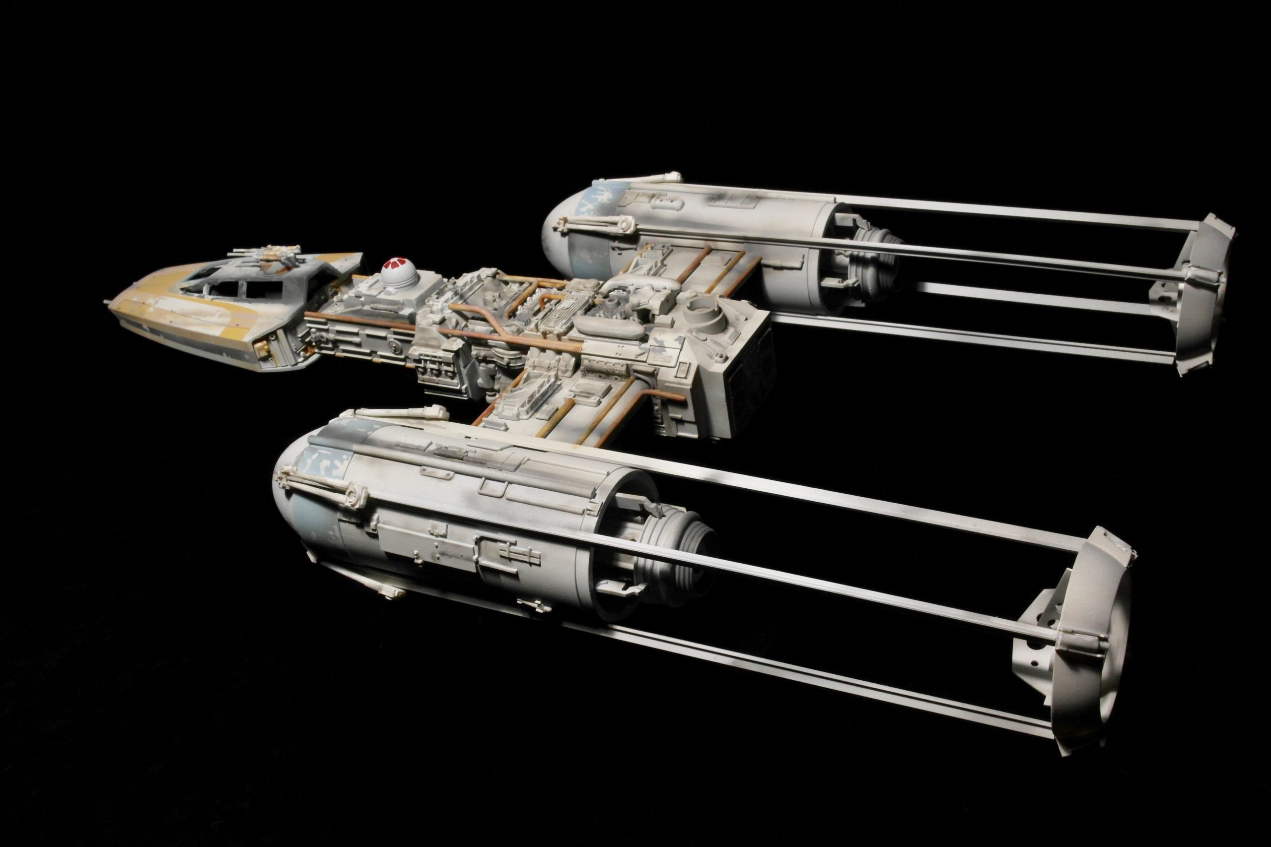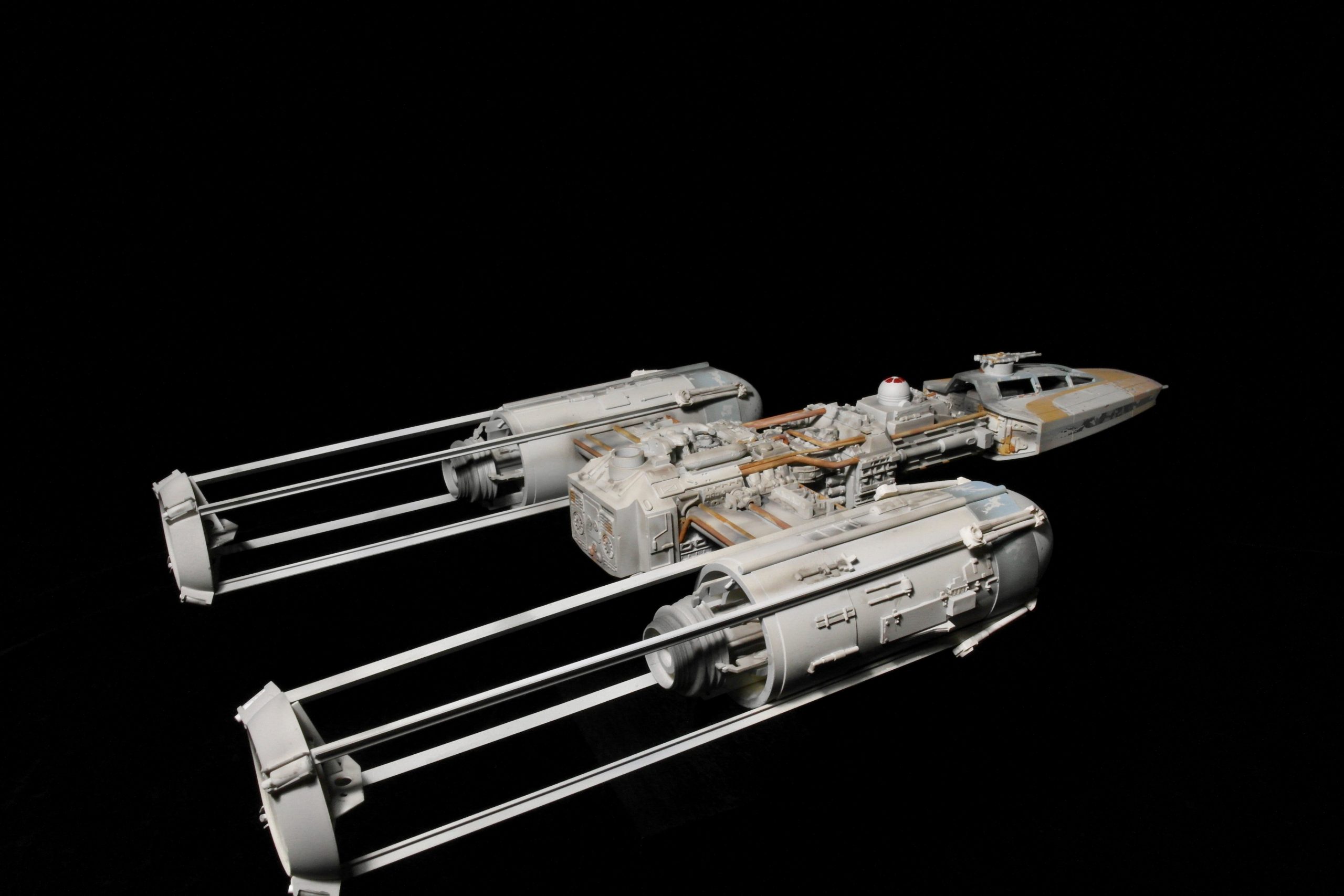 This however, is something a little bit different. While making the engine masters I made a huge mistake and placed my support area for the wings in the incorrect location inside the engine cans. This wasn’t noticed until my good friend Ed Francais had mold and cast said cans. Obviously this meant having to correct this one, and the masters. As not one to waste things, I removed the incorrect mount points, created new ones, and decided to create a Gold 2 from the generic ROTJ replica patterns I created which Ed then cast in resin.