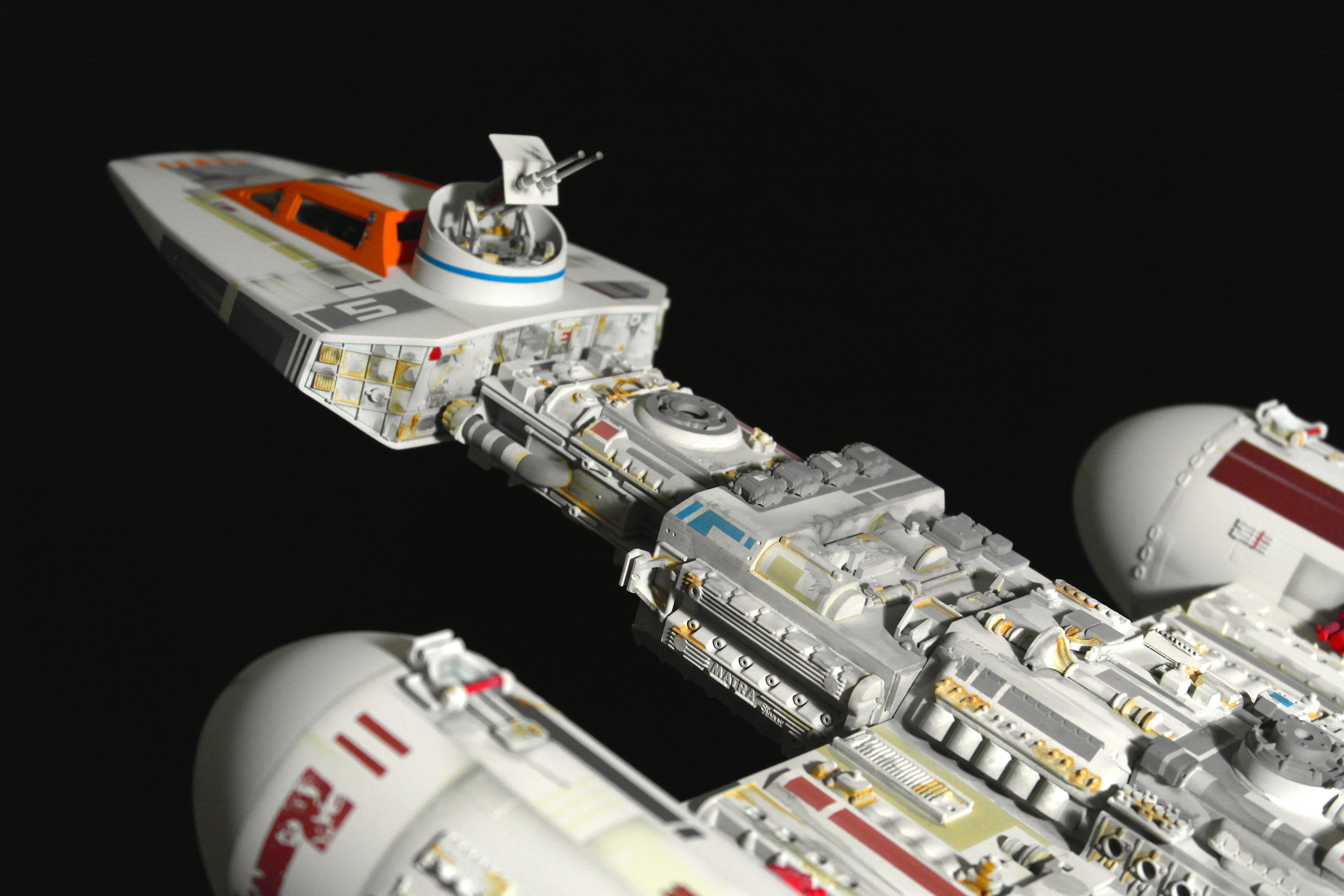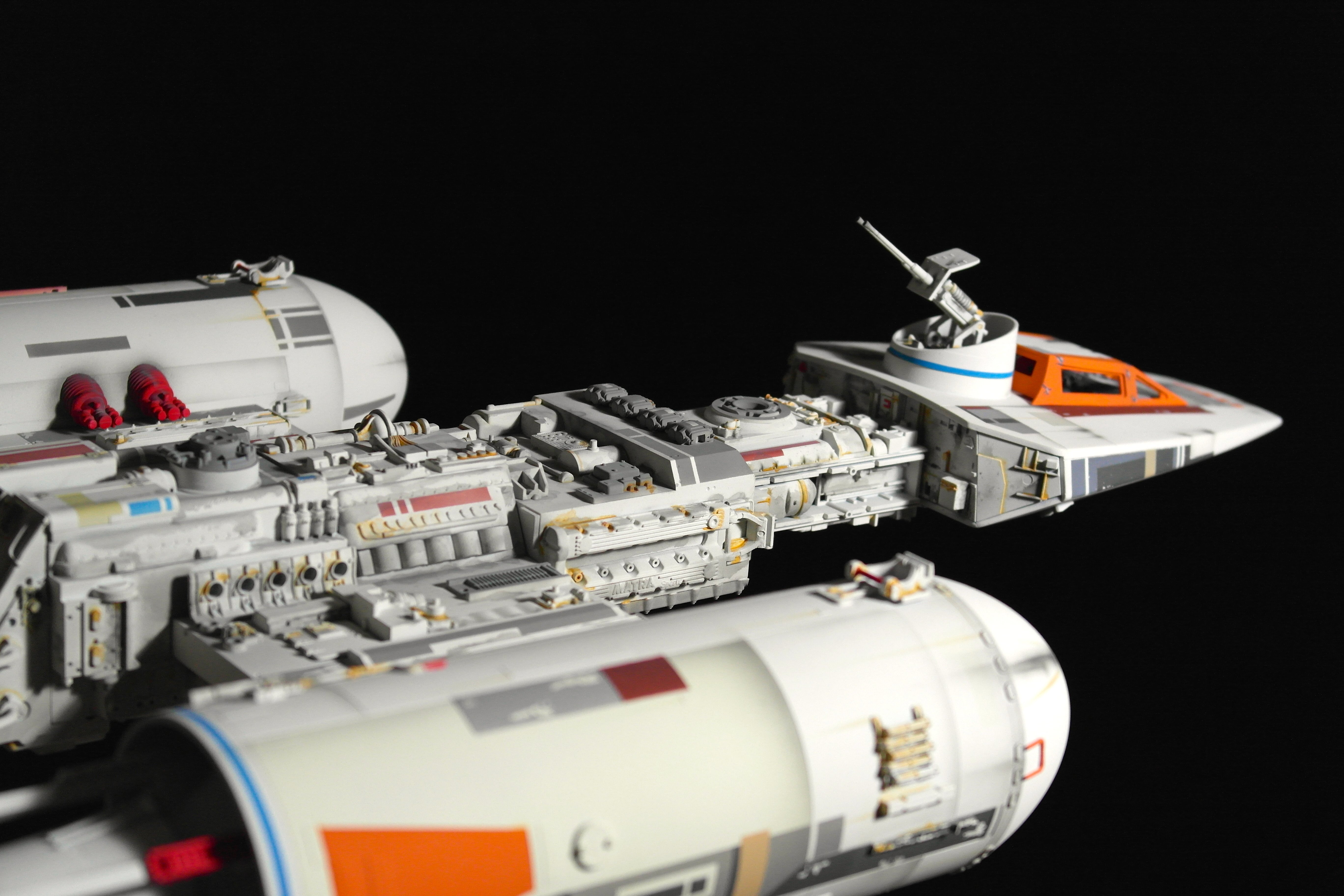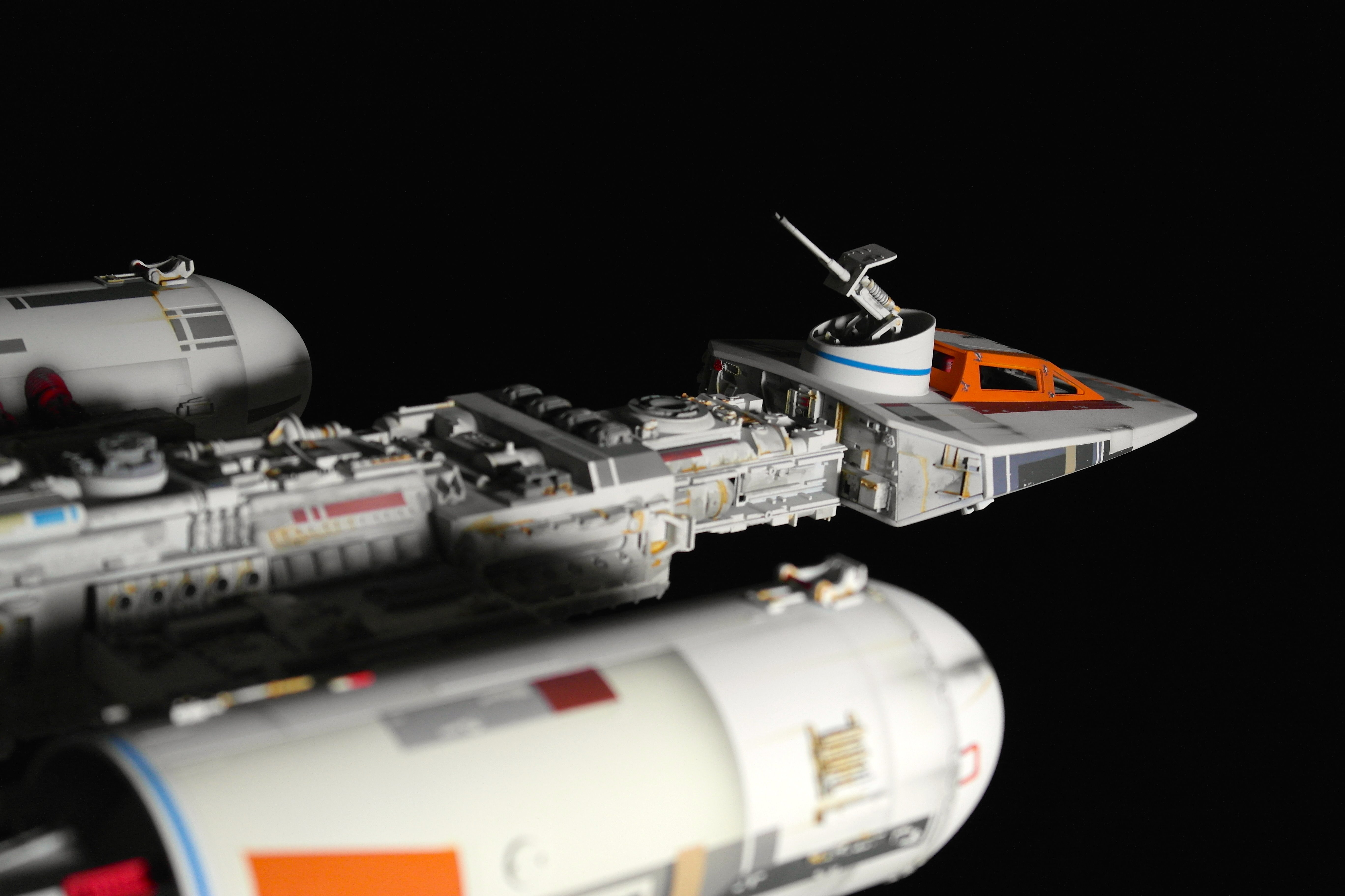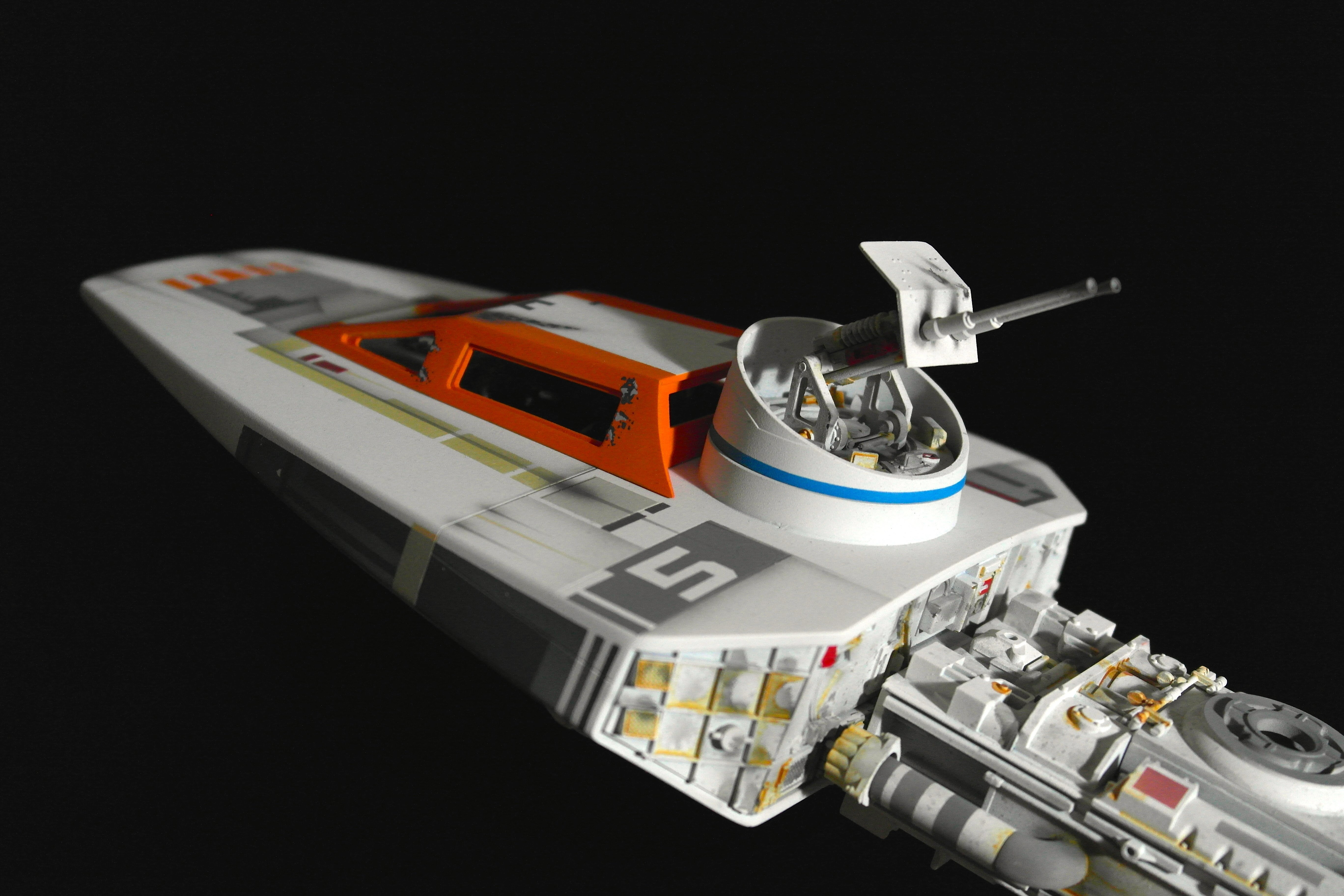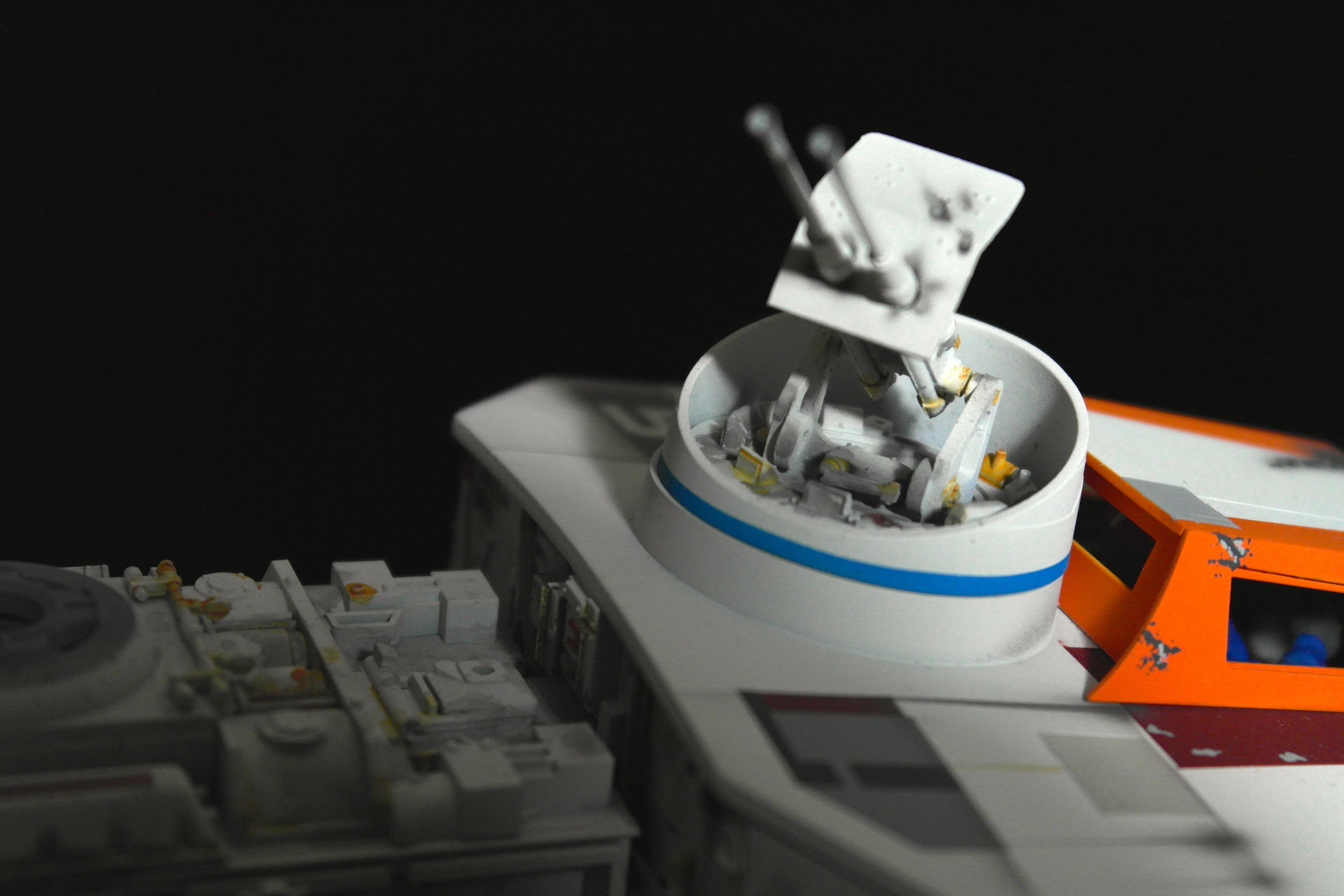 The only answer, was to weather the hull, in a very topical way, using extremely thinned SP Dark Lark Grey, in the style ILM used to weather the actual filming miniatures, using the airbrush to spatter and wash this thin mix around, but just enough, as not to darken its very white tones too much. Some details were very boldly painted with Caboose Red, a very big nod to the works of Colin Cantwell.