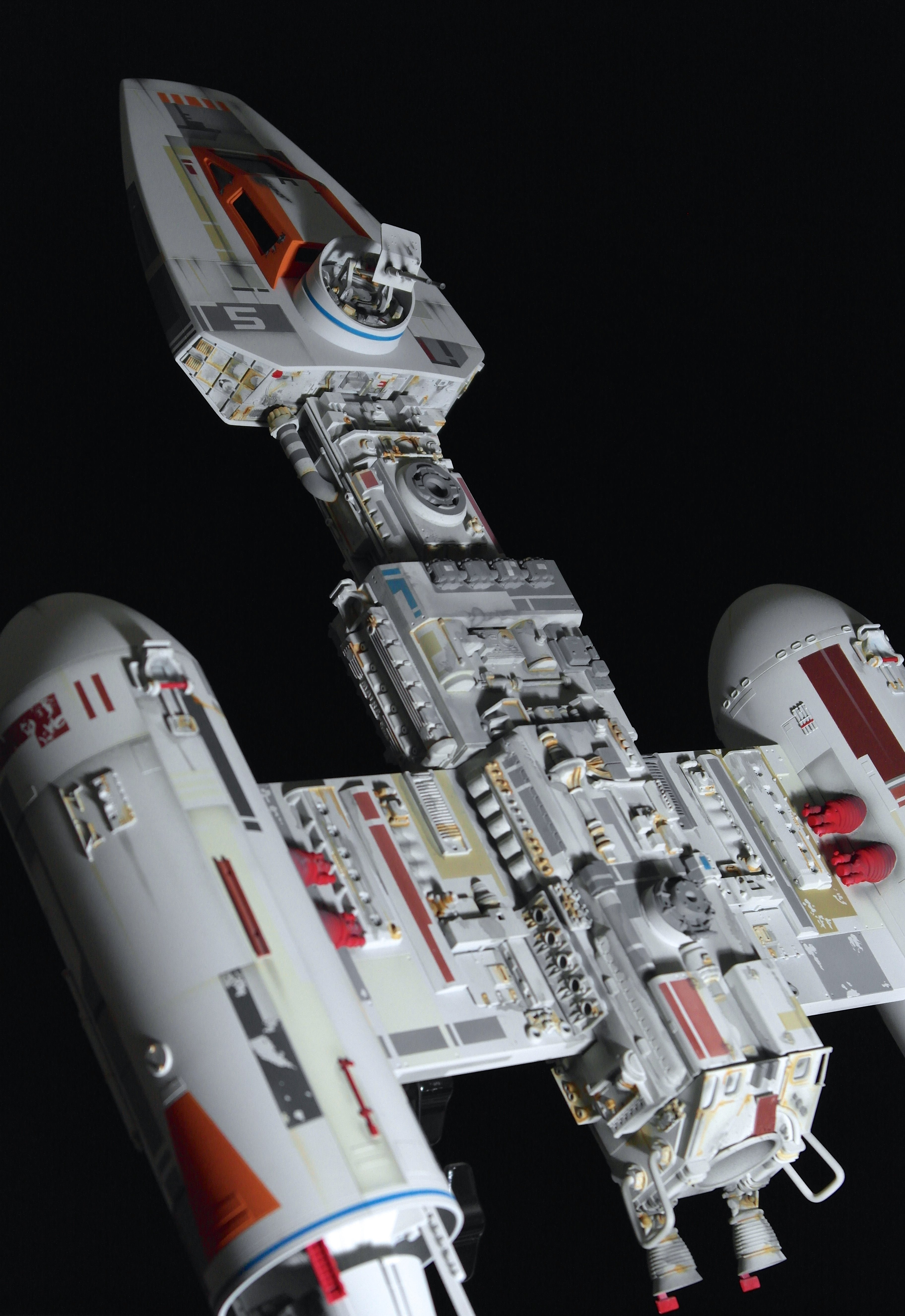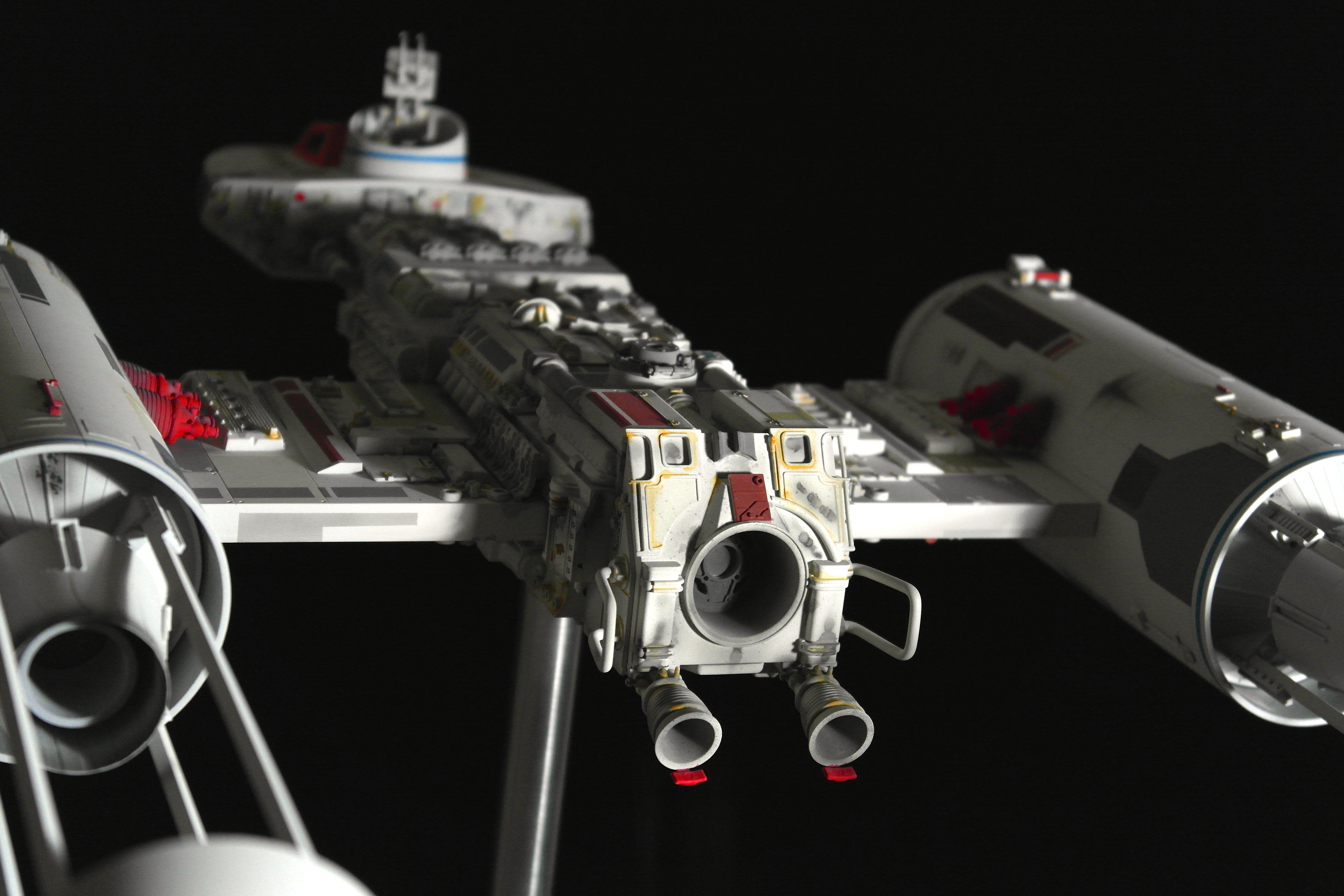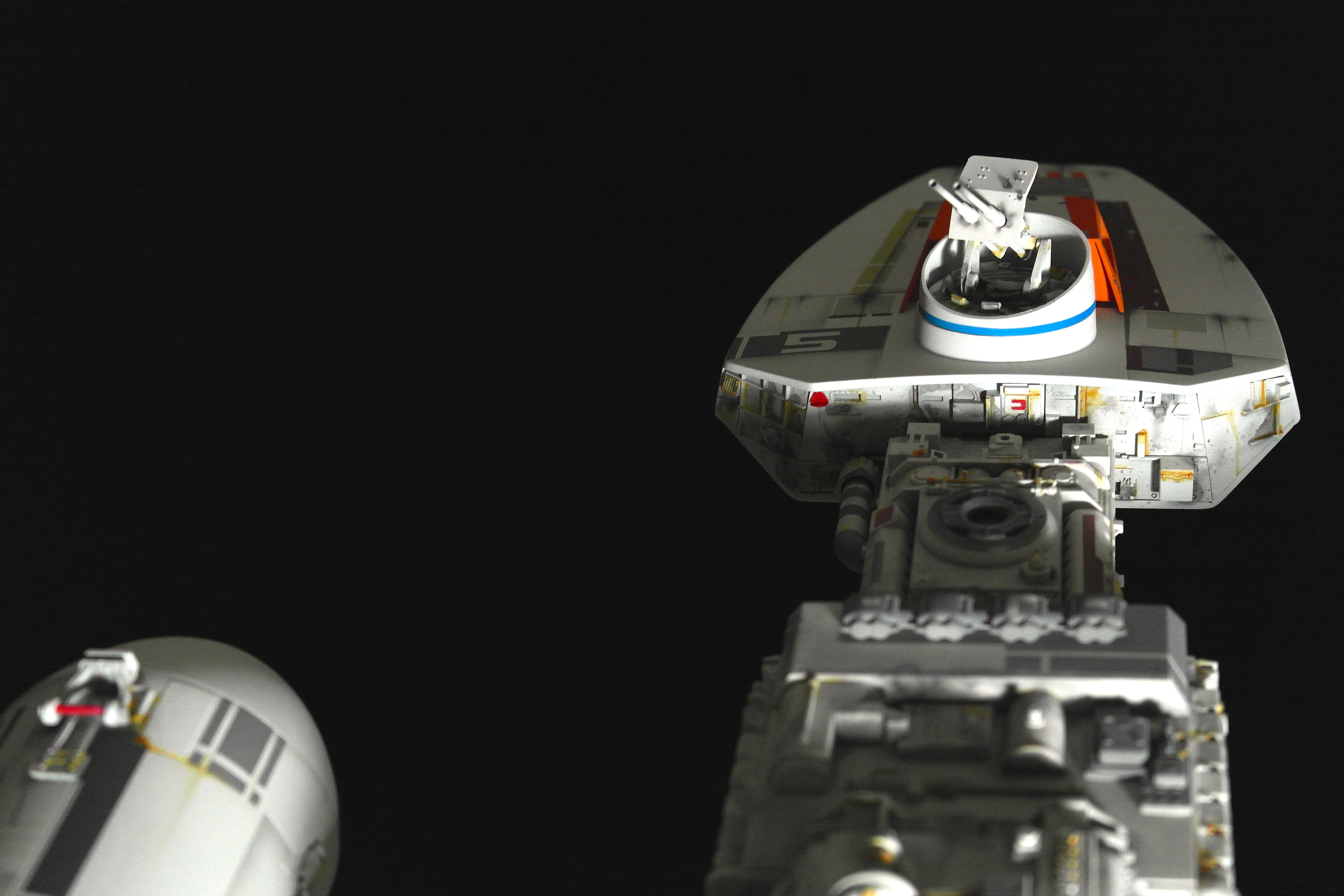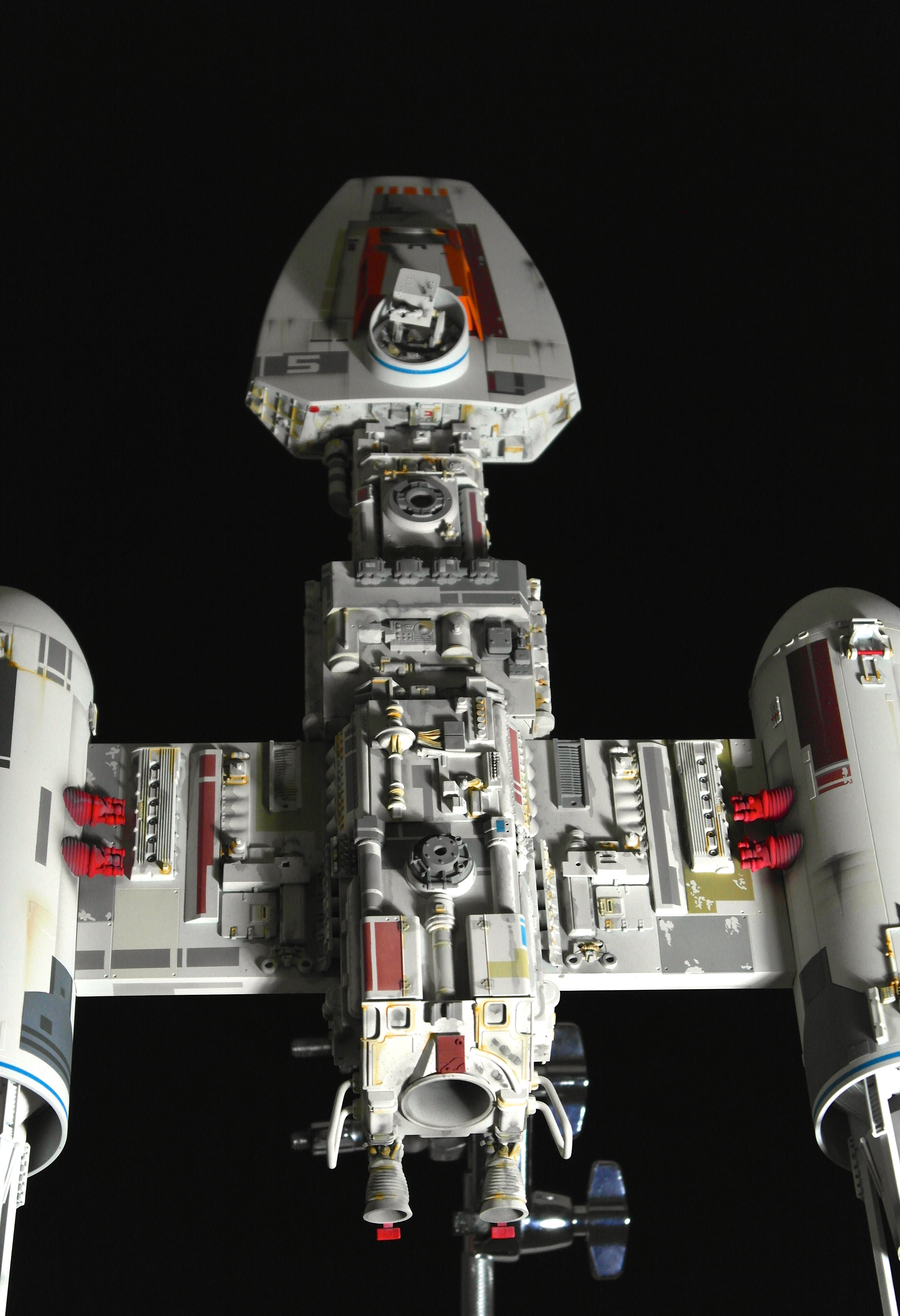 The only answer, was to weather the hull, in a very topical way, using extremely thinned SP Dark Lark Grey, in the style ILM used to weather the actual filming miniatures, using the airbrush to spatter and wash this thin mix around, but just enough, as not to darken its very white tones too much. Some details were very boldly painted with Caboose Red, a very big nod to the works of Colin Cantwell.