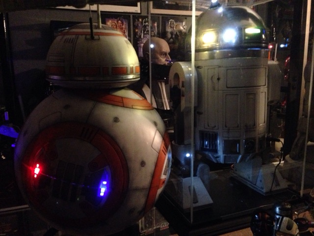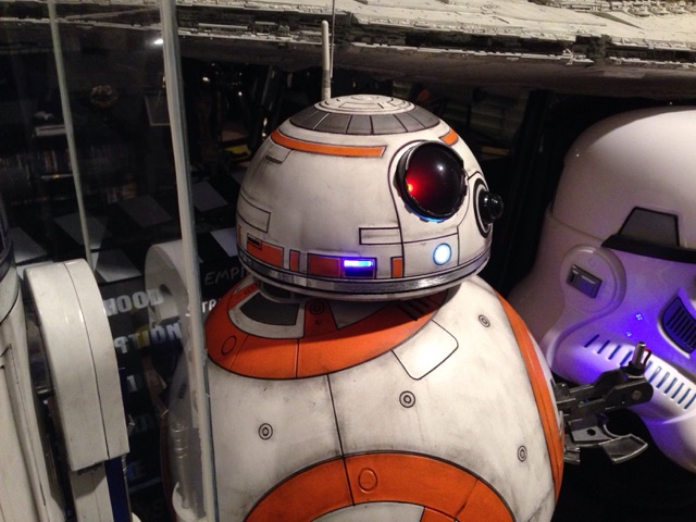 This is the newest version of BB8 as a toy…. at nearly 1/2 scale, this piece make a magnificent display! Especially after Marc works his magic upon it! What a transformation!! You can also see the R2D2 Marc converted as well. The two Droids are not to scale with each other however, as BB8 is only about as tall as R2’s shoulder (so to speak). Still, Marc’s display is amazing and awesome! I LOVE IT!
