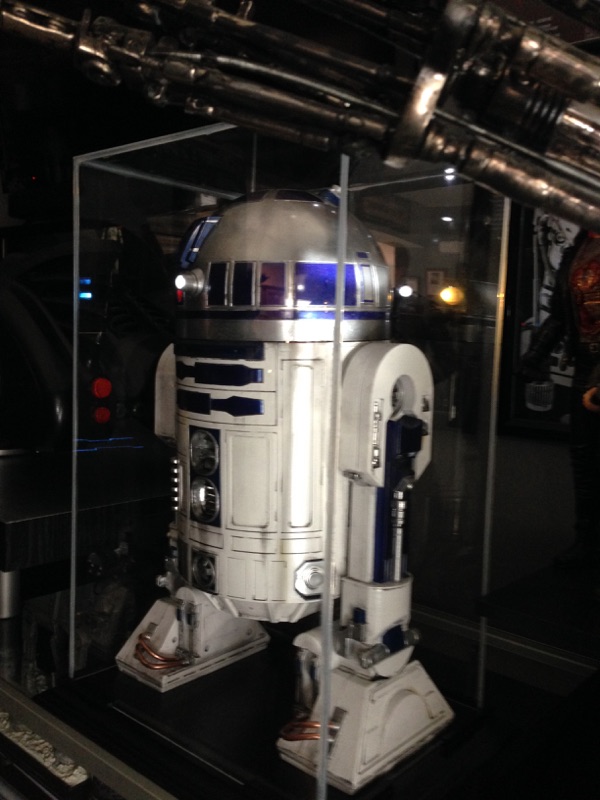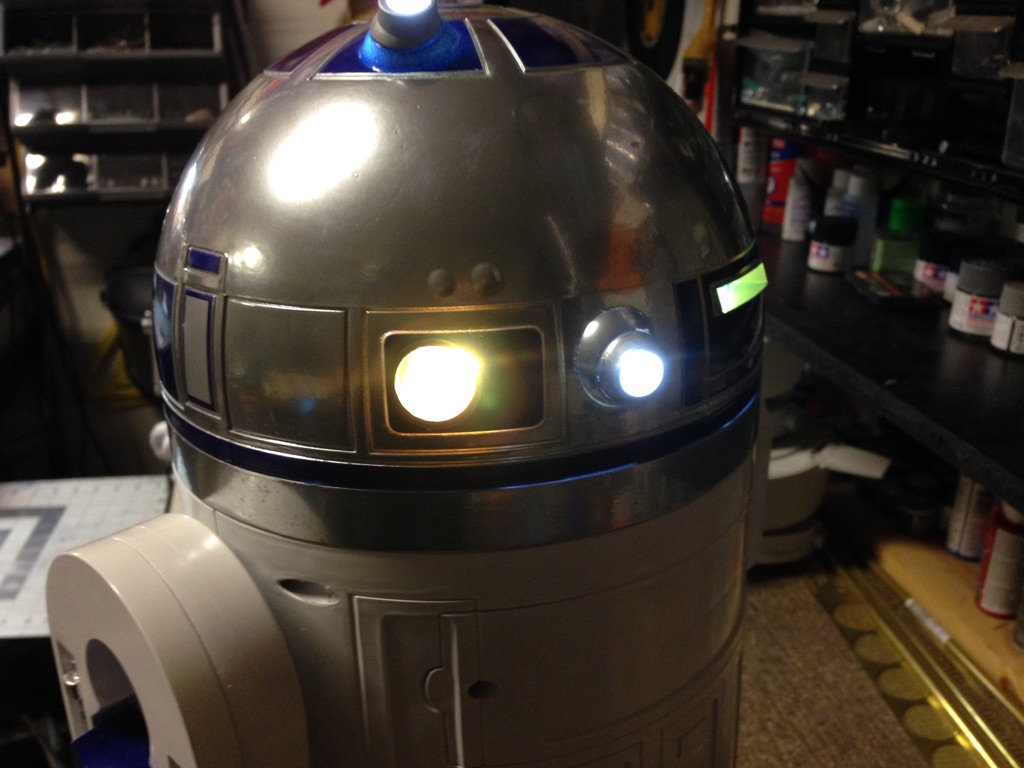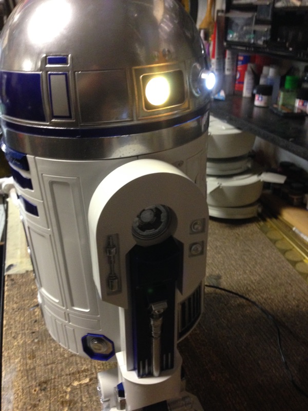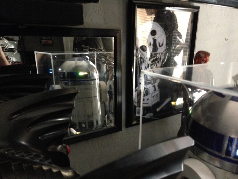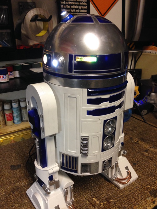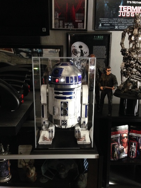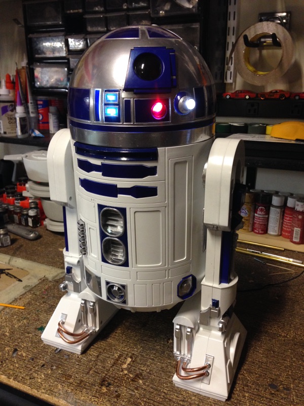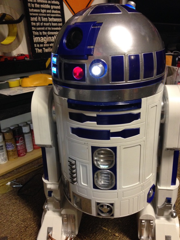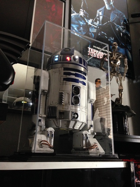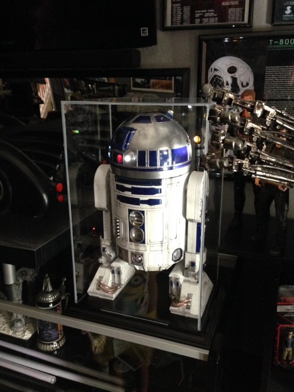 Artist Marc Elkins is not new to his improving of toy, model and prop releases! If you ever get the chance to visit his shop, you will know what I mean…. it is like science fiction AWESOMENESS! Like this re-do of the newest R2-D2 HUGE toy! Note the photo of the older toy that has electronics in it compared to the new toy that does not have electronics, but is much larger! Marc did a great job updating this to be a fantastic showpiece! Even his custom made acrylic case is magnificent!