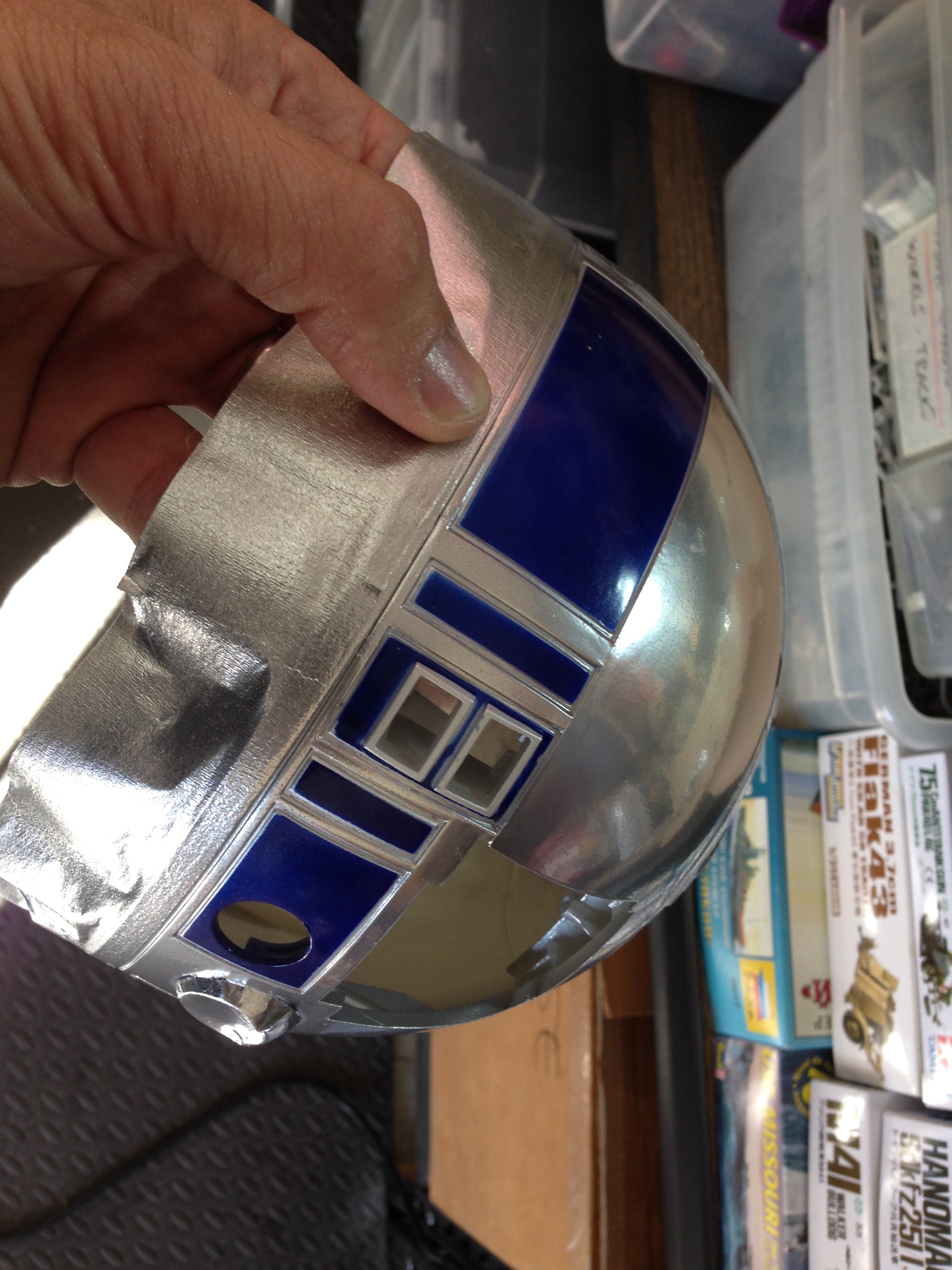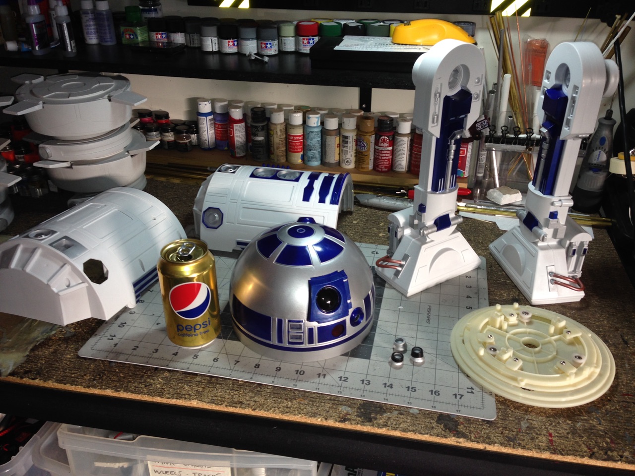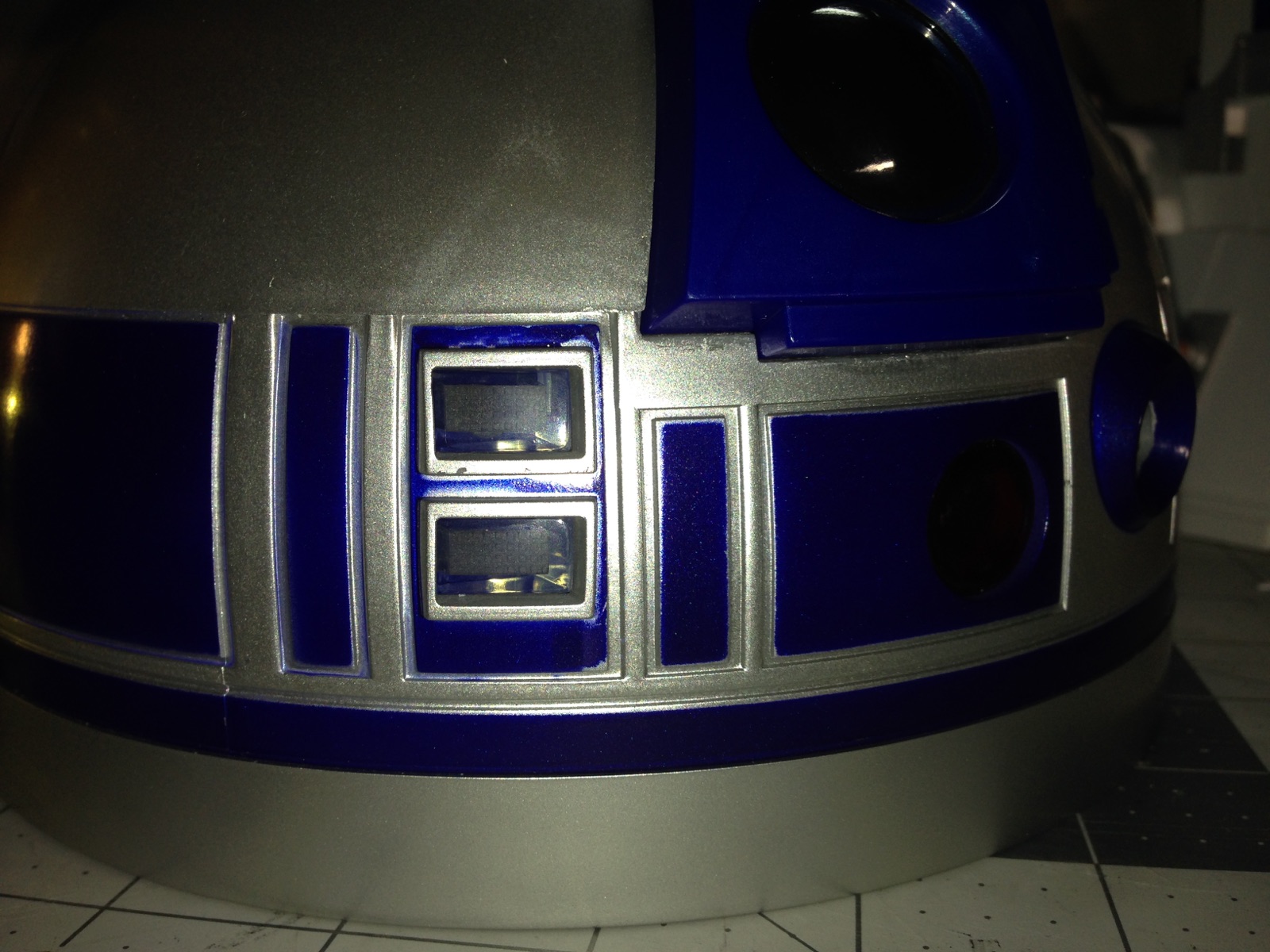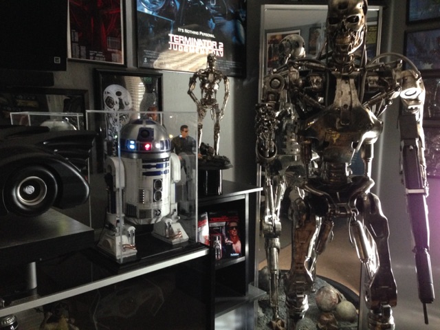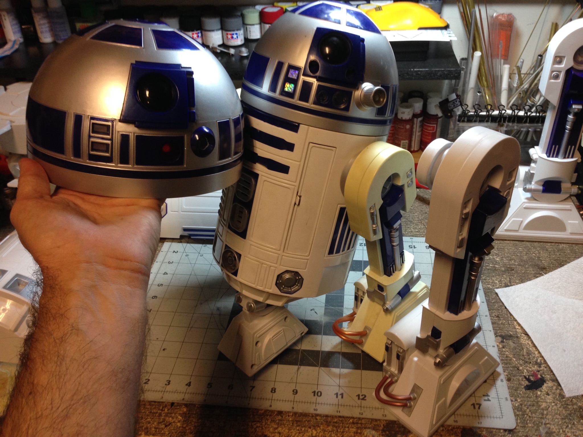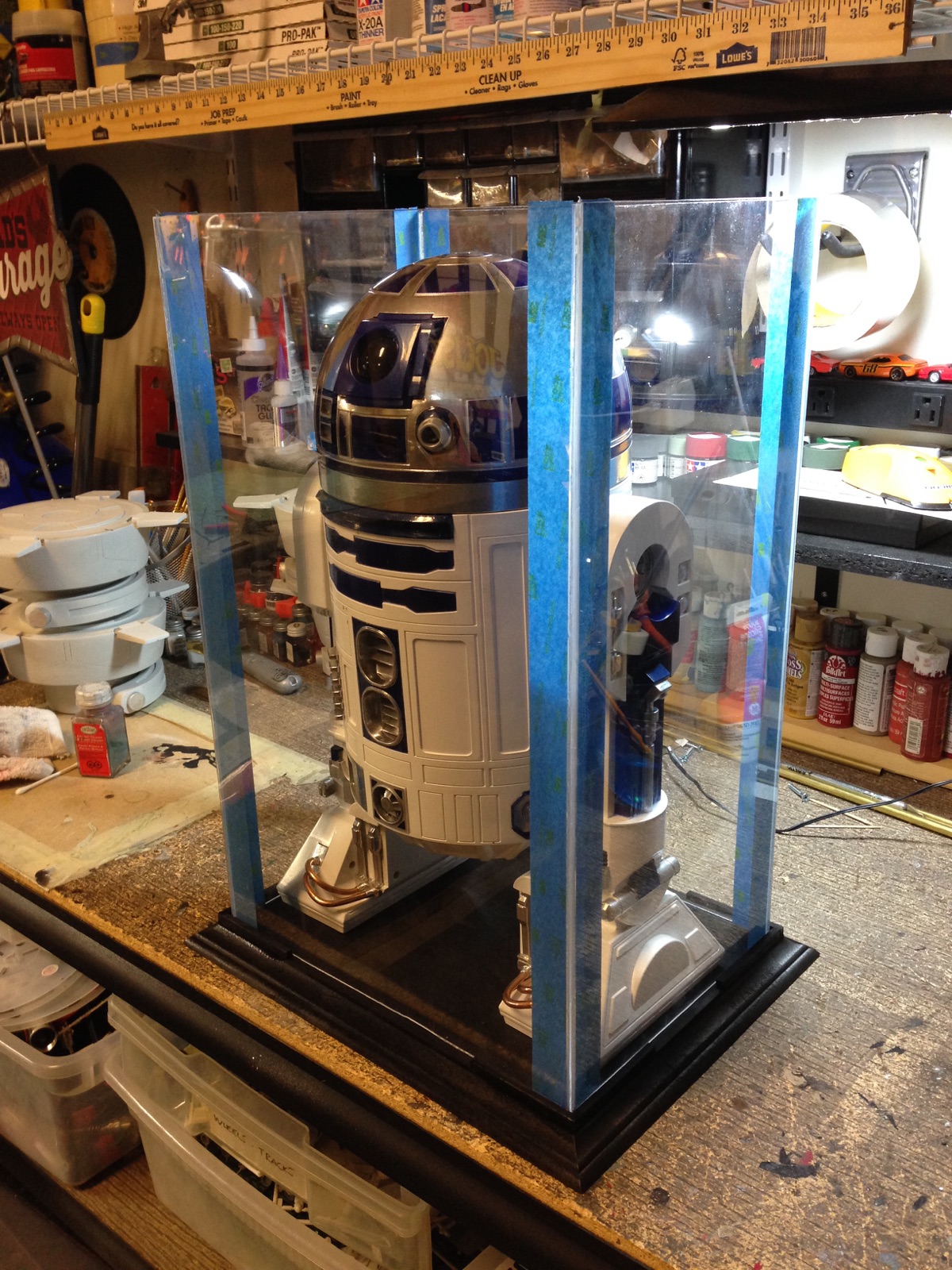 Artist Marc Elkins is not new to his improving of toy, model and prop releases! If you ever get the chance to visit his shop, you will know what I mean…. it is like science fiction AWESOMENESS! Like this re-do of the newest R2-D2 HUGE toy! Note the photo of the older toy that has electronics in it compared to the new toy that does not have electronics, but is much larger! Marc did a great job updating this to be a fantastic showpiece! Even his custom made acrylic case is magnificent!