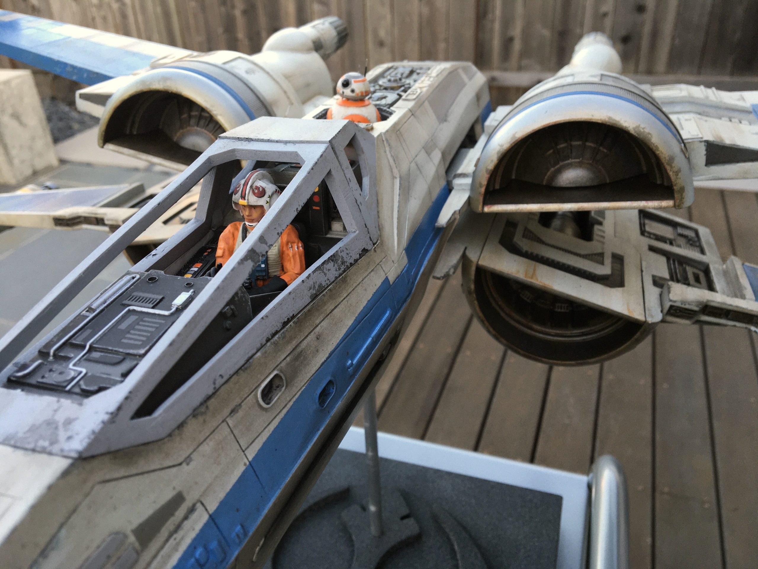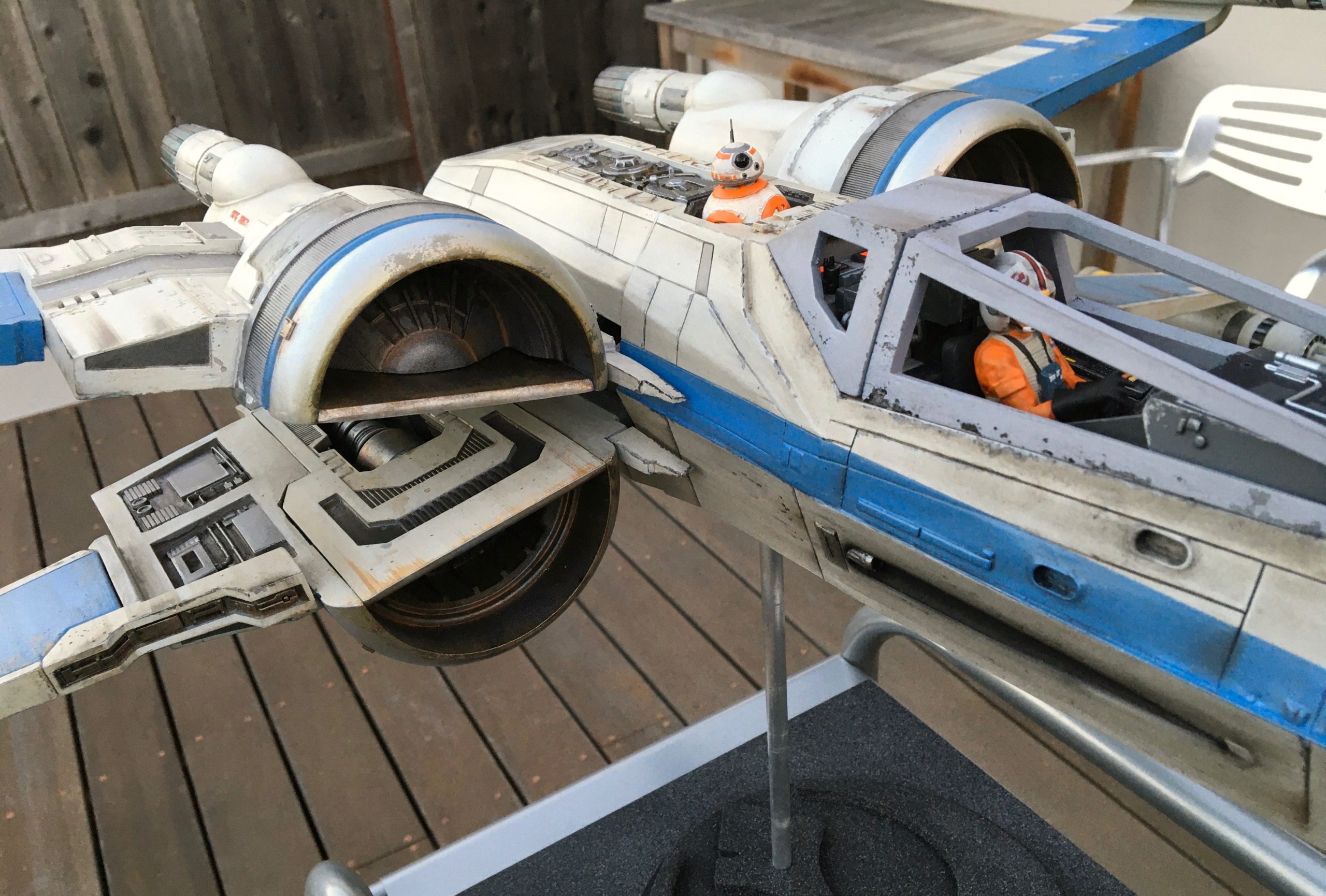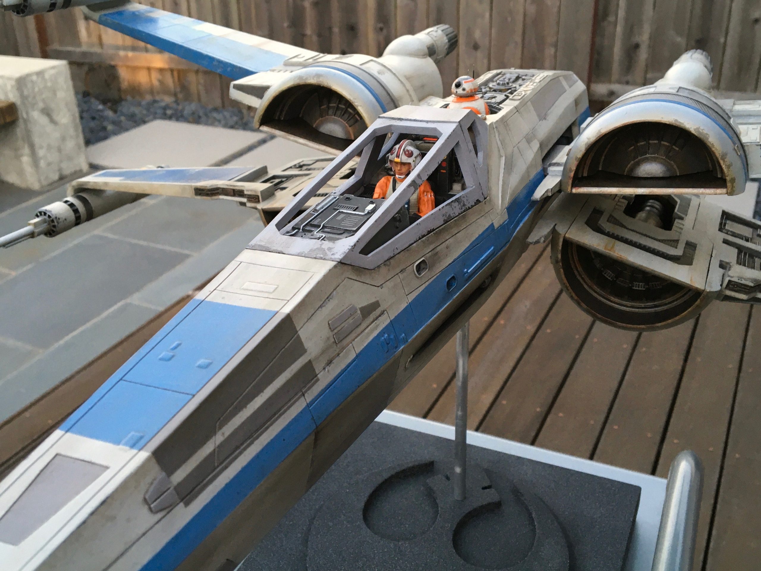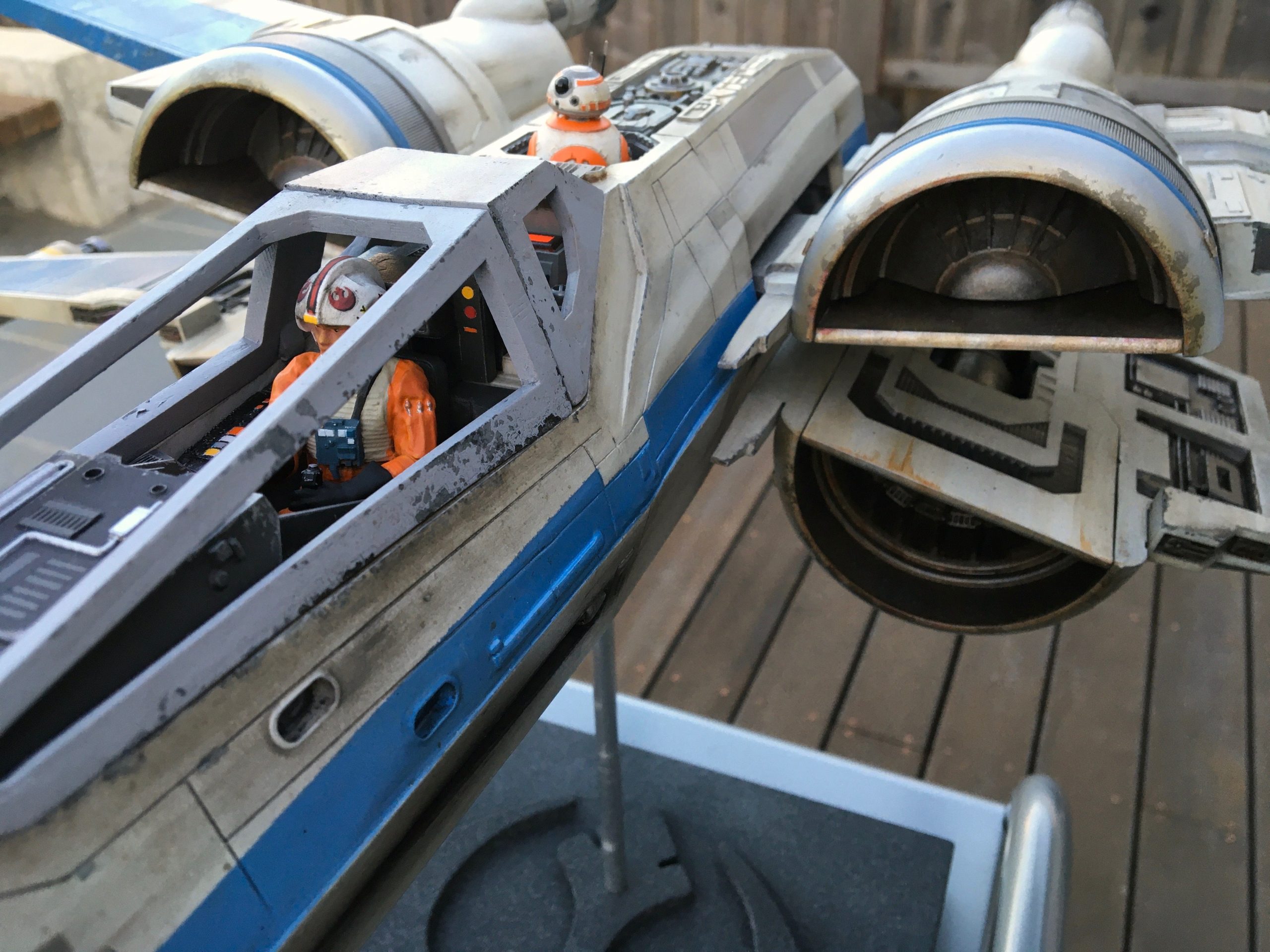 This is a Tony Celliers Dynamic Digital Creations 1/17 T-70 X-Wing kit. My initial reaction reviewing the build doc was that it was going to be a tough build, but once I started the build, it turned out to be the opposite. Fact is, there aren’t really that many parts to the kit and the build is quite fun and not complicated. Kit has resin castings as well as 3D printed parts. The wings and interior wing mechanism is 3D printed. The fuselage section was made from two parts top and two bottoms, and I wanted everything to blend in so filler was used. I didn’t like the nose “cone” detail because it seem too large so I used the disc sander to shave it down closer to the fuselage profile. The Hobby stores were closed due to the virus so I went to Home Depot to buy off the shelf spray can primer and paints. While I followed the paint scheme from the movie, I didn’t bother to follow the colors exactly to the movie, especially in the case of the pilot which was something I purchased from Falcon 3D. The Small paint details were airbrushed with Tamiya and the bulk of the weathering was done with budget oil paints. Prismacolor pencils were also used to “paint” weather streaks. I didn’t want X WING FIGHTER on the base so I filled it. Also, I find the base too small a footprint to support the ship which is heavy, so I went to the plastic store scrap bin to buy a larger base. This doubled the thickness allowing the aluminum rod to have more depth to insert into. Overall, it was a fun kit to build and highly recommended.