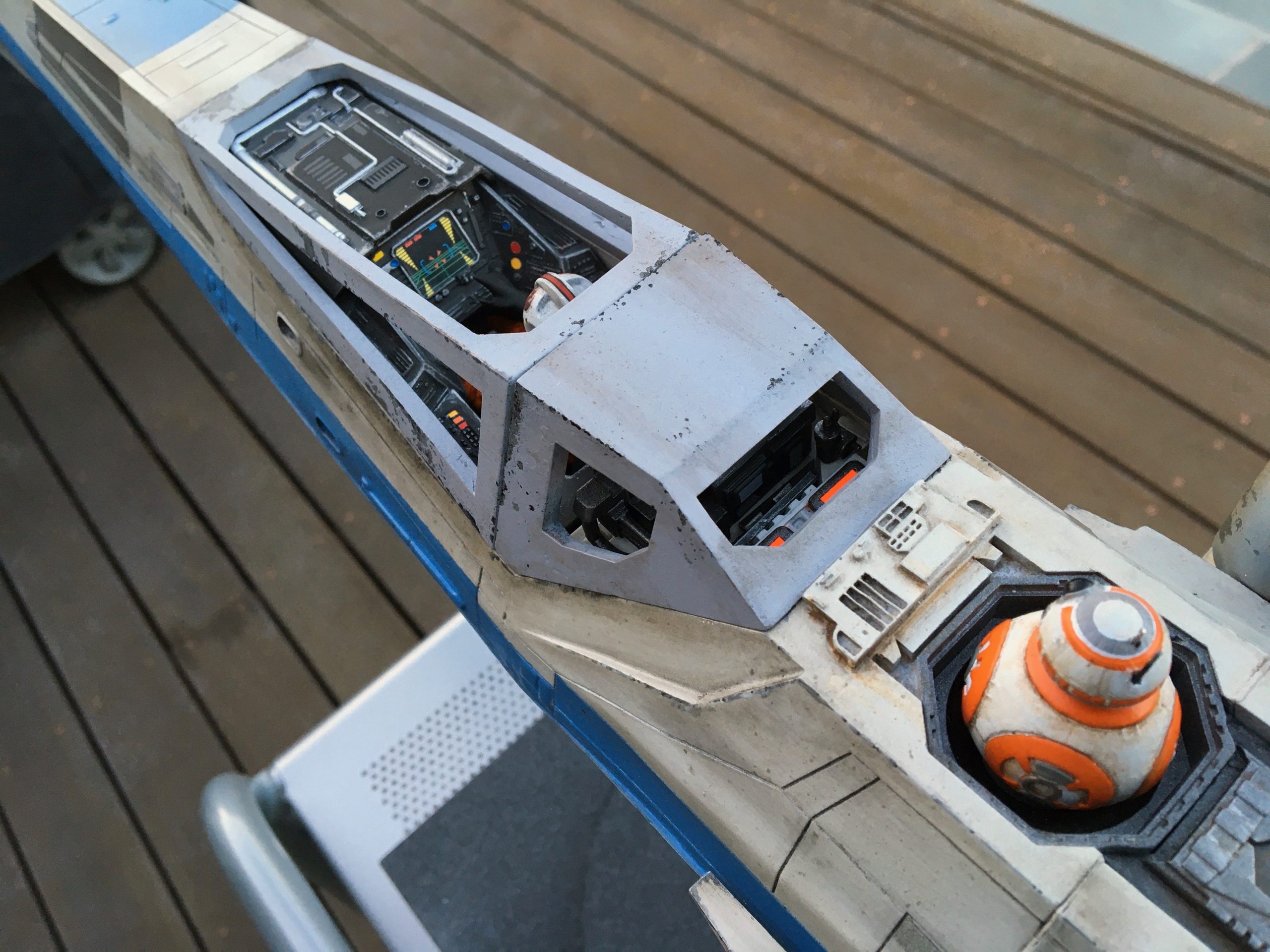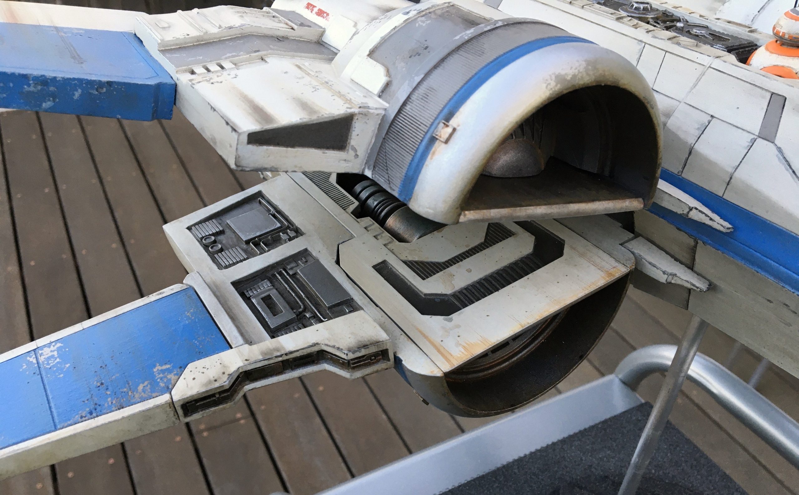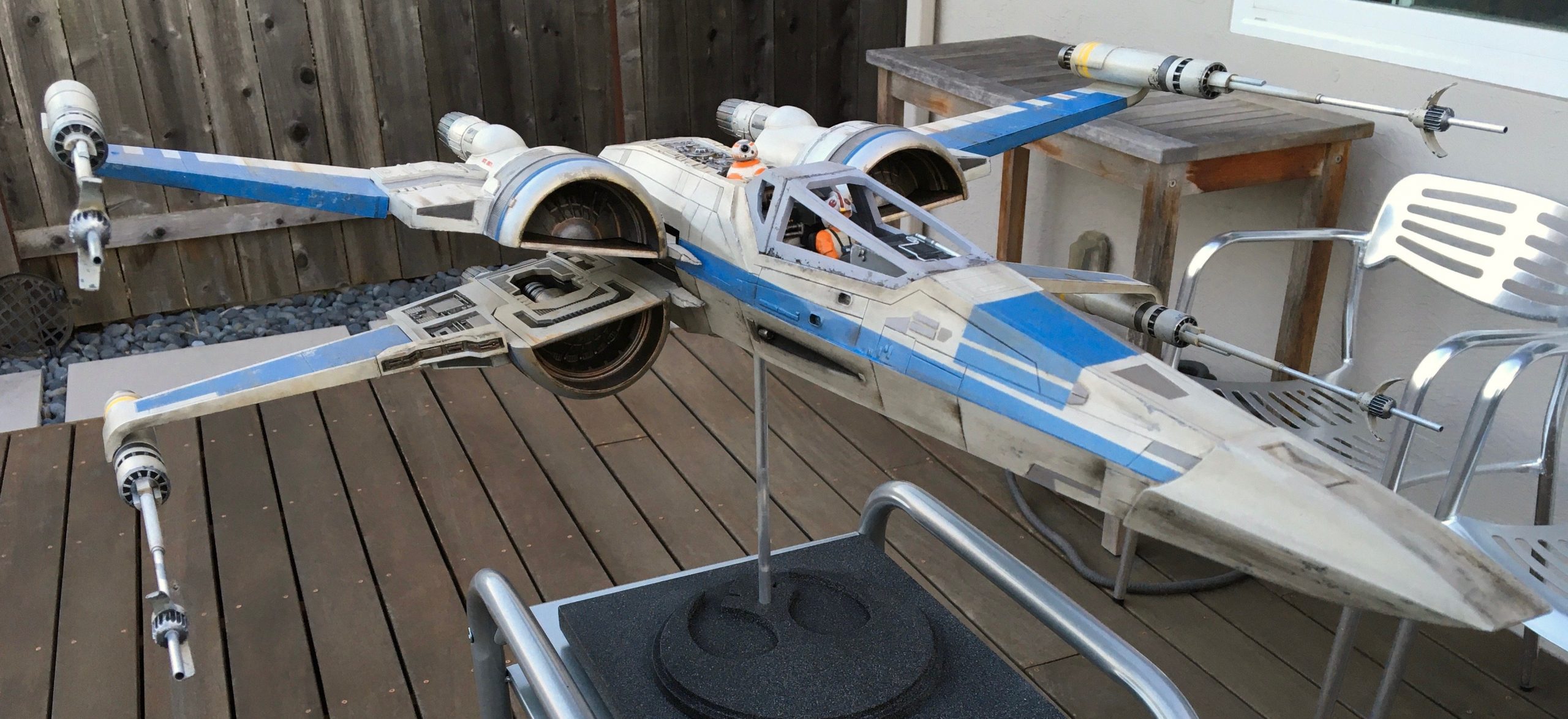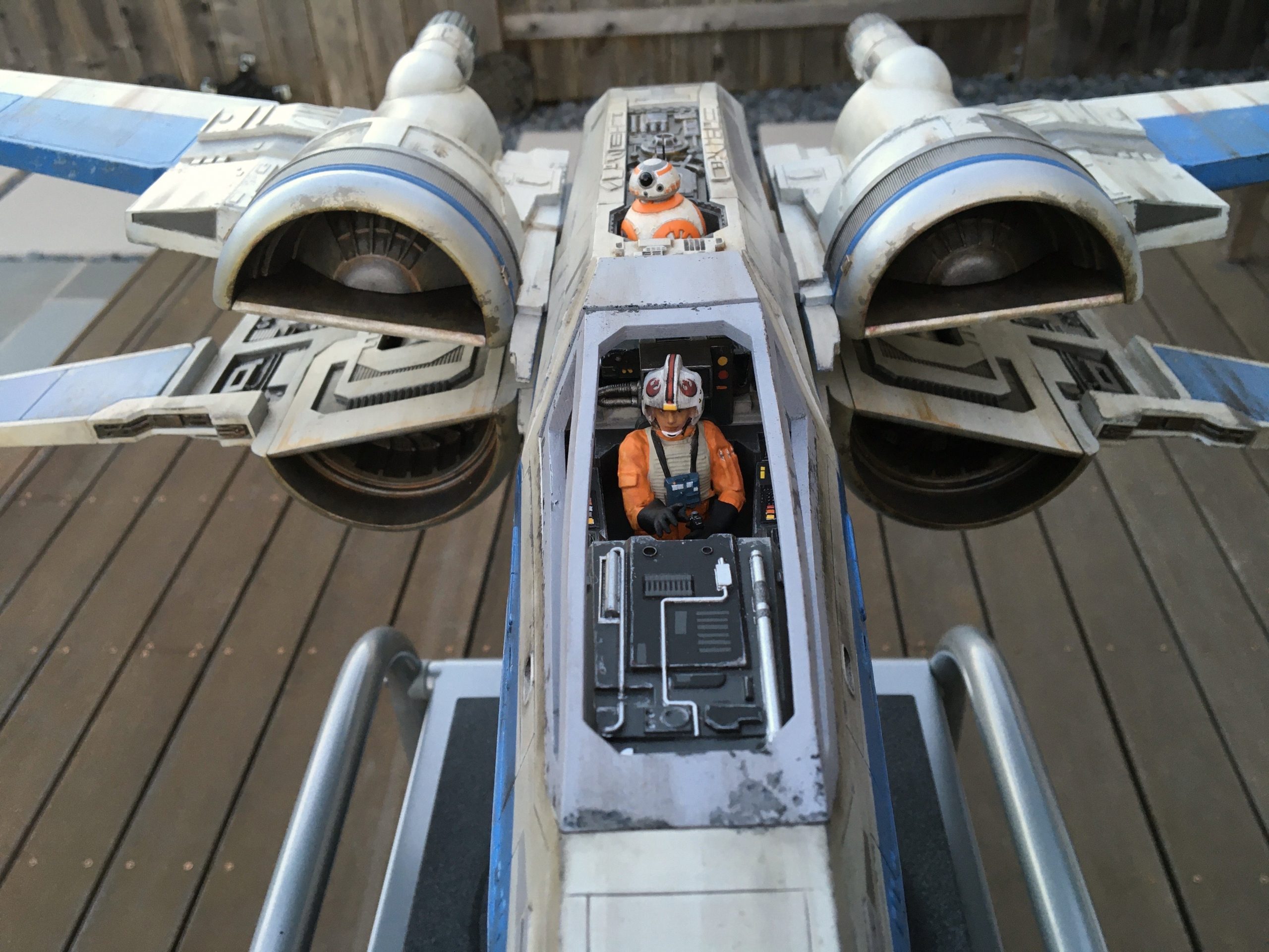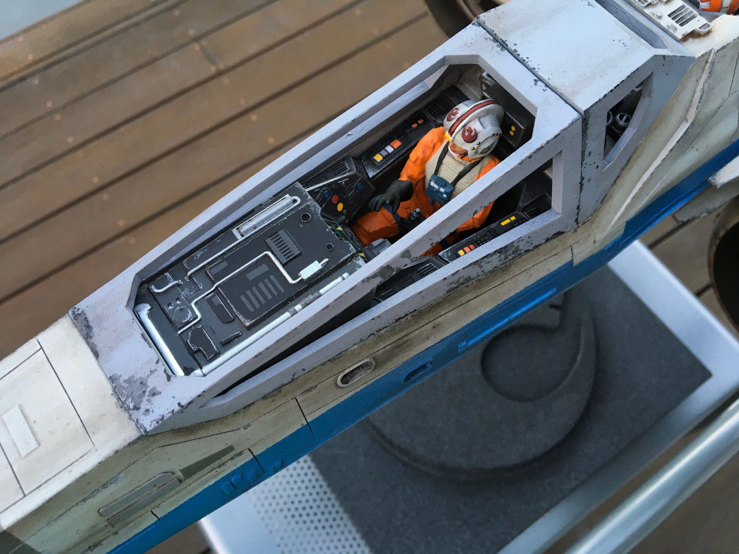 This is a Tony Celliers Dynamic Digital Creations 1/17 T-70 X-Wing kit. My initial reaction reviewing the build doc was that it was going to be a tough build, but once I started the build, it turned out to be the opposite. Fact is, there aren’t really that many parts to the kit and the build is quite fun and not complicated. Kit has resin castings as well as 3D printed parts. The wings and interior wing mechanism is 3D printed. The fuselage section was made from two parts top and two bottoms, and I wanted everything to blend in so filler was used. I didn’t like the nose “cone” detail because it seem too large so I used the disc sander to shave it down closer to the fuselage profile. The Hobby stores were closed due to the virus so I went to Home Depot to buy off the shelf spray can primer and paints. While I followed the paint scheme from the movie, I didn’t bother to follow the colors exactly to the movie, especially in the case of the pilot which was something I purchased from Falcon 3D. The Small paint details were airbrushed with Tamiya and the bulk of the weathering was done with budget oil paints. Prismacolor pencils were also used to “paint” weather streaks. I didn’t want X WING FIGHTER on the base so I filled it. Also, I find the base too small a footprint to support the ship which is heavy, so I went to the plastic store scrap bin to buy a larger base. This doubled the thickness allowing the aluminum rod to have more depth to insert into. Overall, it was a fun kit to build and highly recommended.