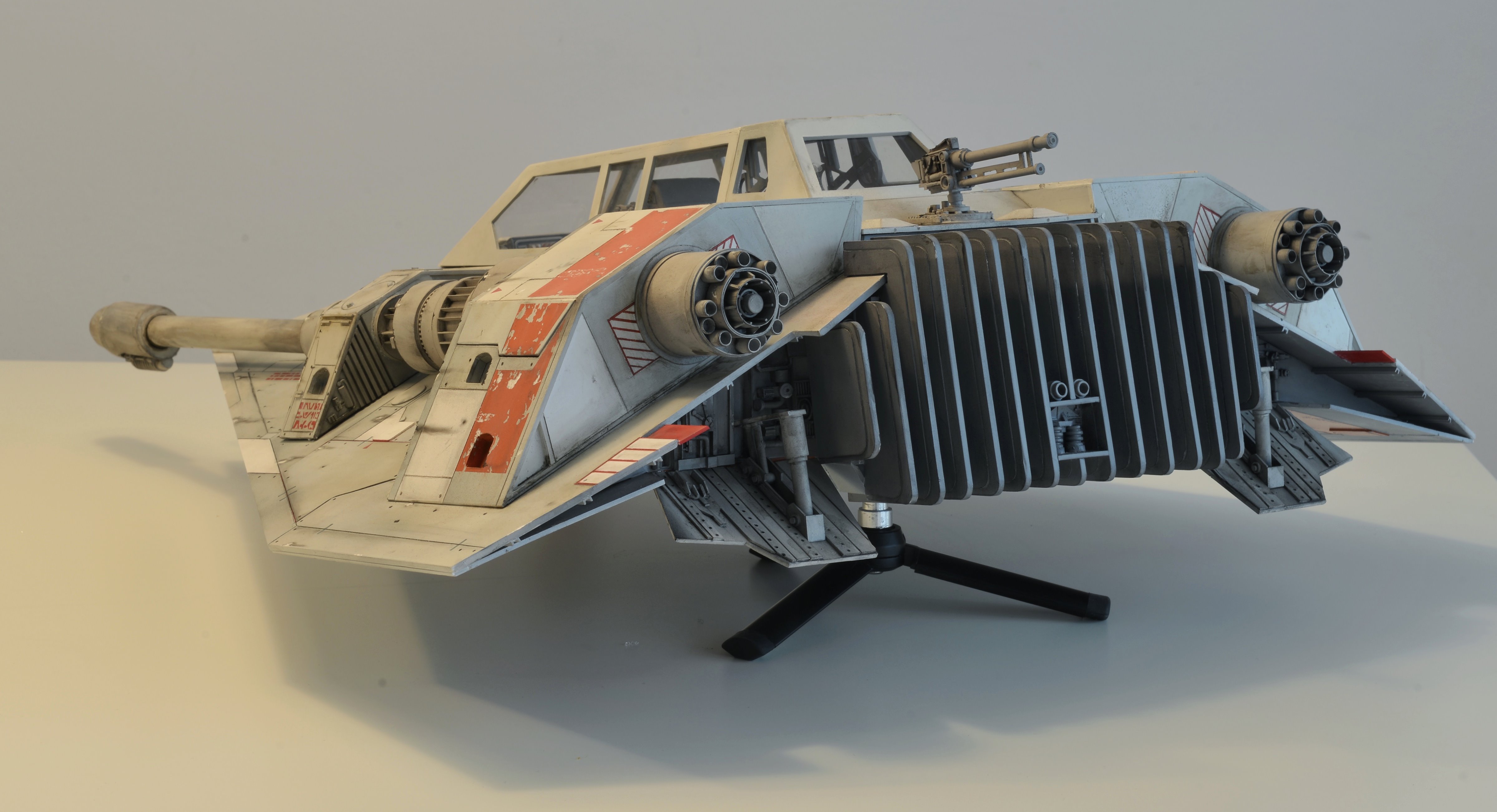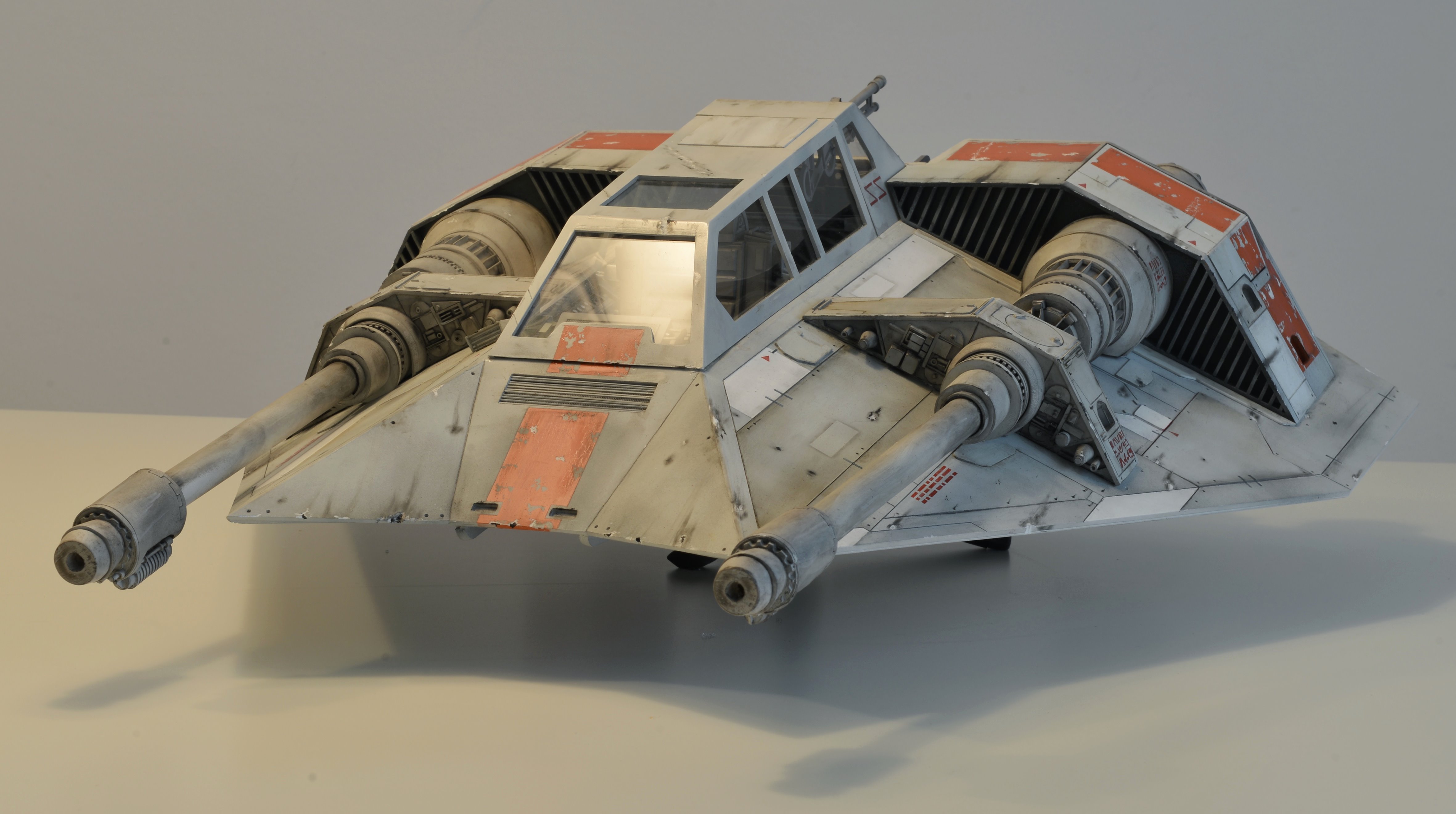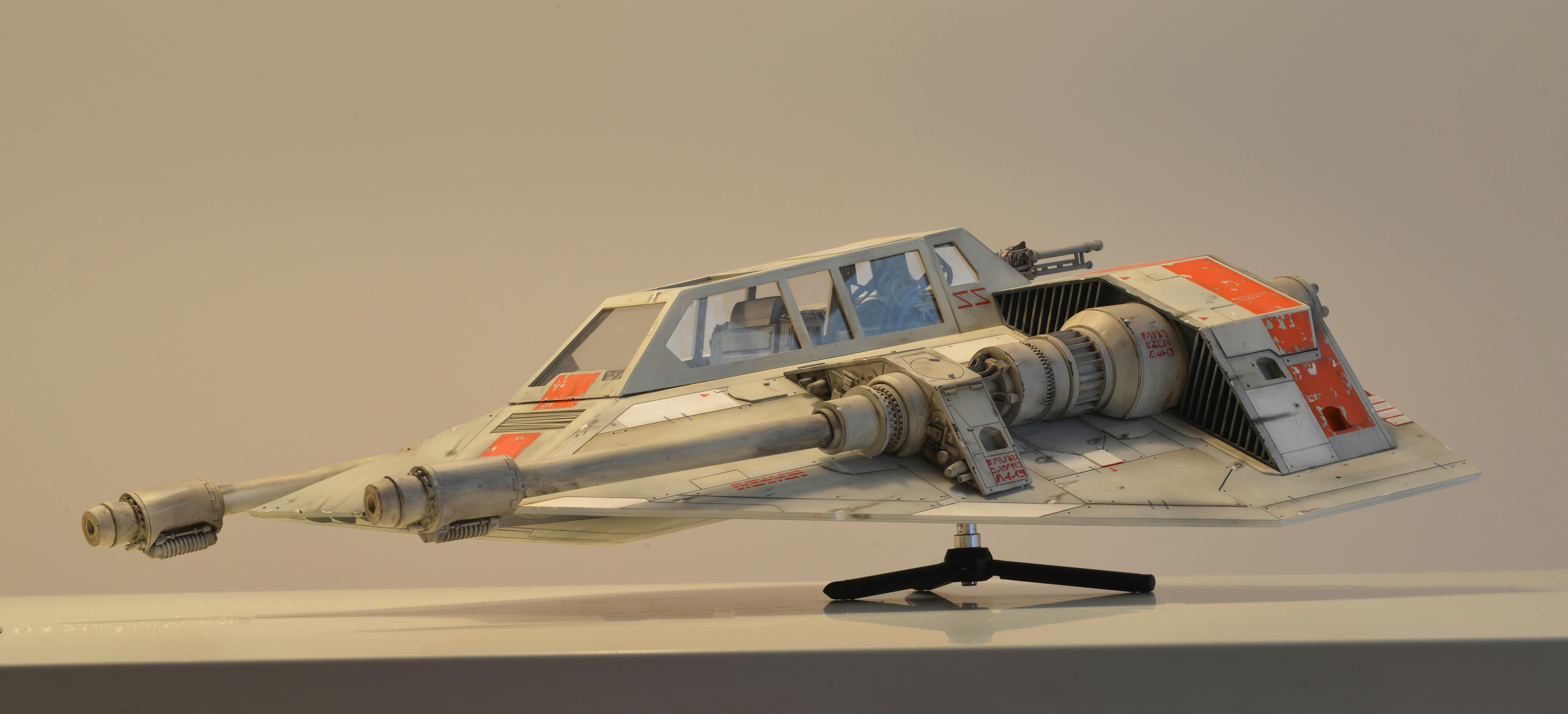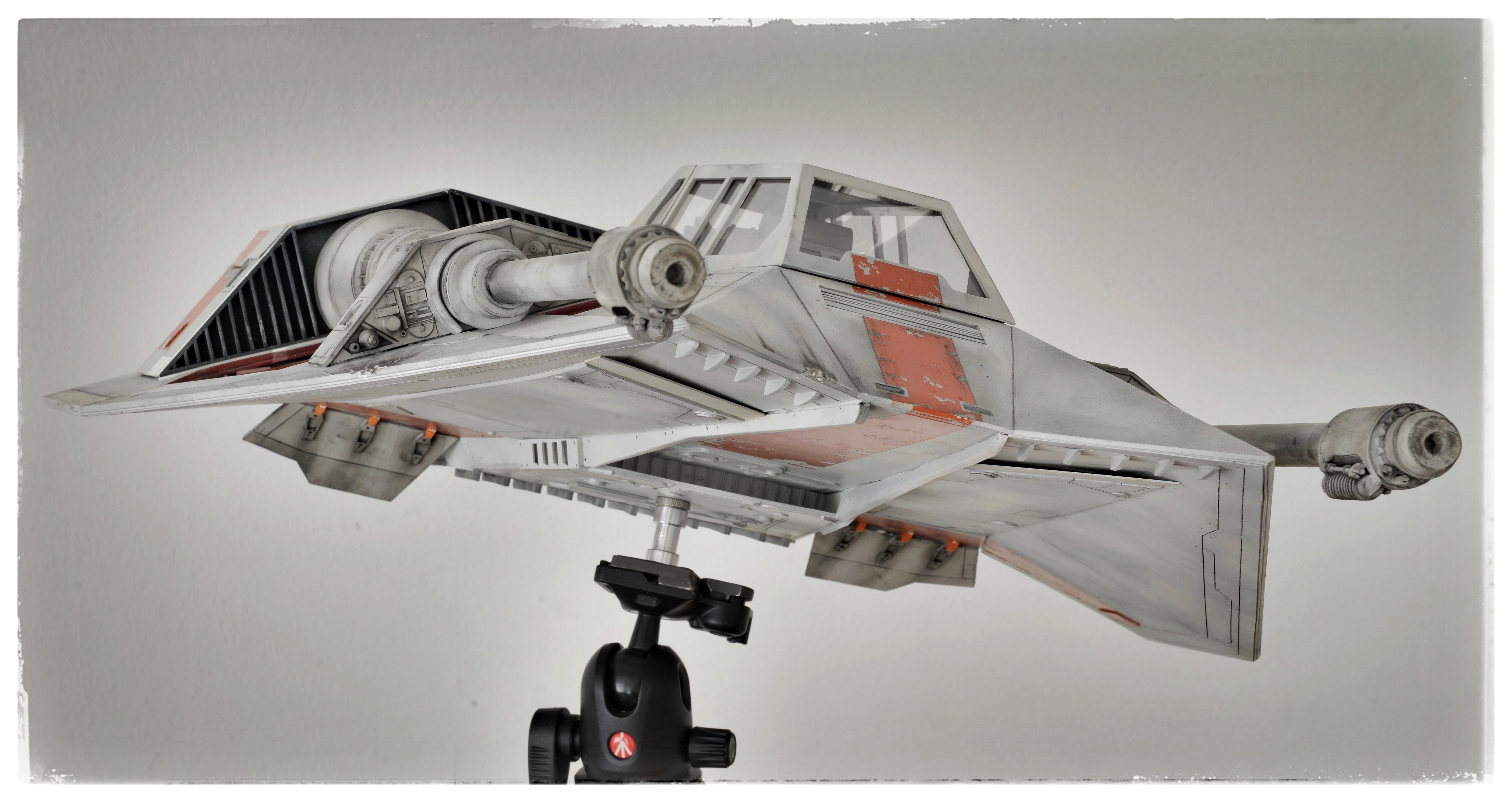 I have almost finalized a second Snowspeeder, which is the orange version. It has open panels (which can be closed) and the scale is 1:10 again, studio scale. The model is about 55 cm long. The pictures have been made with different light so the look of the model is slightly different. Like my first Snowspeeder, this model is also completely scratch built from styrene parts.