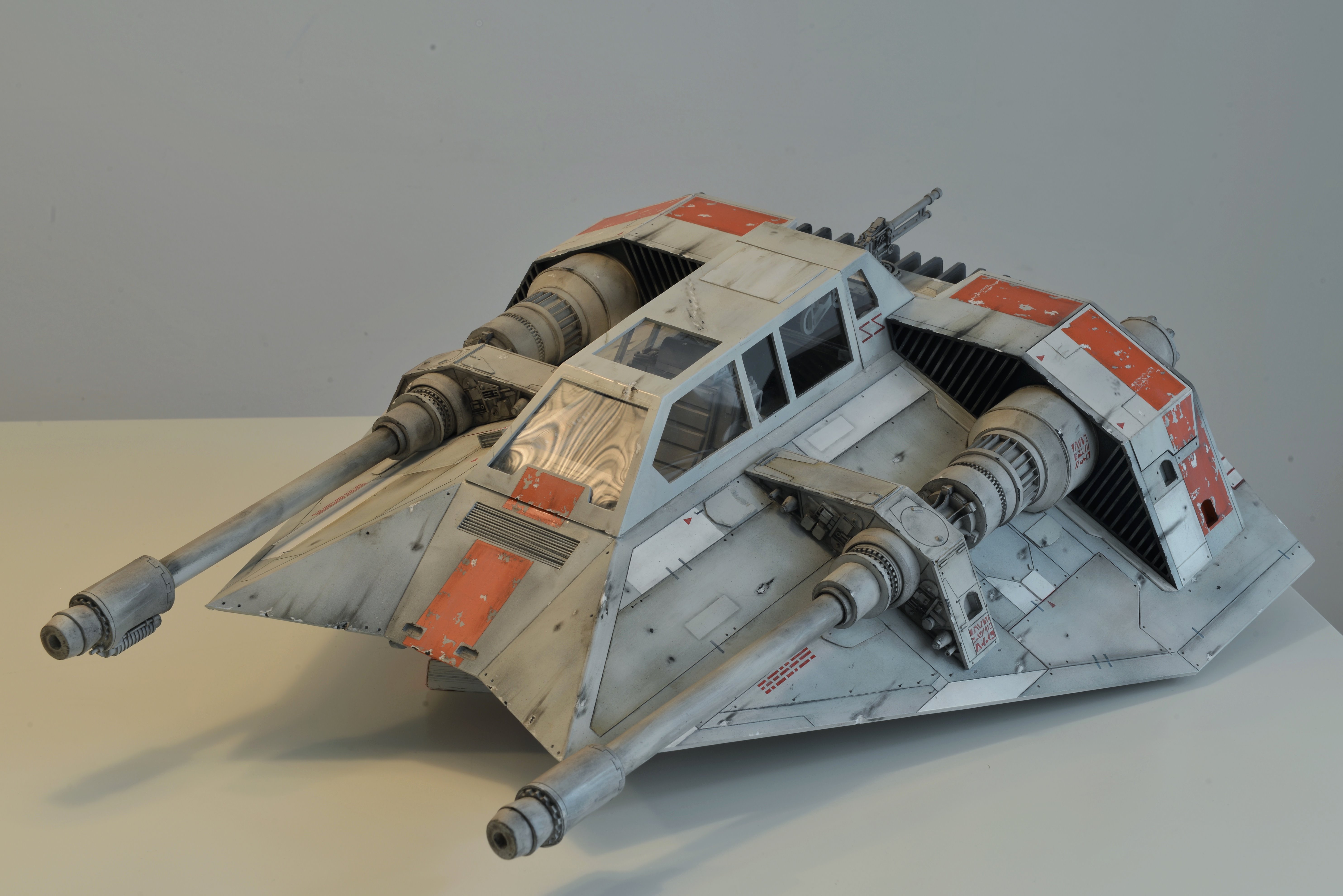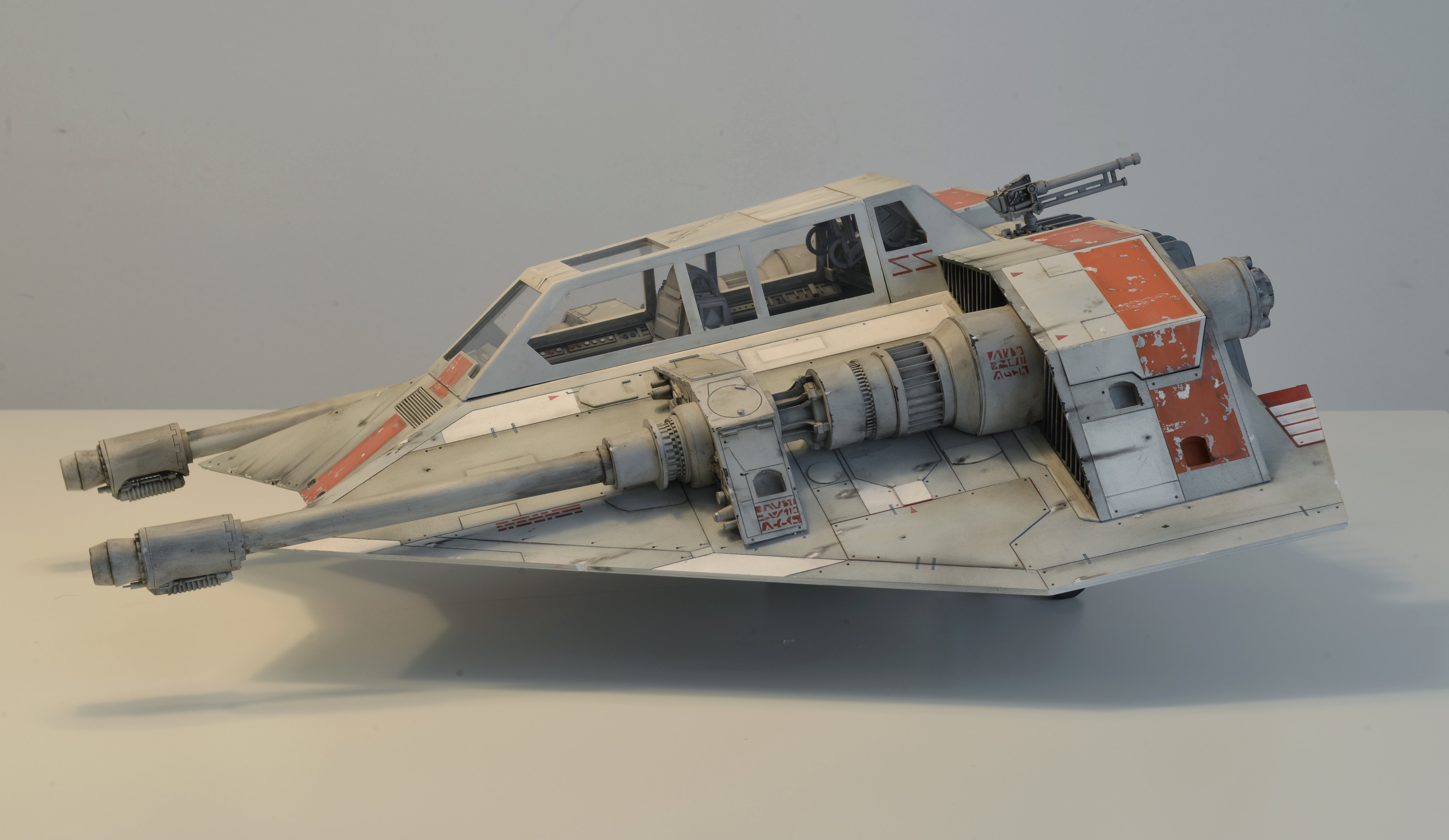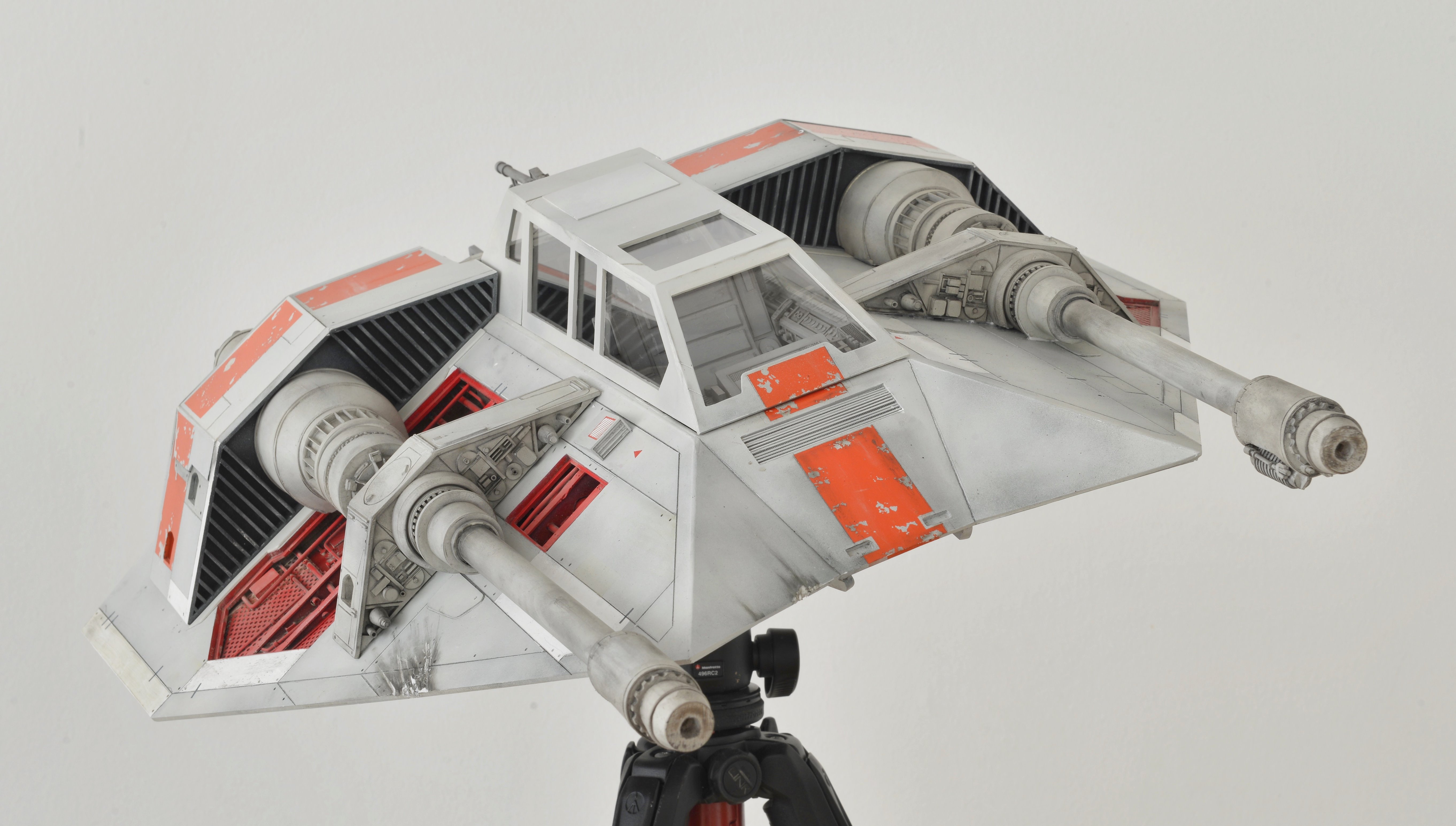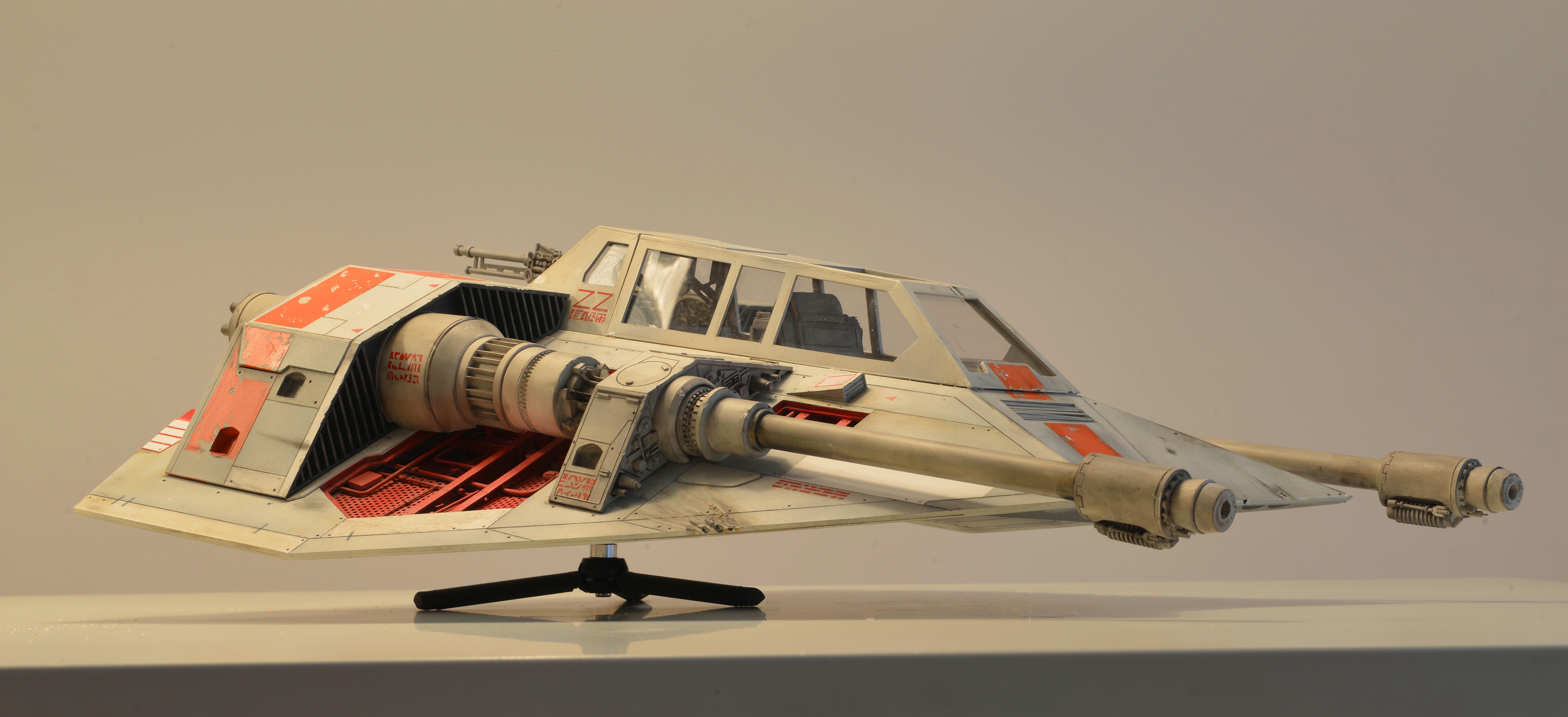 I have almost finalized a second Snowspeeder, which is the orange version. It has open panels (which can be closed) and the scale is 1:10 again, studio scale. The model is about 55 cm long. The pictures have been made with different light so the look of the model is slightly different. Like my first Snowspeeder, this model is also completely scratch built from styrene parts.