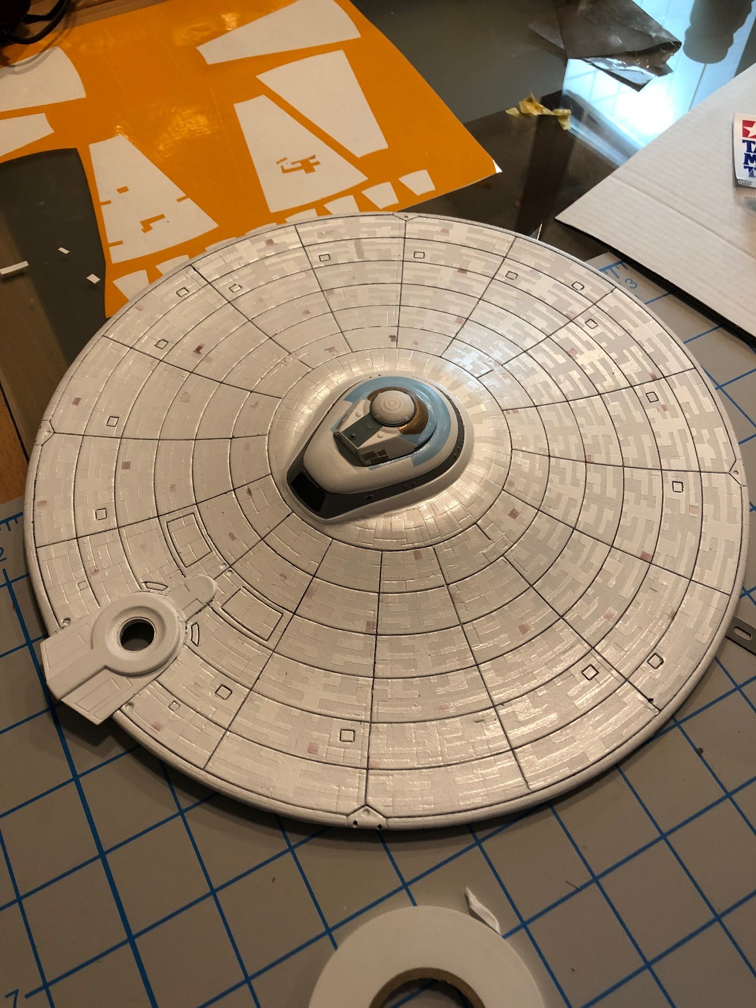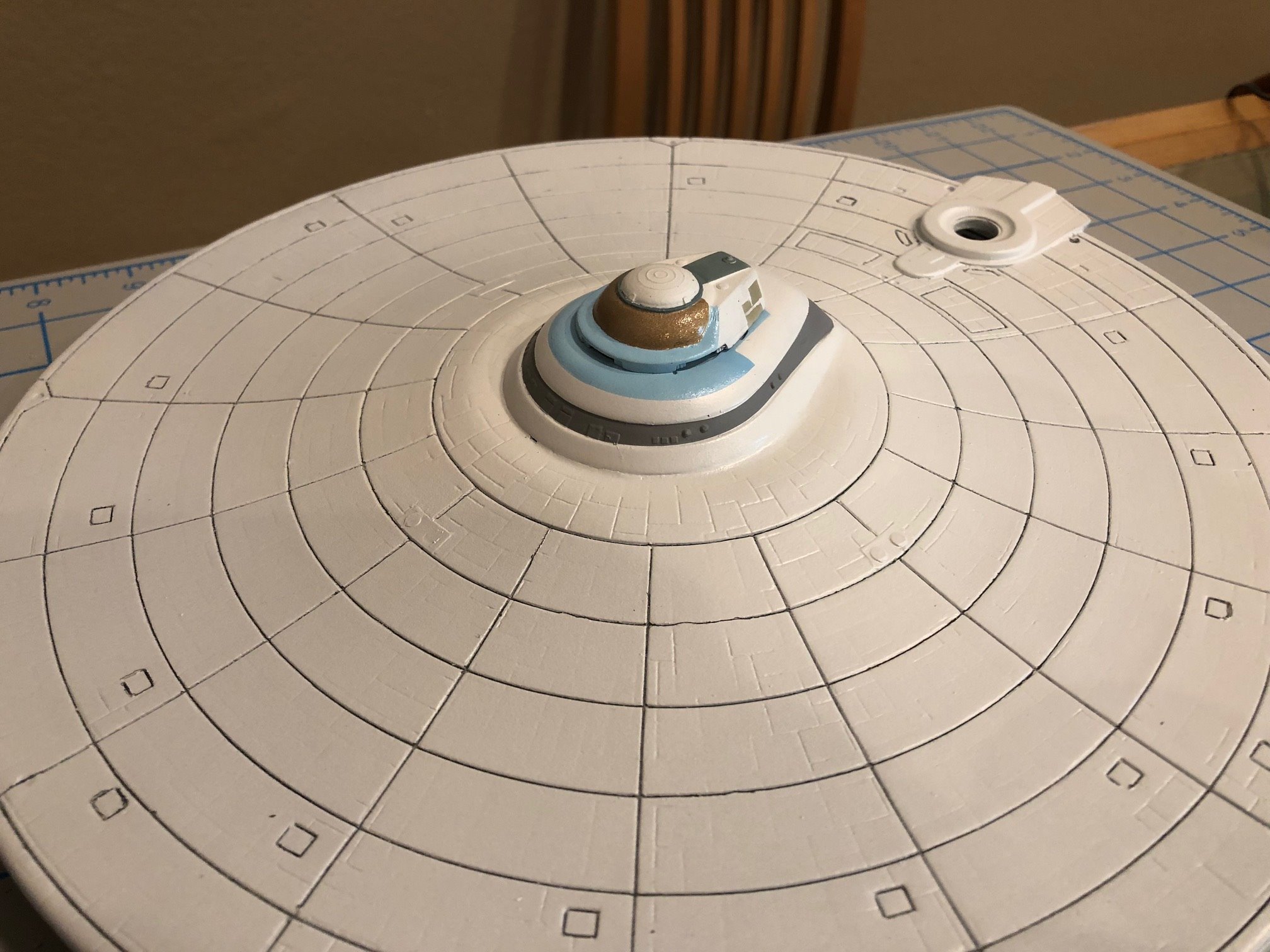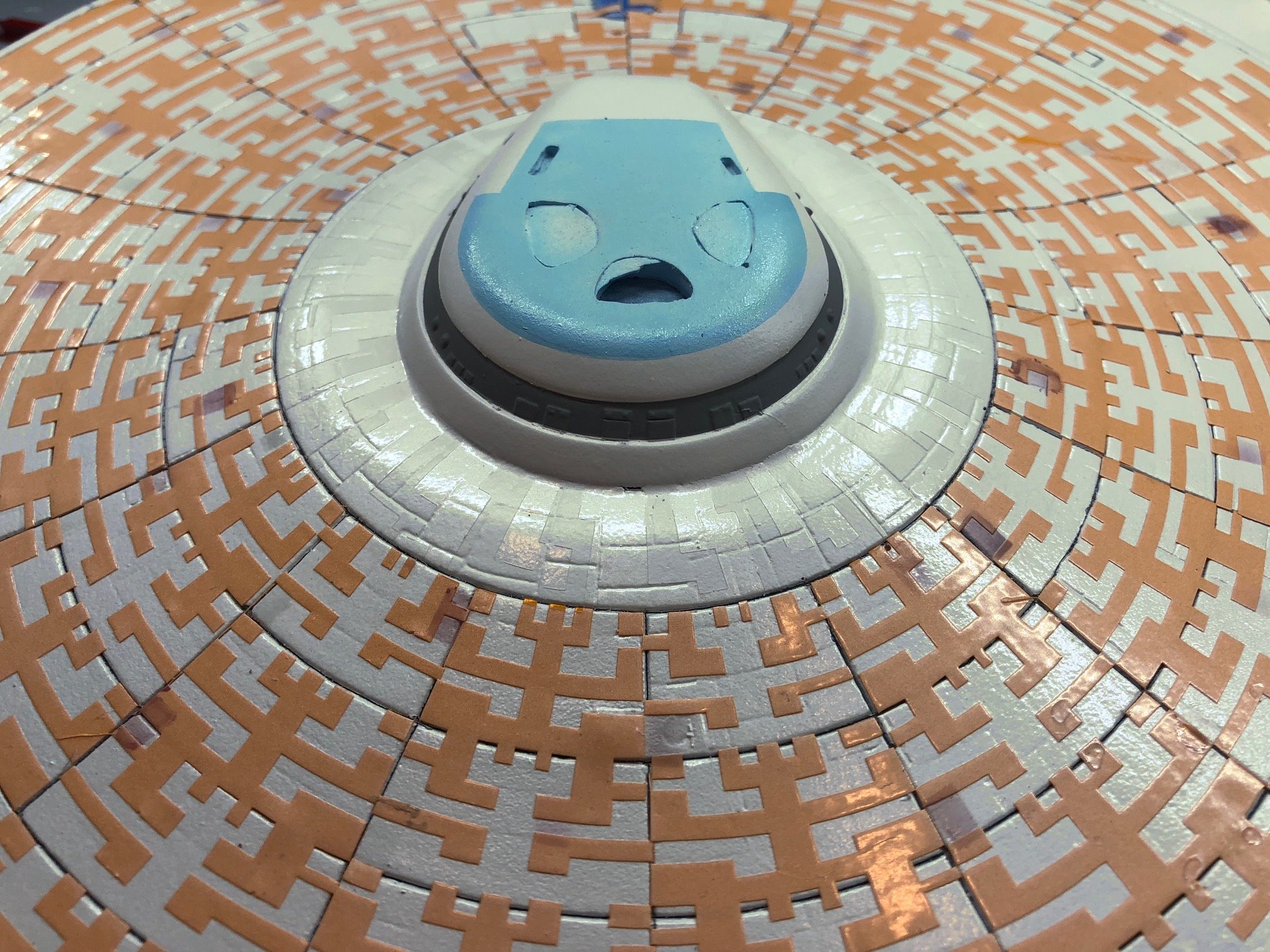 Artist Mark Tanner shows his Work In Progress (WIP) of the 1/537 AMT Starship Enterprise from The Motion Picture. Here he shows us the fill of the deep original panel lines, and the panel sheen difference in what is regularly referred to as AZTEC hull paneling for this miniature.