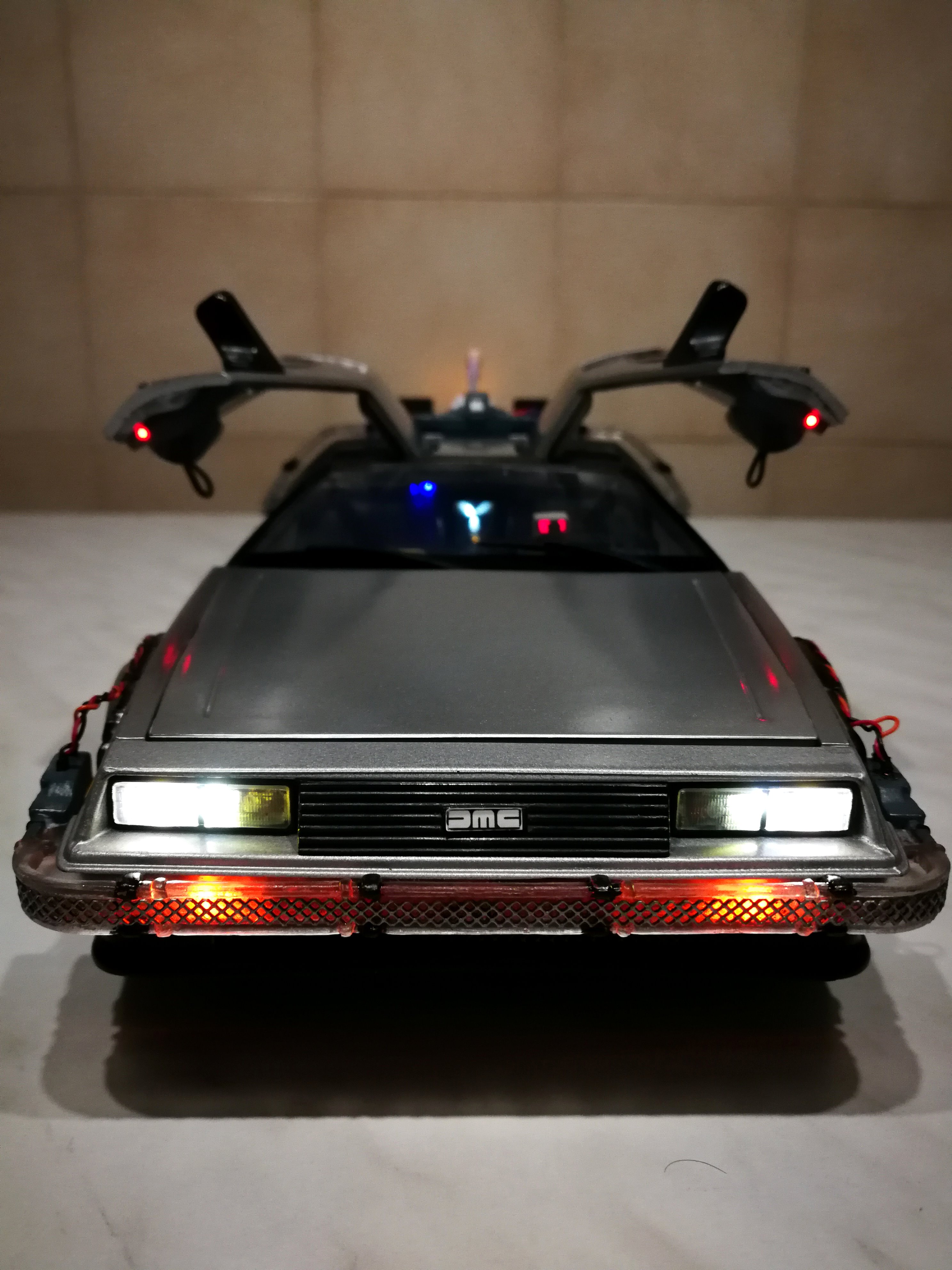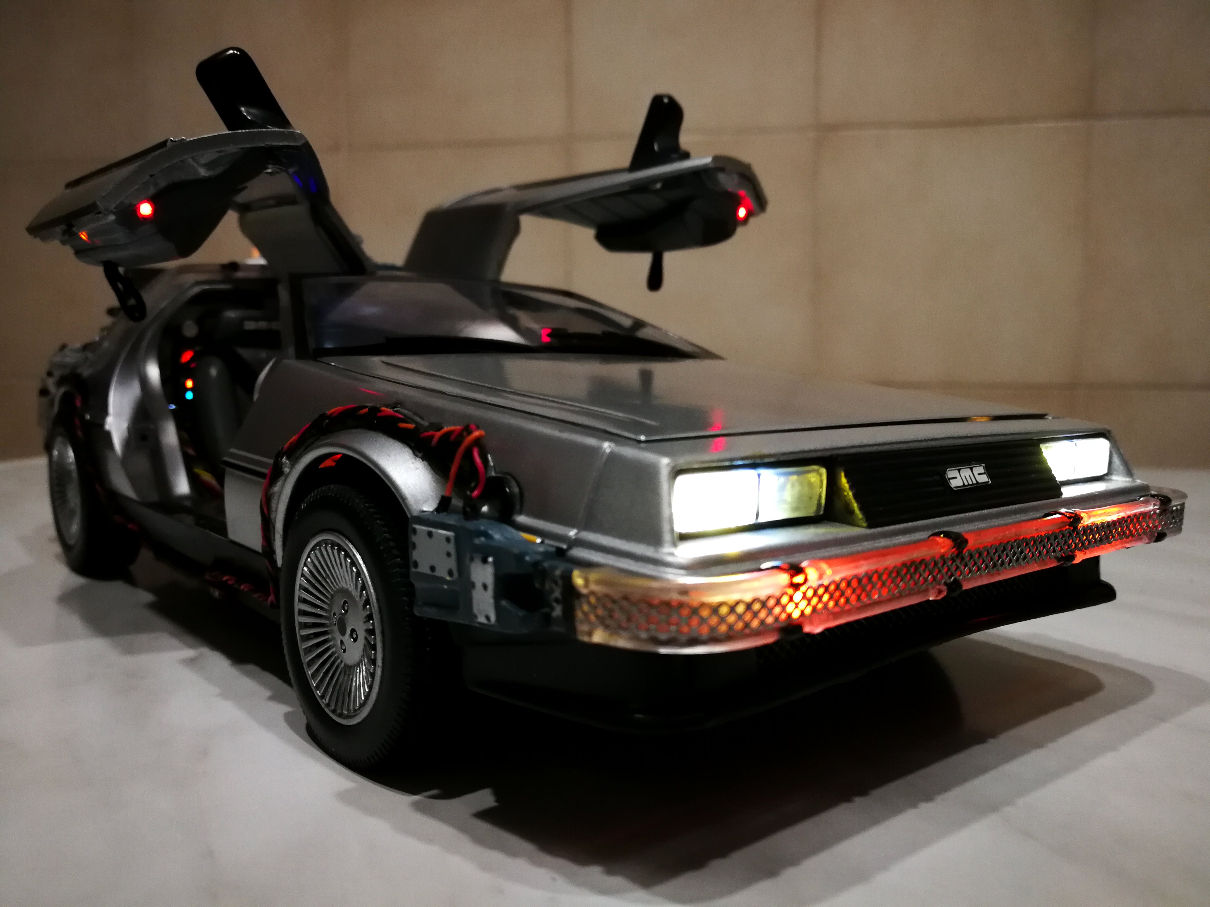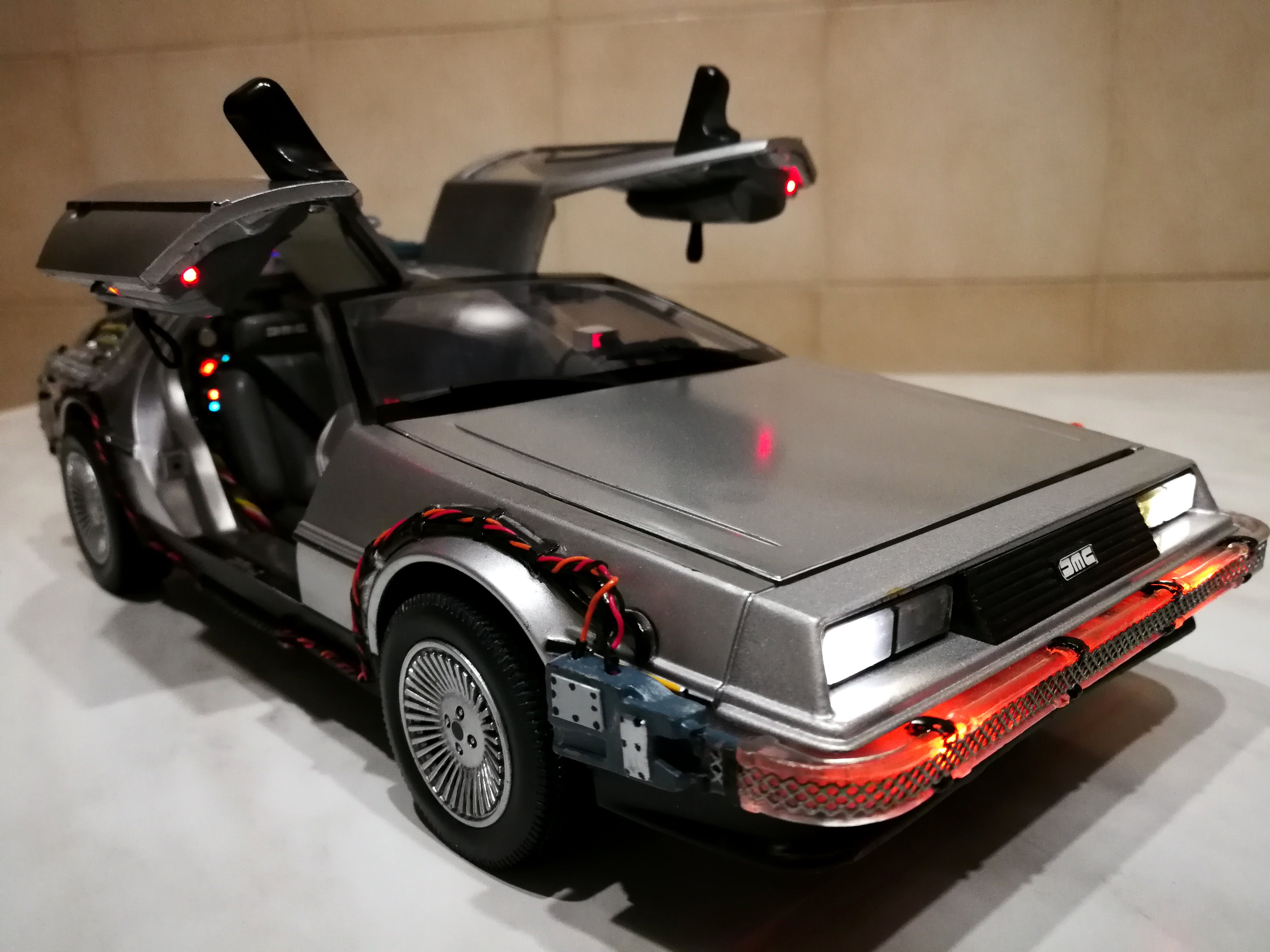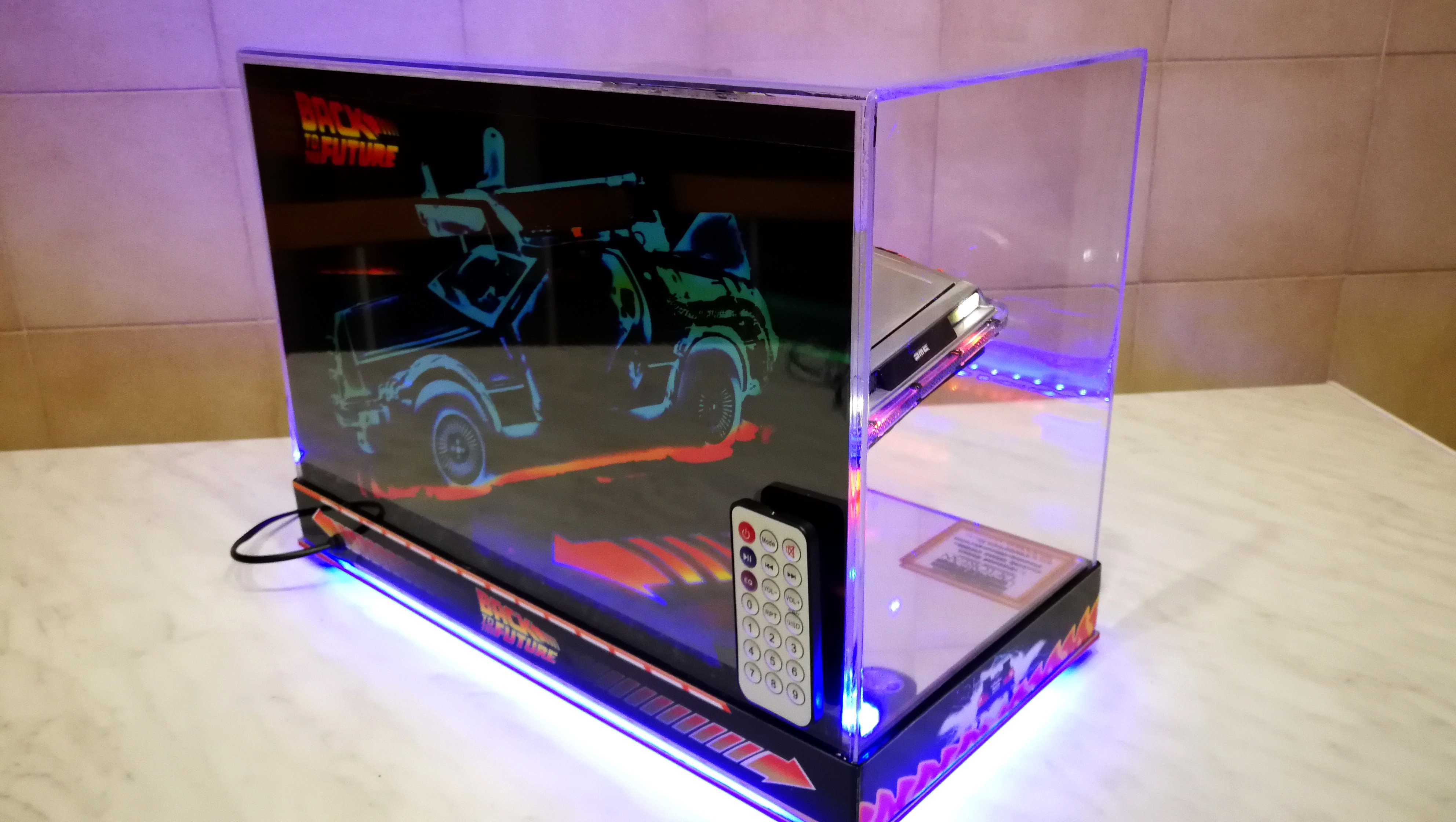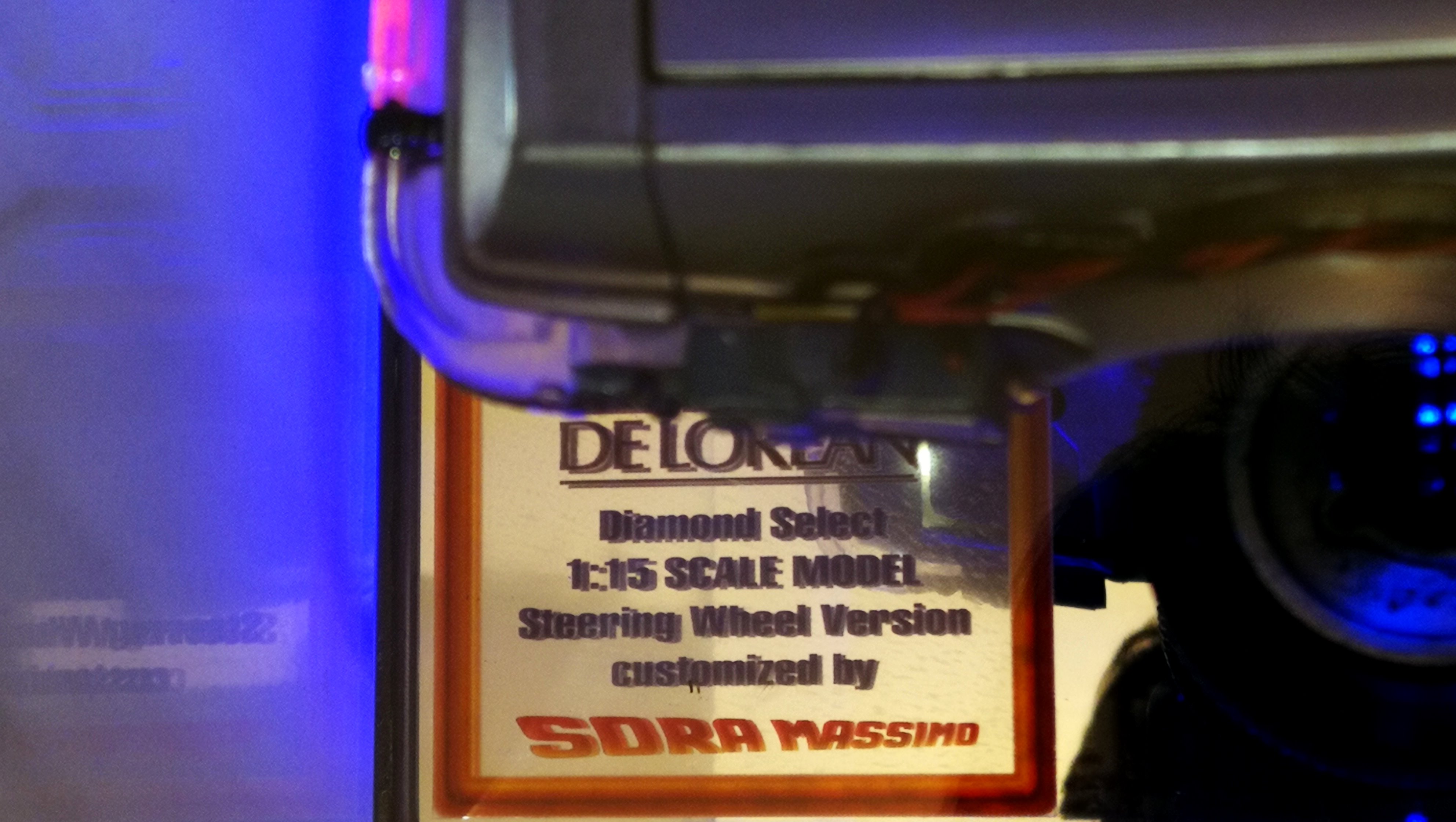 Diamond Select DeLorean model 1:15 modified with new lights and a dedicated stand. In the stand there is a working clock, lights and a memory card with multiple songs taken from the films back to the future. There are also some dialogues from the first film (in Italian). The original functions of the model (lights and sounds and flight / road configuration) are unchanged and the model also works with batteries. The stand and the stand graphics were designed and created by myself.