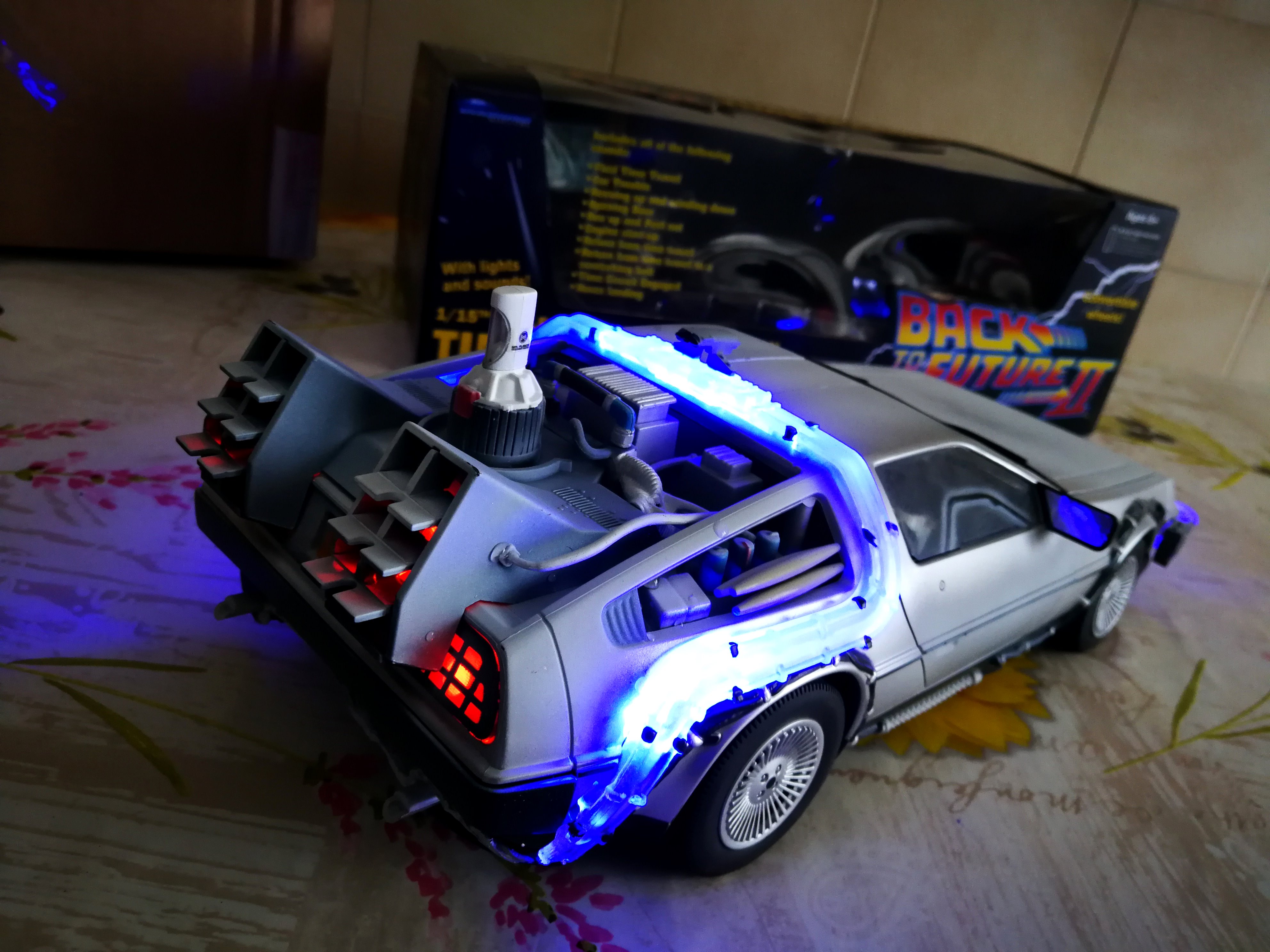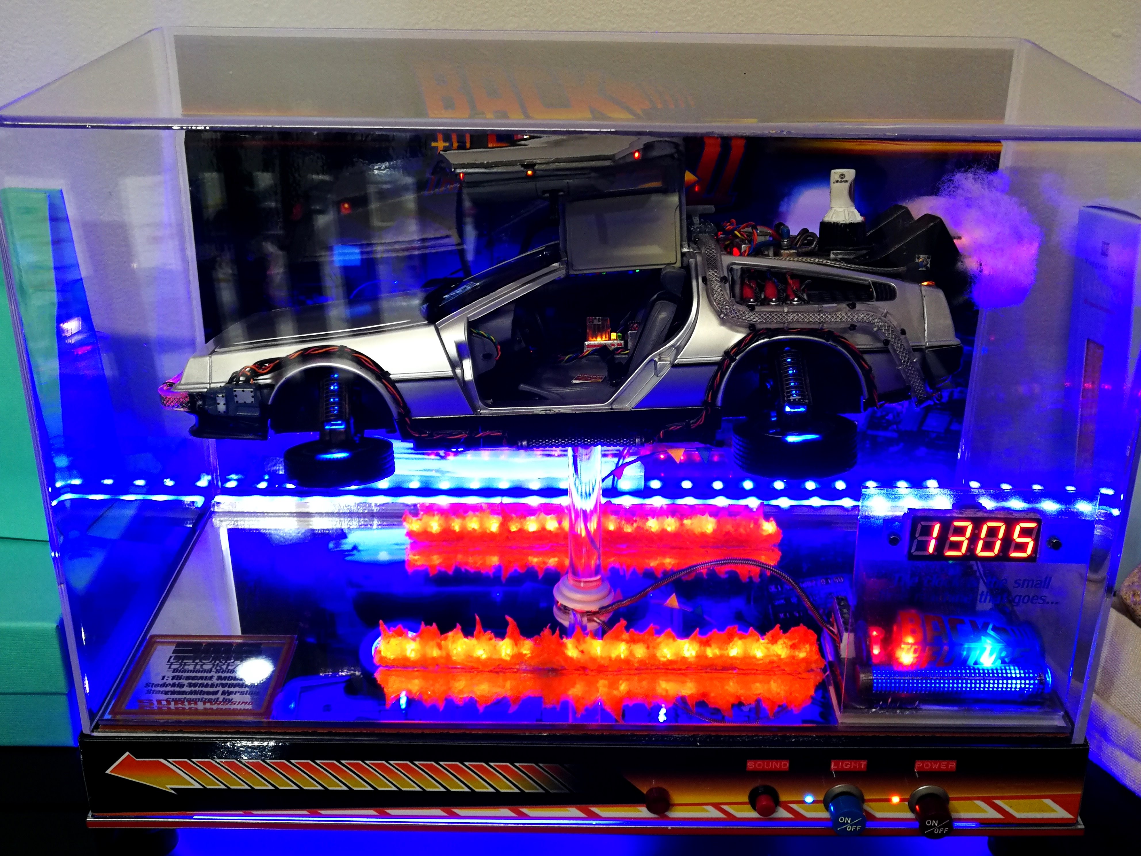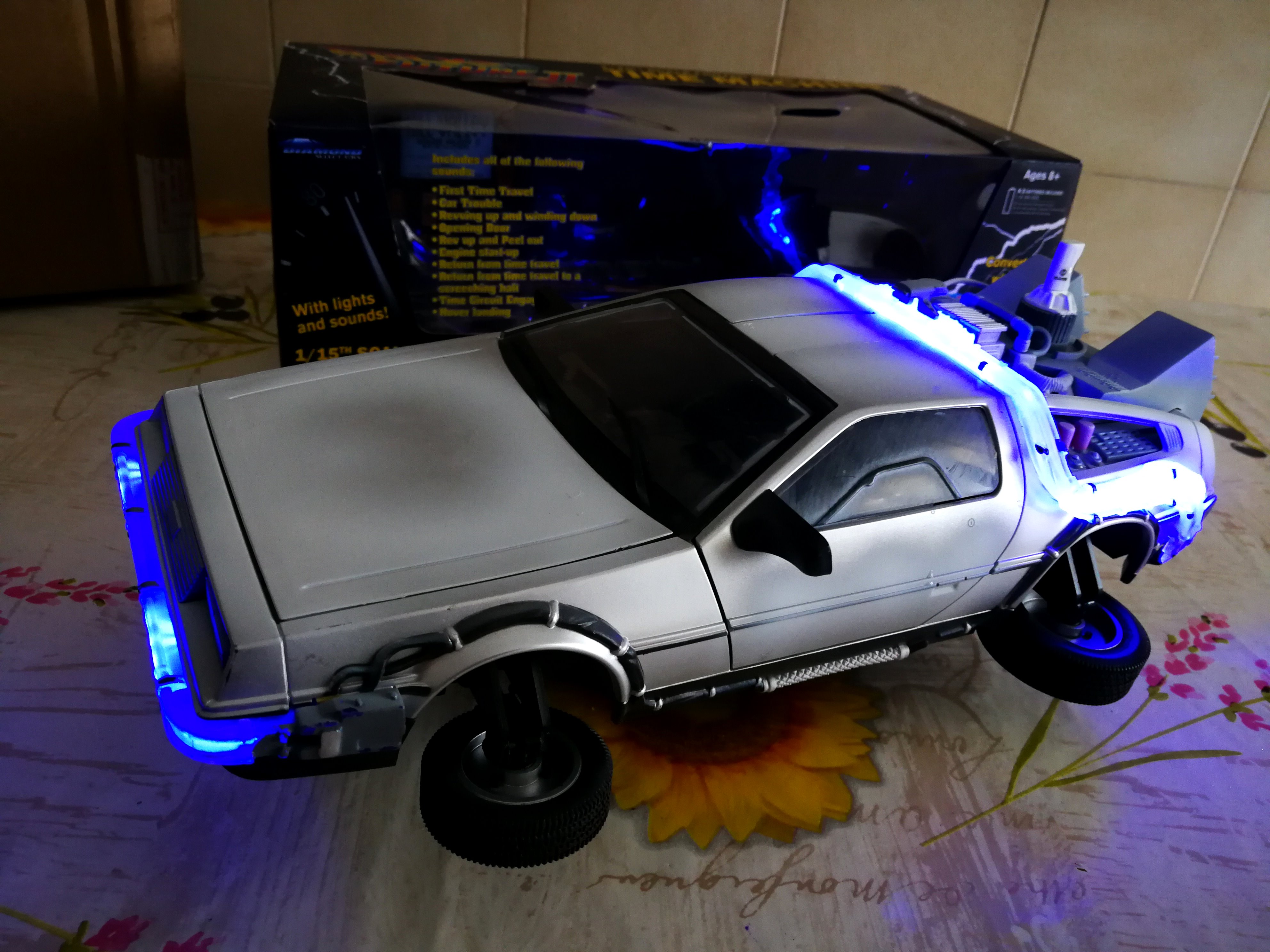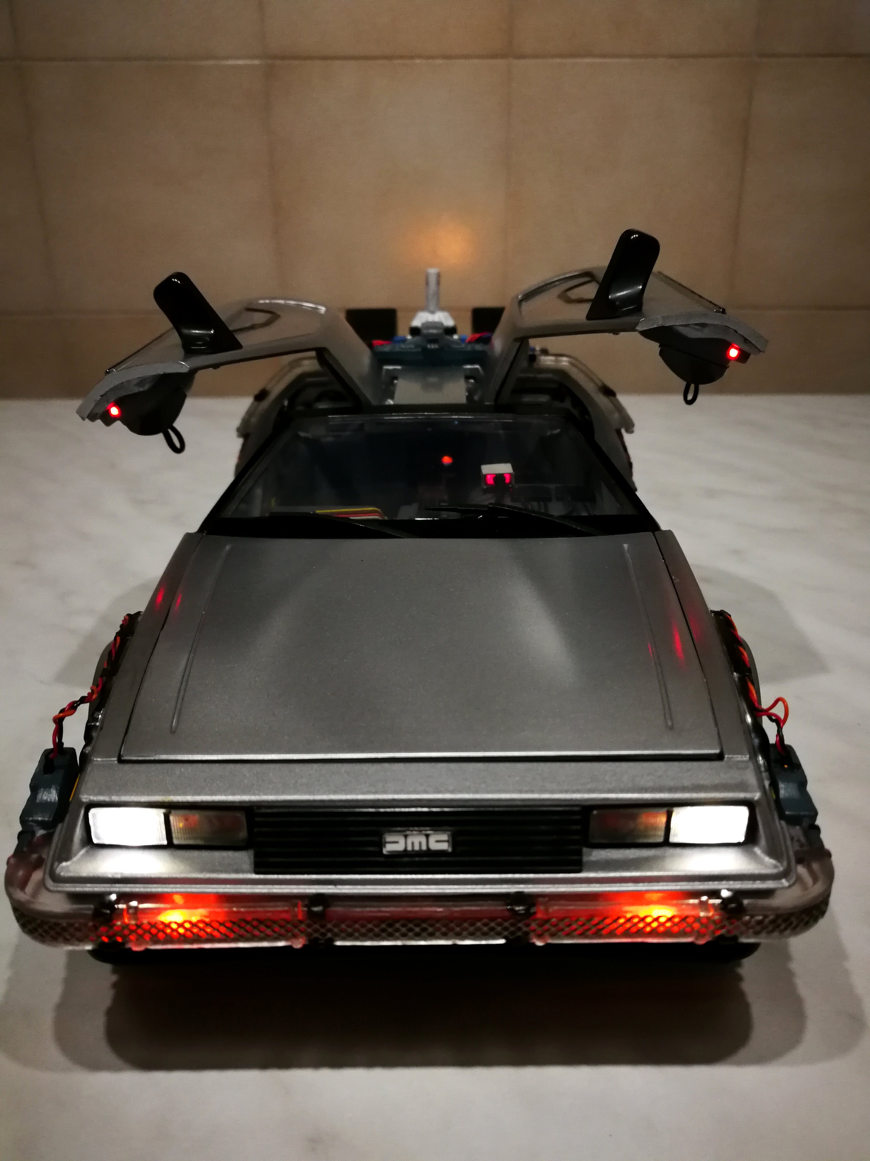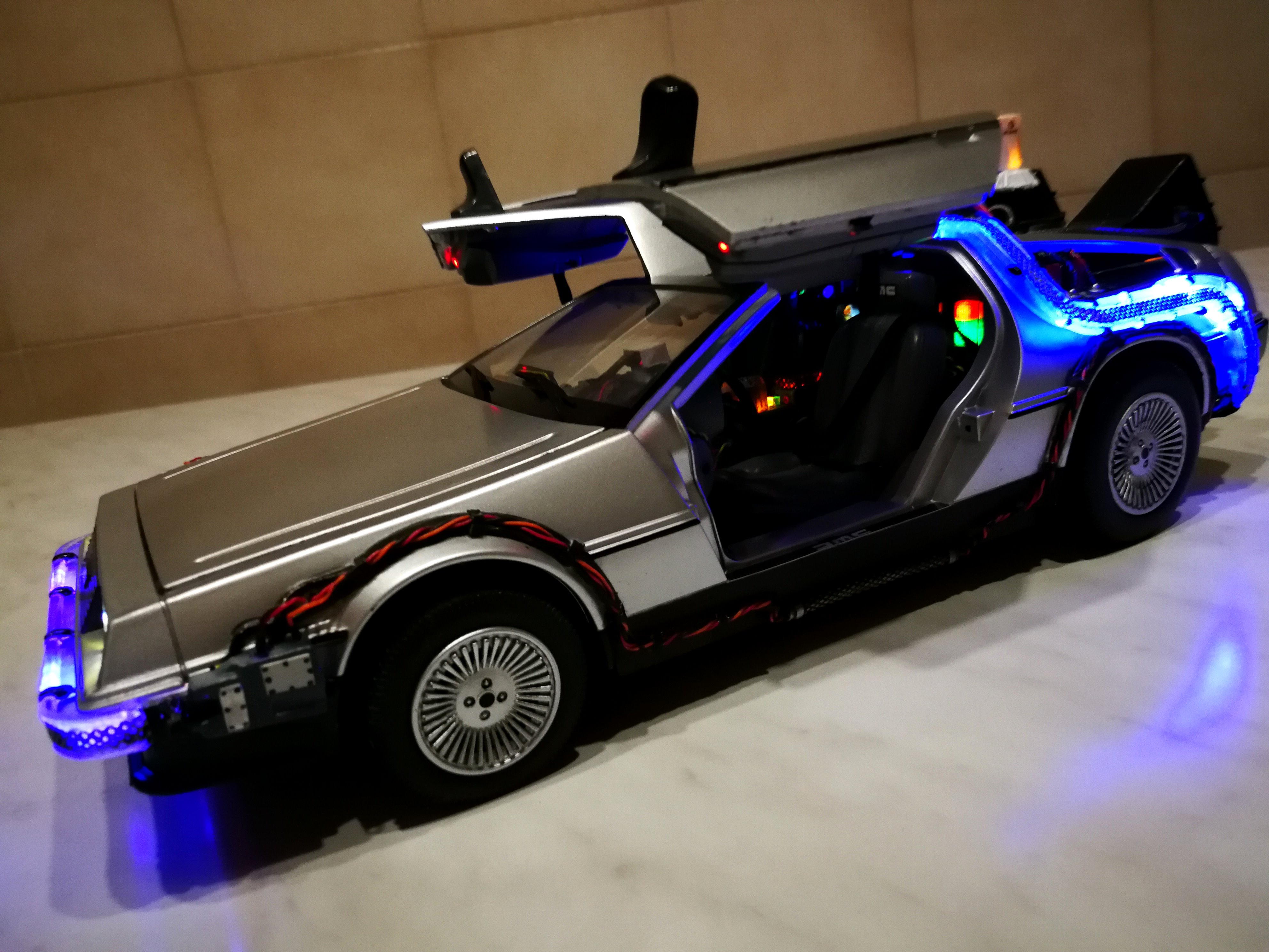 Diamond Select DeLorean model 1:15 modified with new lights and a dedicated stand. In the stand there is a working clock, lights and a memory card with multiple songs taken from the films back to the future. There are also some dialogues from the first film (in Italian). The original functions of the model (lights and sounds and flight / road configuration) are unchanged and the model also works with batteries. The stand and the stand graphics were designed and created by myself.