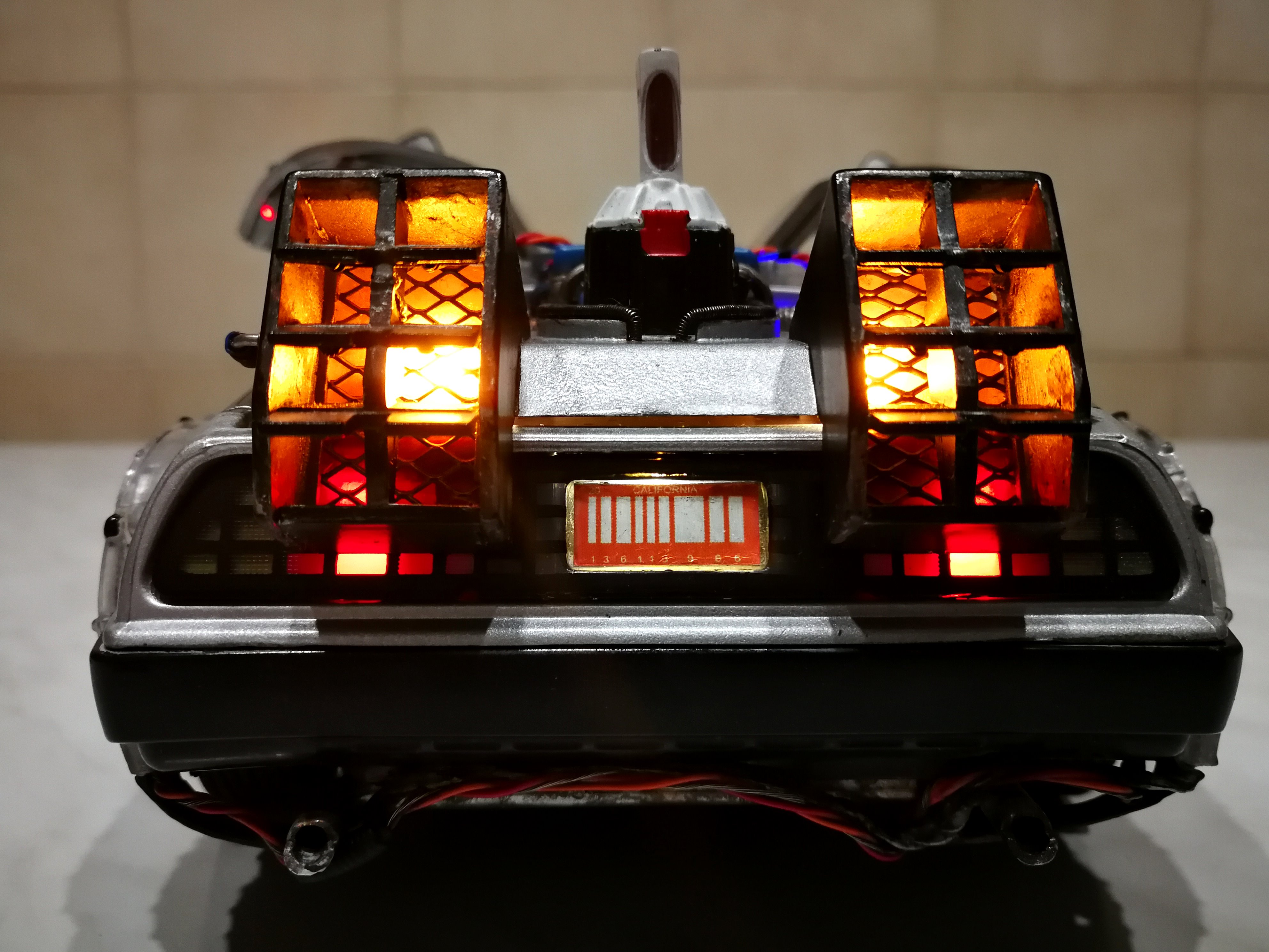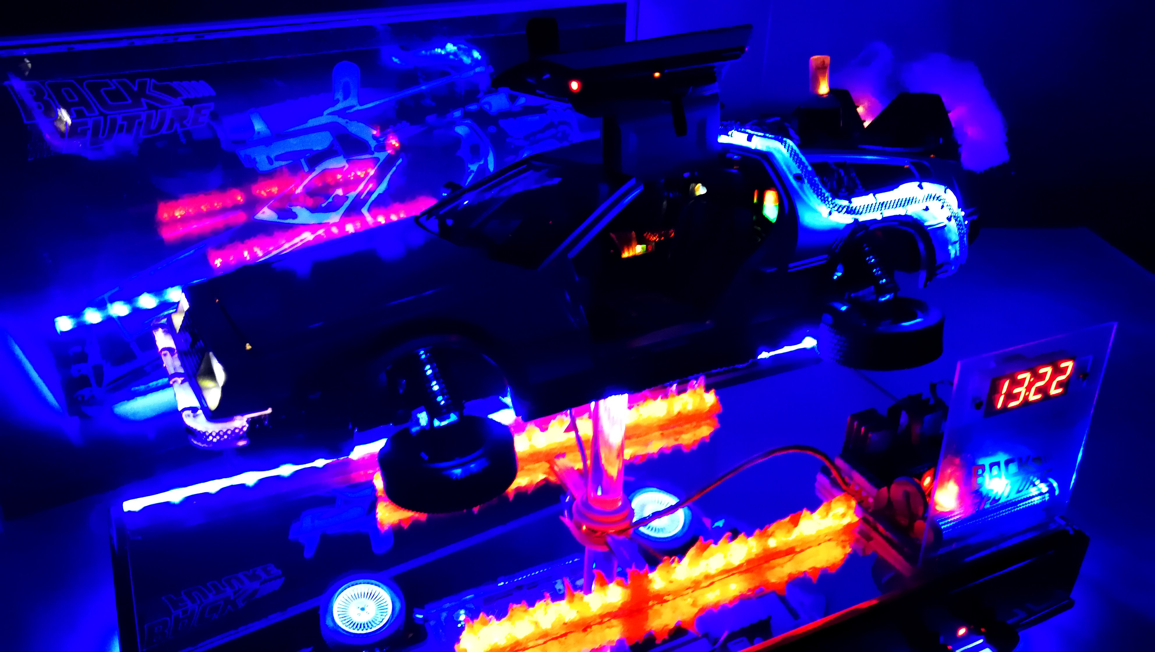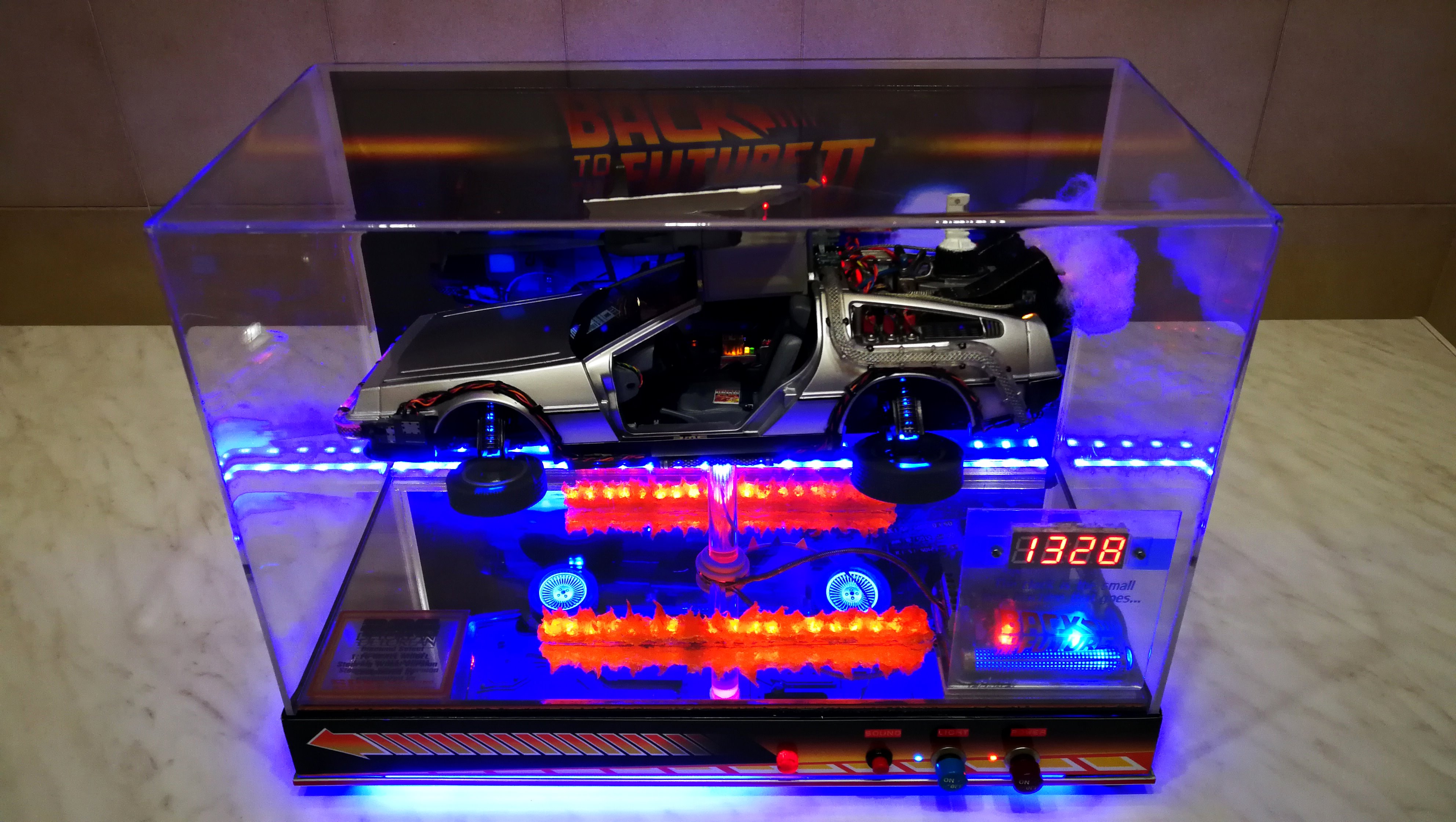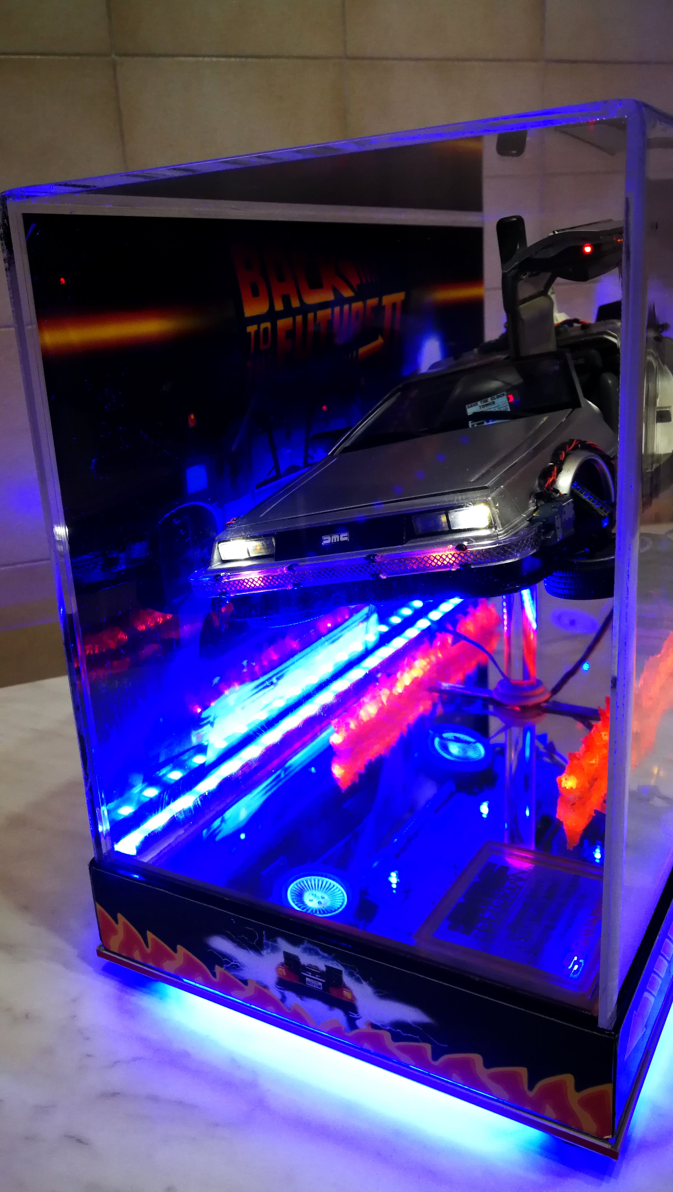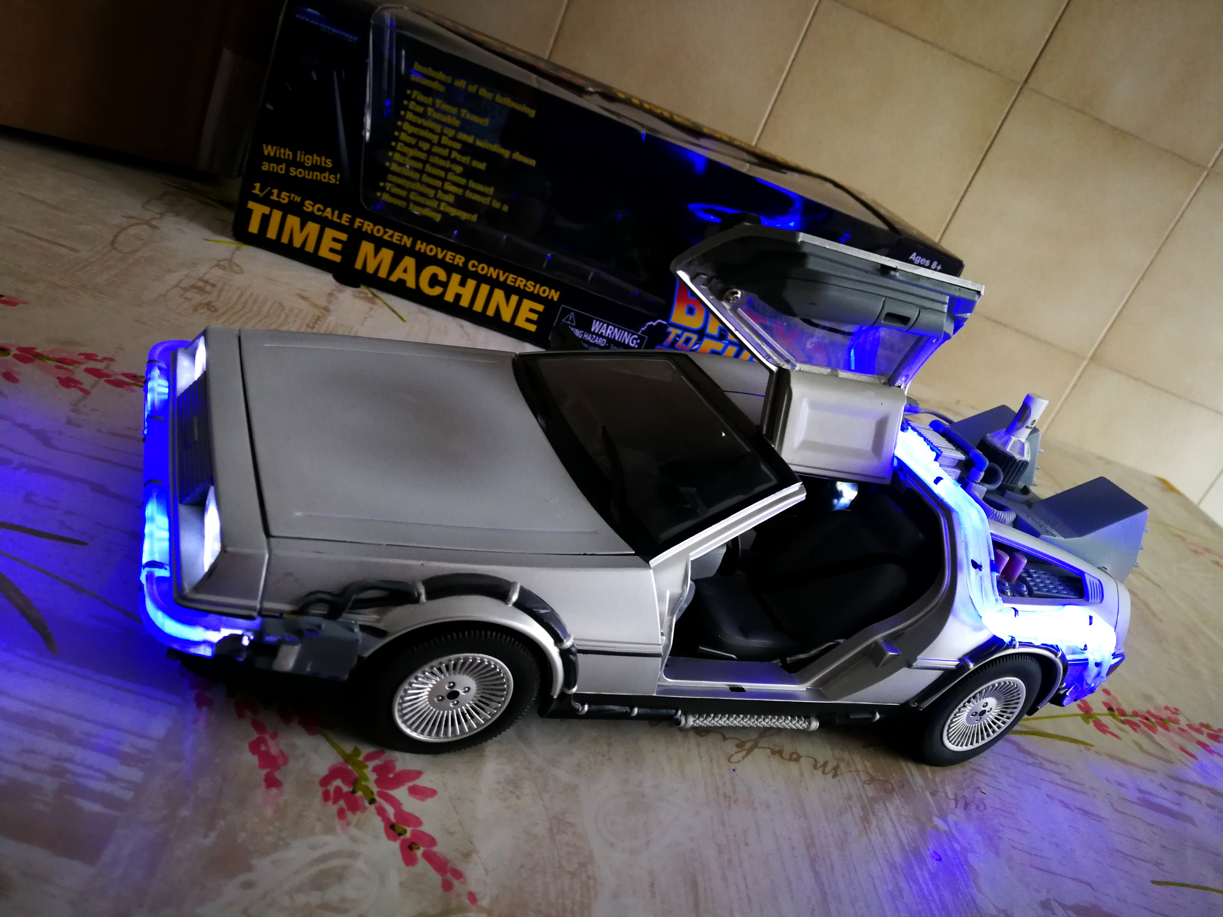 Diamond Select DeLorean model 1:15 modified with new lights and a dedicated stand. In the stand there is a working clock, lights and a memory card with multiple songs taken from the films back to the future. There are also some dialogues from the first film (in Italian). The original functions of the model (lights and sounds and flight / road configuration) are unchanged and the model also works with batteries. The stand and the stand graphics were designed and created by myself.