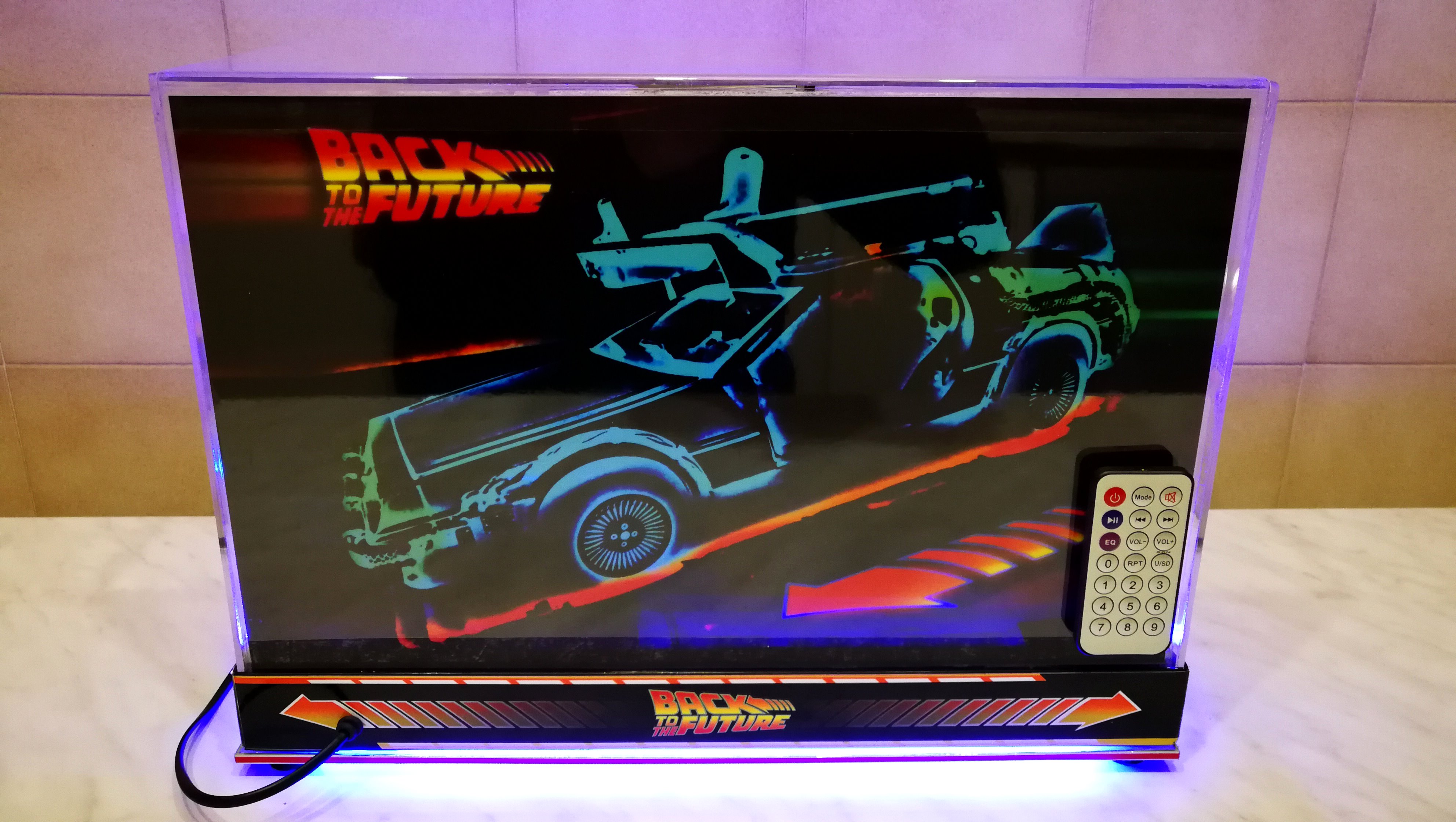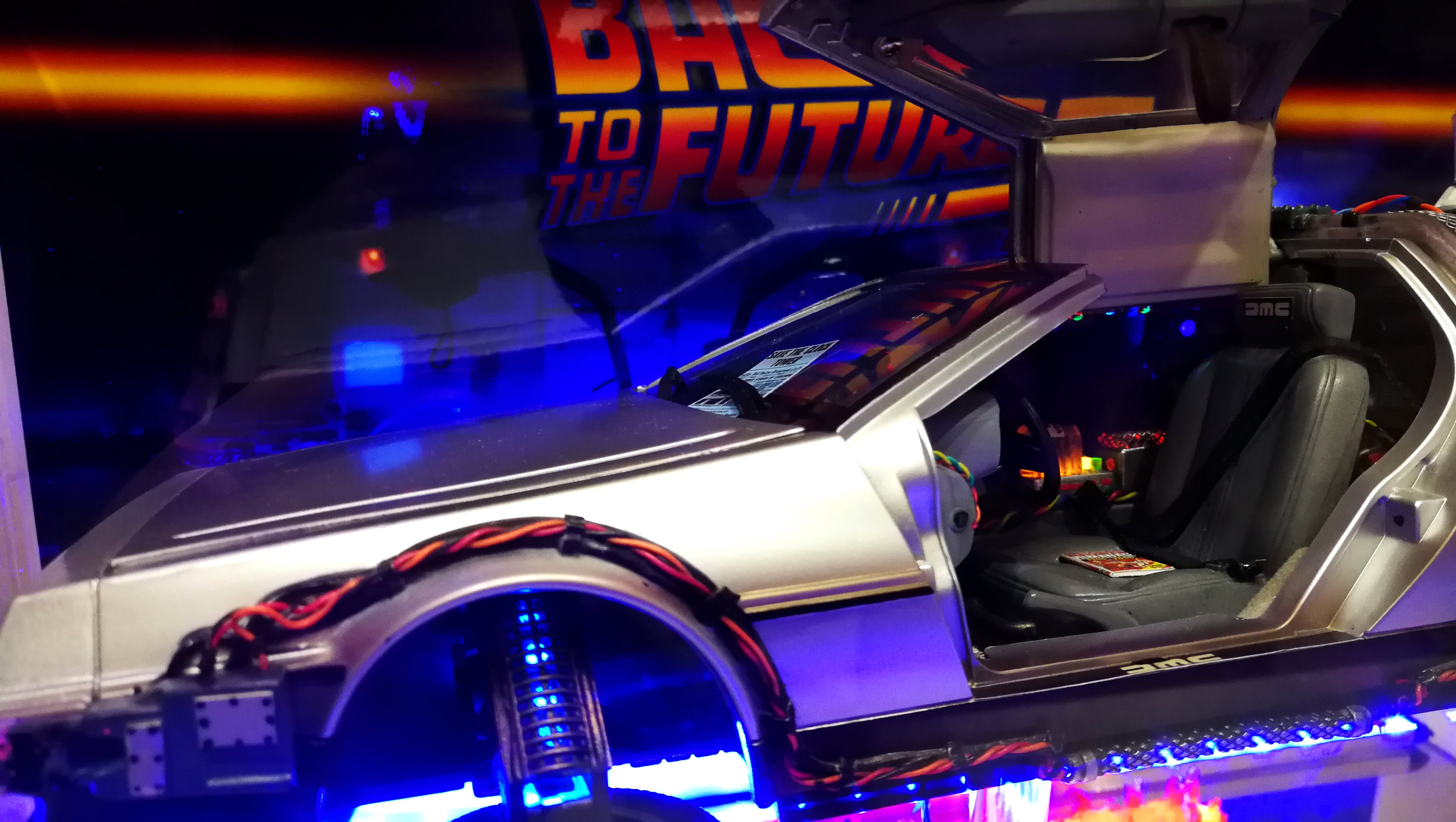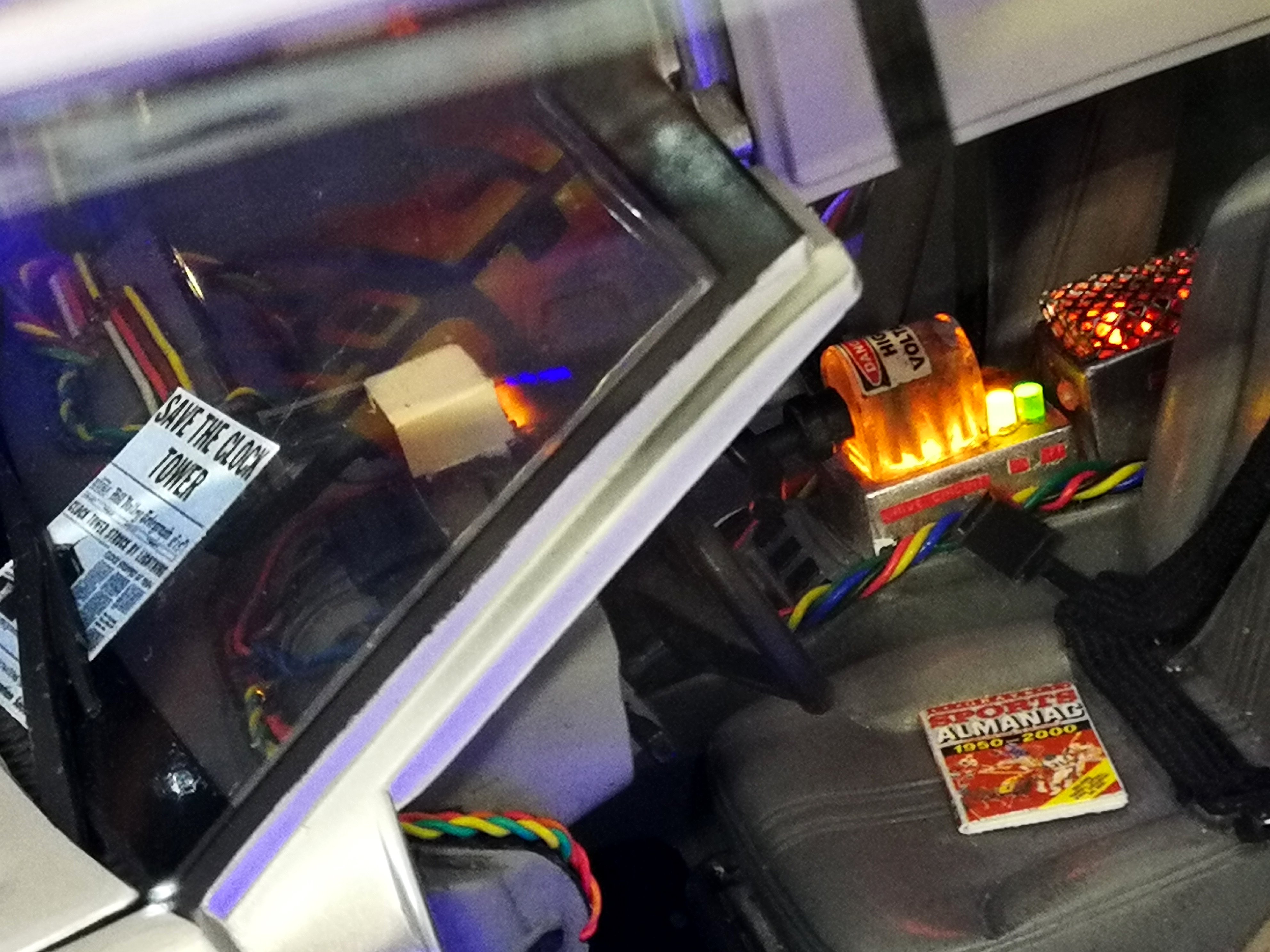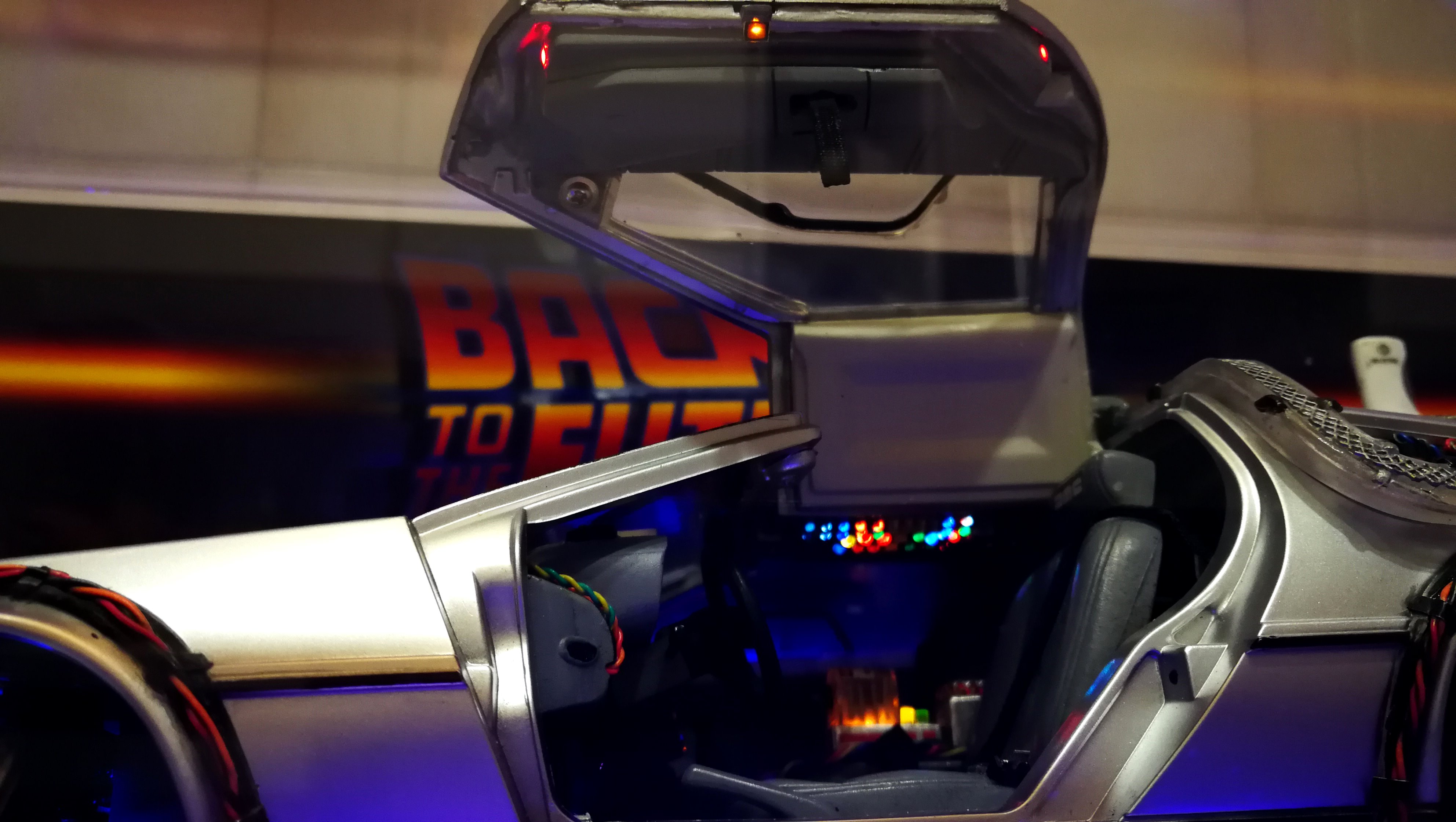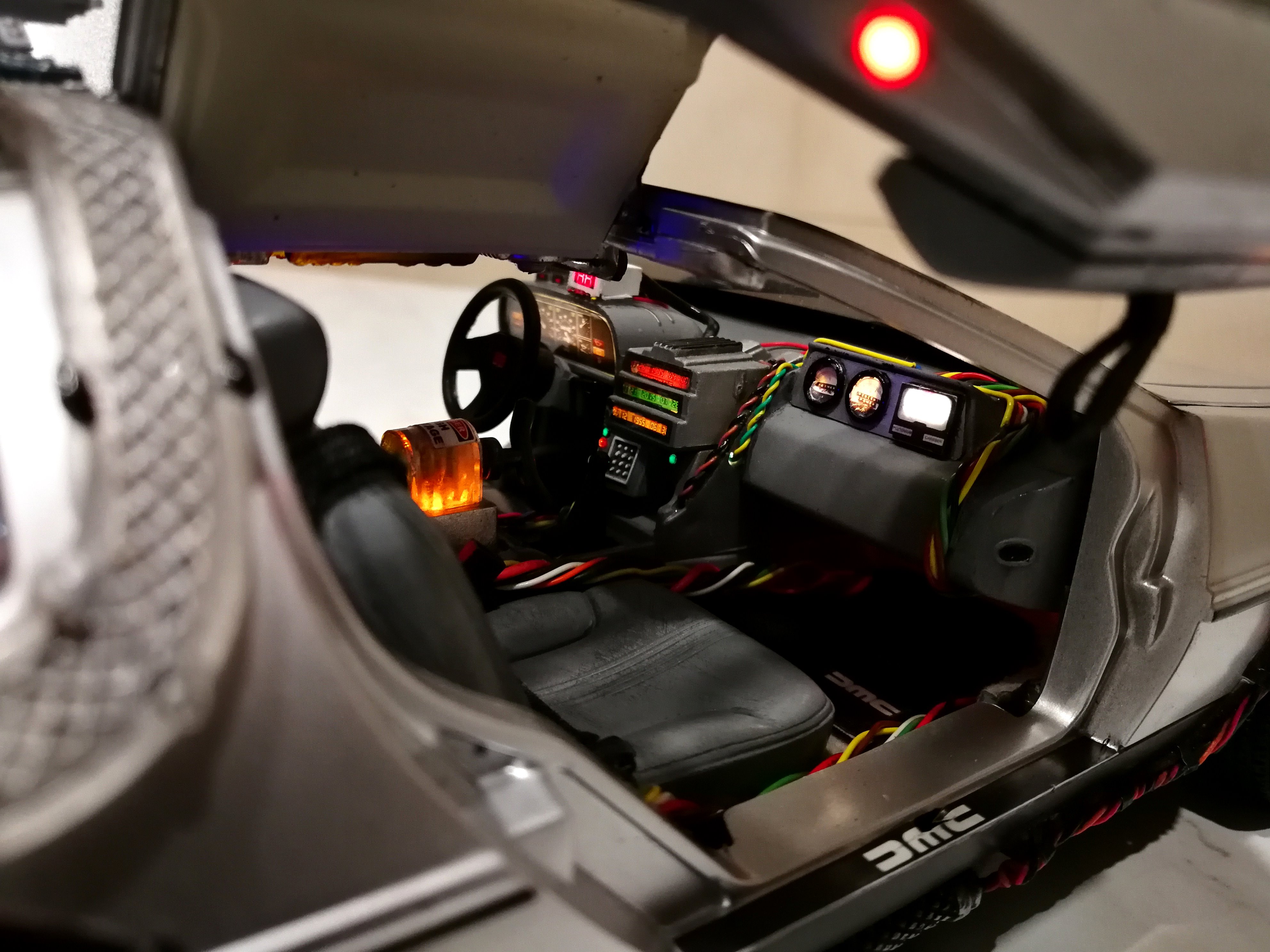 Diamond Select DeLorean model 1:15 modified with new lights and a dedicated stand. In the stand there is a working clock, lights and a memory card with multiple songs taken from the films back to the future. There are also some dialogues from the first film (in Italian). The original functions of the model (lights and sounds and flight / road configuration) are unchanged and the model also works with batteries. The stand and the stand graphics were designed and created by myself.
