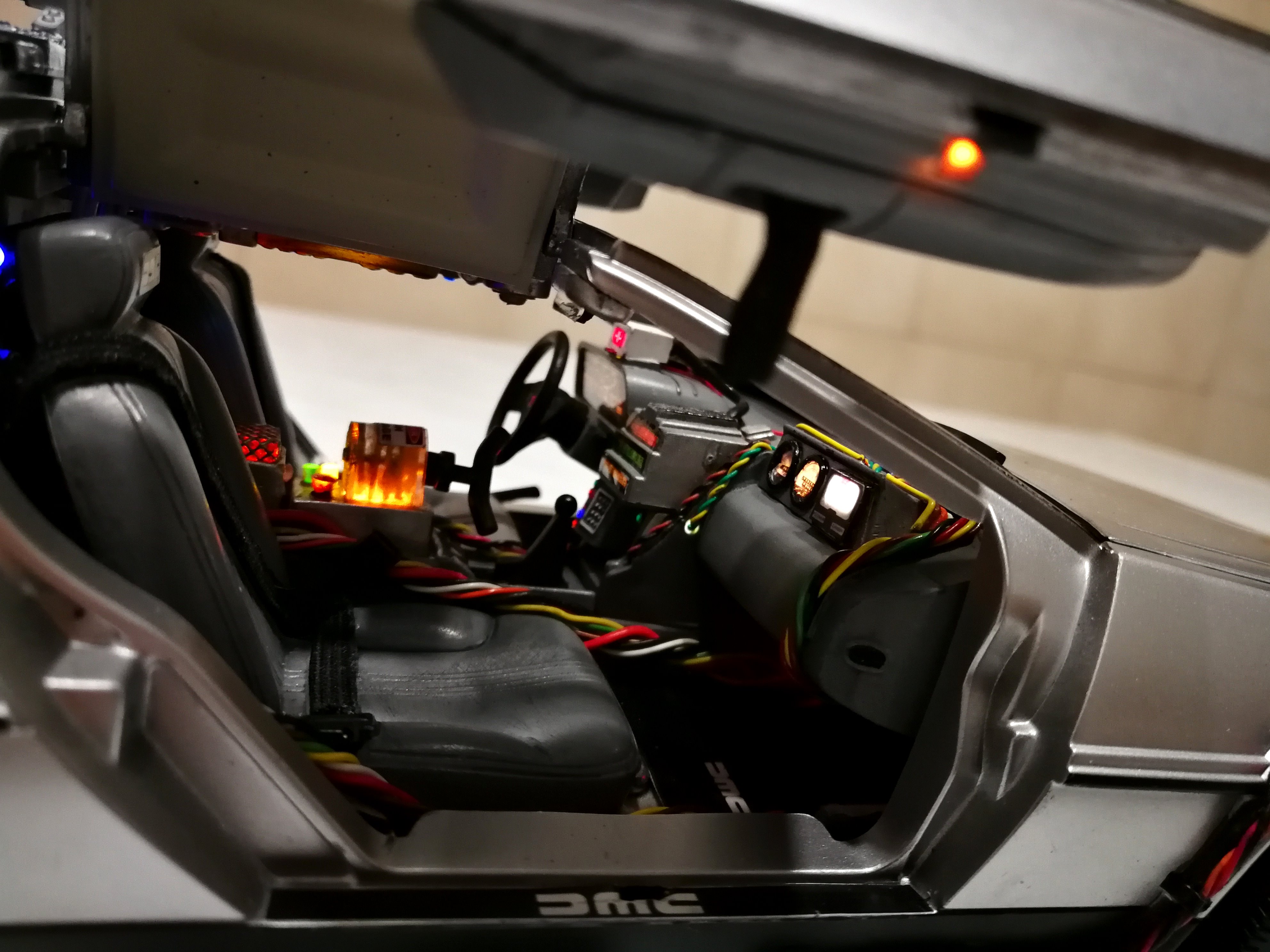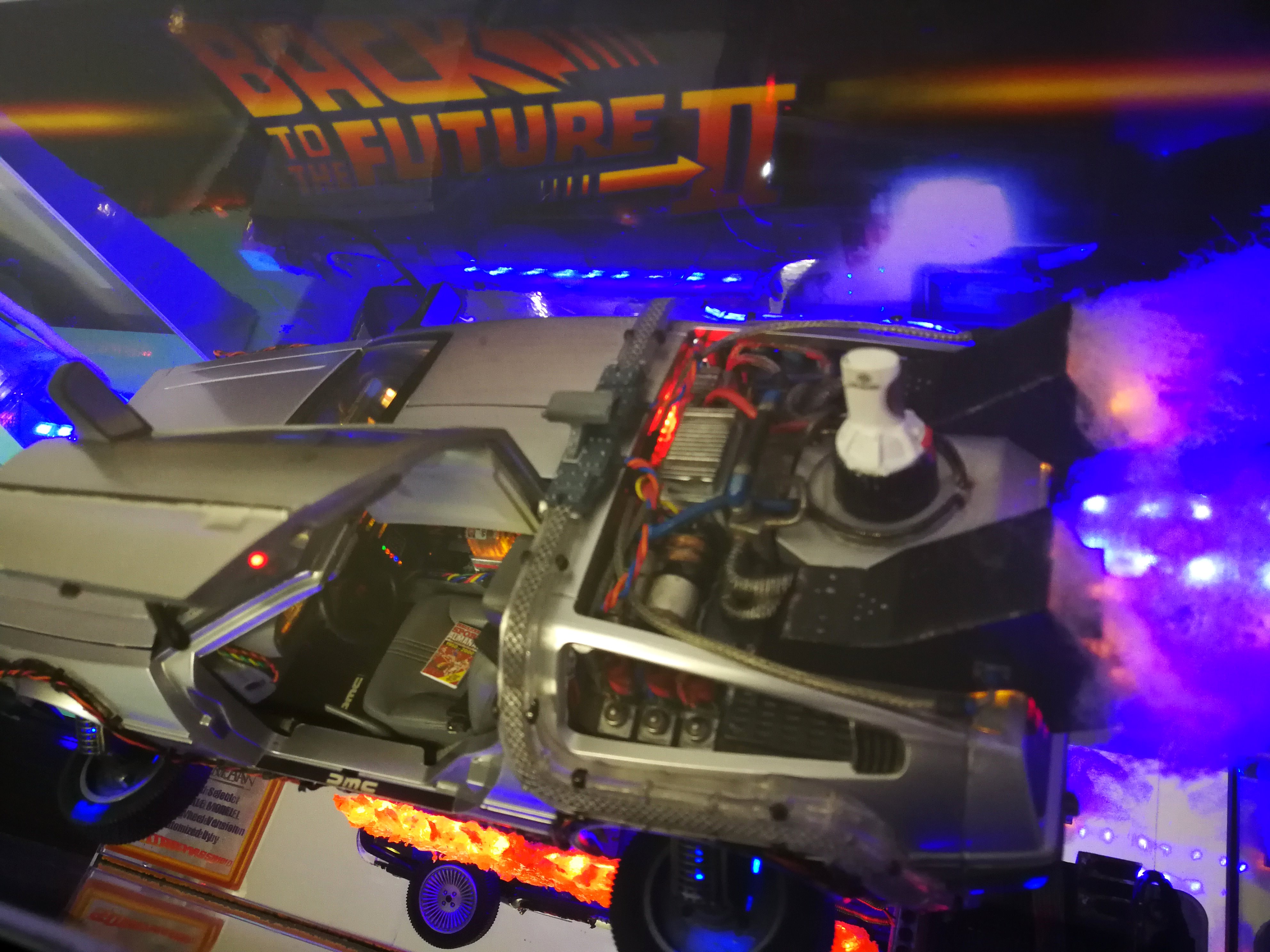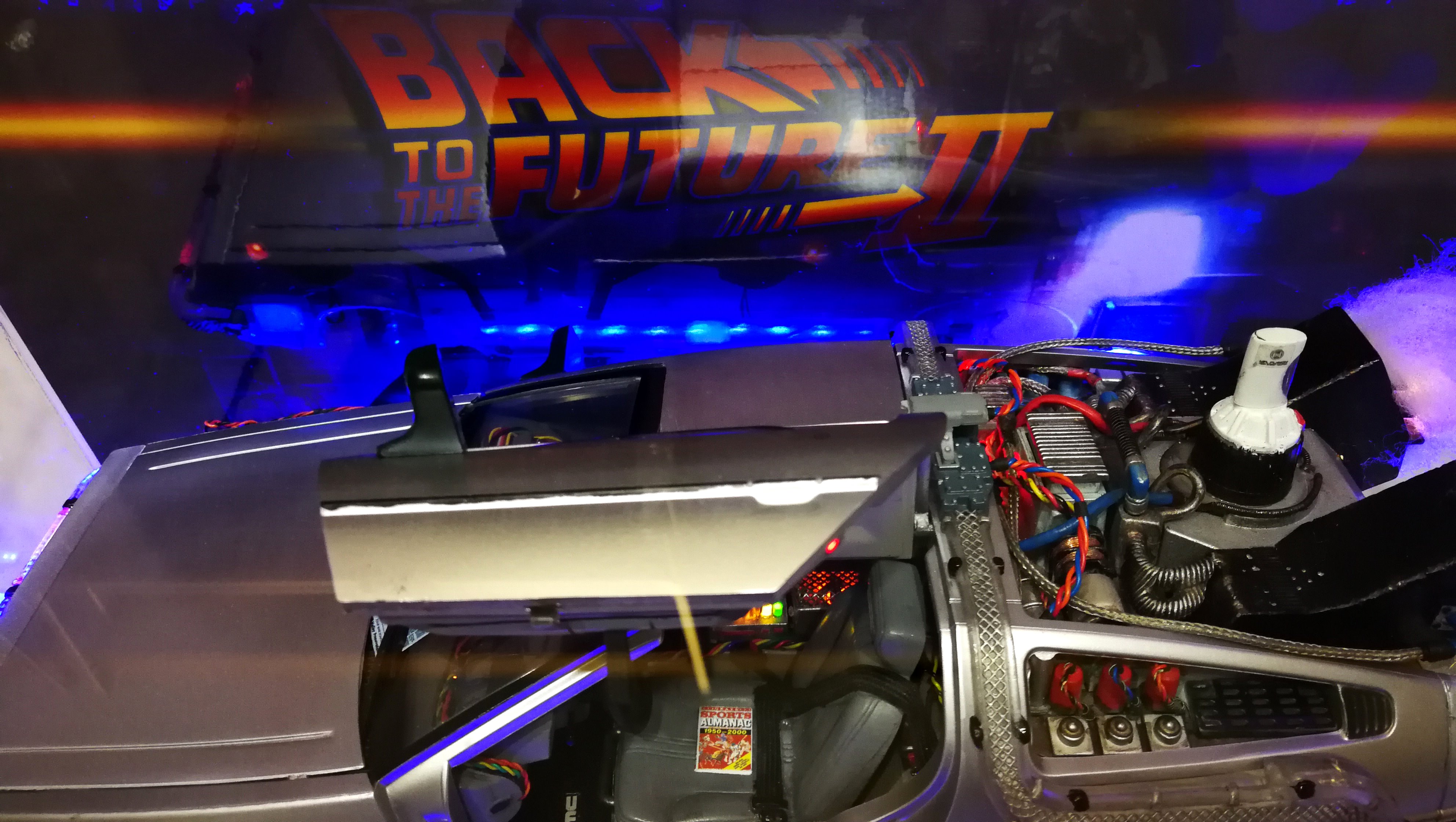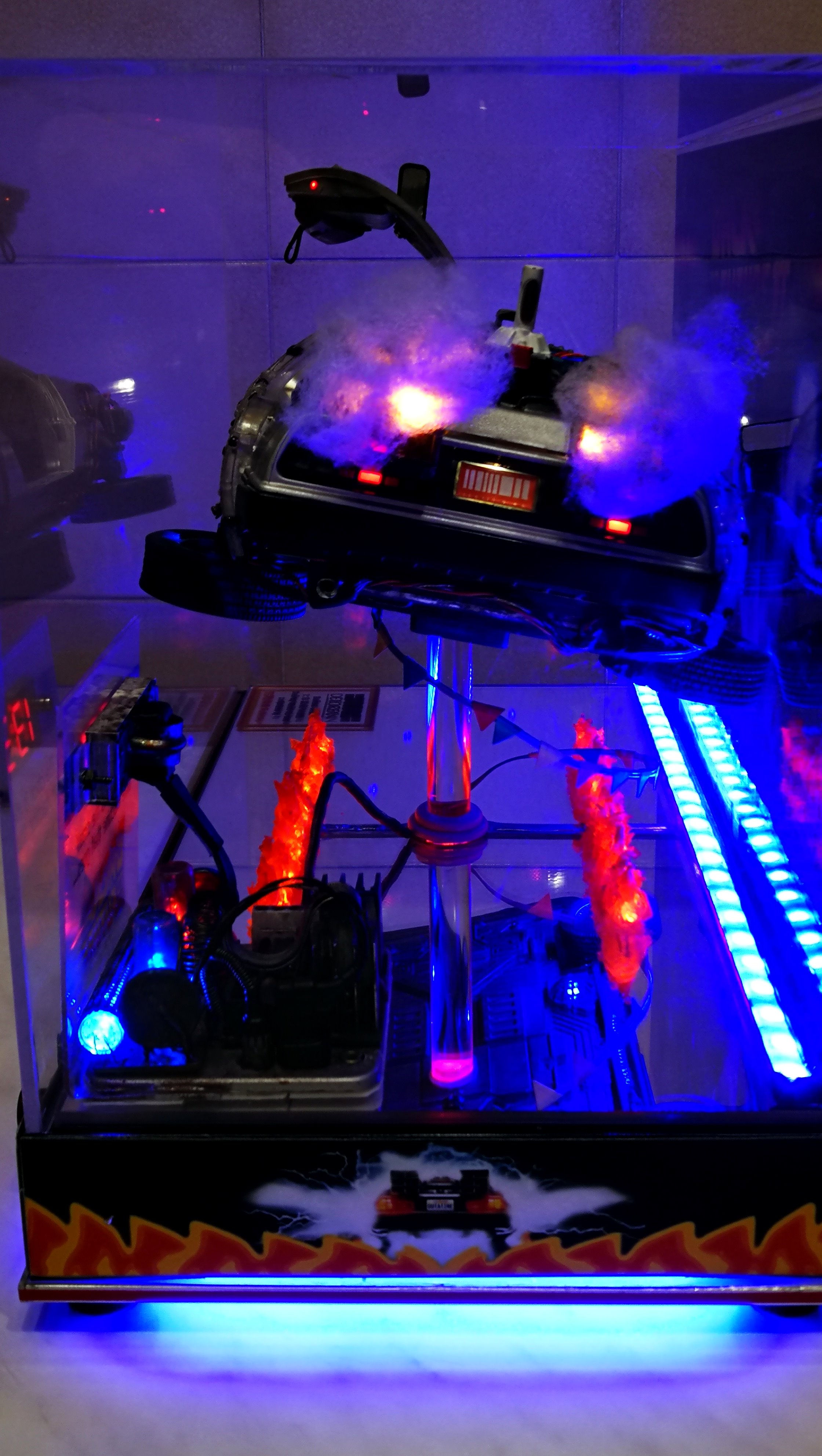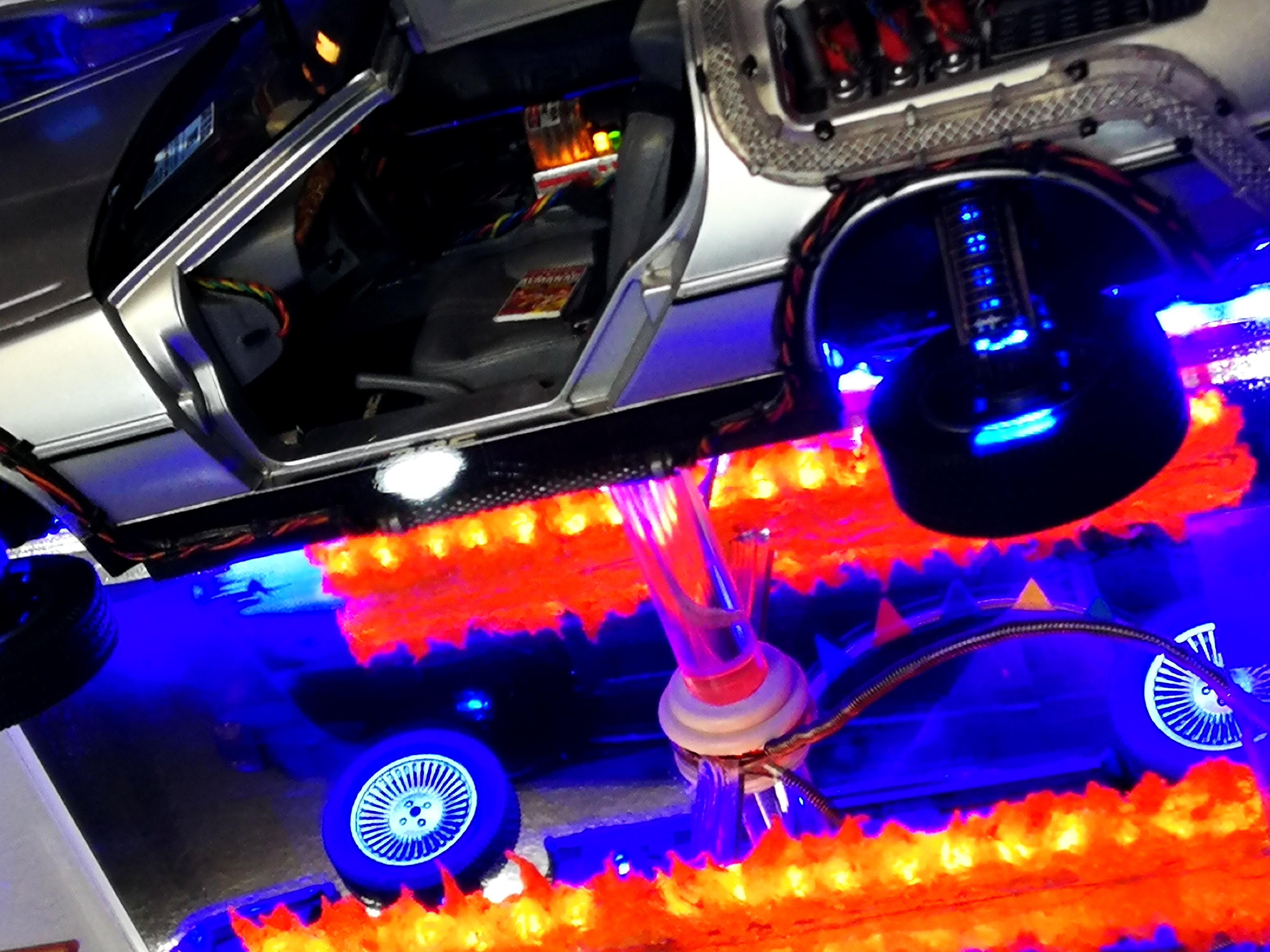 Diamond Select DeLorean model 1:15 modified with new lights and a dedicated stand. In the stand there is a working clock, lights and a memory card with multiple songs taken from the films back to the future. There are also some dialogues from the first film (in Italian). The original functions of the model (lights and sounds and flight / road configuration) are unchanged and the model also works with batteries. The stand and the stand graphics were designed and created by myself.