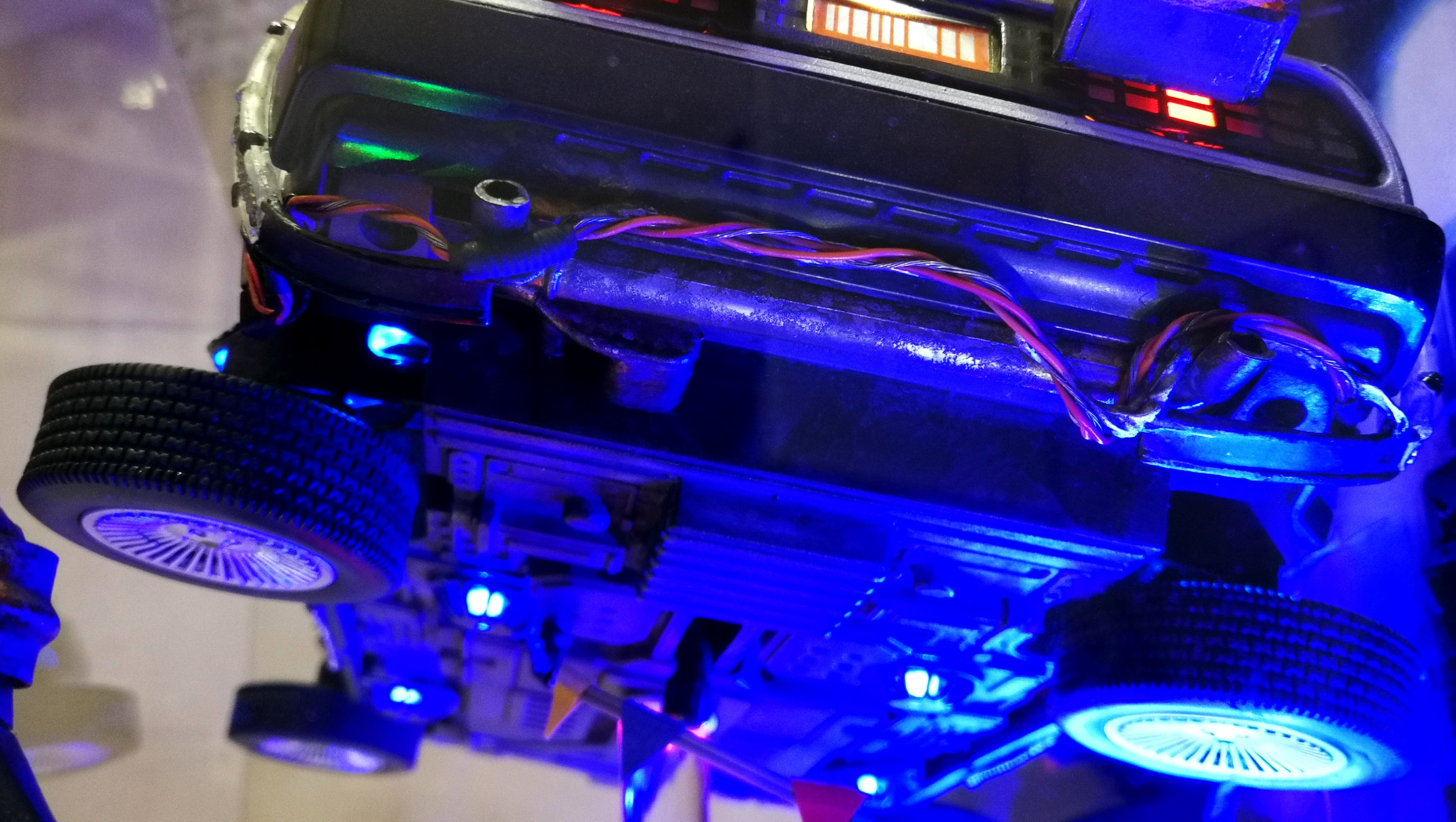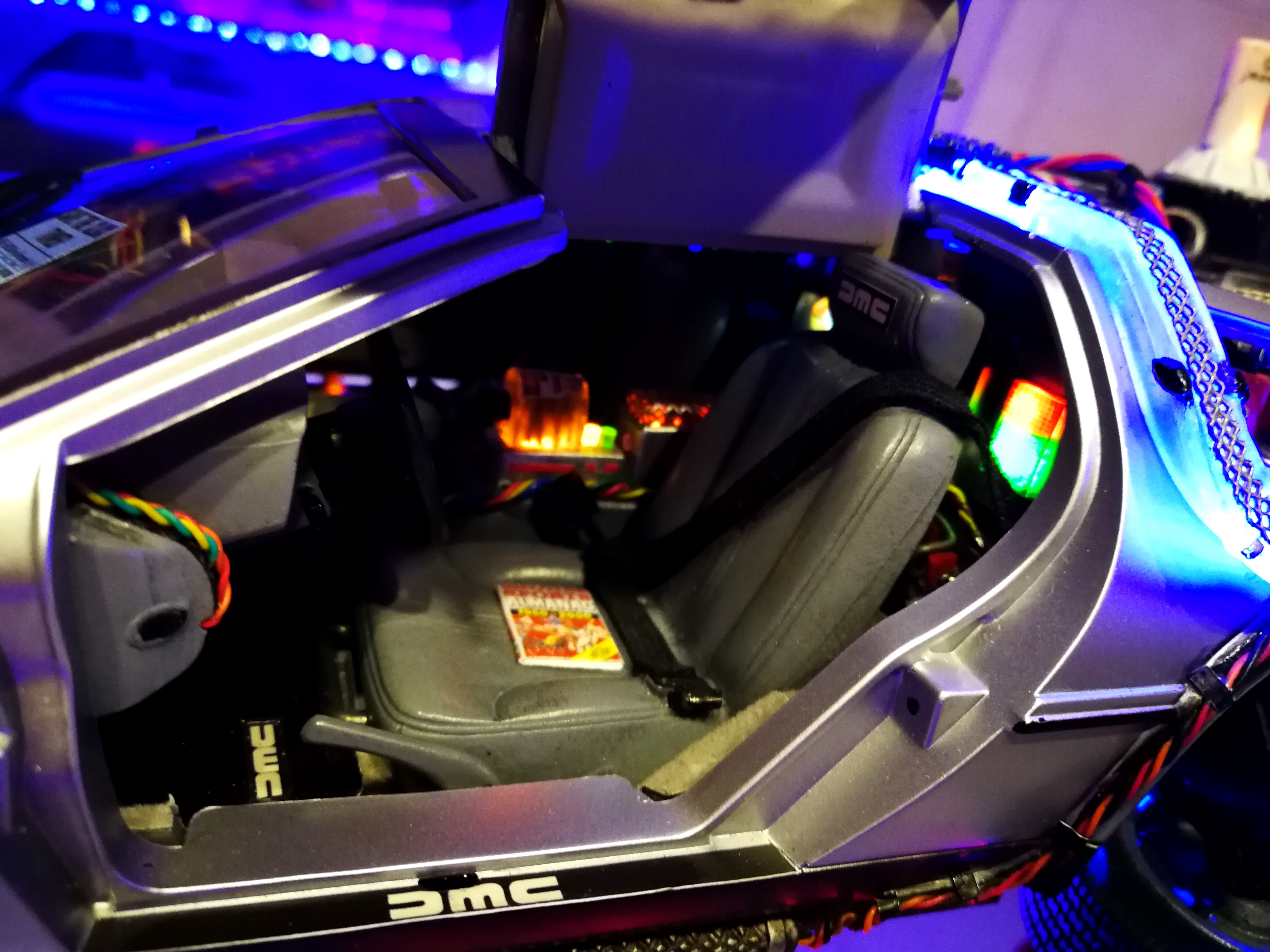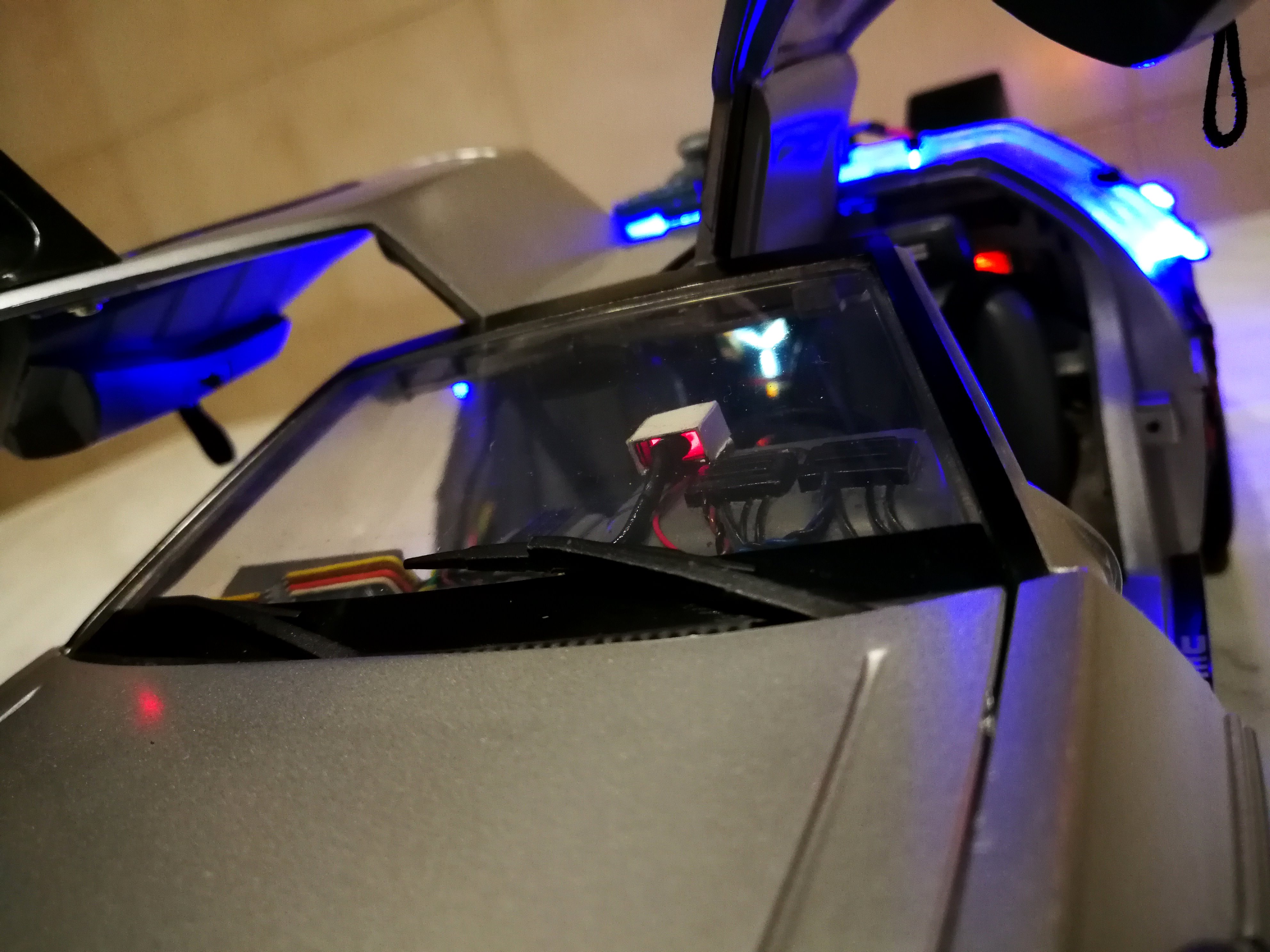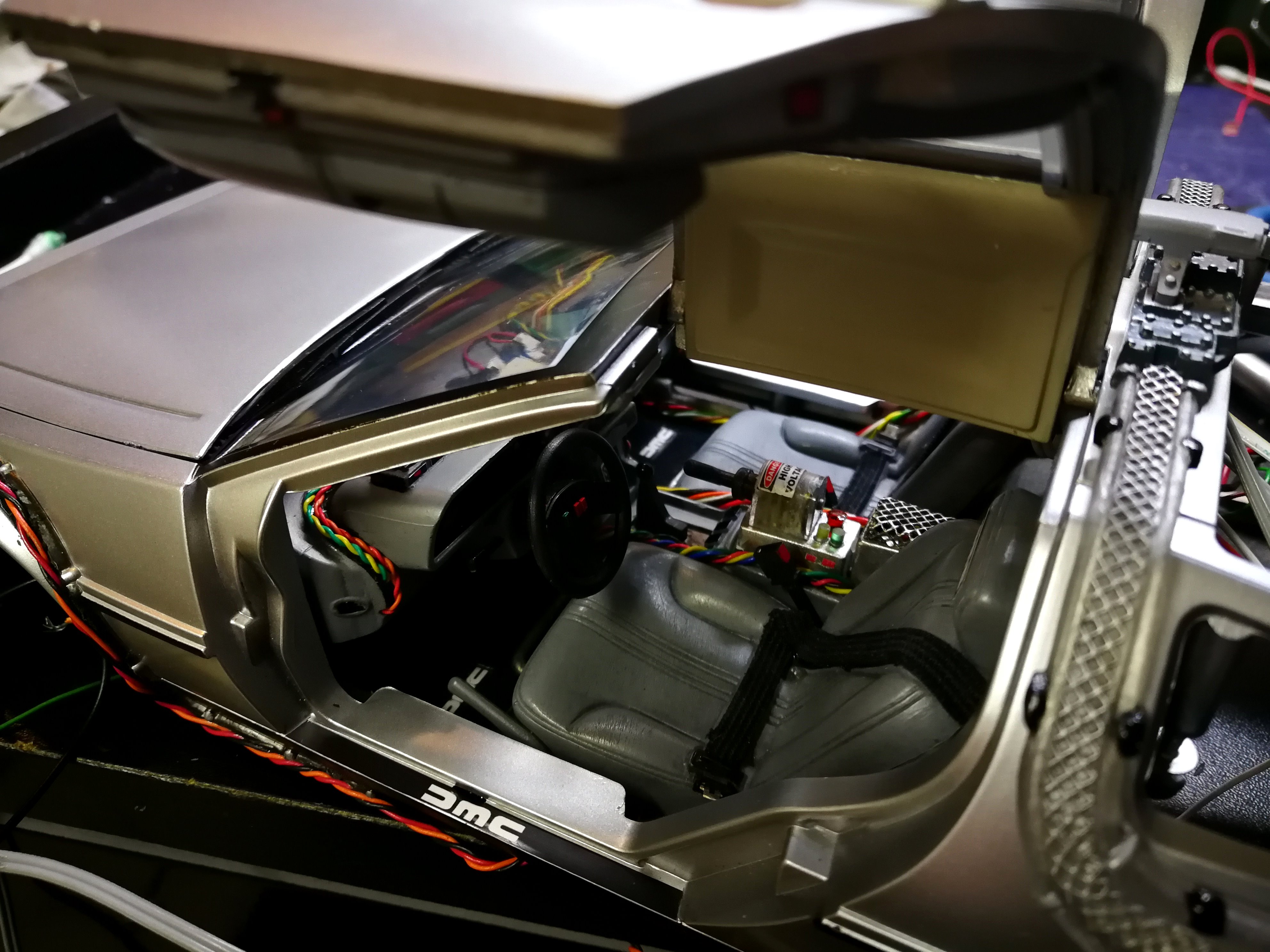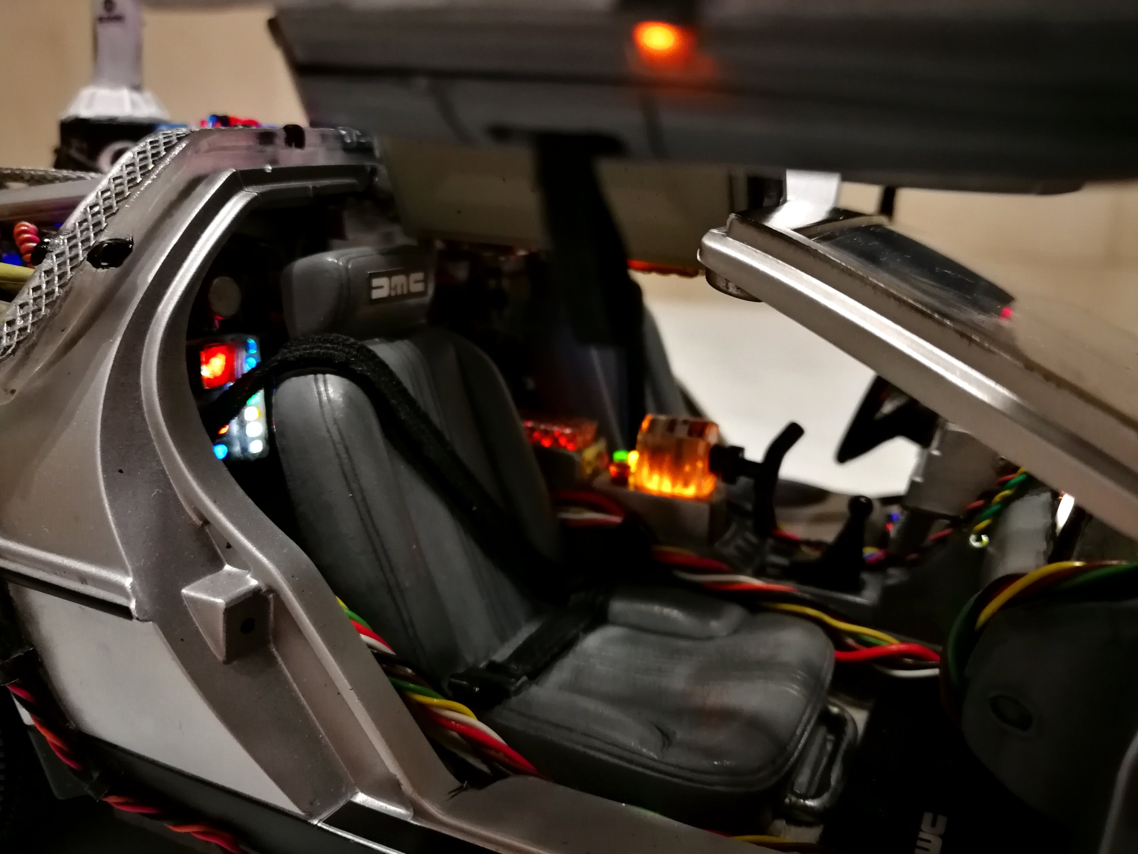 Diamond Select DeLorean model 1:15 modified with new lights and a dedicated stand. In the stand there is a working clock, lights and a memory card with multiple songs taken from the films back to the future. There are also some dialogues from the first film (in Italian). The original functions of the model (lights and sounds and flight / road configuration) are unchanged and the model also works with batteries. The stand and the stand graphics were designed and created by myself.