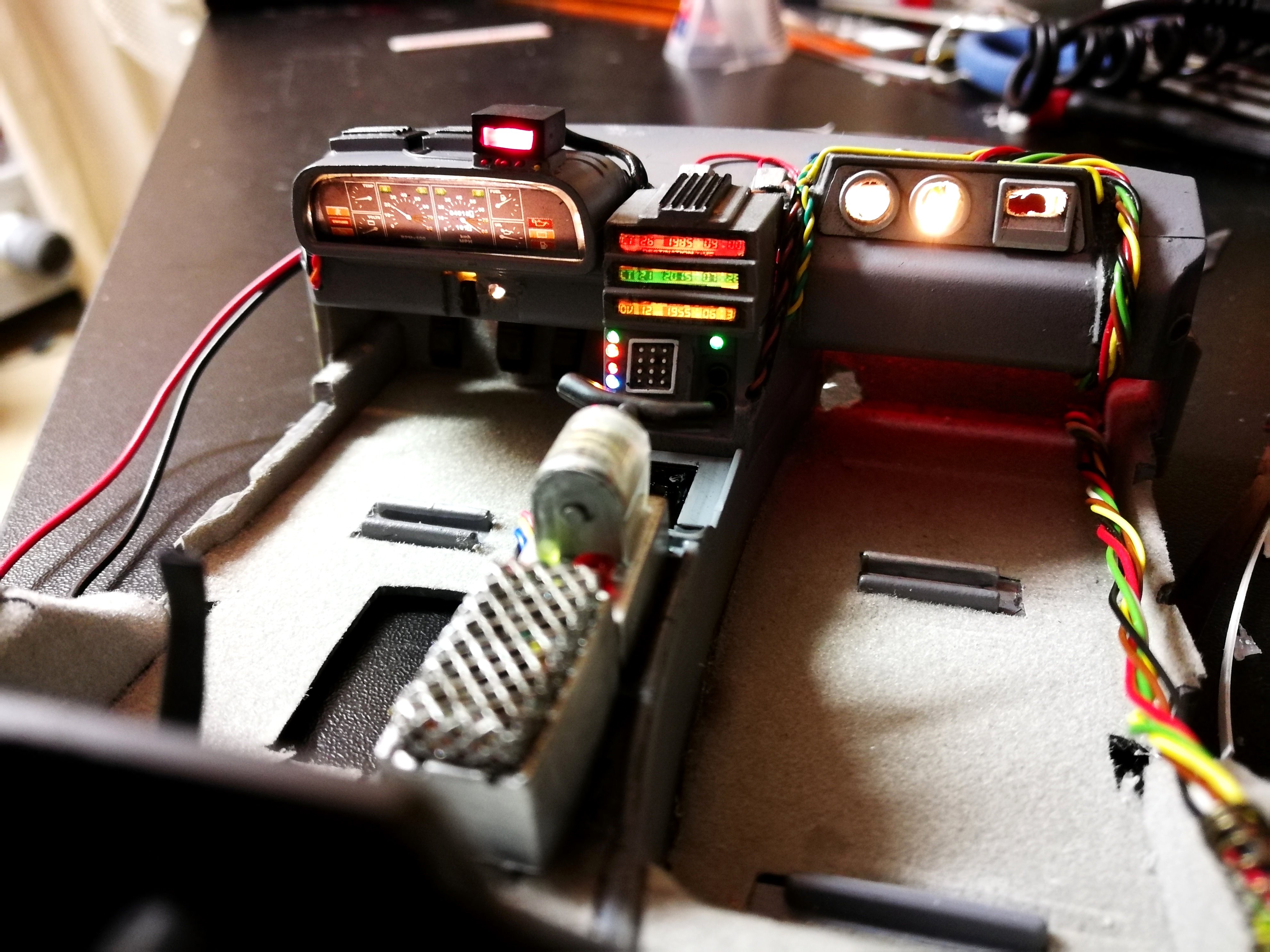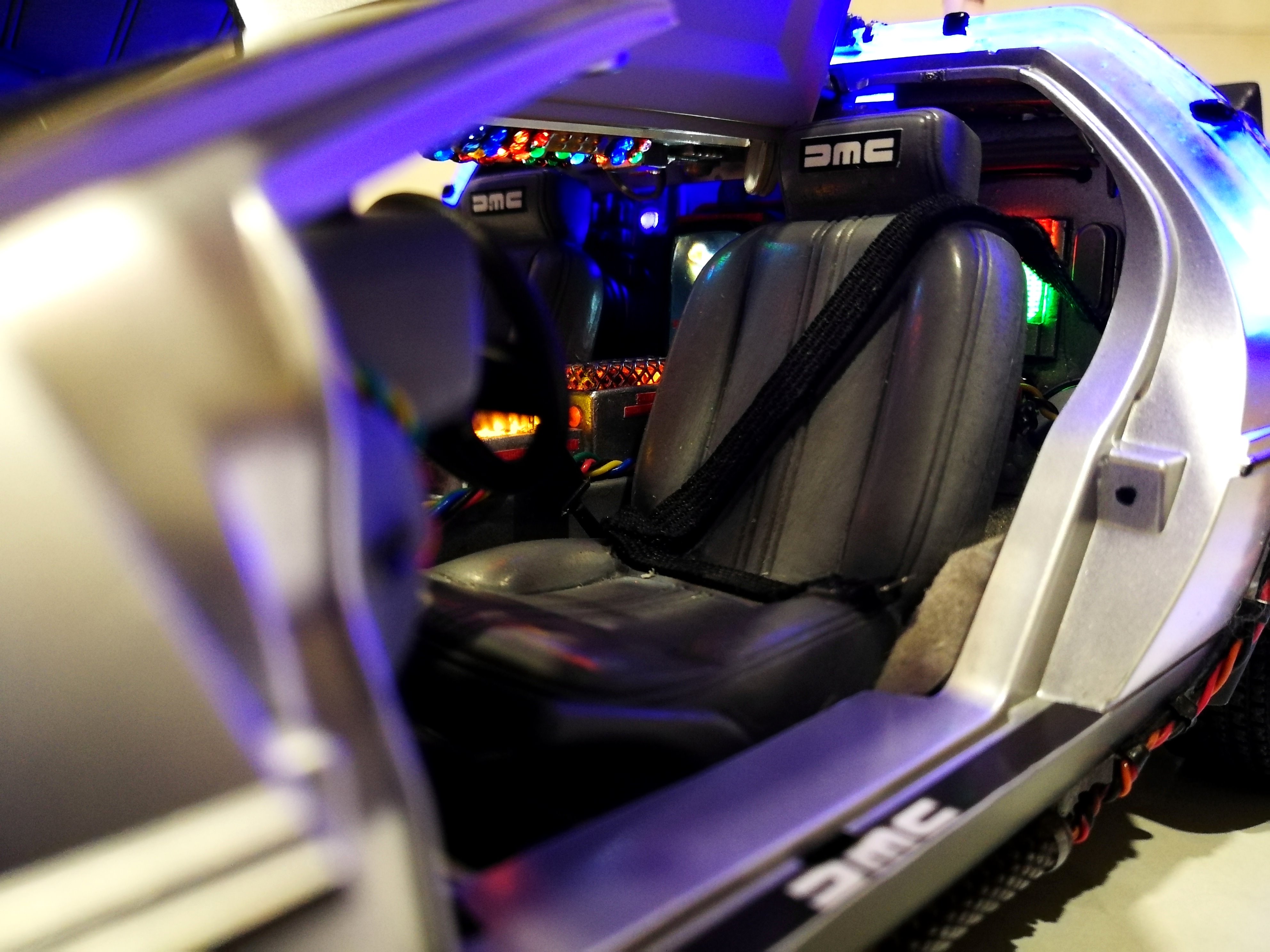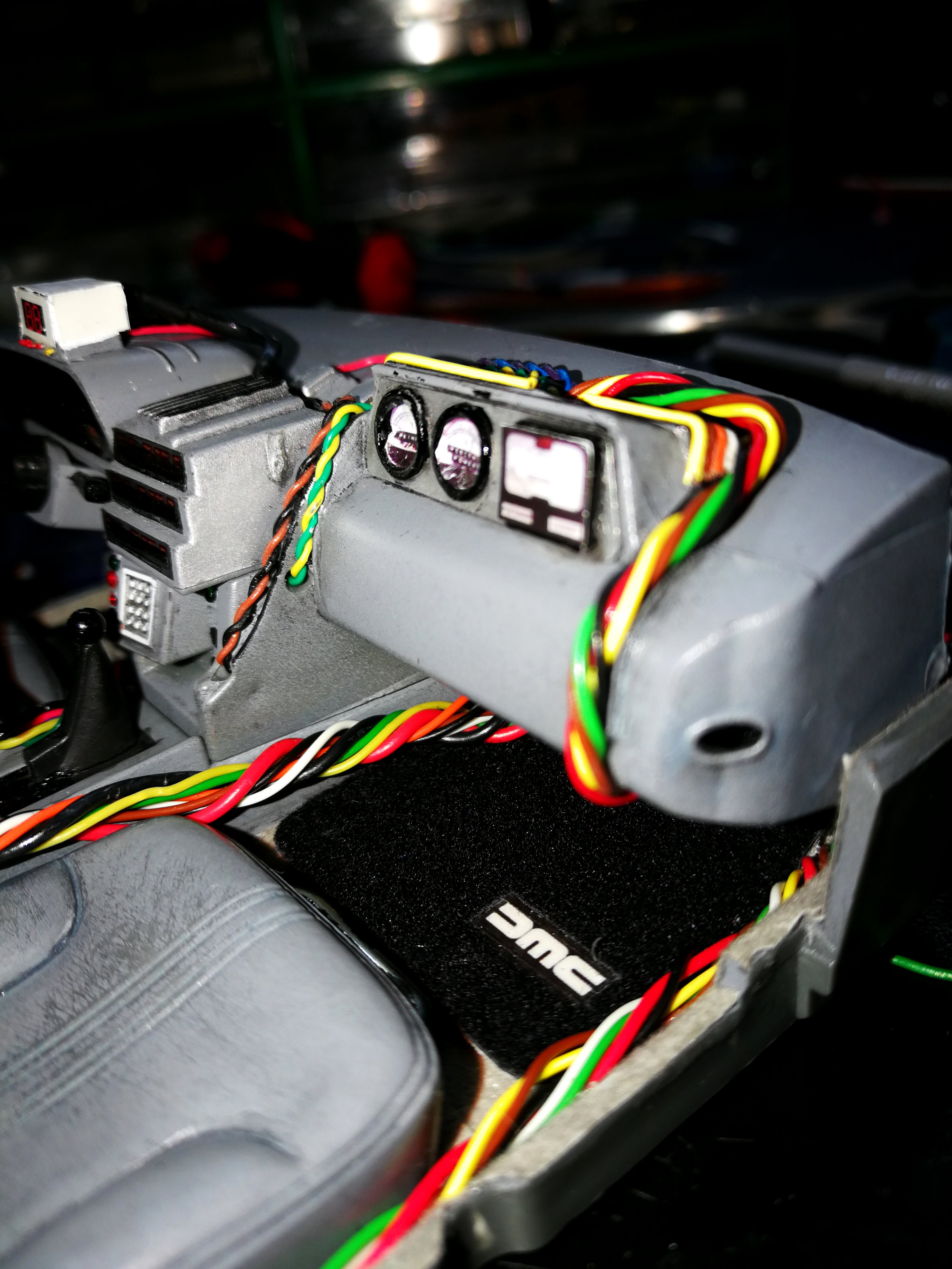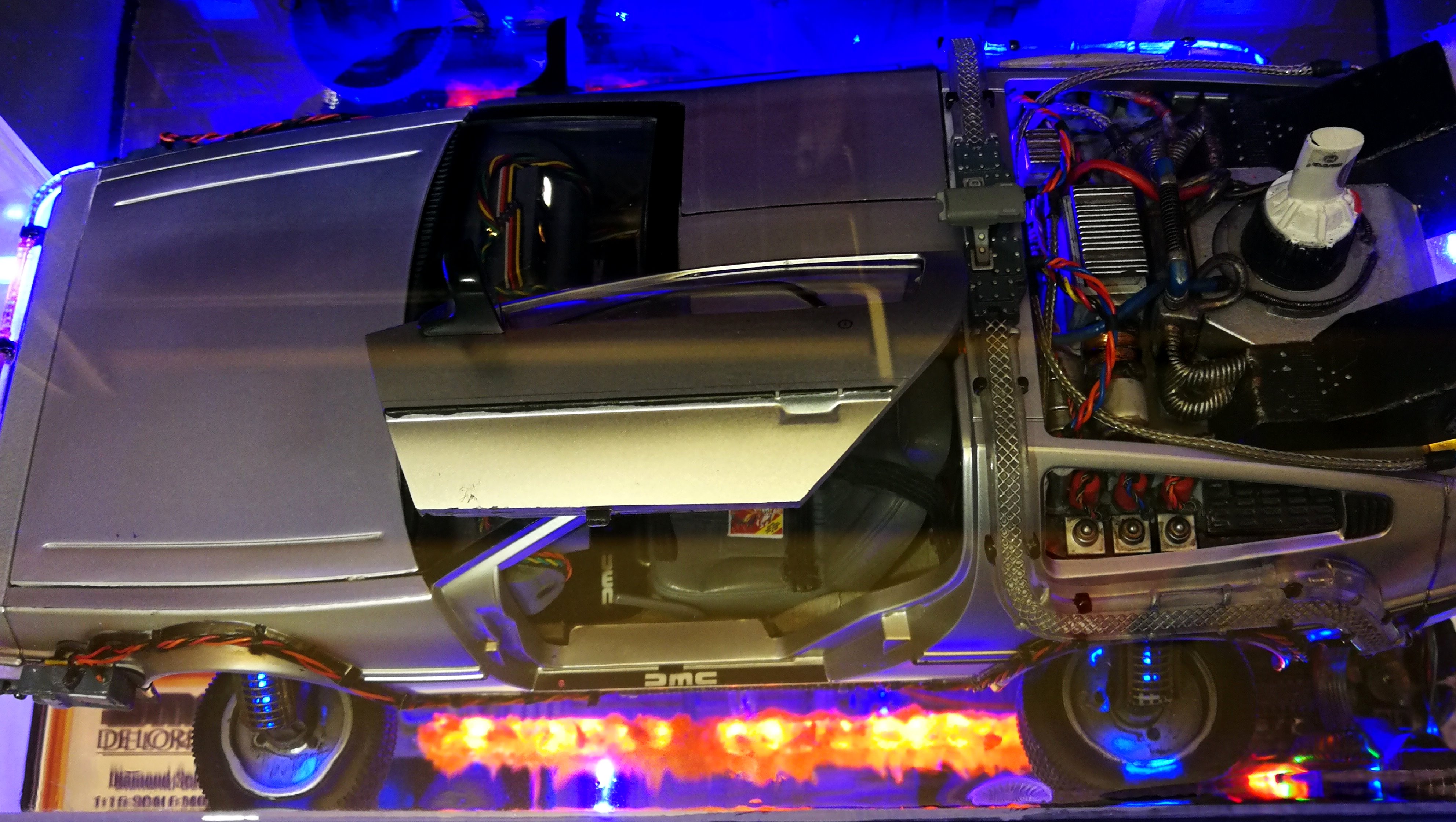 Diamond Select DeLorean model 1:15 modified with new lights and a dedicated stand. In the stand there is a working clock, lights and a memory card with multiple songs taken from the films back to the future. There are also some dialogues from the first film (in Italian). The original functions of the model (lights and sounds and flight / road configuration) are unchanged and the model also works with batteries. The stand and the stand graphics were designed and created by myself.