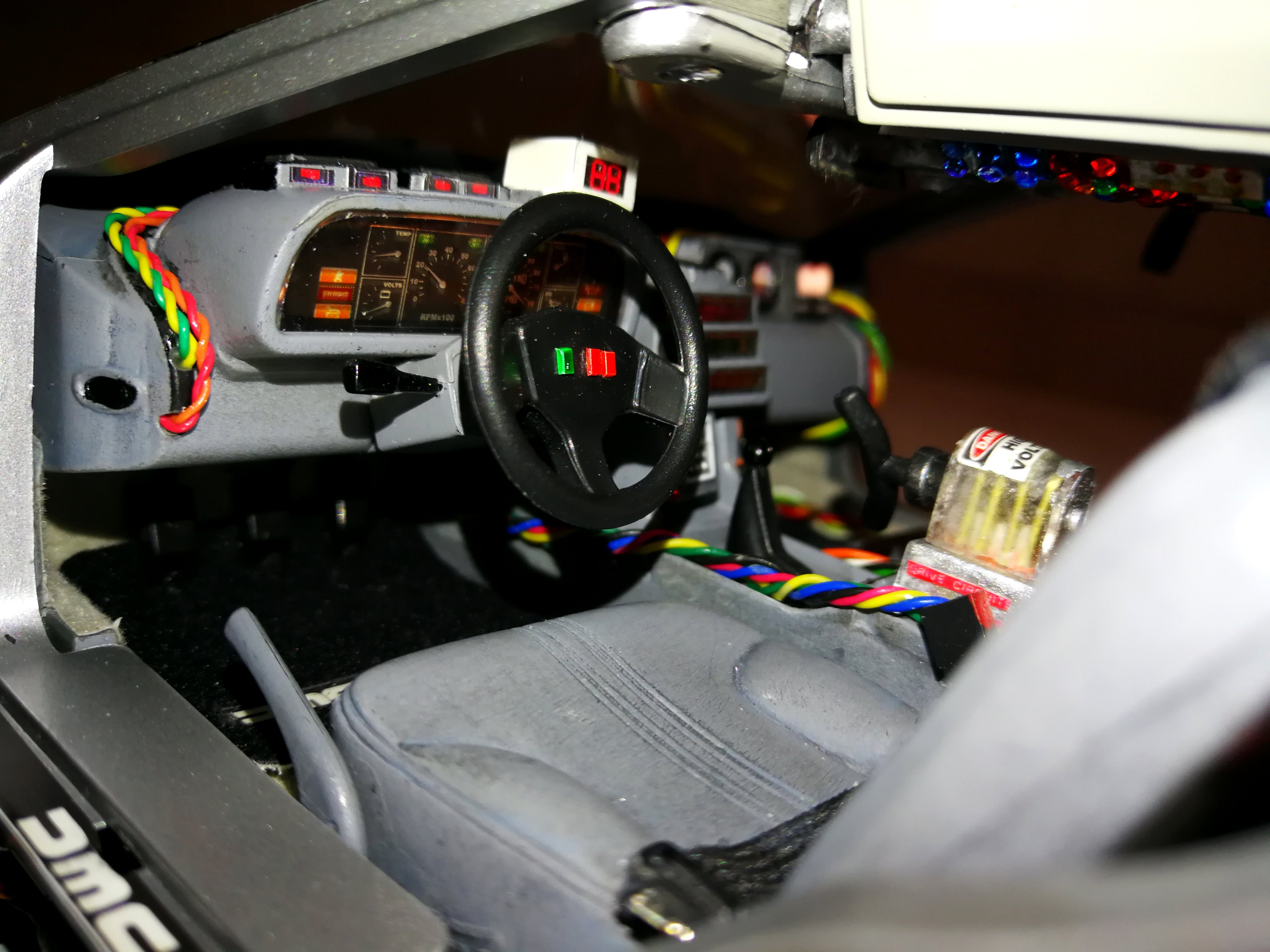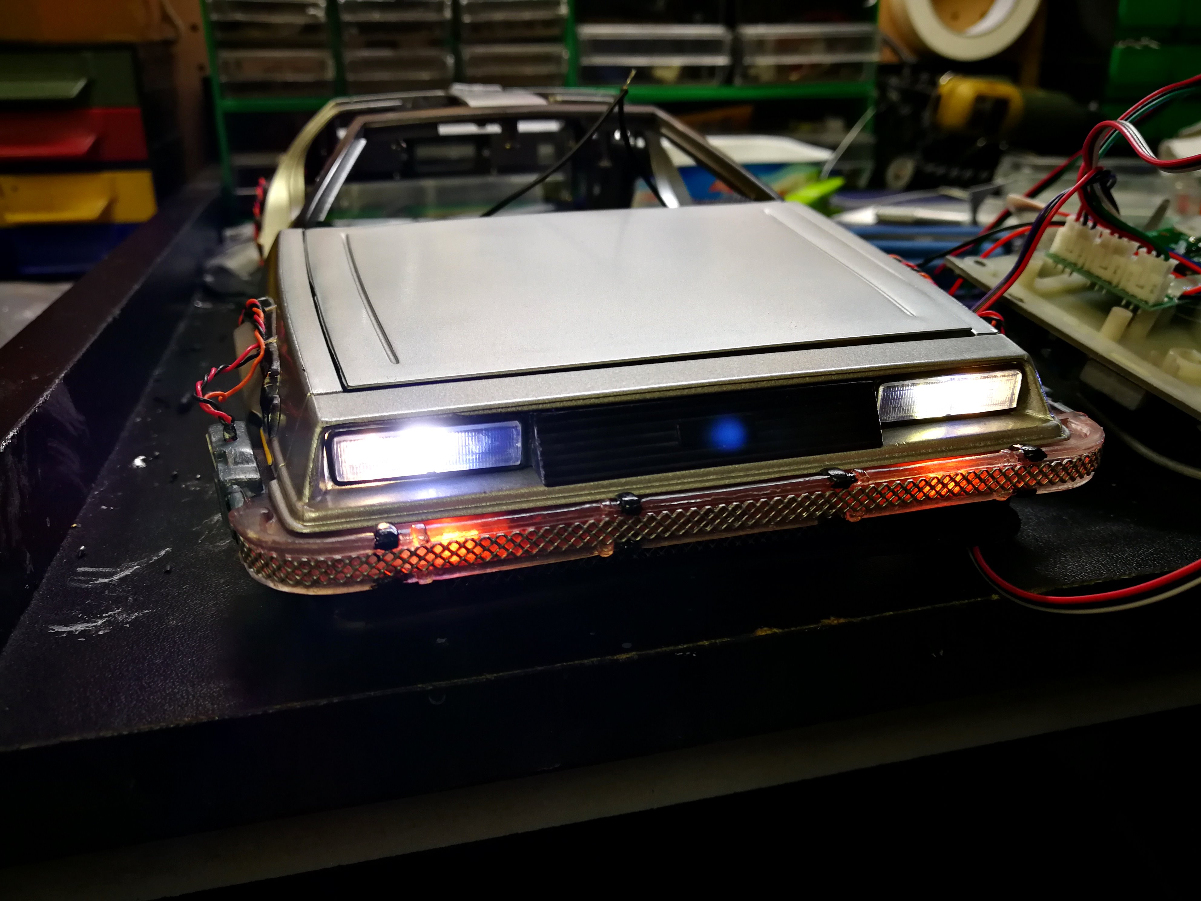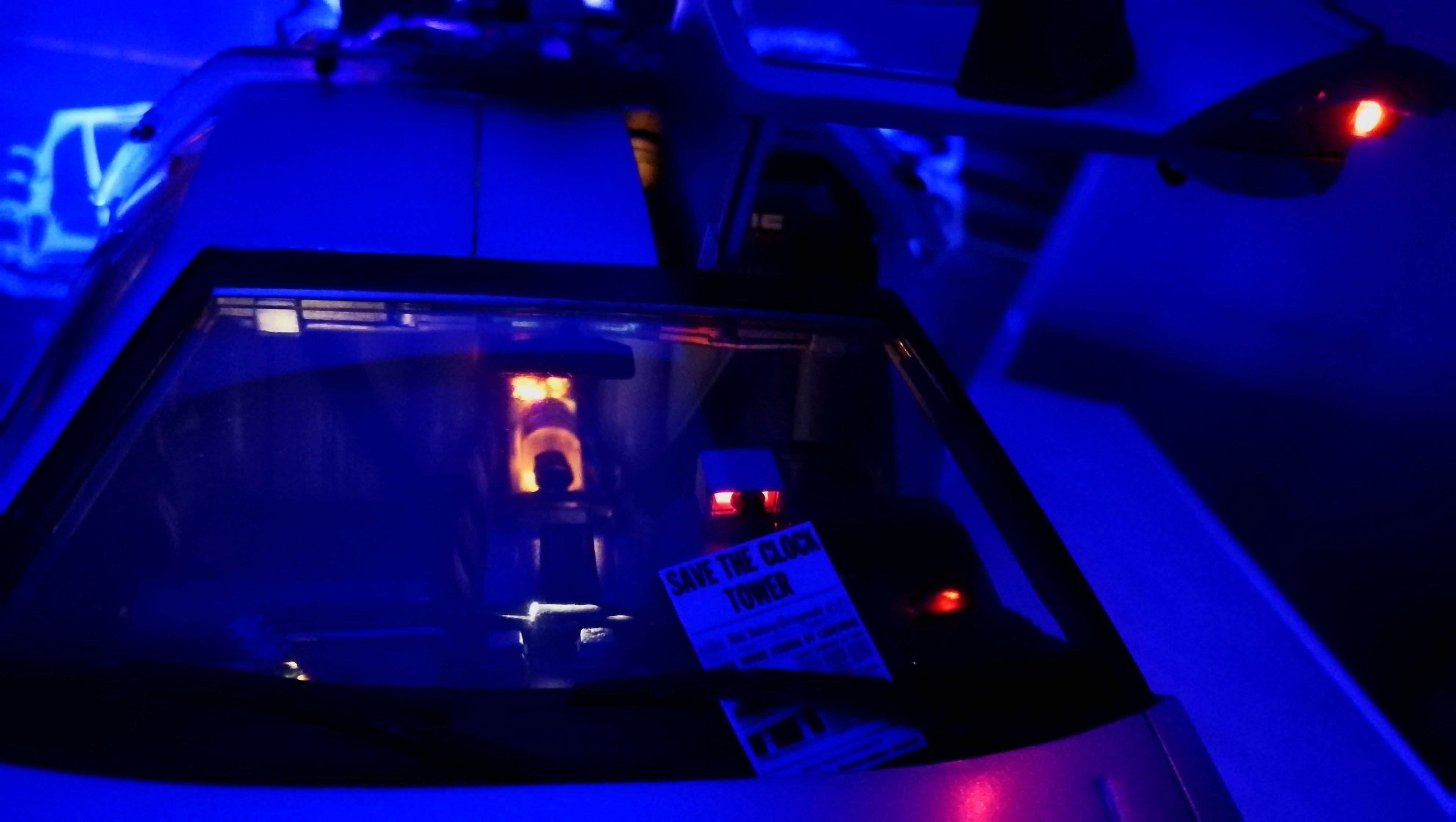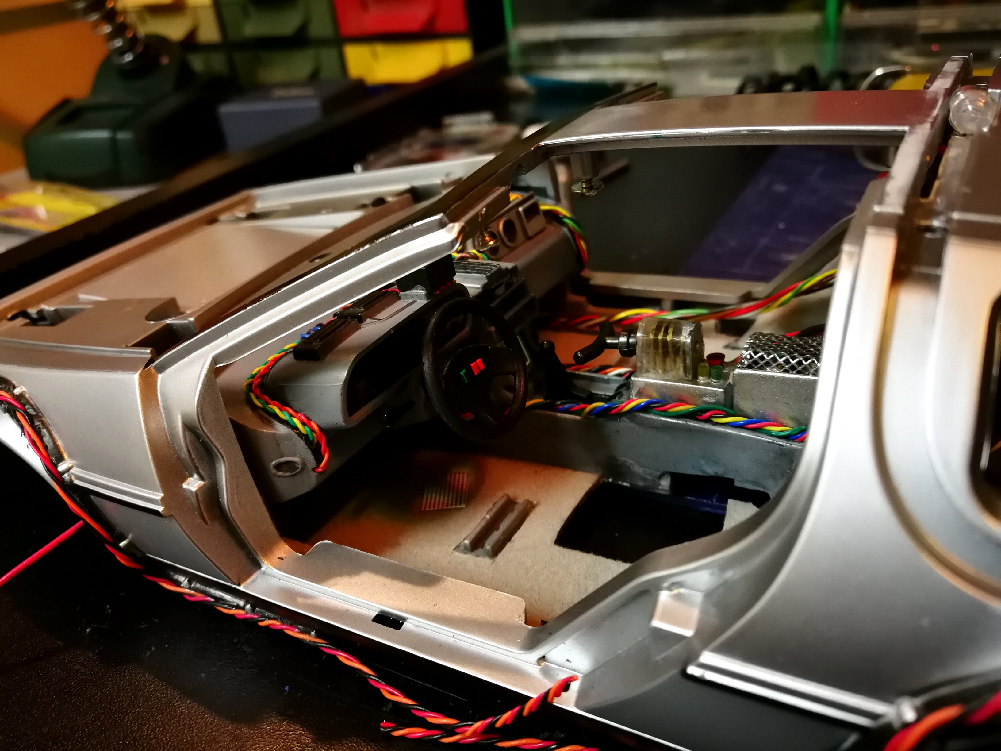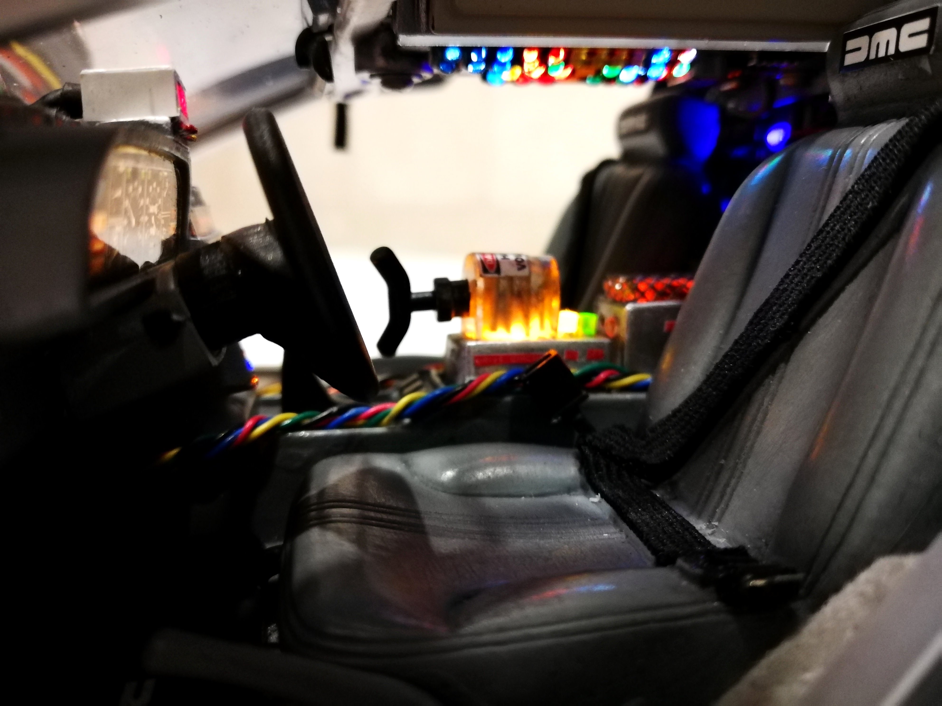 Diamond Select DeLorean model 1:15 modified with new lights and a dedicated stand. In the stand there is a working clock, lights and a memory card with multiple songs taken from the films back to the future. There are also some dialogues from the first film (in Italian). The original functions of the model (lights and sounds and flight / road configuration) are unchanged and the model also works with batteries. The stand and the stand graphics were designed and created by myself.
