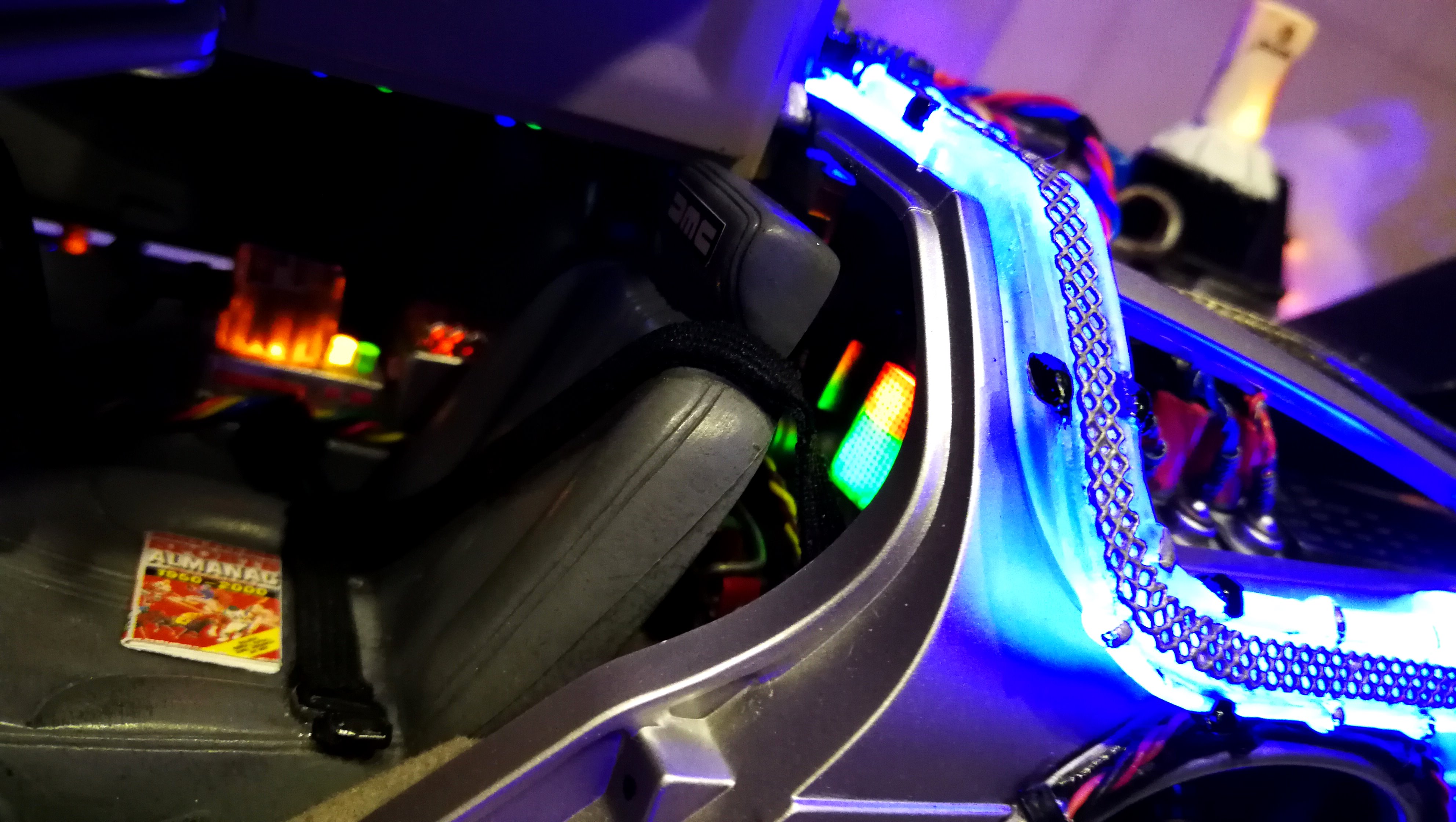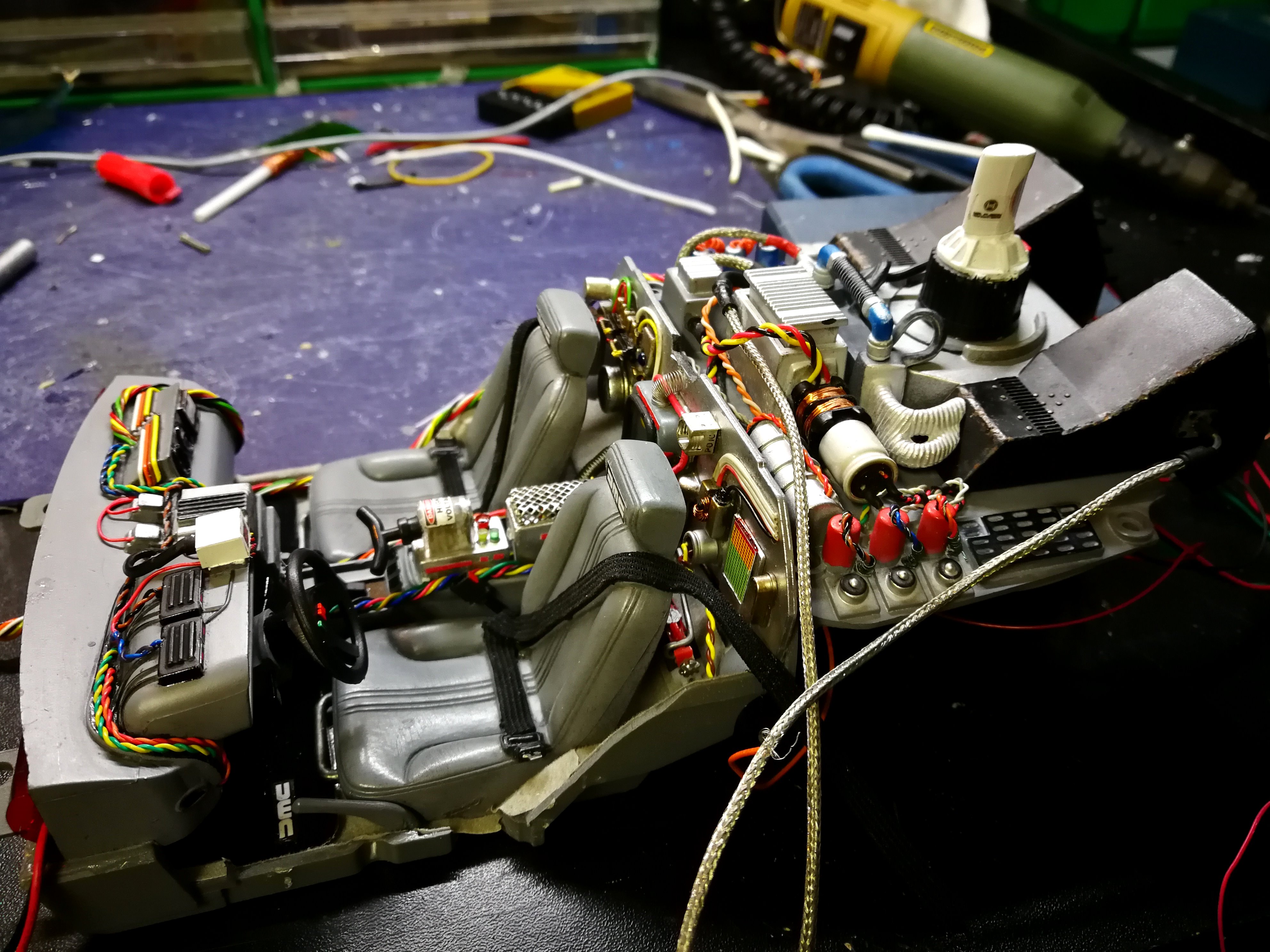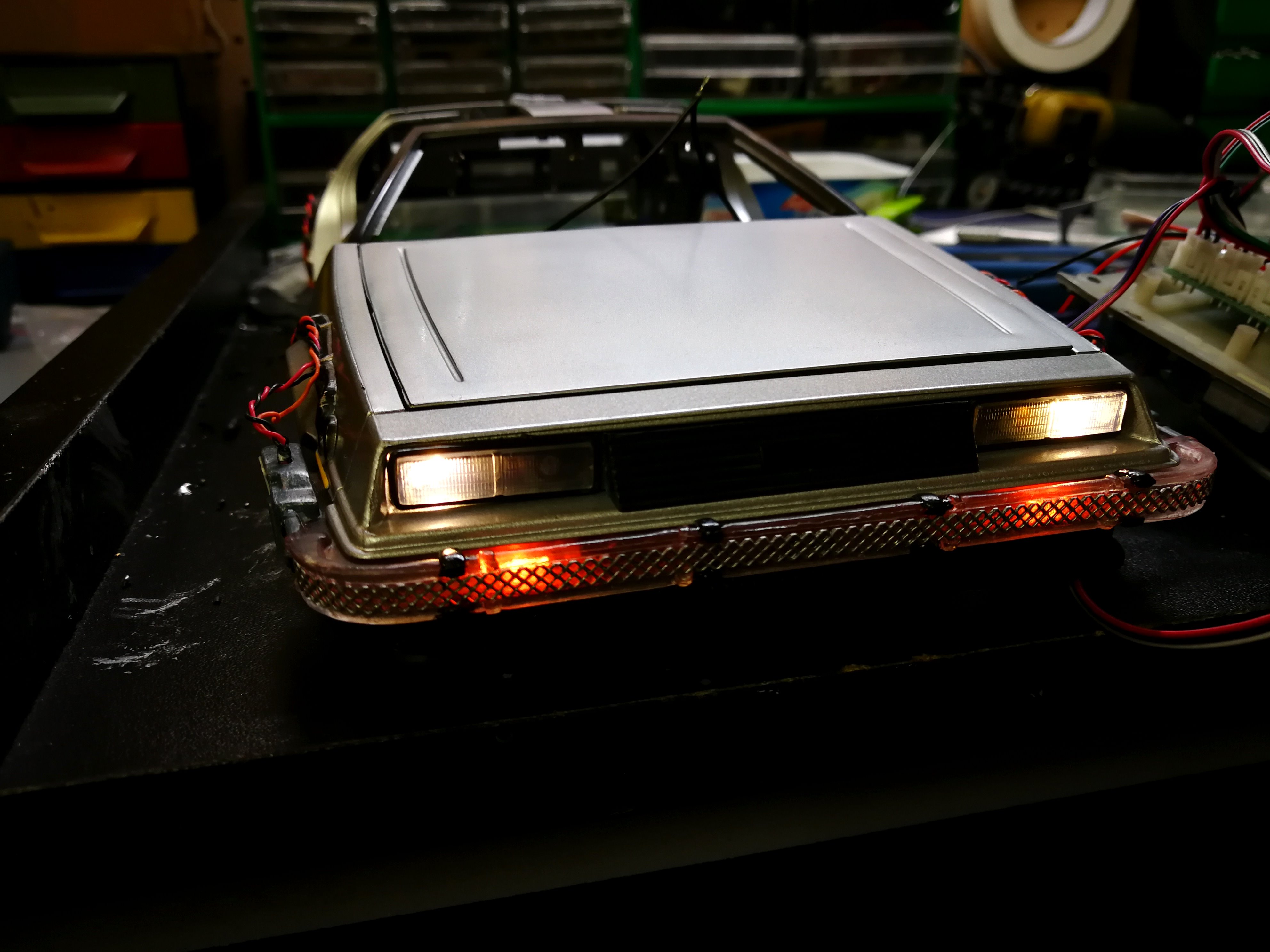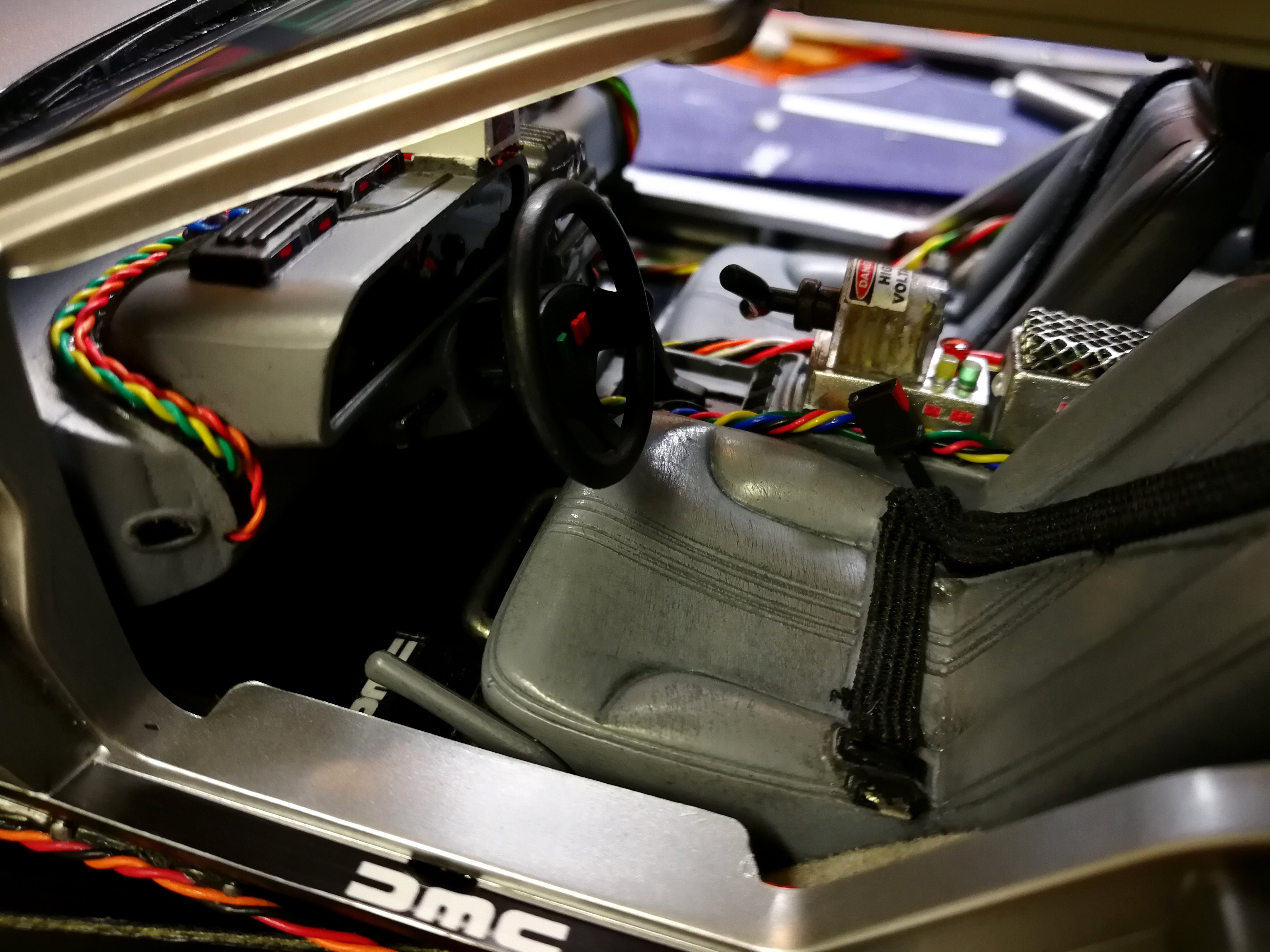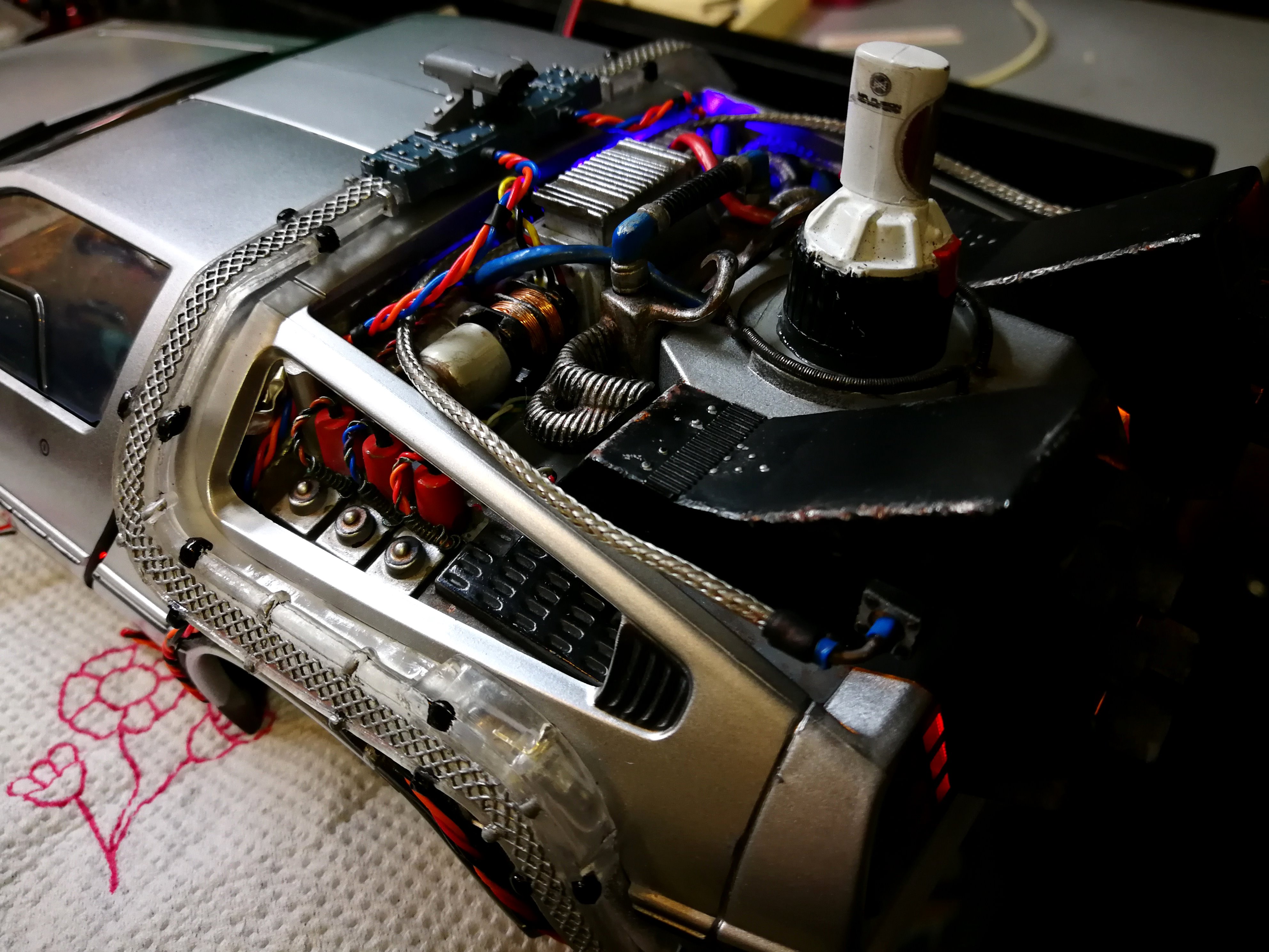Diamond Select DeLorean model 1:15 modified with new lights and a dedicated stand. In the stand there is a working clock, lights and a memory card with multiple songs taken from the films back to the future. There are also some dialogues from the first film (in Italian). The original functions of the model (lights and sounds and flight / road configuration) are unchanged and the model also works with batteries. The stand and the stand graphics were designed and created by myself.