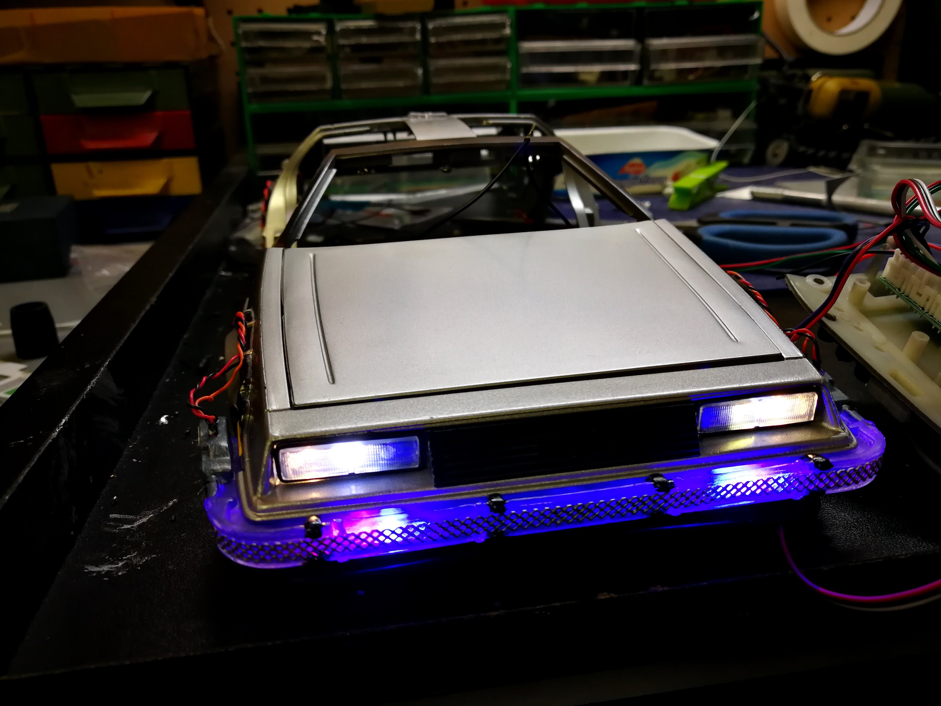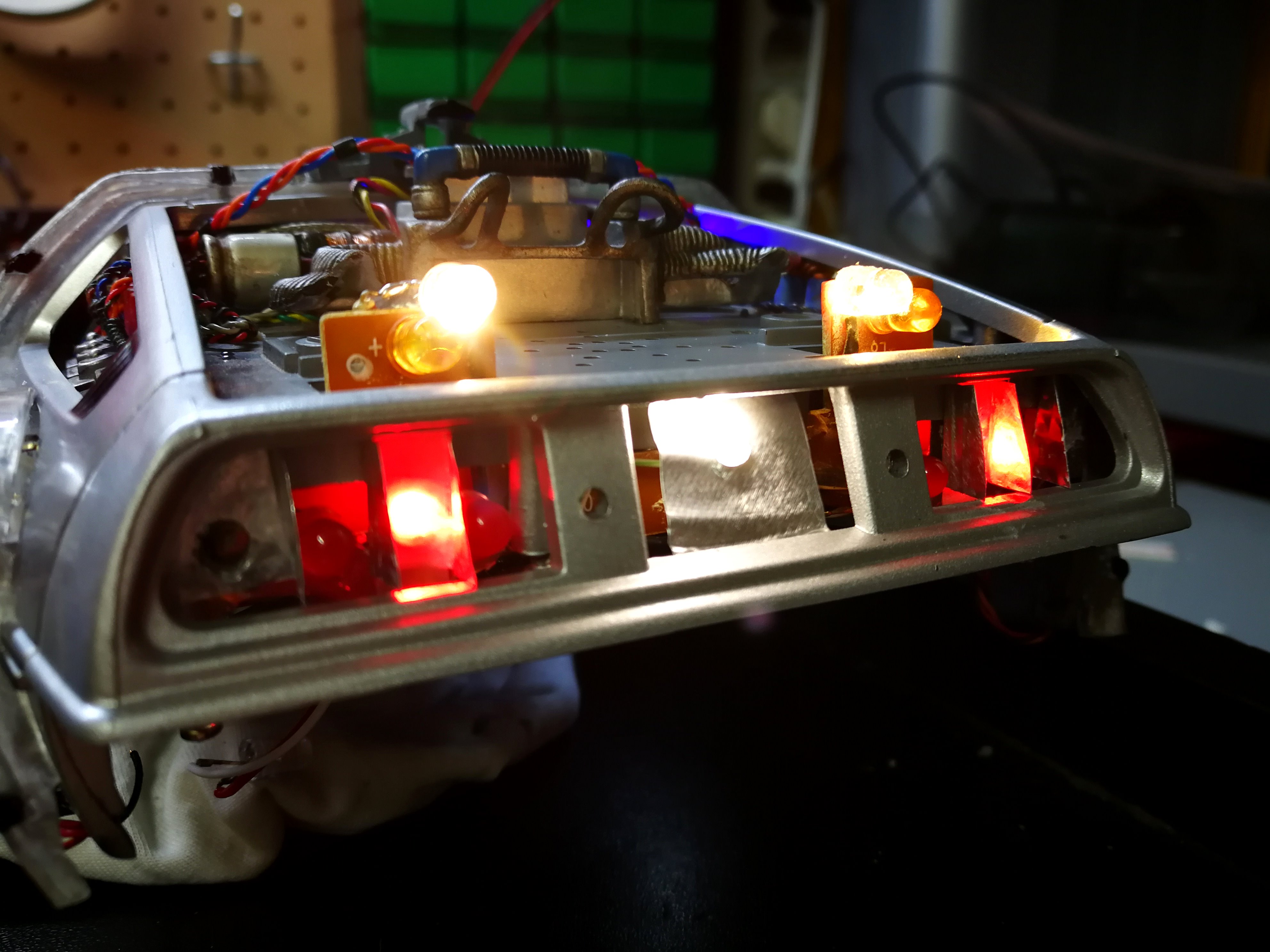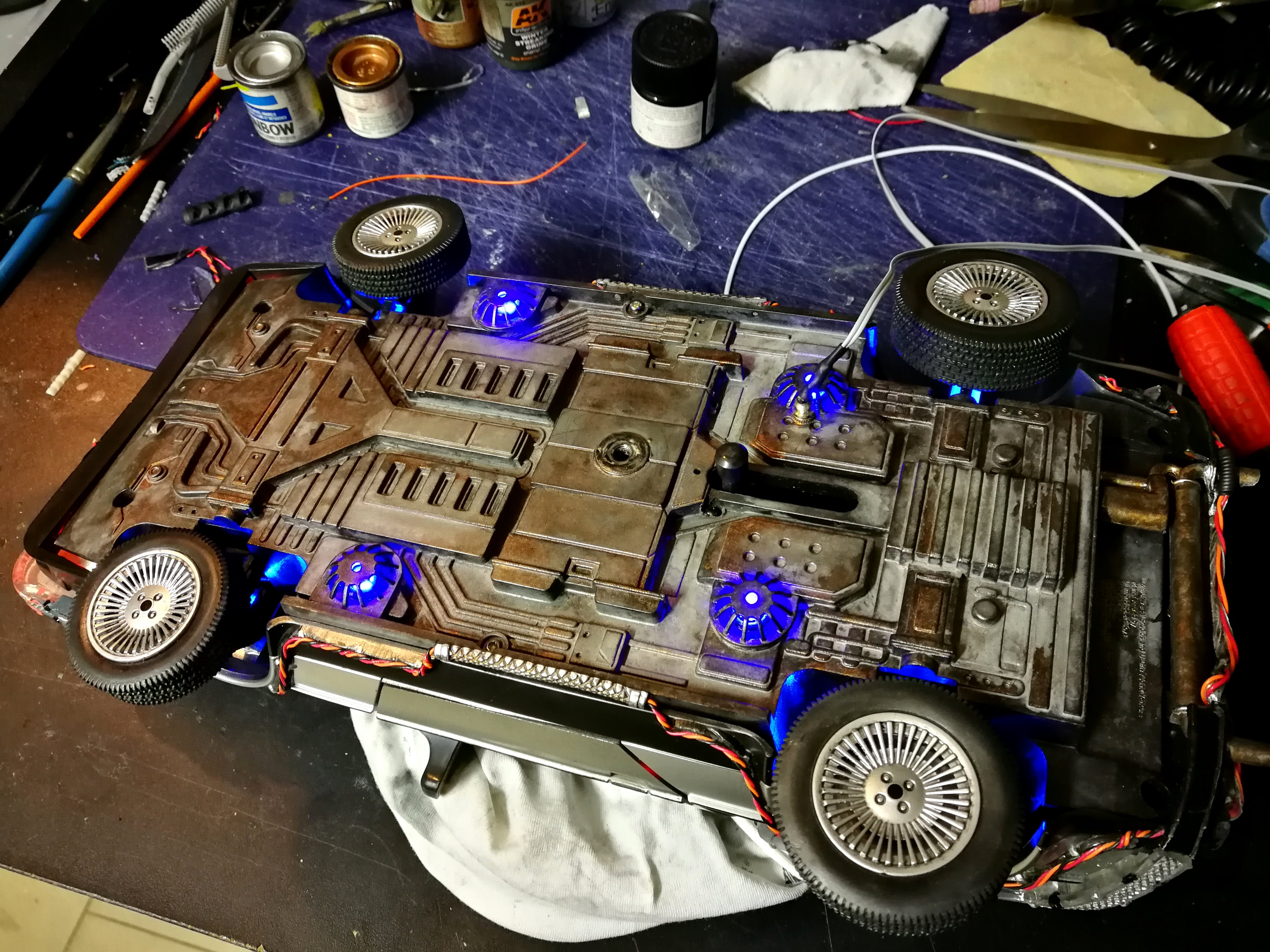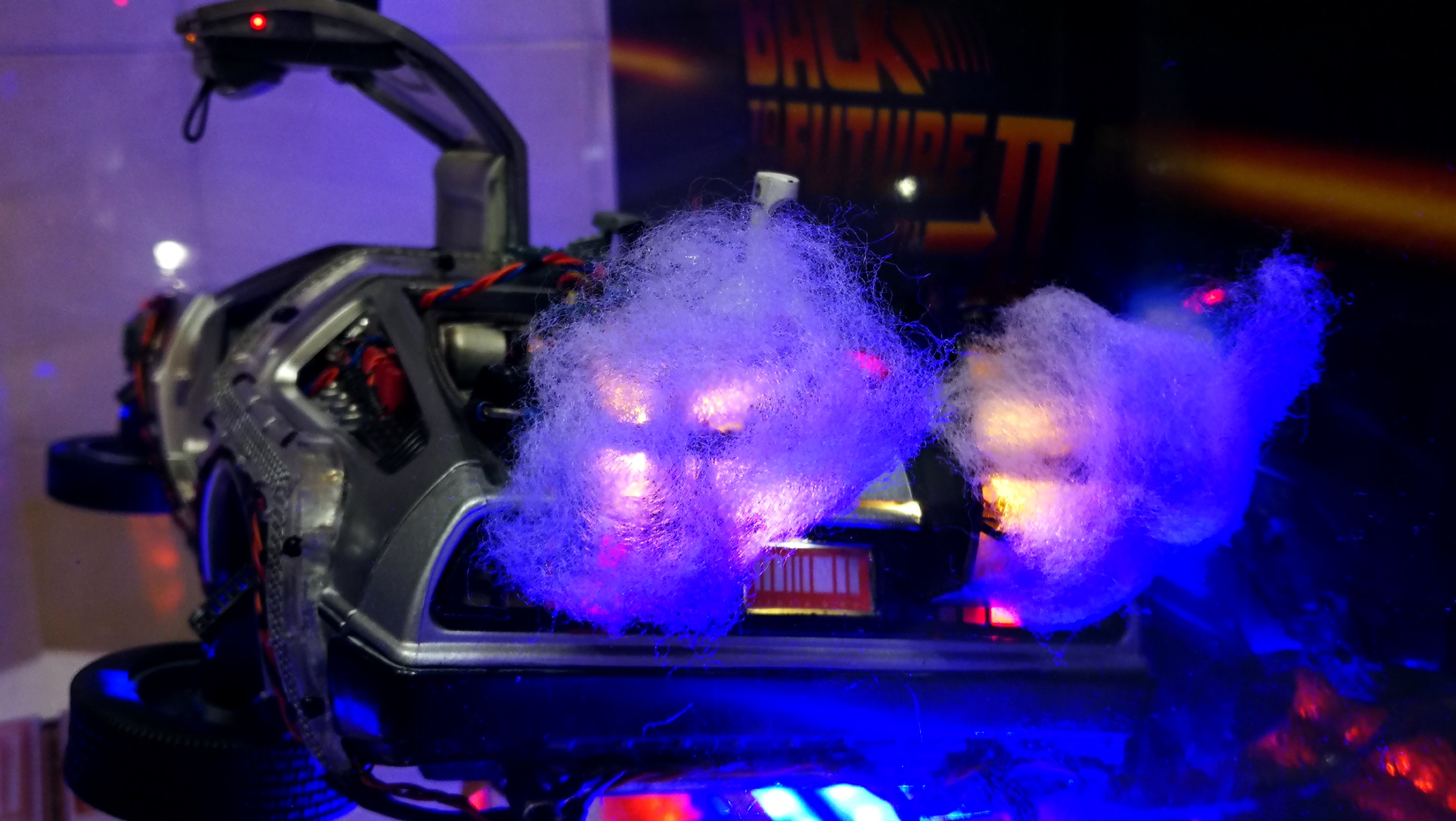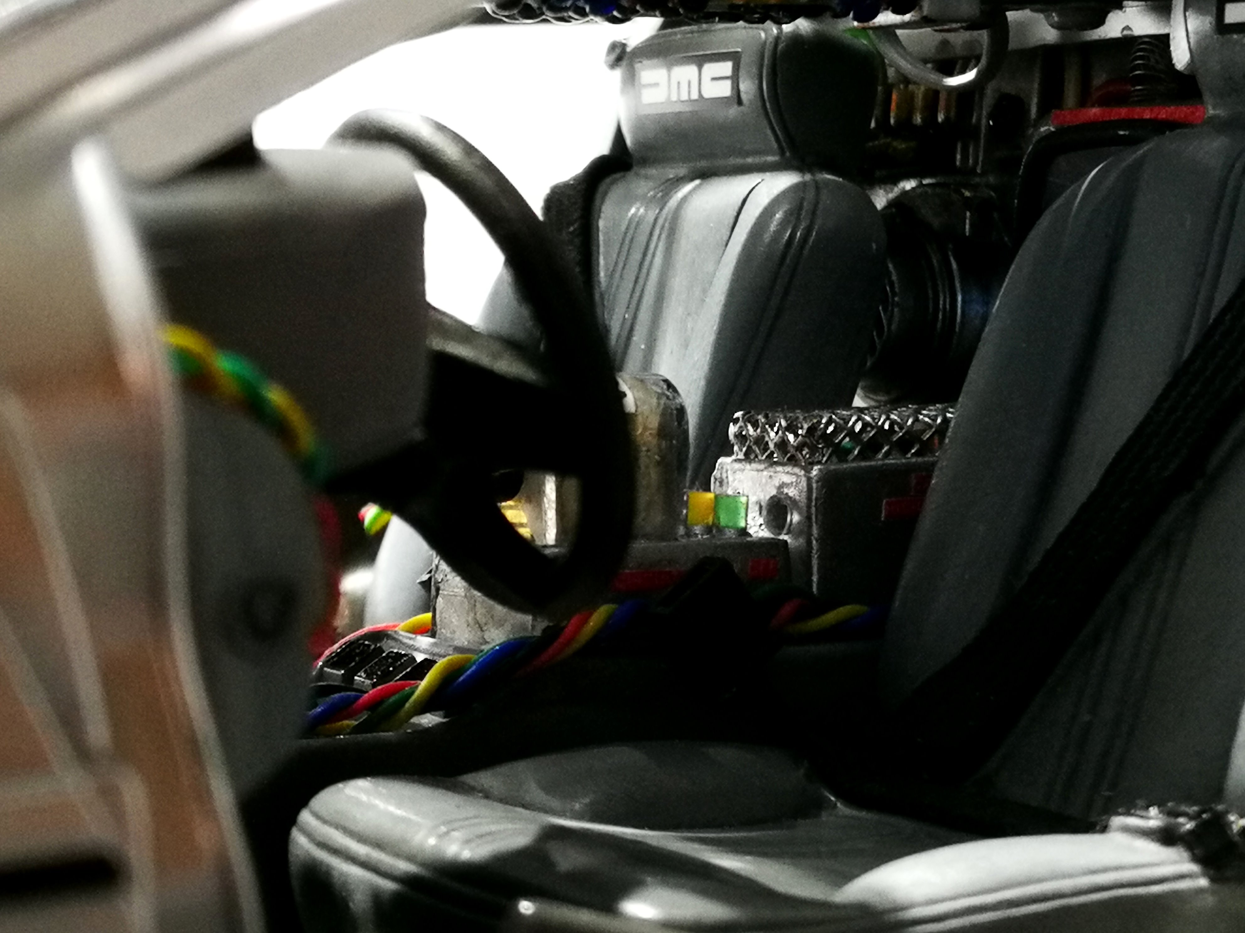 Diamond Select DeLorean model 1:15 modified with new lights and a dedicated stand. In the stand there is a working clock, lights and a memory card with multiple songs taken from the films back to the future. There are also some dialogues from the first film (in Italian). The original functions of the model (lights and sounds and flight / road configuration) are unchanged and the model also works with batteries. The stand and the stand graphics were designed and created by myself.