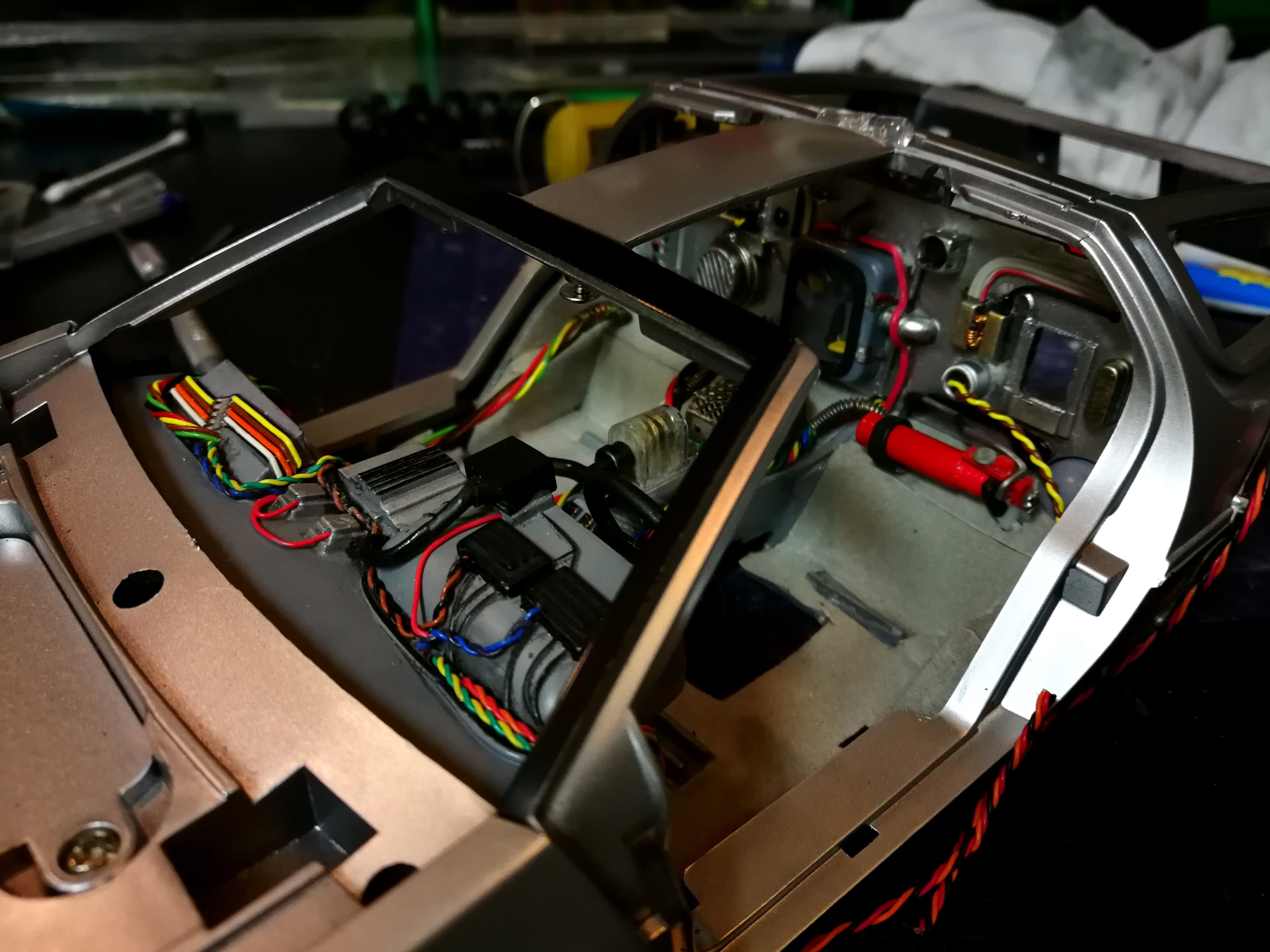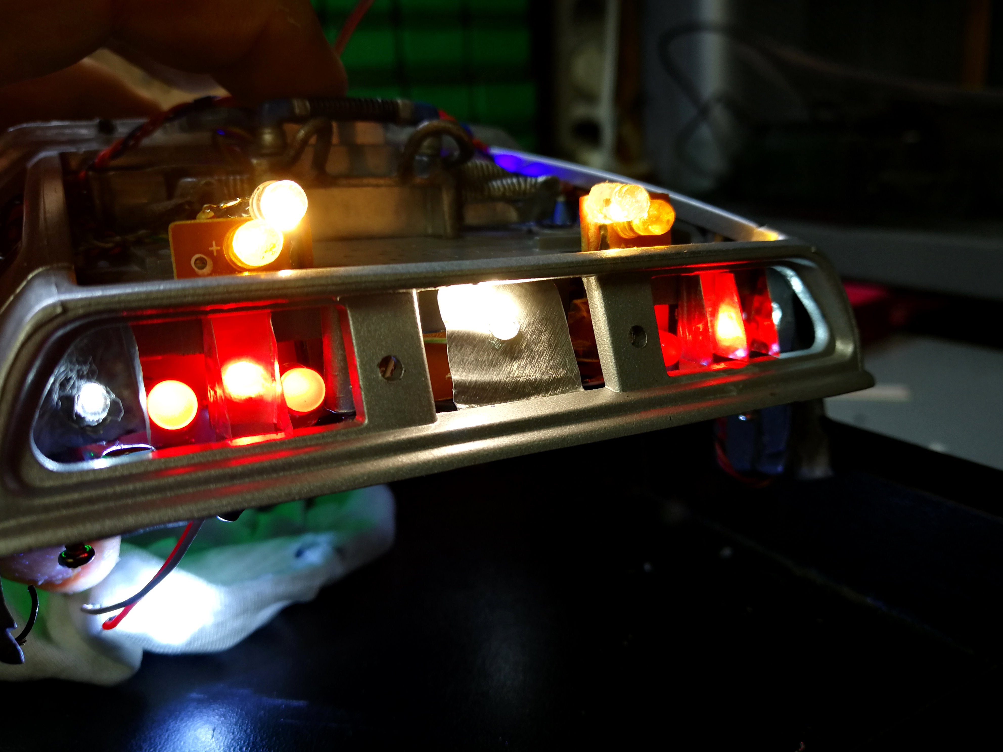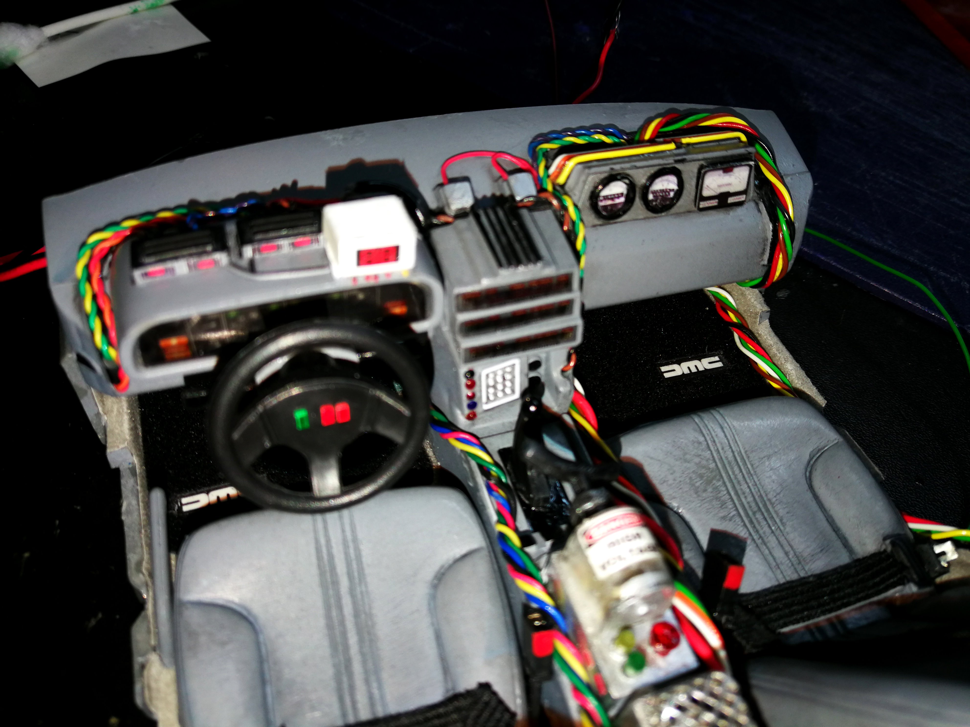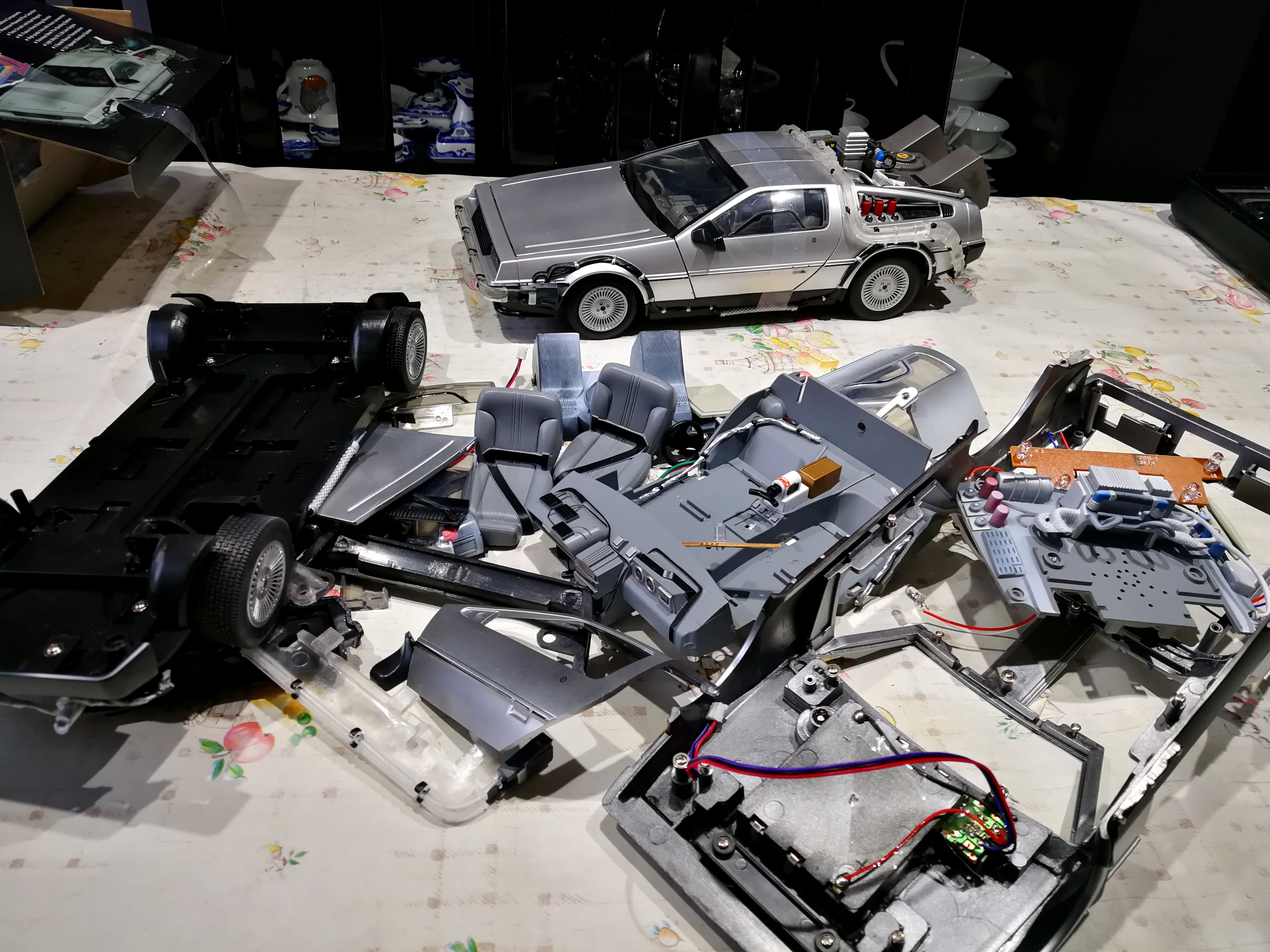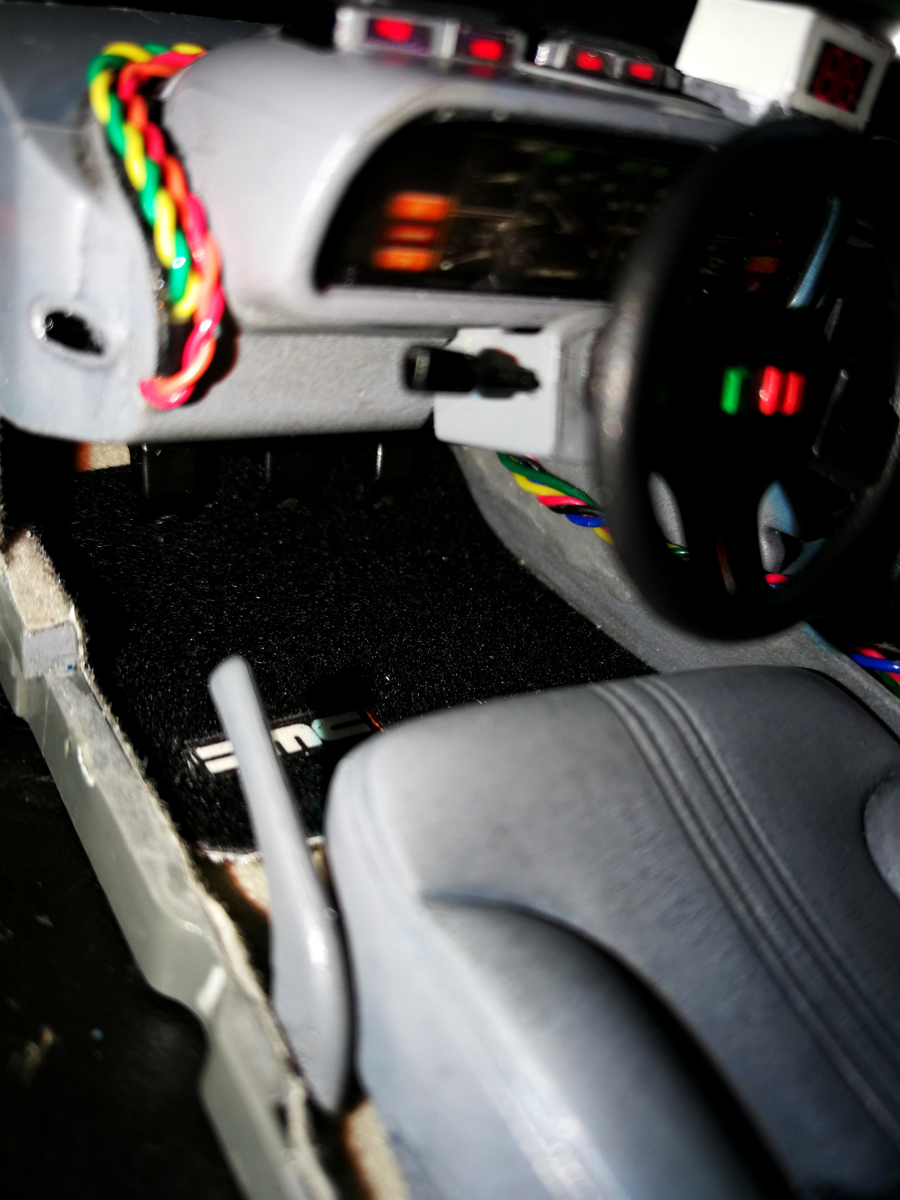 Diamond Select DeLorean model 1:15 modified with new lights and a dedicated stand. In the stand there is a working clock, lights and a memory card with multiple songs taken from the films back to the future. There are also some dialogues from the first film (in Italian). The original functions of the model (lights and sounds and flight / road configuration) are unchanged and the model also works with batteries. The stand and the stand graphics were designed and created by myself.