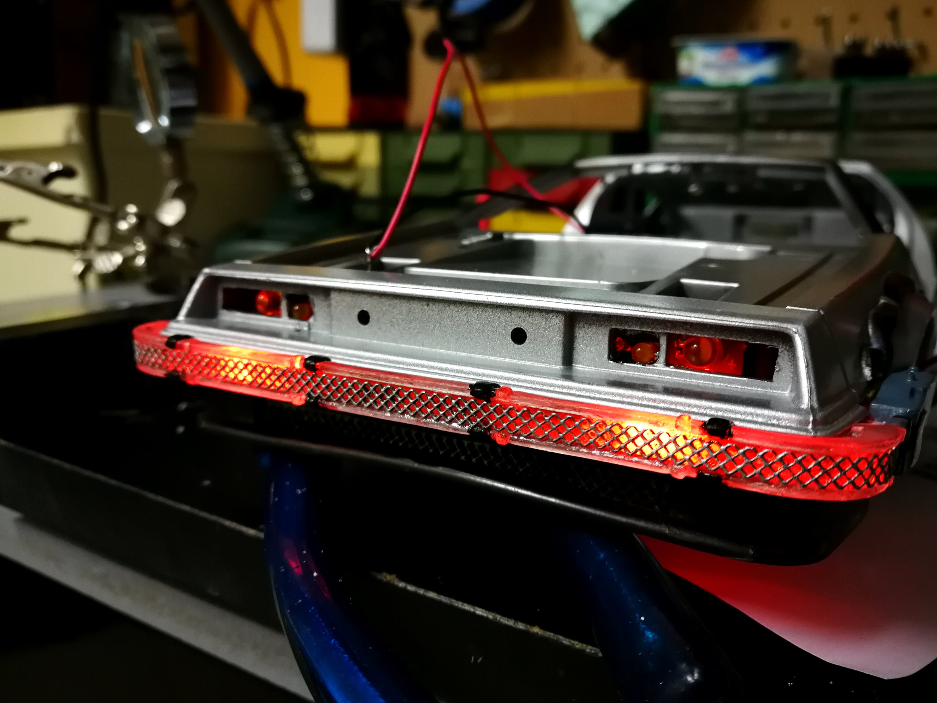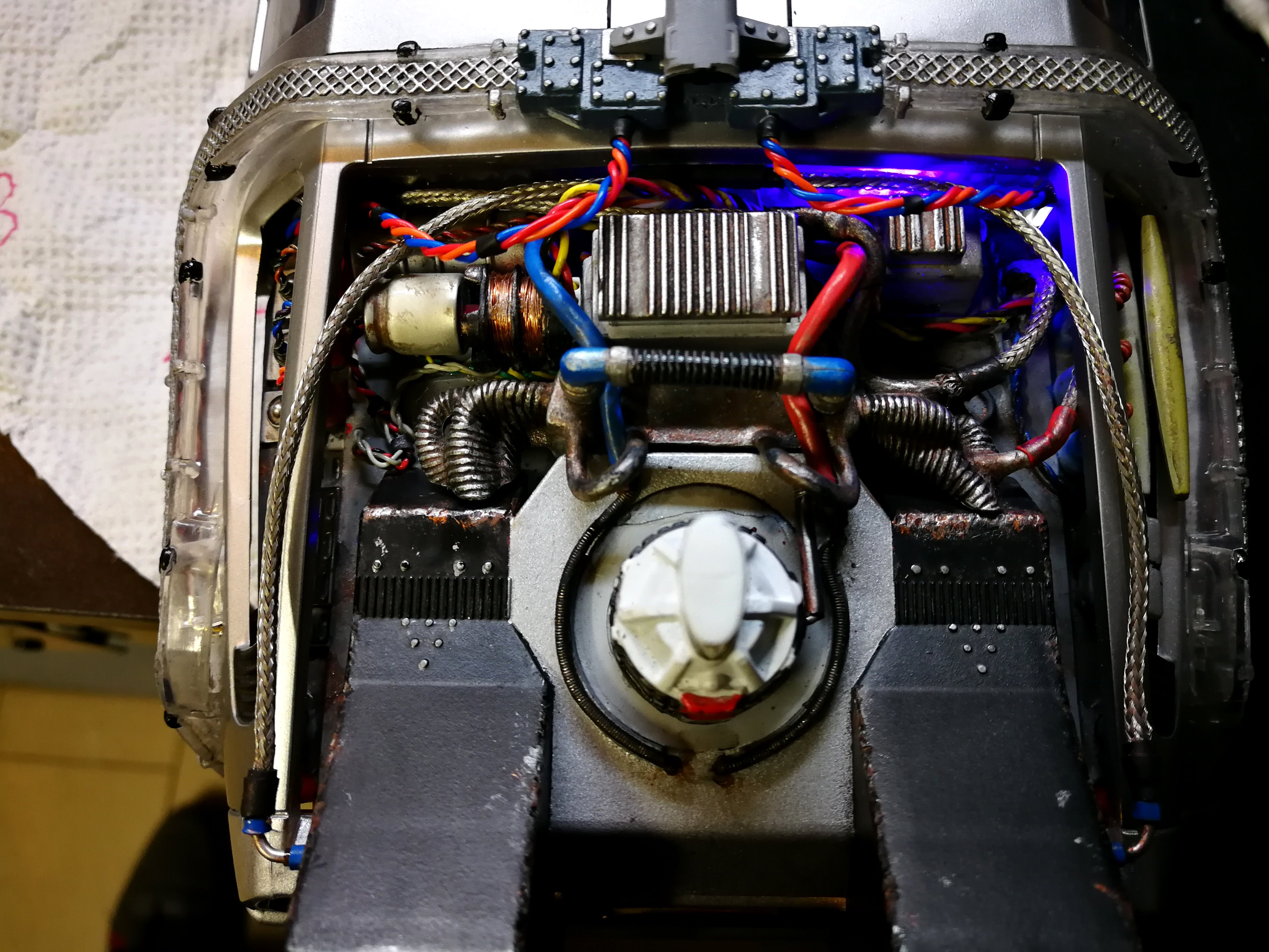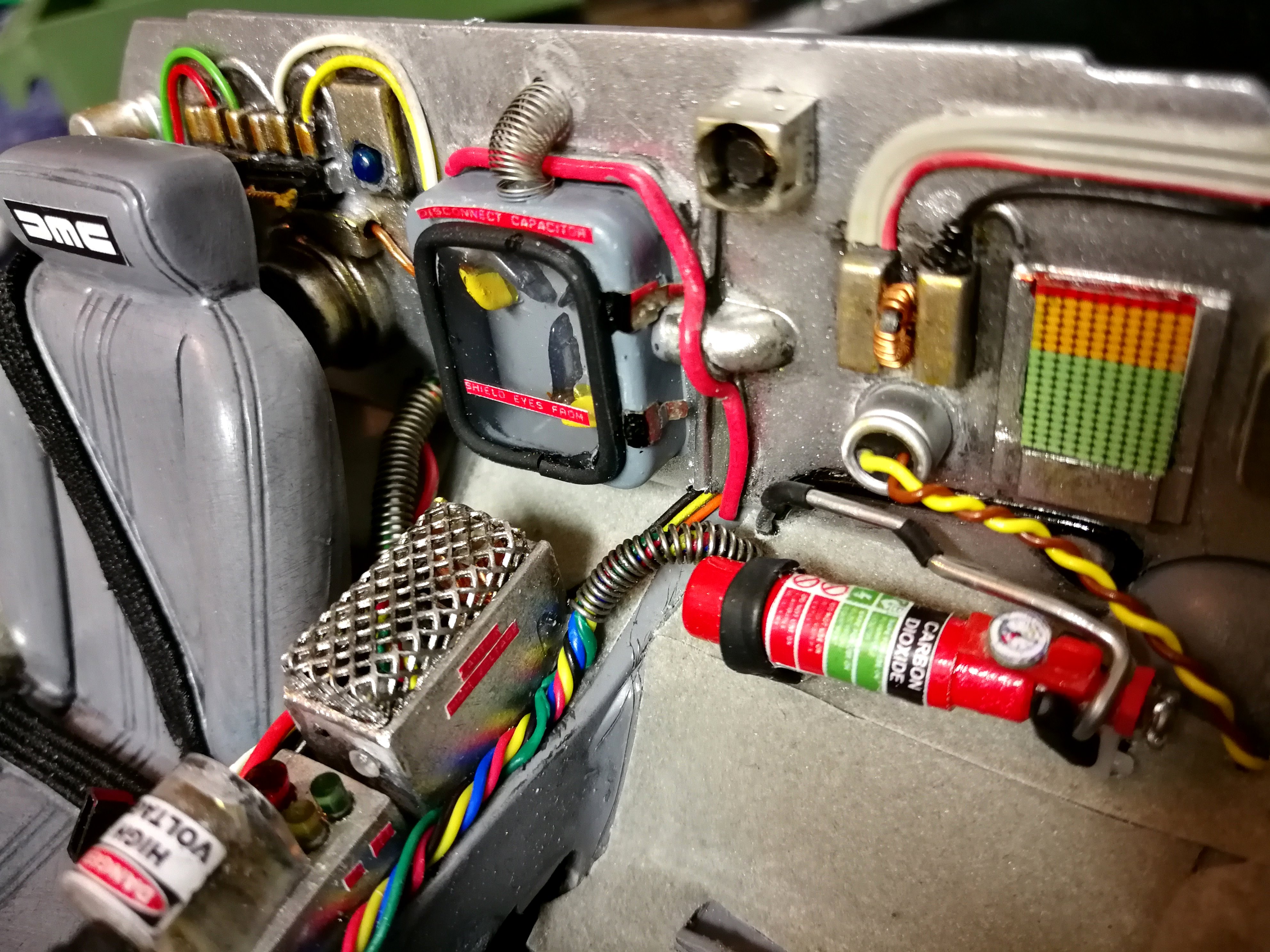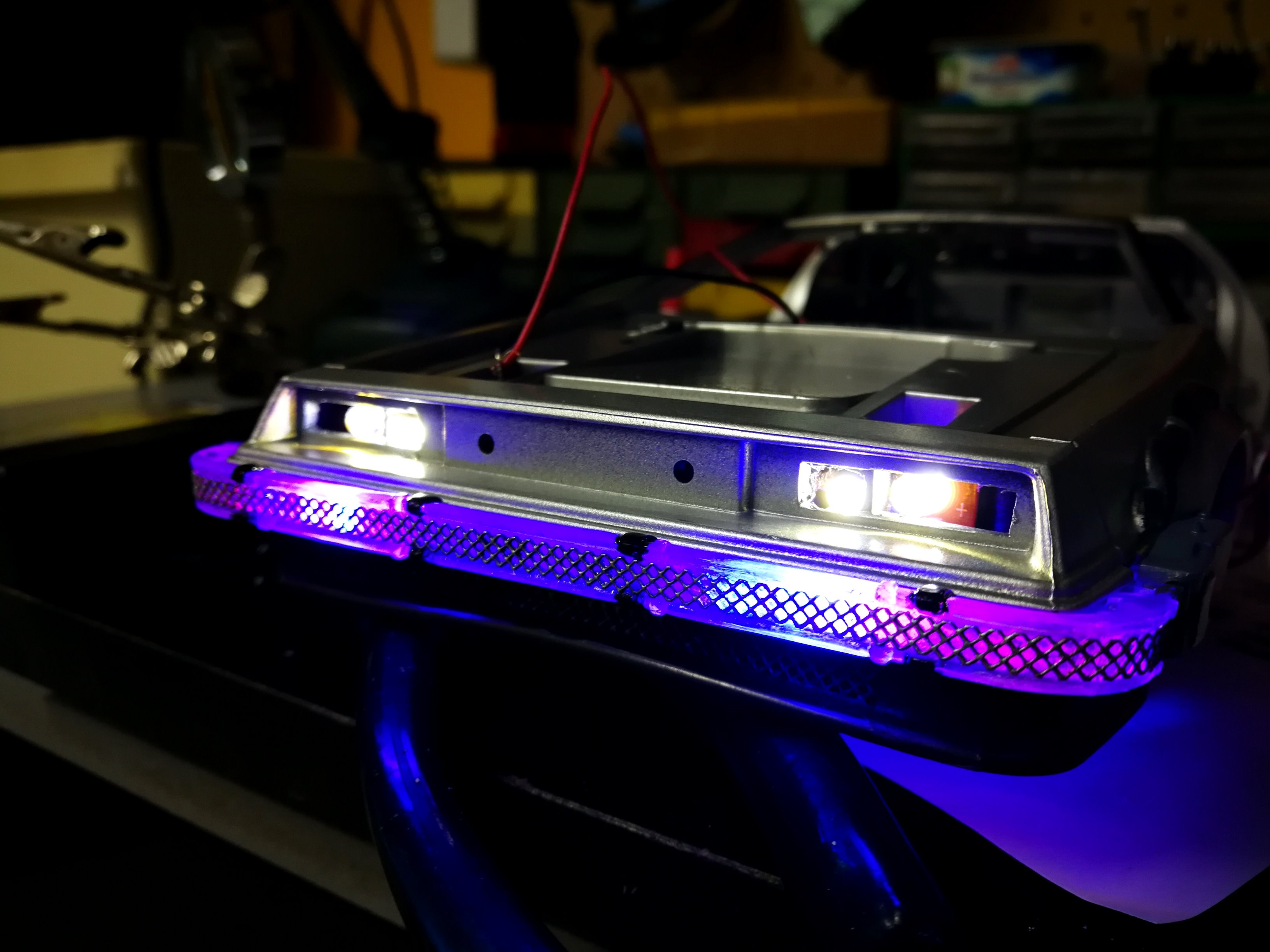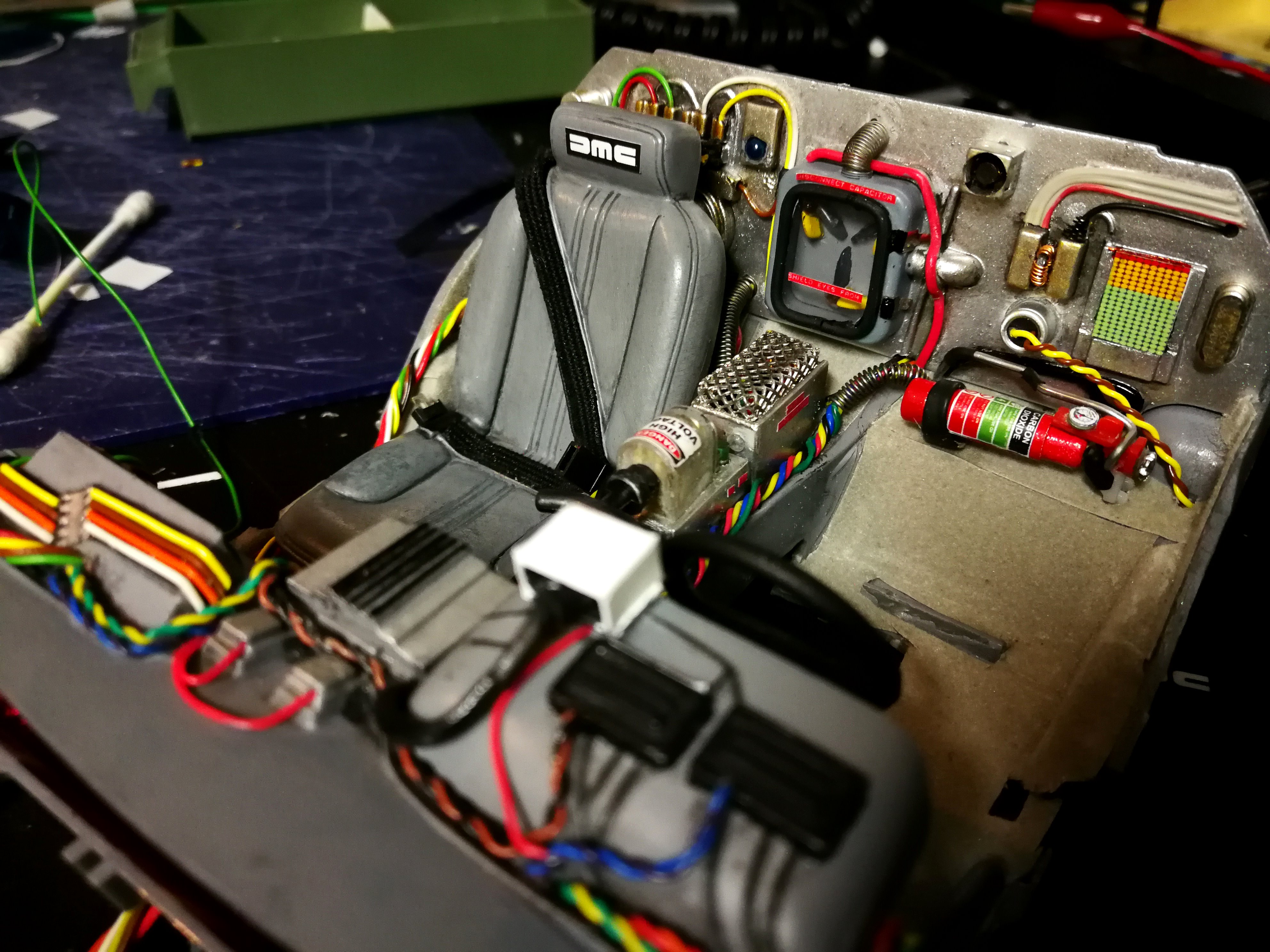 Diamond Select DeLorean model 1:15 modified with new lights and a dedicated stand. In the stand there is a working clock, lights and a memory card with multiple songs taken from the films back to the future. There are also some dialogues from the first film (in Italian). The original functions of the model (lights and sounds and flight / road configuration) are unchanged and the model also works with batteries. The stand and the stand graphics were designed and created by myself.