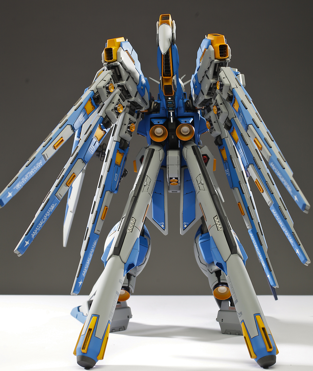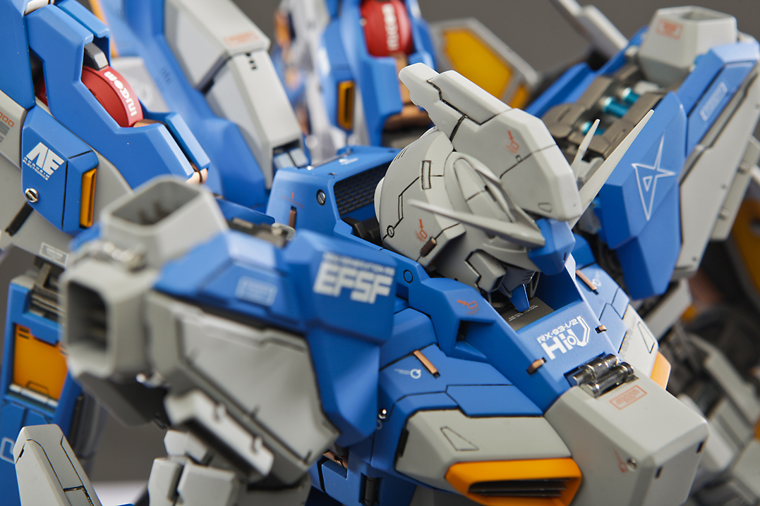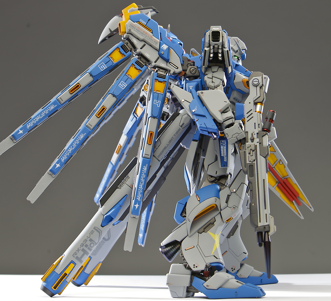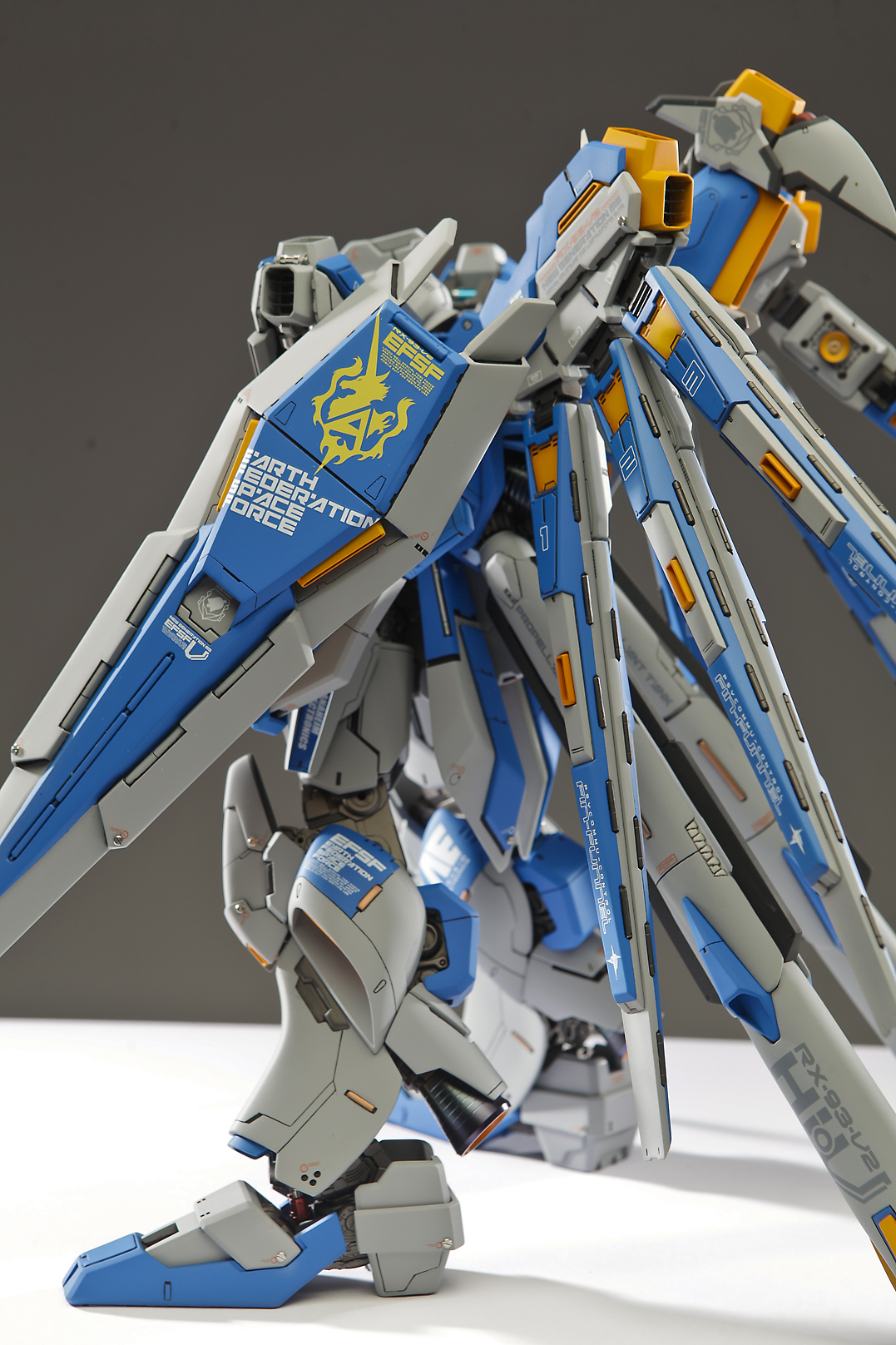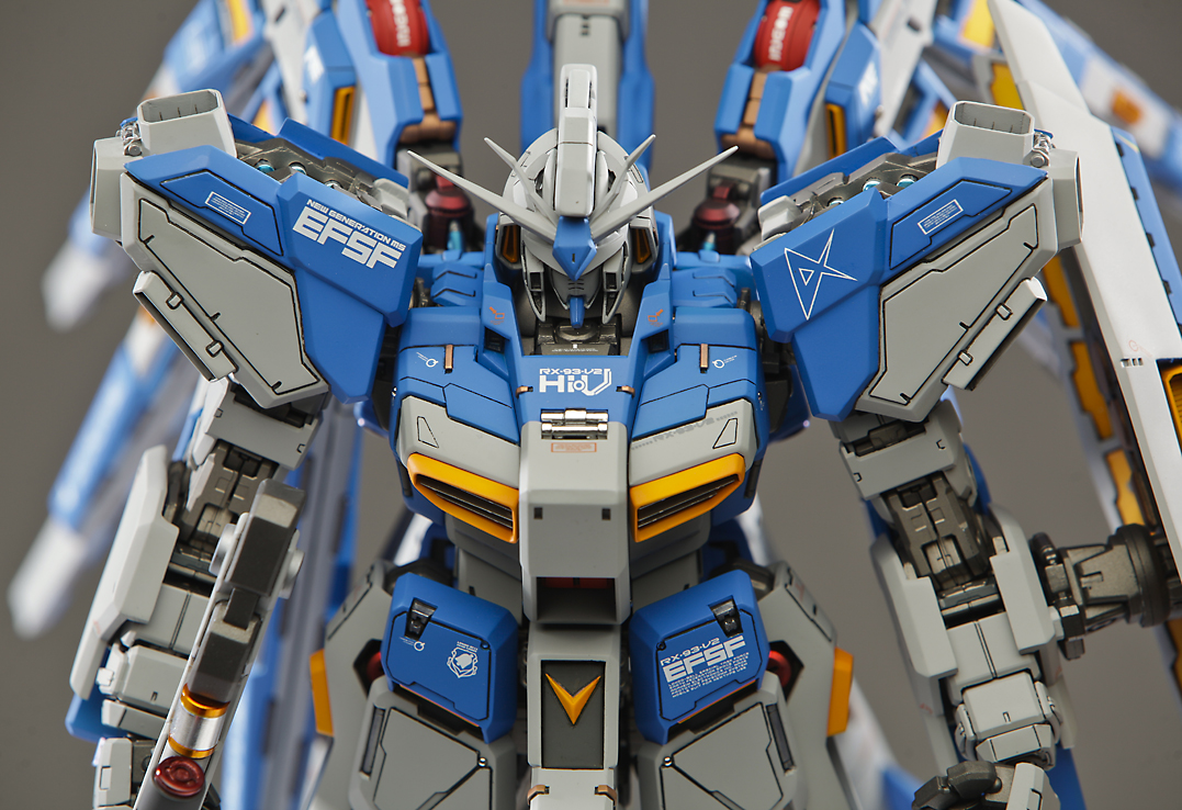 This is my 1/72 Hi-Nu Conversion kit from G-System Shop. This kit takes the Bandai Perfect Grade Strike and converts it to a 1/72 Hi-Nu. 95% of what you see is resin. The conversion kit uses the plastic inner frame from the PG kit and the resin armor attaches to it. Everything except the fin funnels are resin. This took me roughly 300 hours over a 2 1/2 month period. It was a marathon build for Wonder Fest 2015.