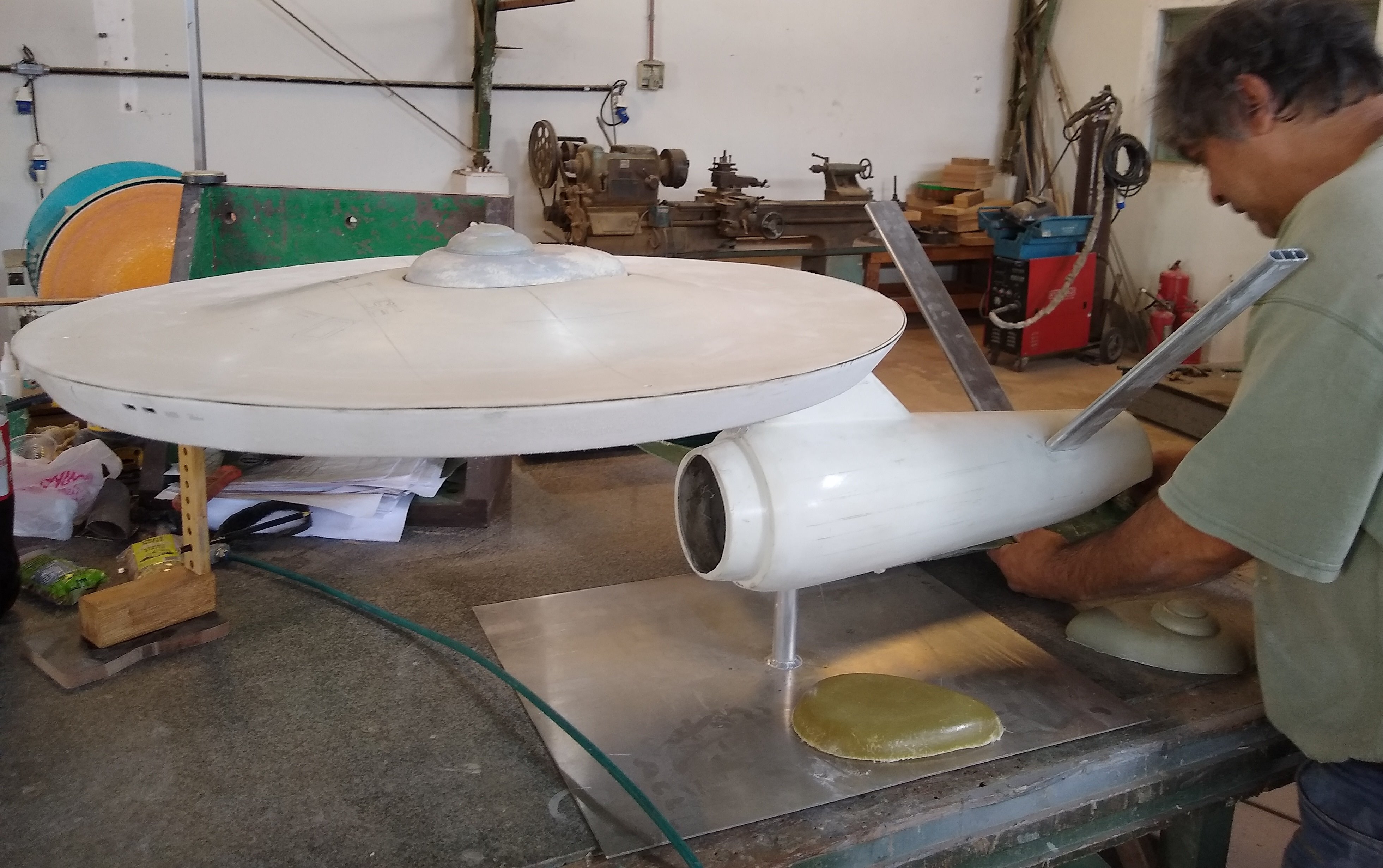 Brazilian artist Maurício Campos is in the middle of making a fantastic and large (1/180 at ~63 inches) USS Enterprise from Star Trek the original series! Made of polystyrene, this piece is coming along nicely! Their next step is to mold the Nacelles. I cannot wait to see, and show here the final photos when they are completed!