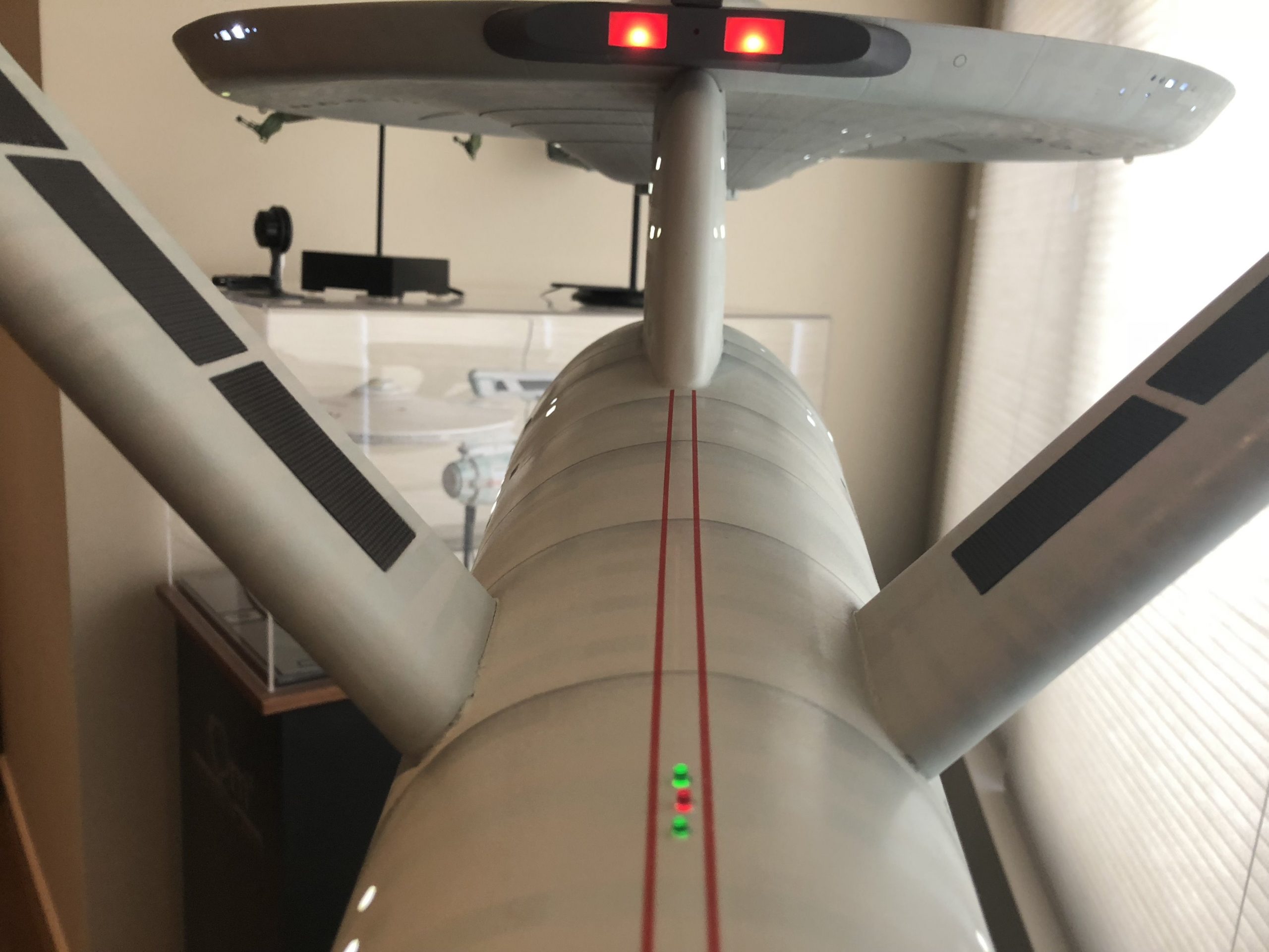 This fantastic piece was recently shown to me. Built from the old Custom Replicas (Jim Key) 66 inch USS Enterprise Kit, Michael Plante had this built as the USS Enterprise as seen in the Star Trek Original Series HD Remaster! It is beautiful to see this model with panels subtly painted, and the nacelle interiors glowing blue. Plus.. look at that Shuttle Bay! This is definitely one of a kind, and beautifully done! I would love to see Michael’s collection placed on display in a Museum sometime…. it is amazing!