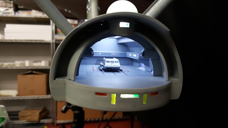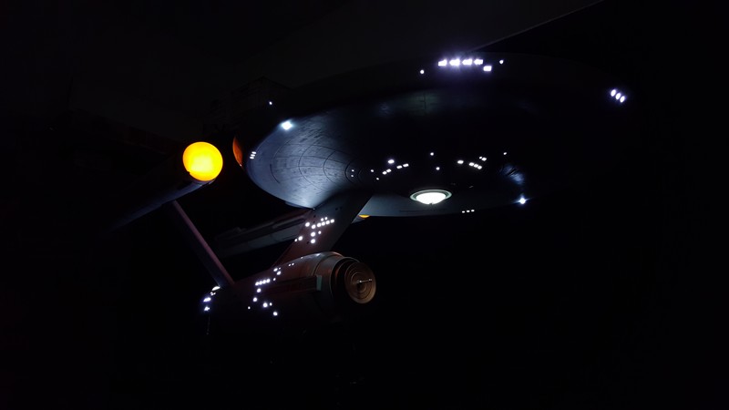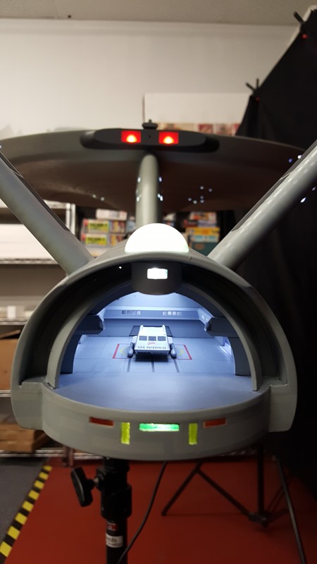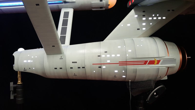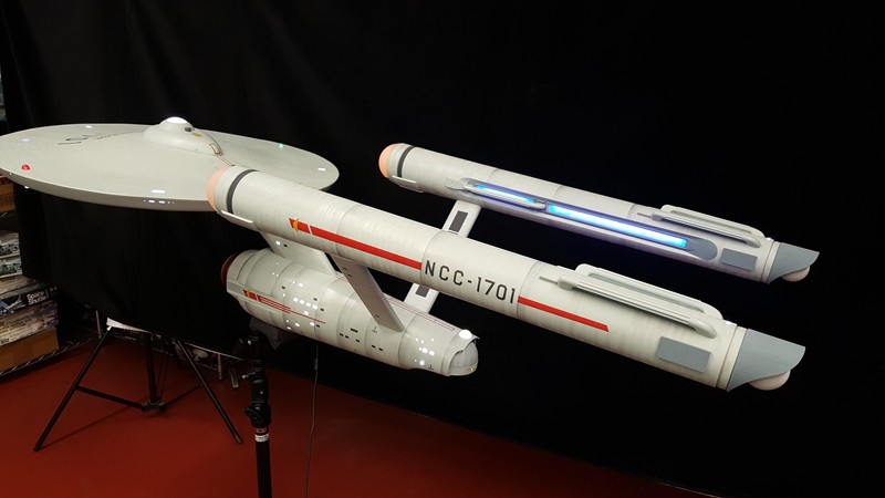 Just a little teaser of the almost completed TOS 66” 1701. Here is the first round rough fit, she is a hybrid and can look like both the original 1701 as seen on TV in the 60’s but also can show as a Phase 2 version with detailed and lit nacelle trenches and impulse engines. A lite aztecing has been done across the entire ship none of which would have been seen under the bright lights of the camera. Additionally, trying to stay true to the original, the weld lines were added to both the engineering section and nacelles which sadly did not make it back during the Smithsonian restoration. The primary hull and nacelles have been designed to be removable for shipping. We decided on a purely LED solution for each of the buzzard collectors instead of the traditional fan motor blade effect, quite hard to tell the difference when installed.