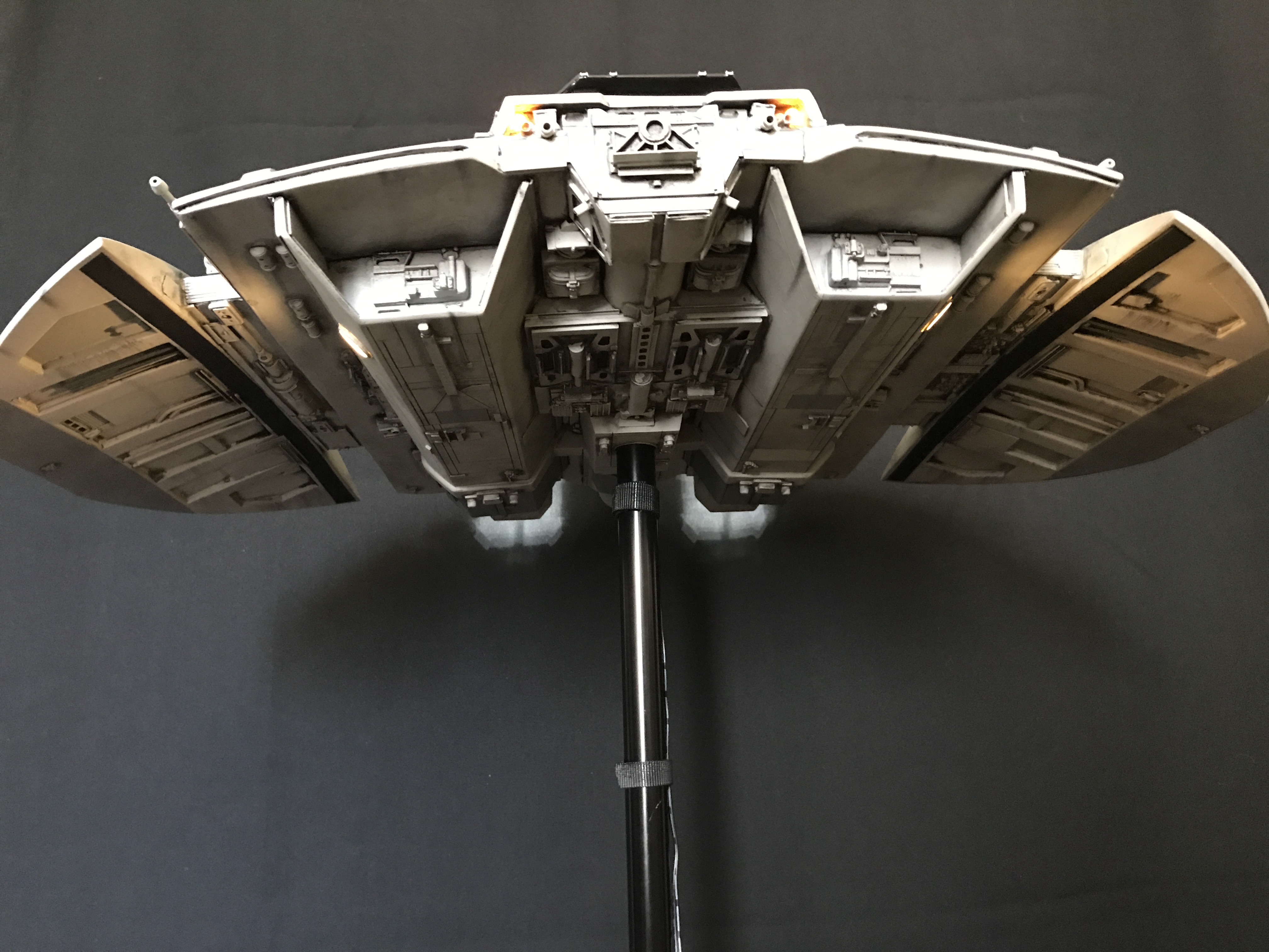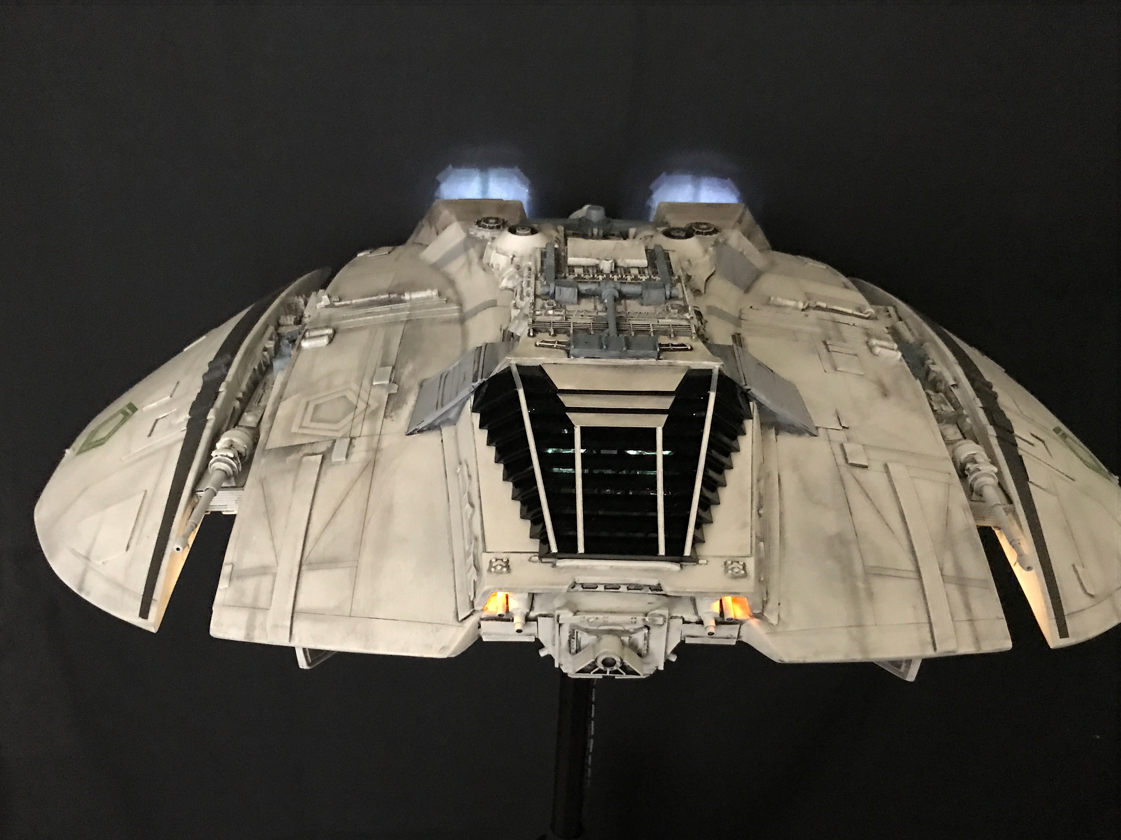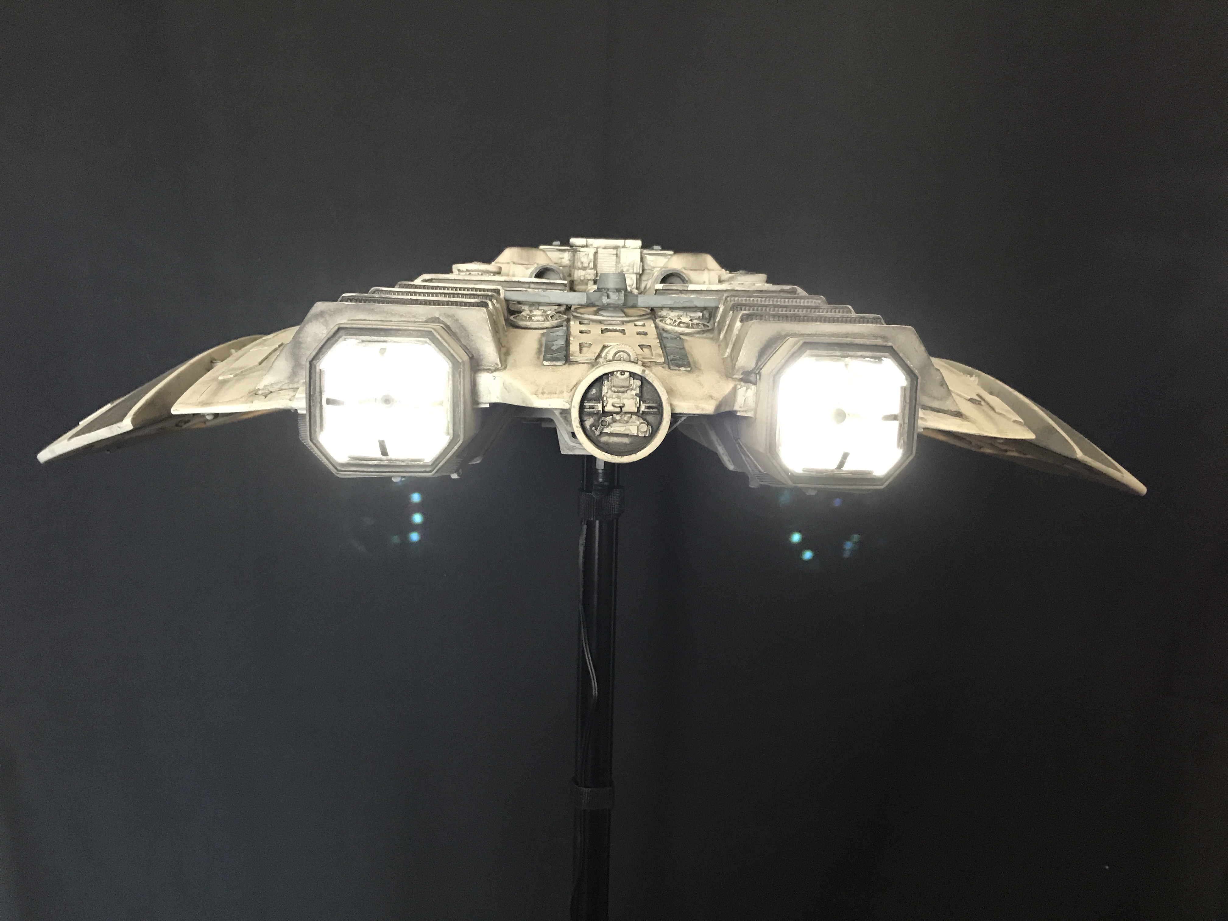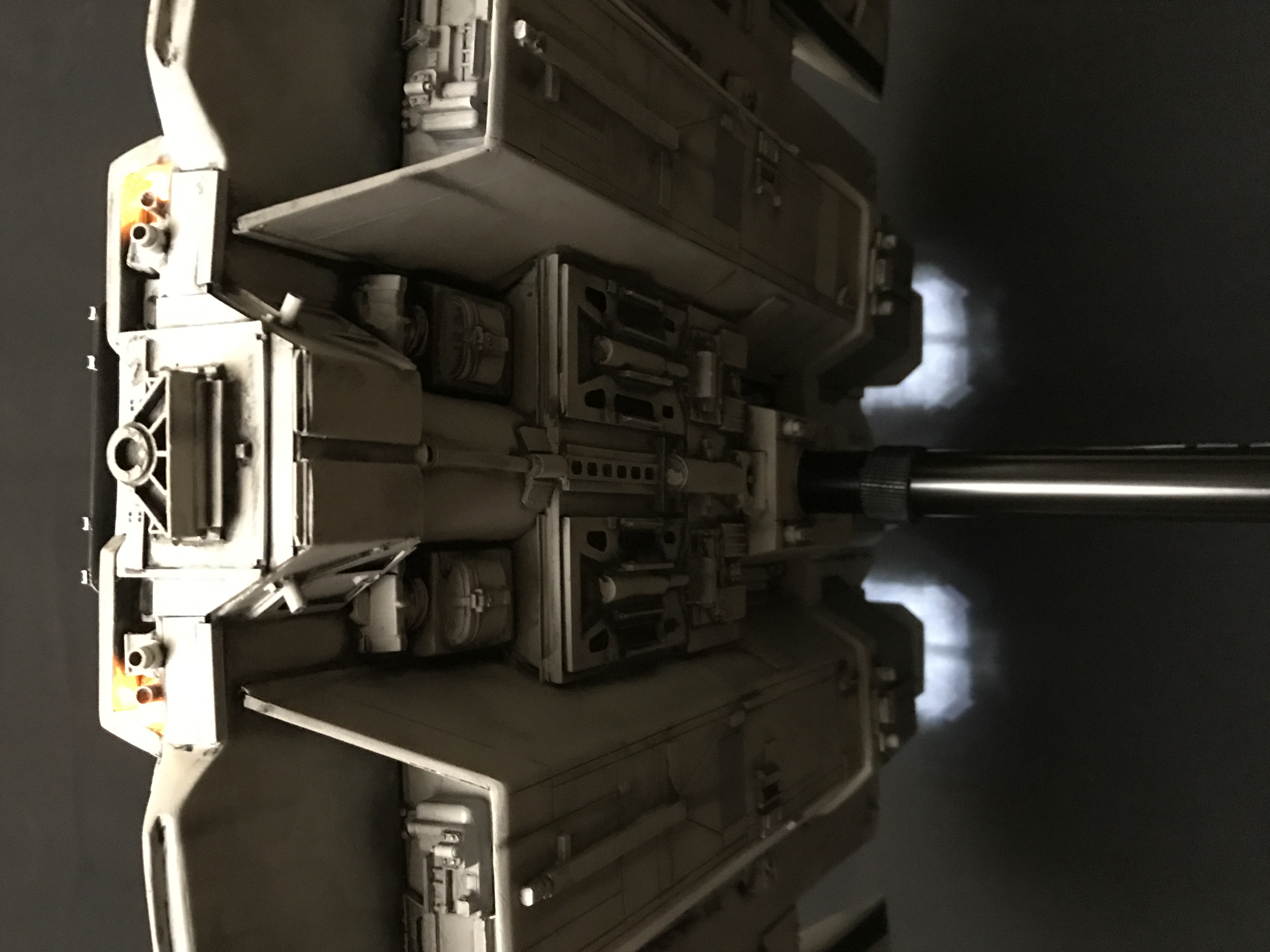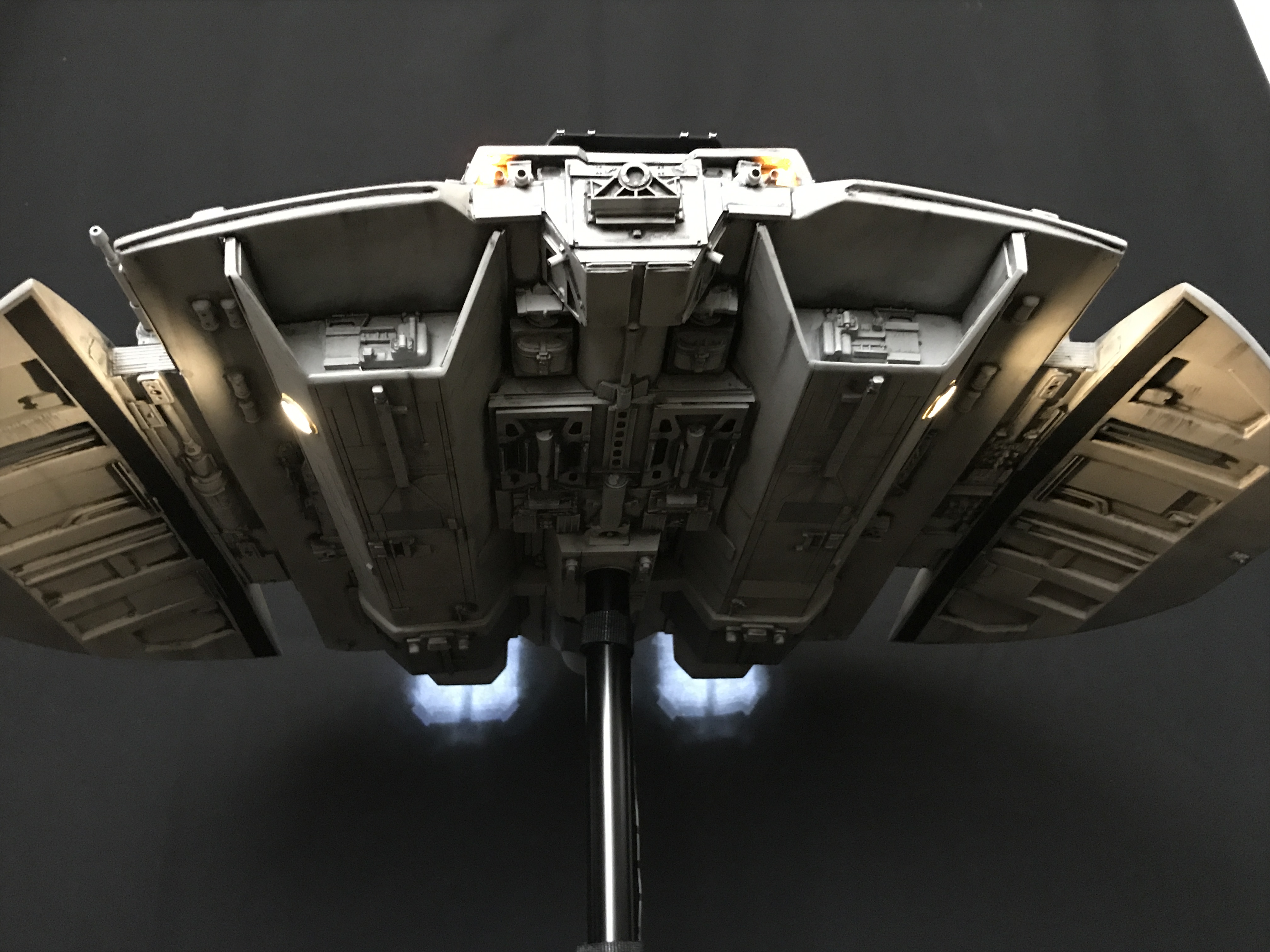 Last week we showed the first shots of the very first Salzo 1:24 Cylon Raider to be finished by Marc Elkins for the Michael Plante Collection. Today, we follow up that showing with even better photos from Michael Plante himself! This amazingly huge model is highly detailed and quite a bit larger than the studio scale Raider that has been offered in a few forms for years,… and now sold by Moebius Models. If you decide to get one of these 1:24 beasts, I understand it to be 2 feet wide! This is massive, and goes with the studio scale Vipers perfectly. Thank you Michael for sharing these photos…. and excellent work once again to artist Marc Elkins… the kit creator Mike Salzo.