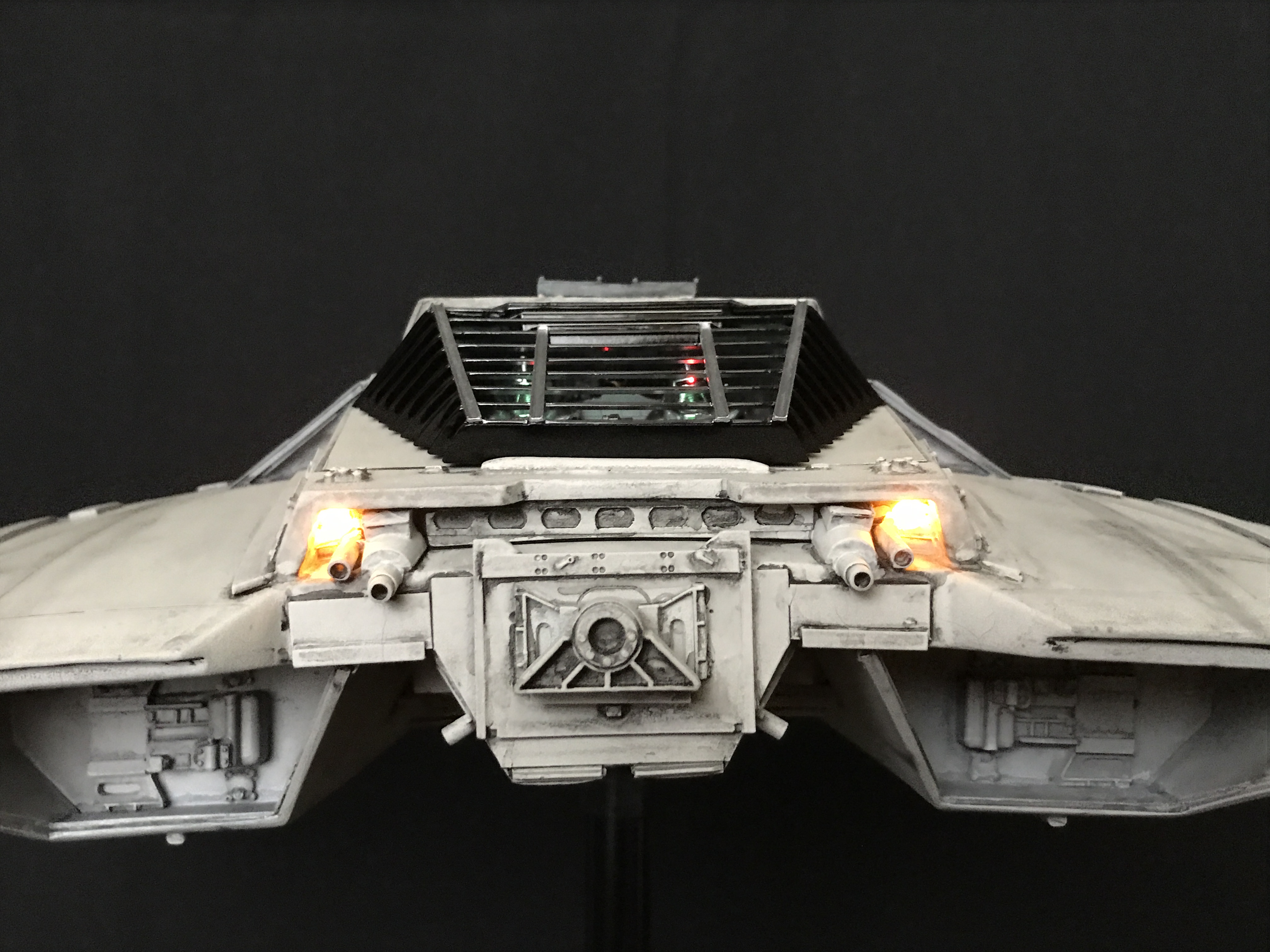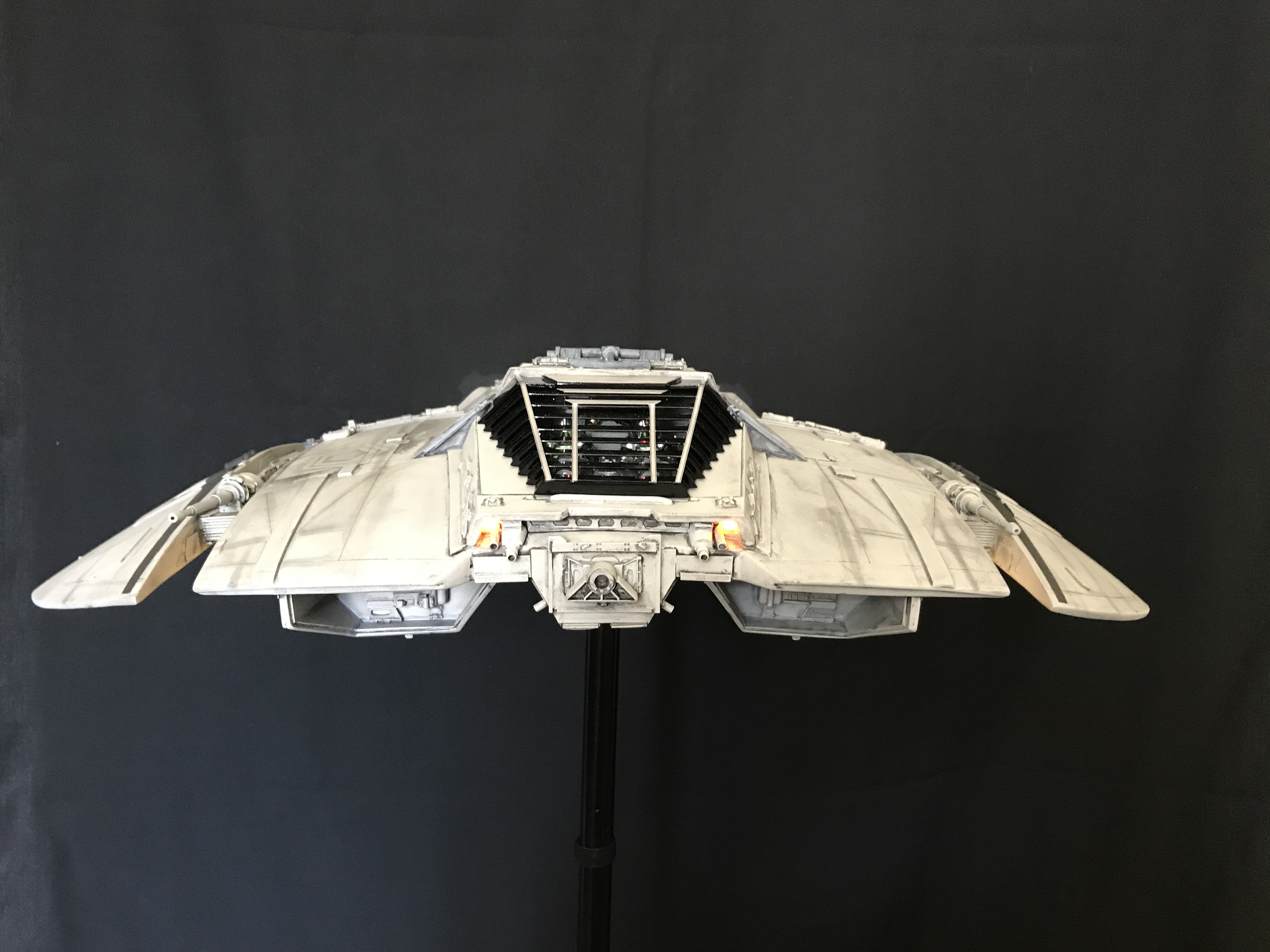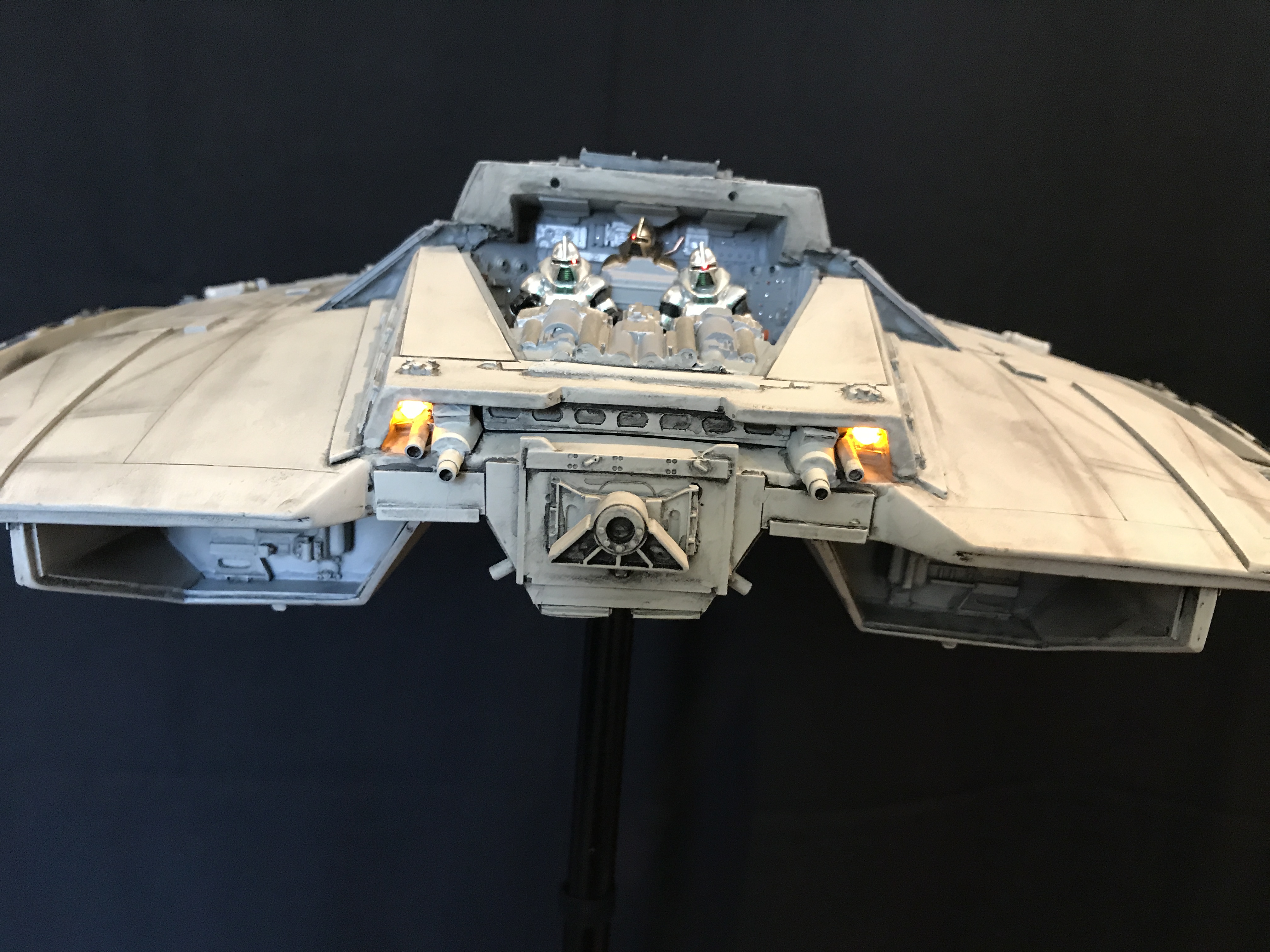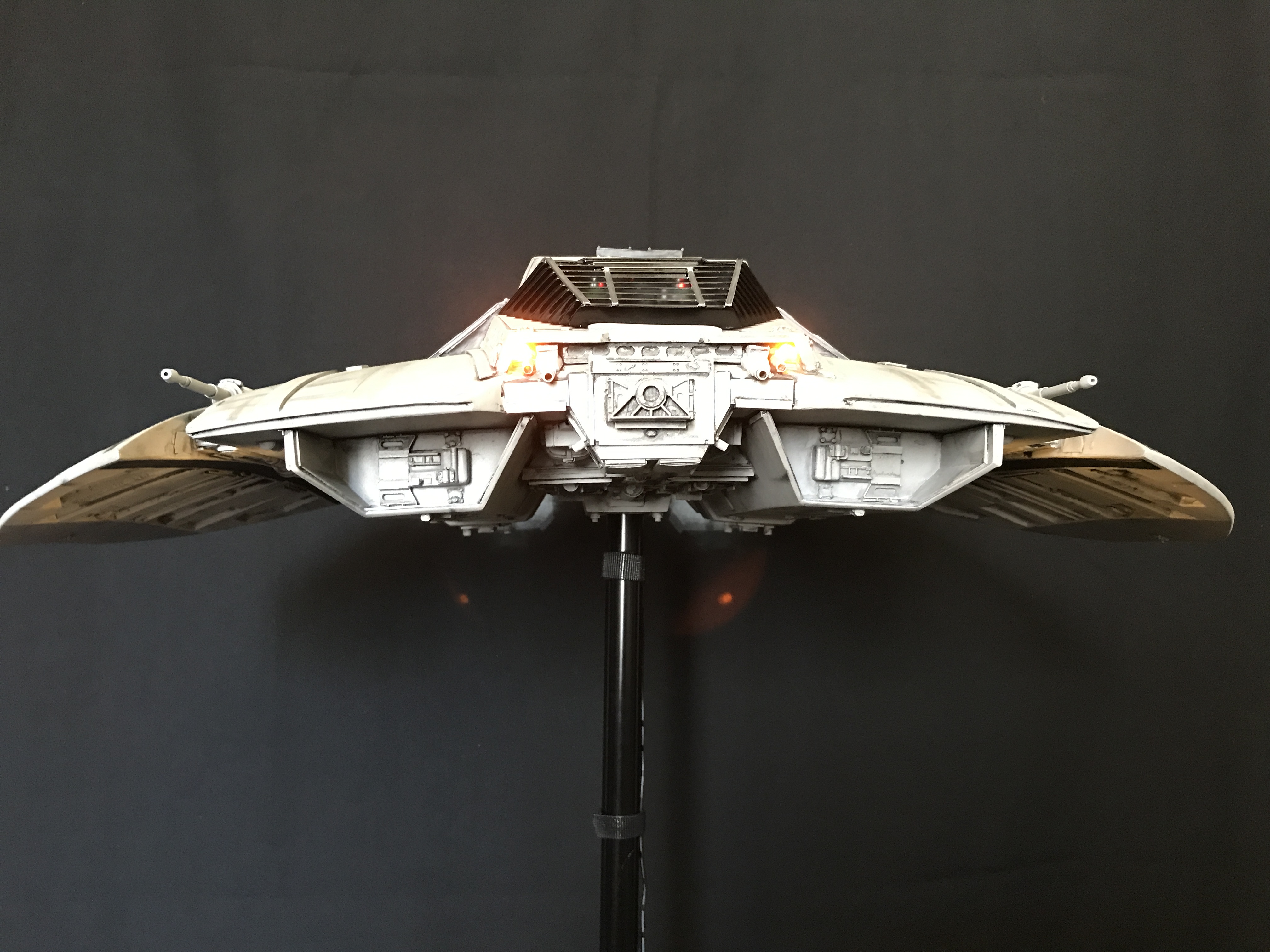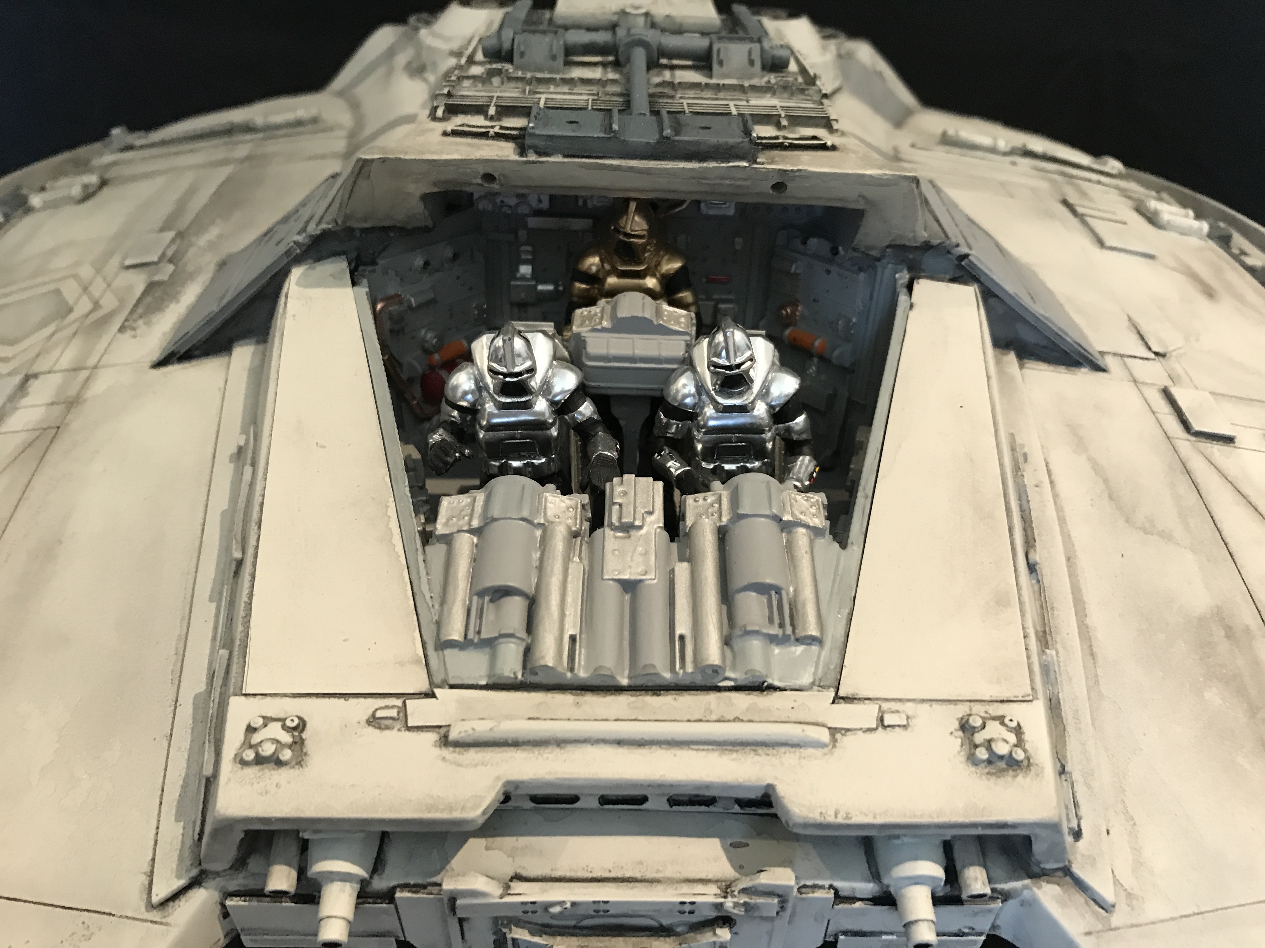 Last week we showed the first shots of the very first Salzo 1:24 Cylon Raider to be finished by Marc Elkins for the Michael Plante Collection. Today, we follow up that showing with even better photos from Michael Plante himself! This amazingly huge model is highly detailed and quite a bit larger than the studio scale Raider that has been offered in a few forms for years,… and now sold by Moebius Models. If you decide to get one of these 1:24 beasts, I understand it to be 2 feet wide! This is massive, and goes with the studio scale Vipers perfectly. Thank you Michael for sharing these photos…. and excellent work once again to artist Marc Elkins… the kit creator Mike Salzo.