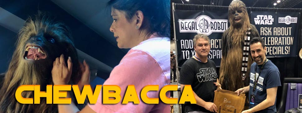 BELOW: 2019 Celebration – Mike Hawes and Tom Spina with the Regal Robot Chewbacca, and a signed Bag from Peter Mayhew