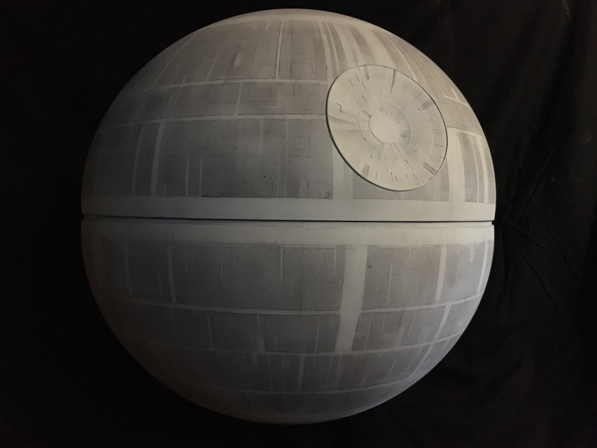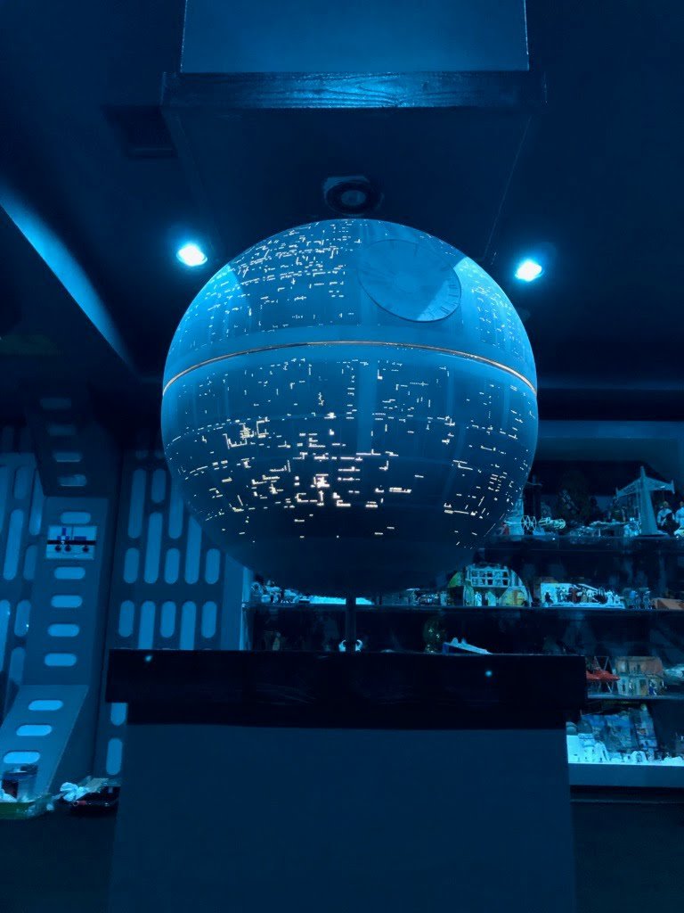 Artist Mike Salzo recently completed this amazing scratch built DEATH STAR for the Michael Hawes Collection. Shown here today are photos of the model (taken by Mike Salzo) and also the model on display (taken by Michael Hawes). I am extremely impressed with the surface details Mike placed onto this piece, not to mention the very straight drilled lighting holes. Amazing! I know that Michael Hawes is thrilled with this creation, and he is proud to display this amazing piece created by Mike Salzo.