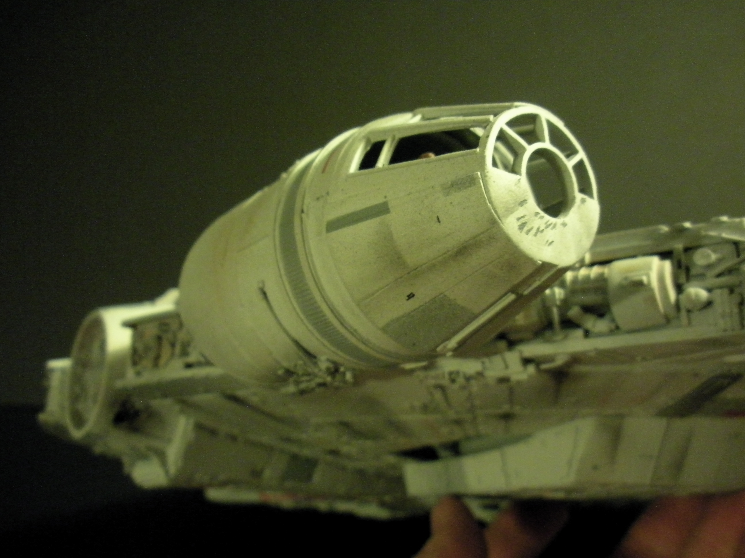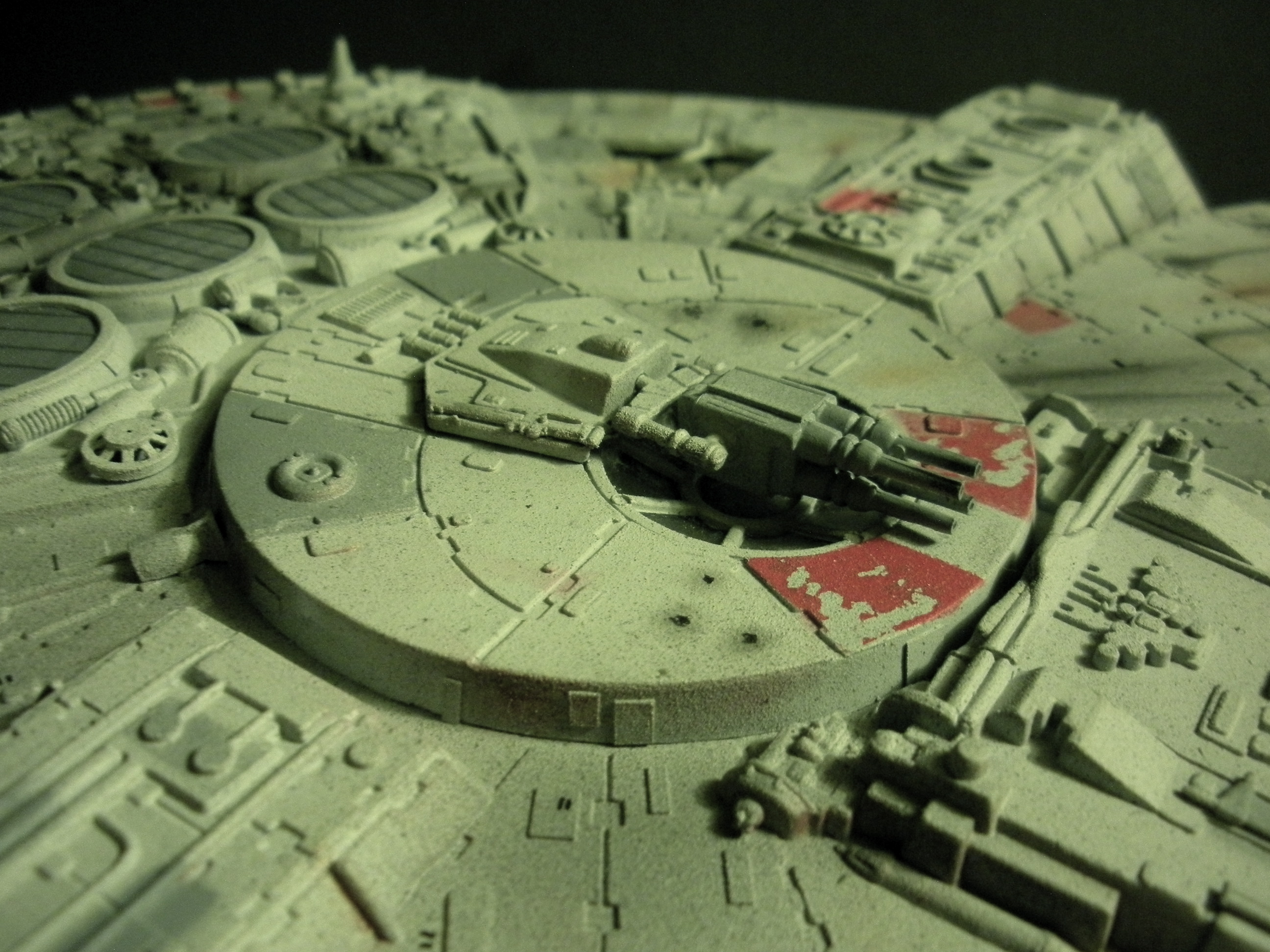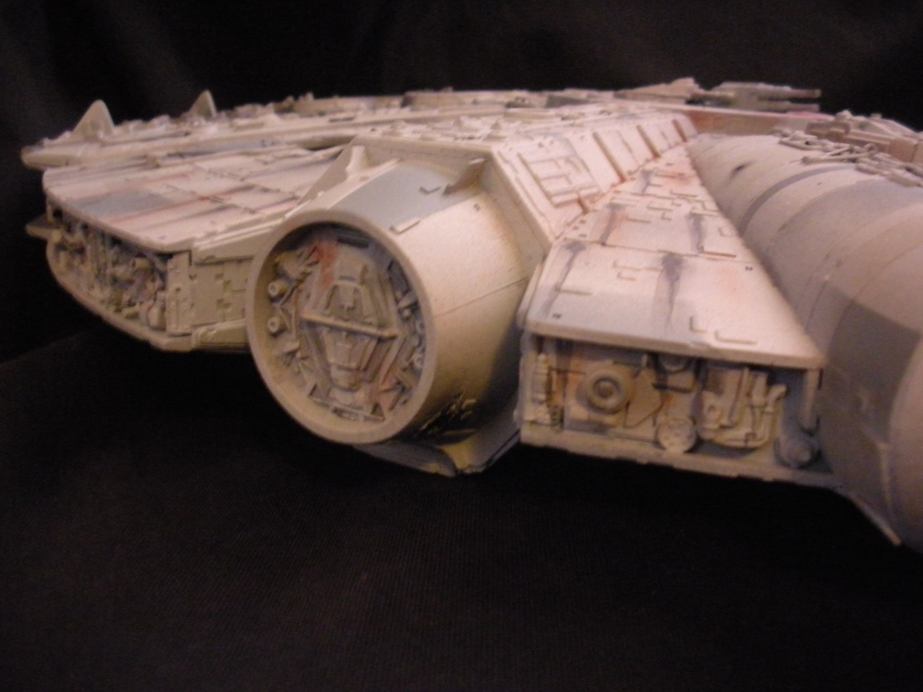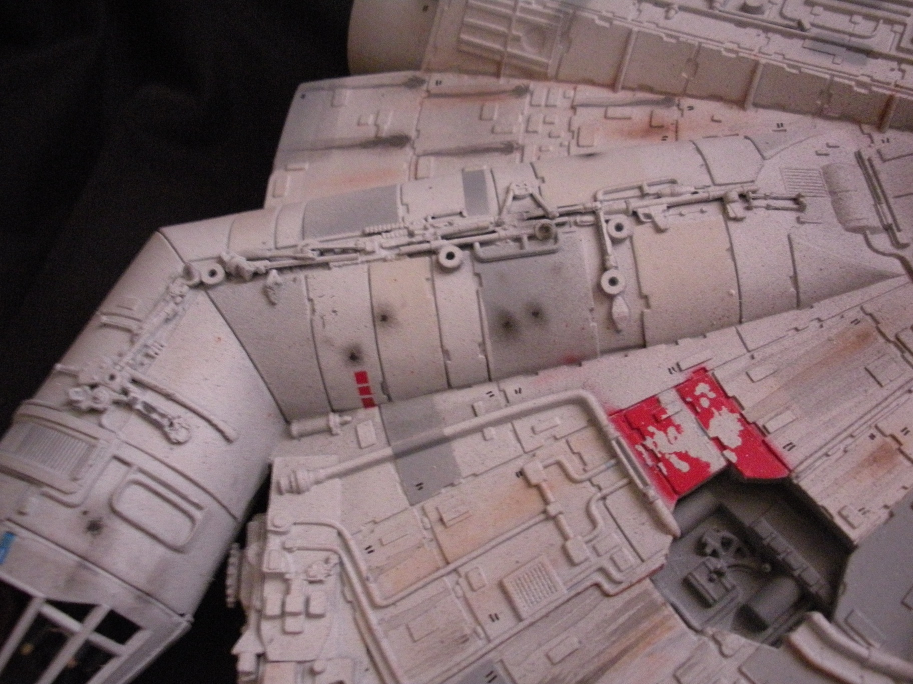 It’s an ertl kit from 2005, I built the side walls out of scratch because the original walls were too tall and not detailed that well. I was able to get the perfect size because of some full-size blueprints I have of the 3 foot model from “Empire Strikes Back”. Then I purchased a 1:76 tank kit, Tamiya and Academy gun sets, two Enzo Ferrari kits and was given a bunch of leftovers from bi-plane kits that a friend of mine had. To add the damage to the hull, I simply used a heavy duty solder gun, waited until it was red hot and then carefully scarred the model in the right places. For the paint job I simply airbushed it a dark engine grey first as a primer. Then I tried the Tamiya light grey spray paint and it was to dark for light grey, so I airbrushed it again with a Testors Acryl light grey which ended up being the color I wanted. I then went about and added some distressing and colored the panels various shades of grey. For the main areas of distress I used pigment powders to simulate the damage and rust in the areas of the ship. The greasy streaks were applied with a mix of watered down paint and then the Acryl paint built up layers. I have photos of the actual Falcon model from ‘Empire’ including my ILM book from the ’80’s which has great photos of the falcon model, that assisted me greatly in the paint job for the model. The figures in the cockpit are from a Moebius Voyager kit, I built that for my dad and I thought I lost the figures and then found them and used them. The last touch was adding a matte finish to lock in the pigment powders and seal up the paint job and little. Since it has that finish I have to pick it up with nitrile gloves so I don’t dirty up the model and rub the paint job off because it’s a thin coat of paint all over the ship. Very much like the paint job on a studio model.