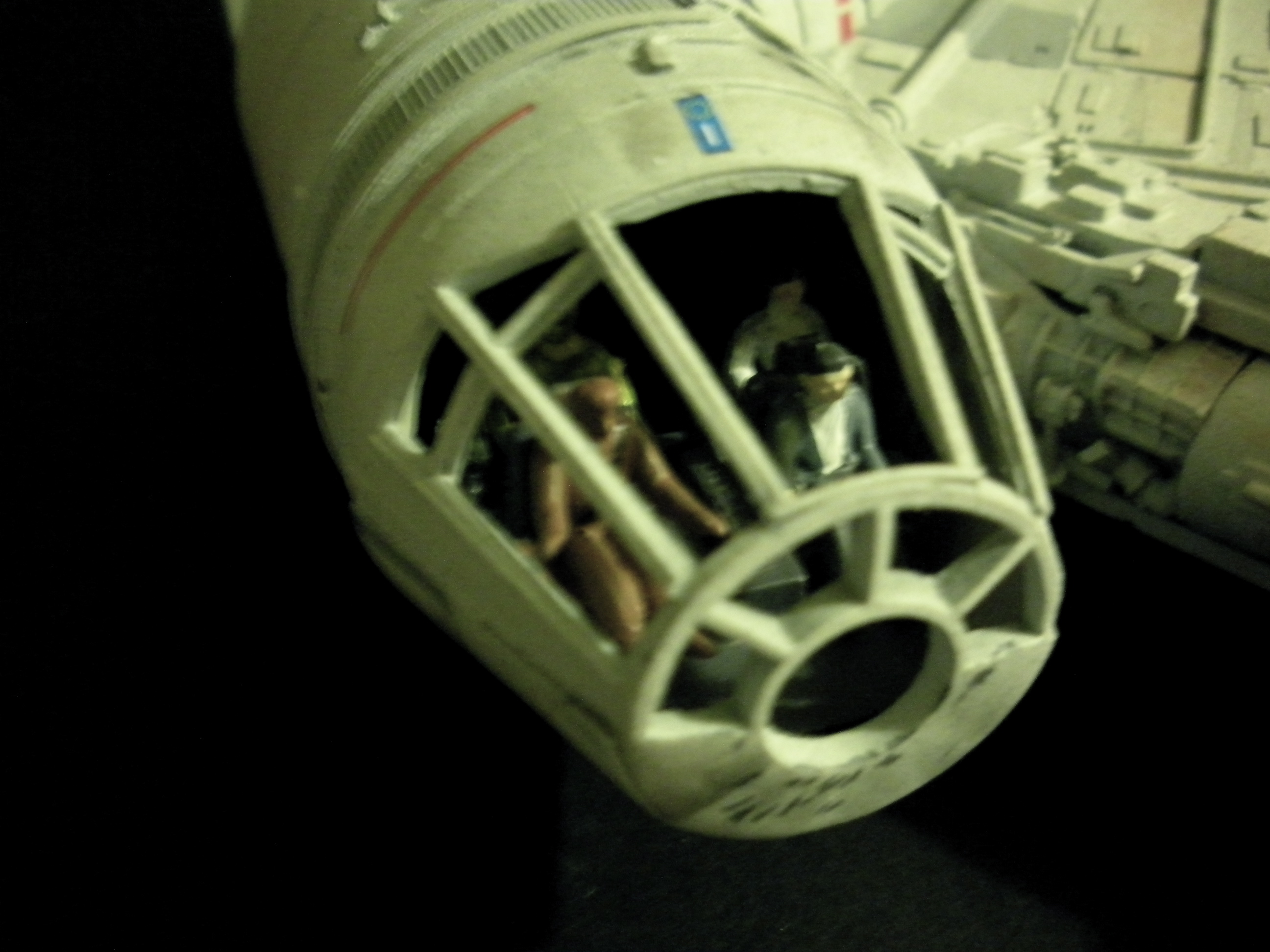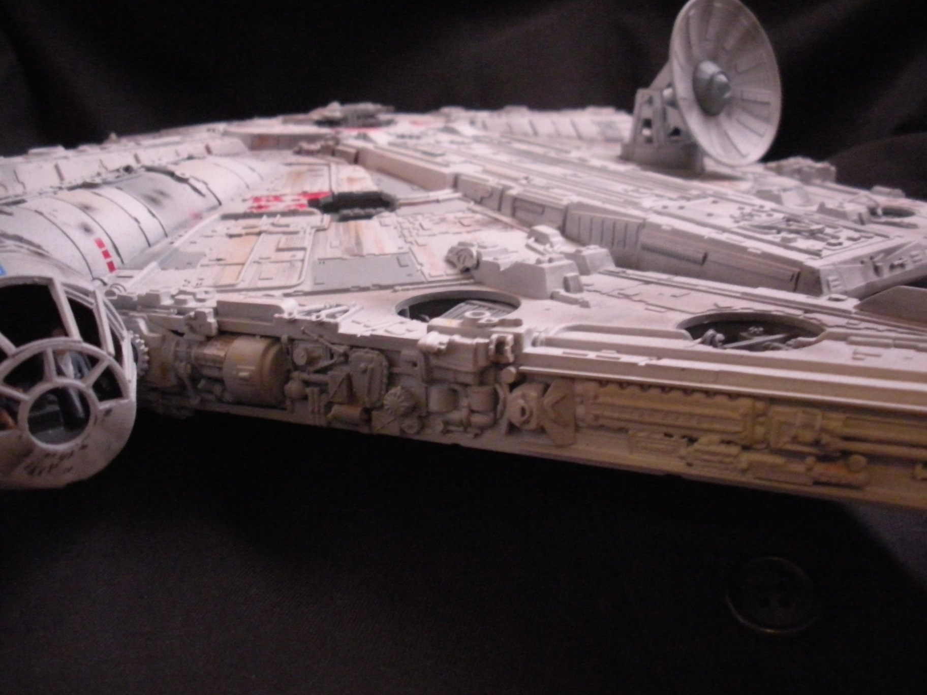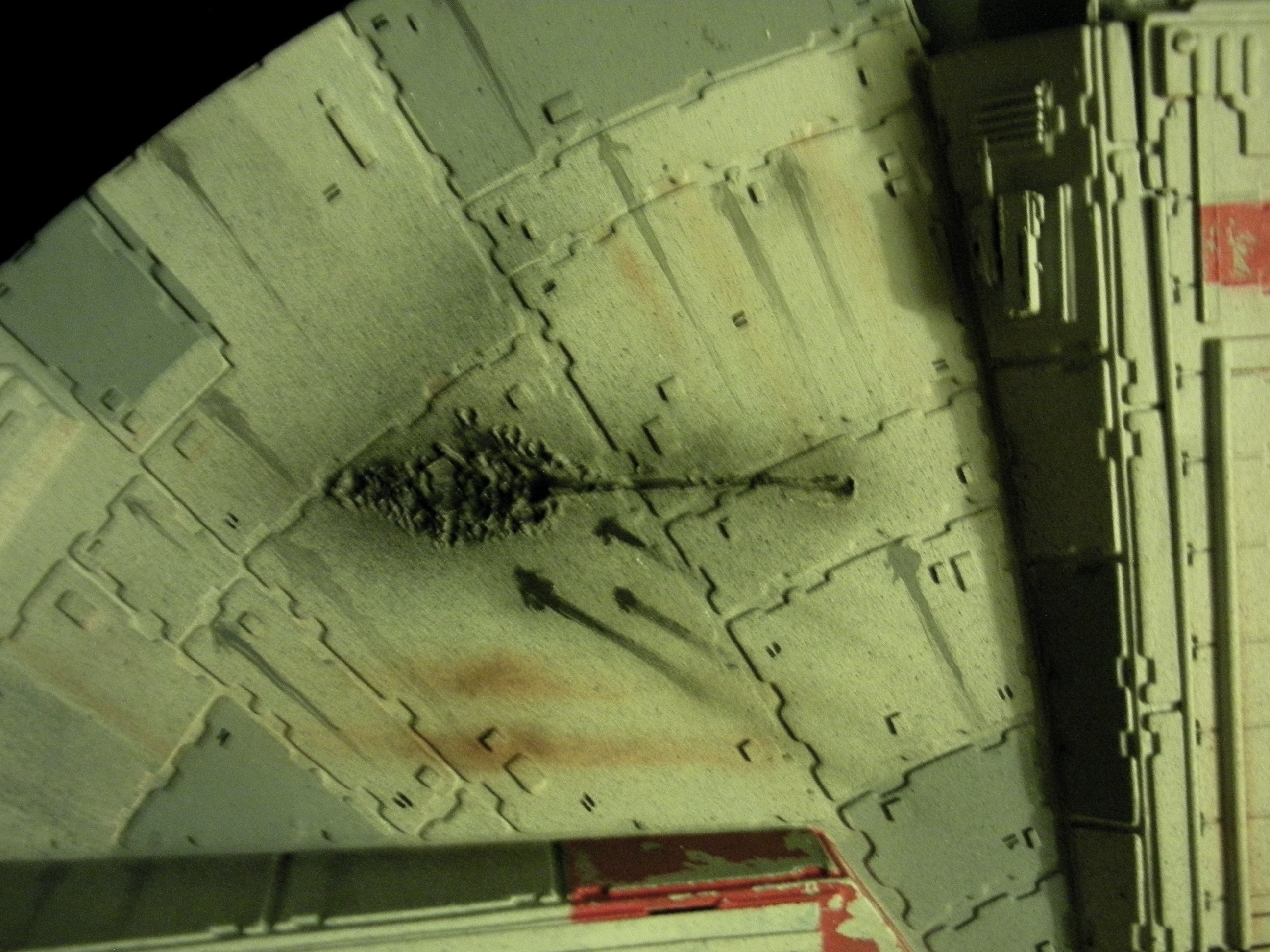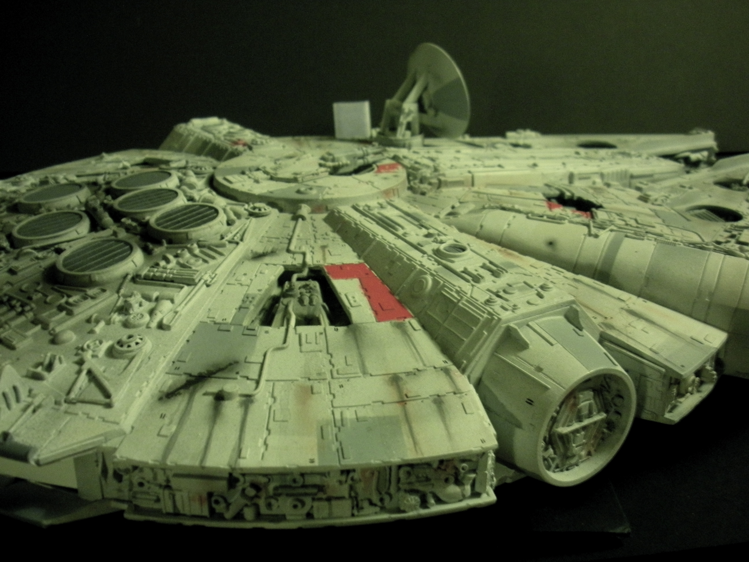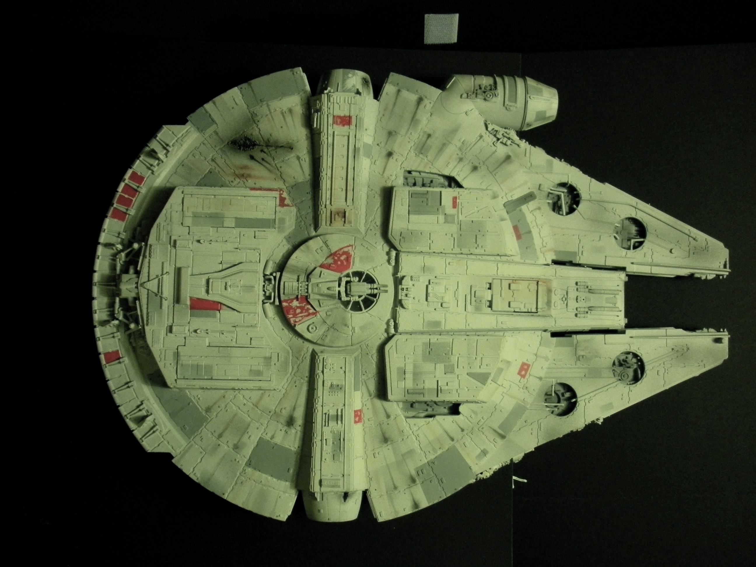 It’s an ertl kit from 2005, I built the side walls out of scratch because the original walls were too tall and not detailed that well. I was able to get the perfect size because of some full-size blueprints I have of the 3 foot model from “Empire Strikes Back”. Then I purchased a 1:76 tank kit, Tamiya and Academy gun sets, two Enzo Ferrari kits and was given a bunch of leftovers from bi-plane kits that a friend of mine had. To add the damage to the hull, I simply used a heavy duty solder gun, waited until it was red hot and then carefully scarred the model in the right places. For the paint job I simply airbushed it a dark engine grey first as a primer. Then I tried the Tamiya light grey spray paint and it was to dark for light grey, so I airbrushed it again with a Testors Acryl light grey which ended up being the color I wanted. I then went about and added some distressing and colored the panels various shades of grey. For the main areas of distress I used pigment powders to simulate the damage and rust in the areas of the ship. The greasy streaks were applied with a mix of watered down paint and then the Acryl paint built up layers. I have photos of the actual Falcon model from ‘Empire’ including my ILM book from the ’80’s which has great photos of the falcon model, that assisted me greatly in the paint job for the model. The figures in the cockpit are from a Moebius Voyager kit, I built that for my dad and I thought I lost the figures and then found them and used them. The last touch was adding a matte finish to lock in the pigment powders and seal up the paint job and little. Since it has that finish I have to pick it up with nitrile gloves so I don’t dirty up the model and rub the paint job off because it’s a thin coat of paint all over the ship. Very much like the paint job on a studio model.