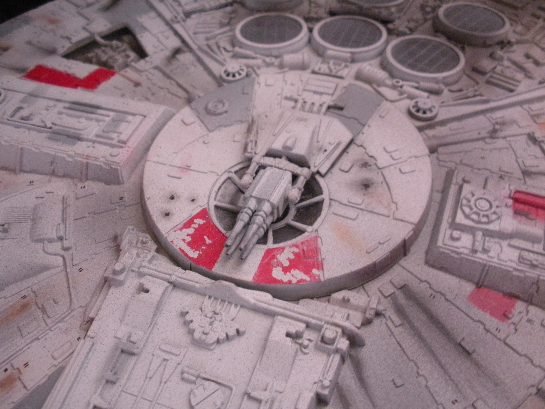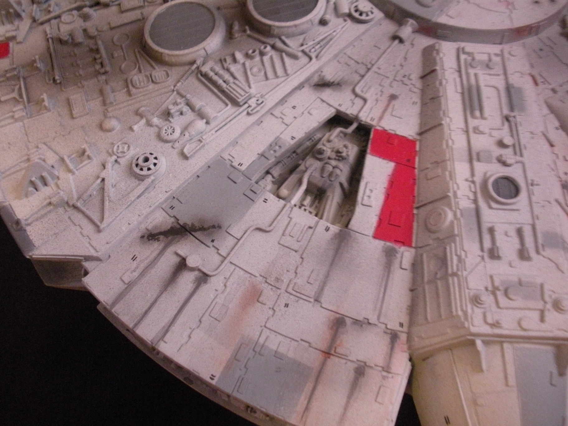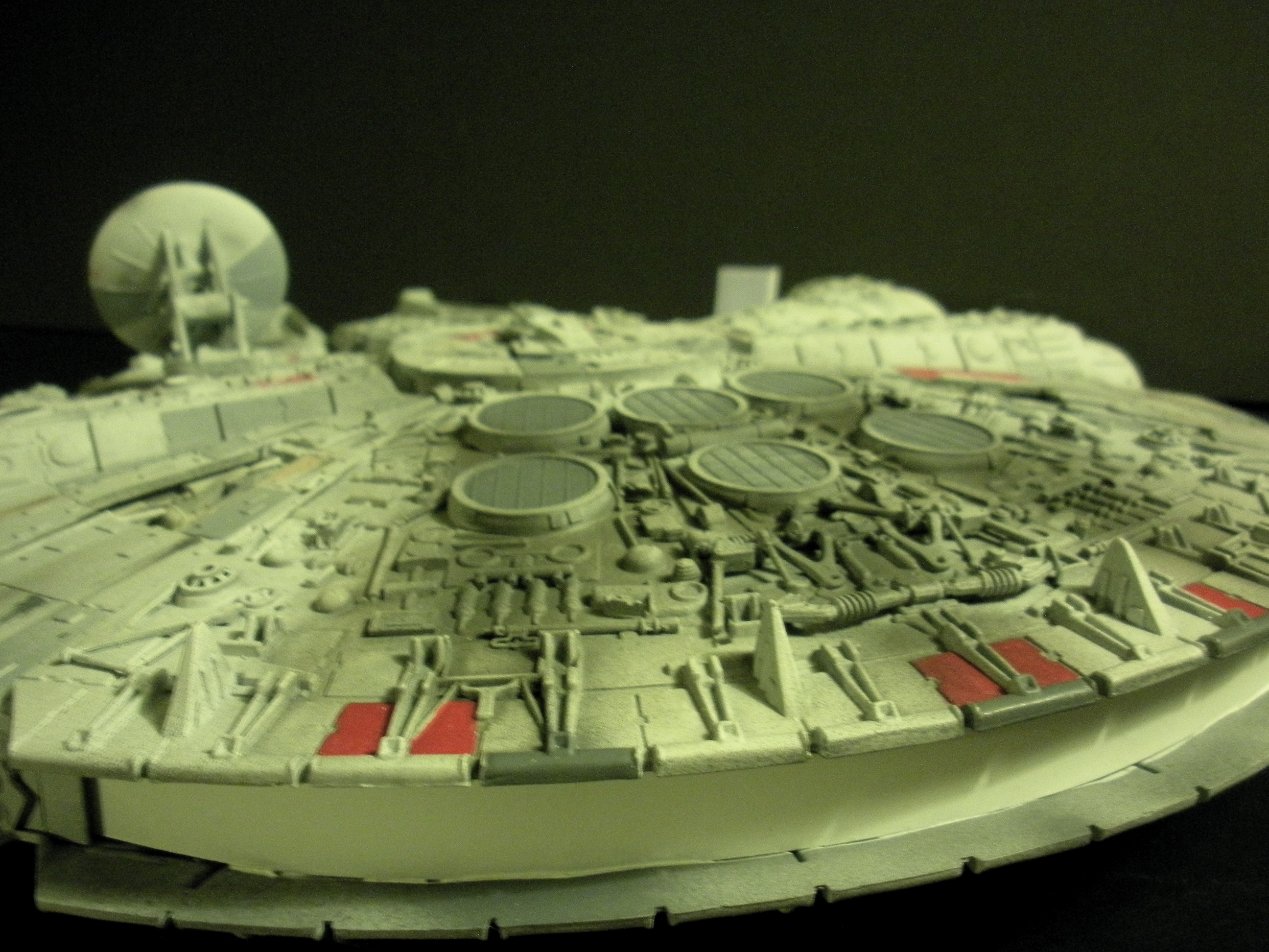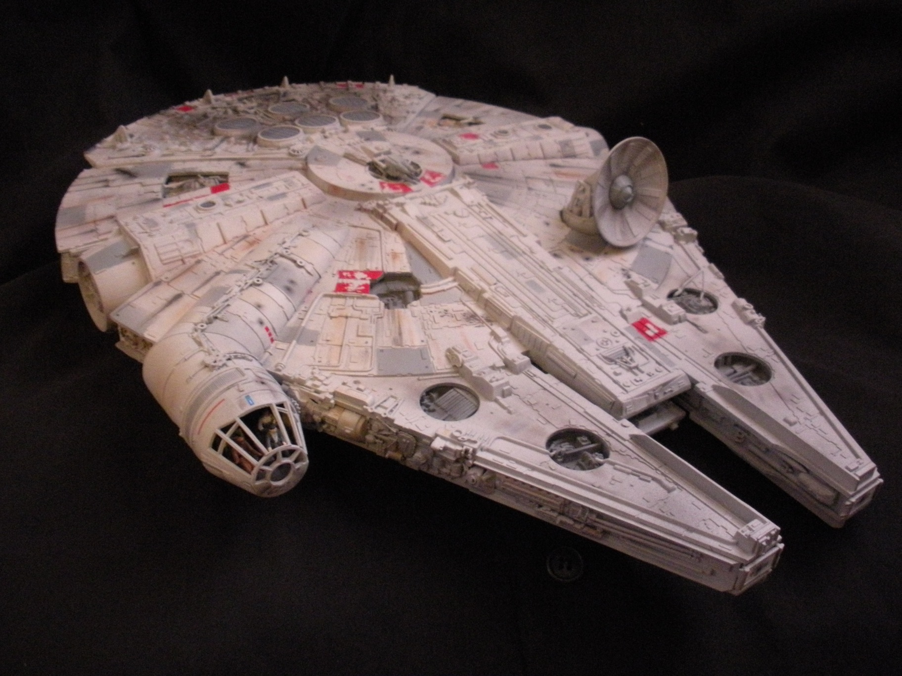 It’s an ertl kit from 2005, I built the side walls out of scratch because the original walls were too tall and not detailed that well. I was able to get the perfect size because of some full-size blueprints I have of the 3 foot model from “Empire Strikes Back”. Then I purchased a 1:76 tank kit, Tamiya and Academy gun sets, two Enzo Ferrari kits and was given a bunch of leftovers from bi-plane kits that a friend of mine had. To add the damage to the hull, I simply used a heavy duty solder gun, waited until it was red hot and then carefully scarred the model in the right places. For the paint job I simply airbushed it a dark engine grey first as a primer. Then I tried the Tamiya light grey spray paint and it was to dark for light grey, so I airbrushed it again with a Testors Acryl light grey which ended up being the color I wanted. I then went about and added some distressing and colored the panels various shades of grey. For the main areas of distress I used pigment powders to simulate the damage and rust in the areas of the ship. The greasy streaks were applied with a mix of watered down paint and then the Acryl paint built up layers. I have photos of the actual Falcon model from ‘Empire’ including my ILM book from the ’80’s which has great photos of the falcon model, that assisted me greatly in the paint job for the model. The figures in the cockpit are from a Moebius Voyager kit, I built that for my dad and I thought I lost the figures and then found them and used them. The last touch was adding a matte finish to lock in the pigment powders and seal up the paint job and little. Since it has that finish I have to pick it up with nitrile gloves so I don’t dirty up the model and rub the paint job off because it’s a thin coat of paint all over the ship. Very much like the paint job on a studio model.