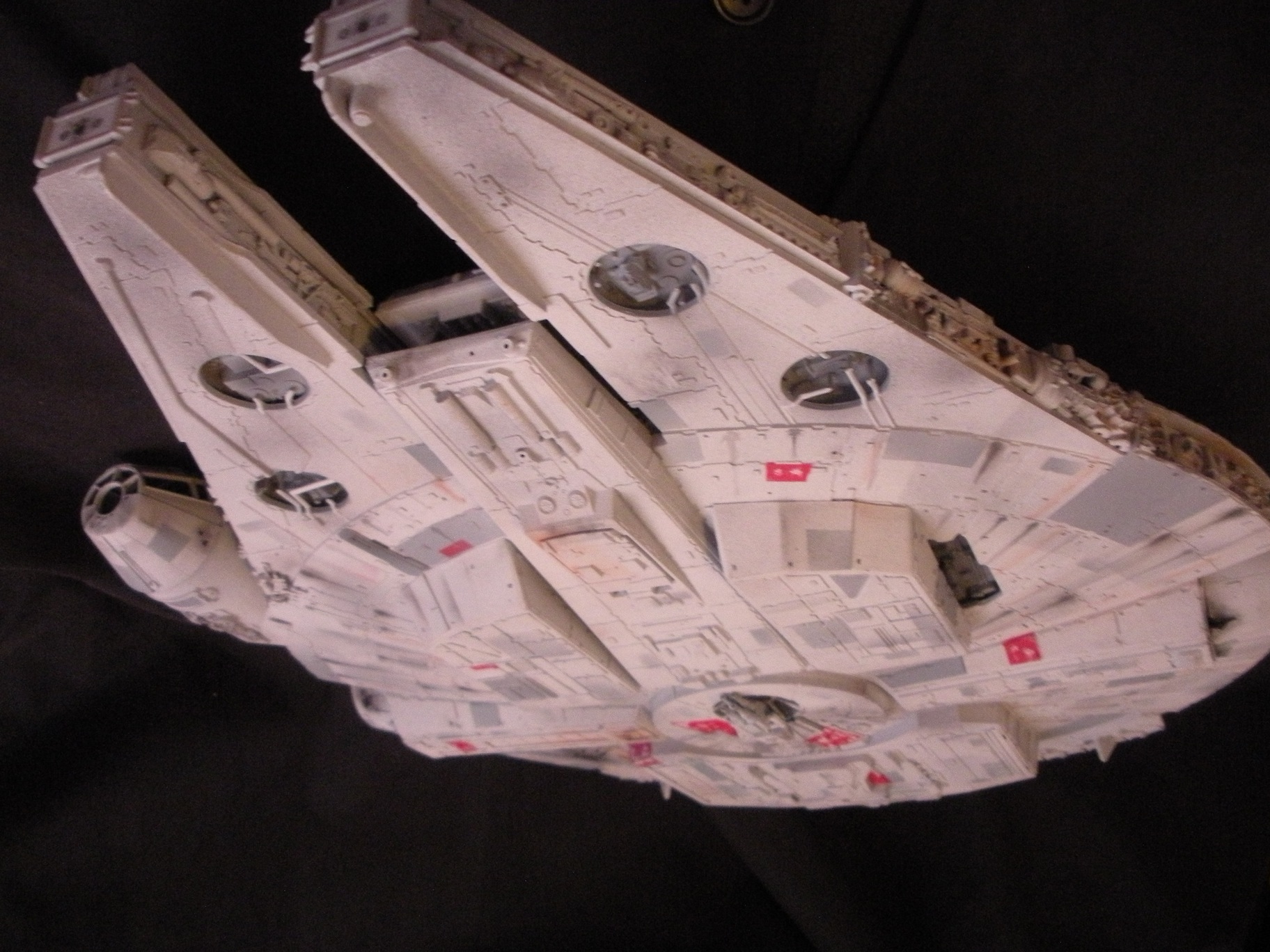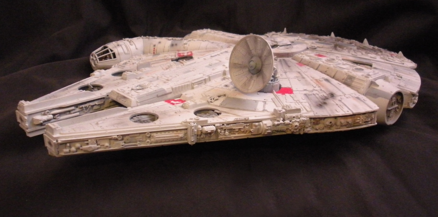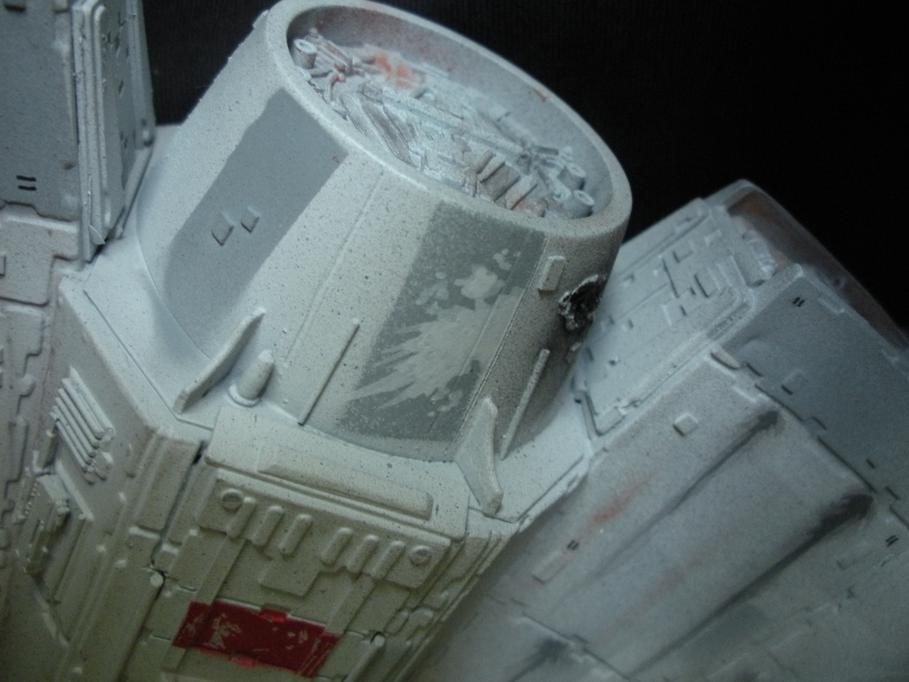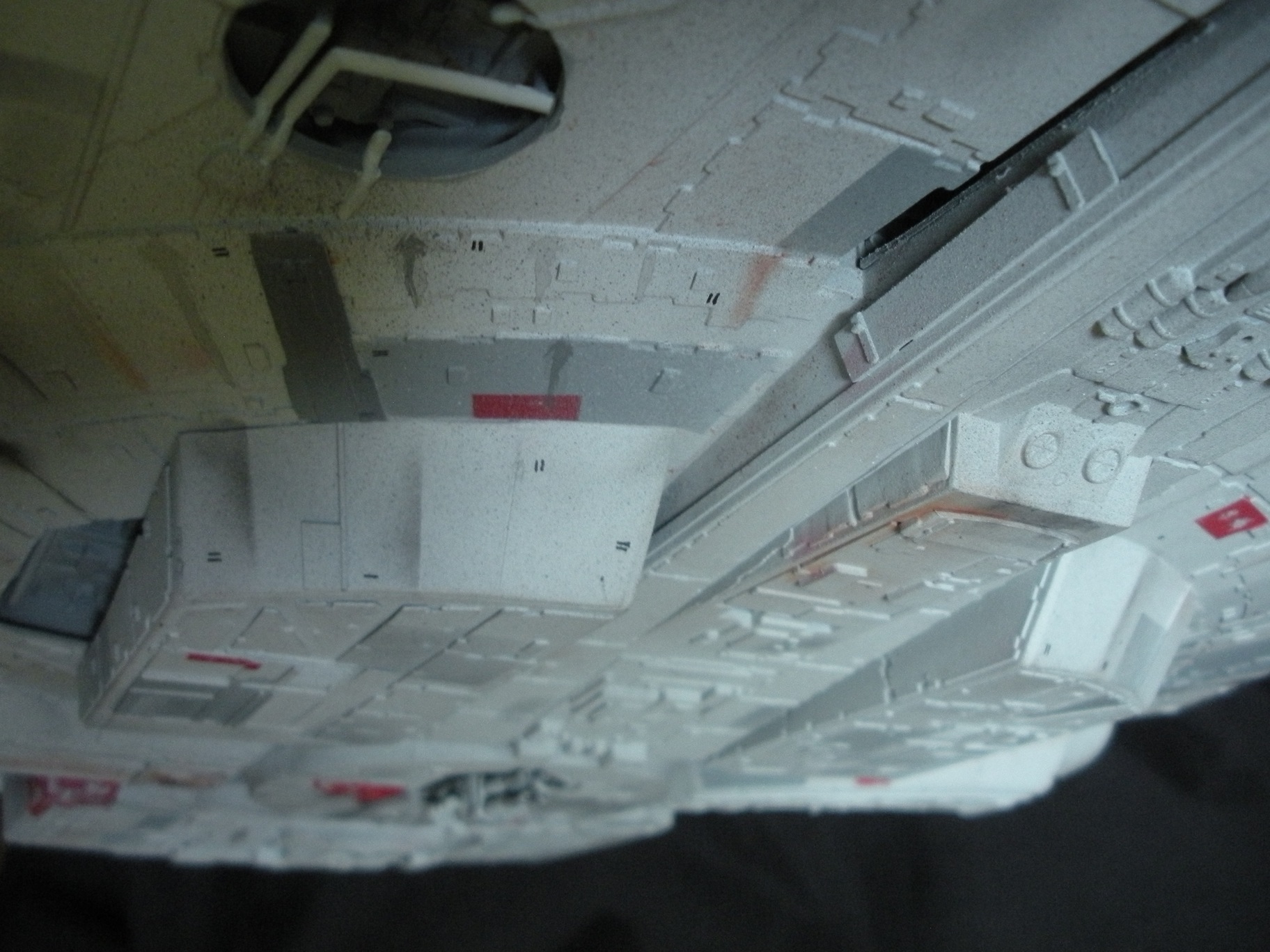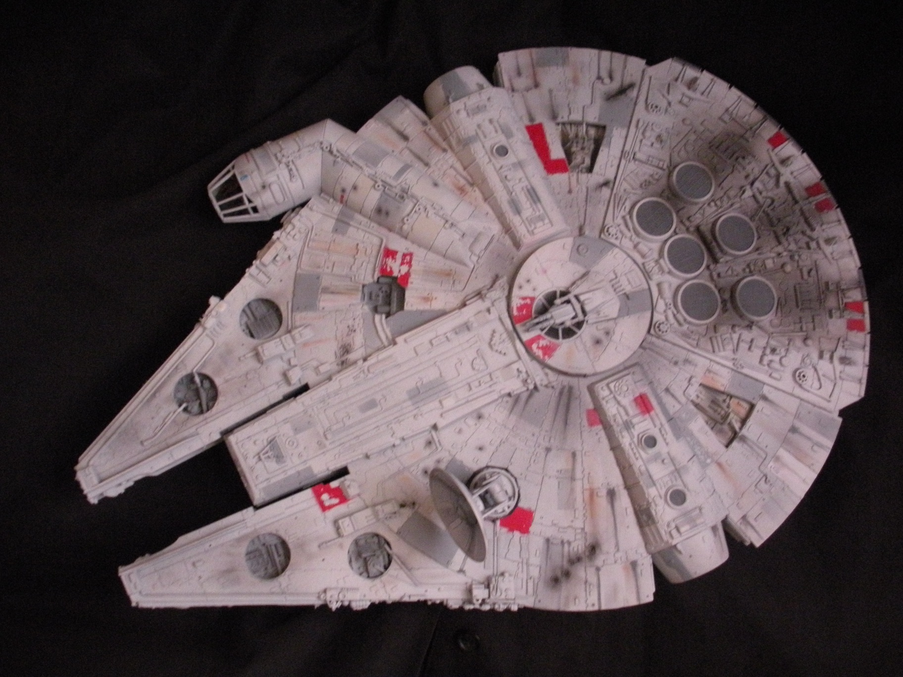 It’s an ertl kit from 2005, I built the side walls out of scratch because the original walls were too tall and not detailed that well. I was able to get the perfect size because of some full-size blueprints I have of the 3 foot model from “Empire Strikes Back”. Then I purchased a 1:76 tank kit, Tamiya and Academy gun sets, two Enzo Ferrari kits and was given a bunch of leftovers from bi-plane kits that a friend of mine had. To add the damage to the hull, I simply used a heavy duty solder gun, waited until it was red hot and then carefully scarred the model in the right places. For the paint job I simply airbushed it a dark engine grey first as a primer. Then I tried the Tamiya light grey spray paint and it was to dark for light grey, so I airbrushed it again with a Testors Acryl light grey which ended up being the color I wanted. I then went about and added some distressing and colored the panels various shades of grey. For the main areas of distress I used pigment powders to simulate the damage and rust in the areas of the ship. The greasy streaks were applied with a mix of watered down paint and then the Acryl paint built up layers. I have photos of the actual Falcon model from ‘Empire’ including my ILM book from the ’80’s which has great photos of the falcon model, that assisted me greatly in the paint job for the model. The figures in the cockpit are from a Moebius Voyager kit, I built that for my dad and I thought I lost the figures and then found them and used them. The last touch was adding a matte finish to lock in the pigment powders and seal up the paint job and little. Since it has that finish I have to pick it up with nitrile gloves so I don’t dirty up the model and rub the paint job off because it’s a thin coat of paint all over the ship. Very much like the paint job on a studio model.