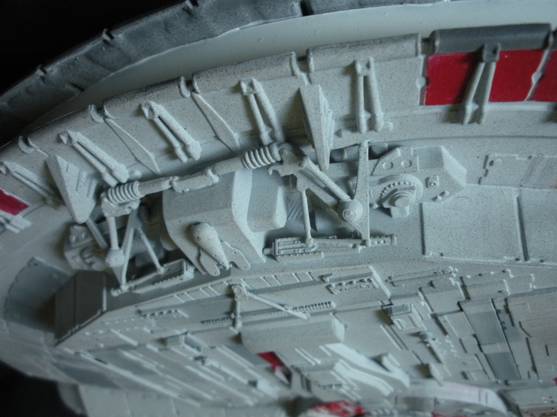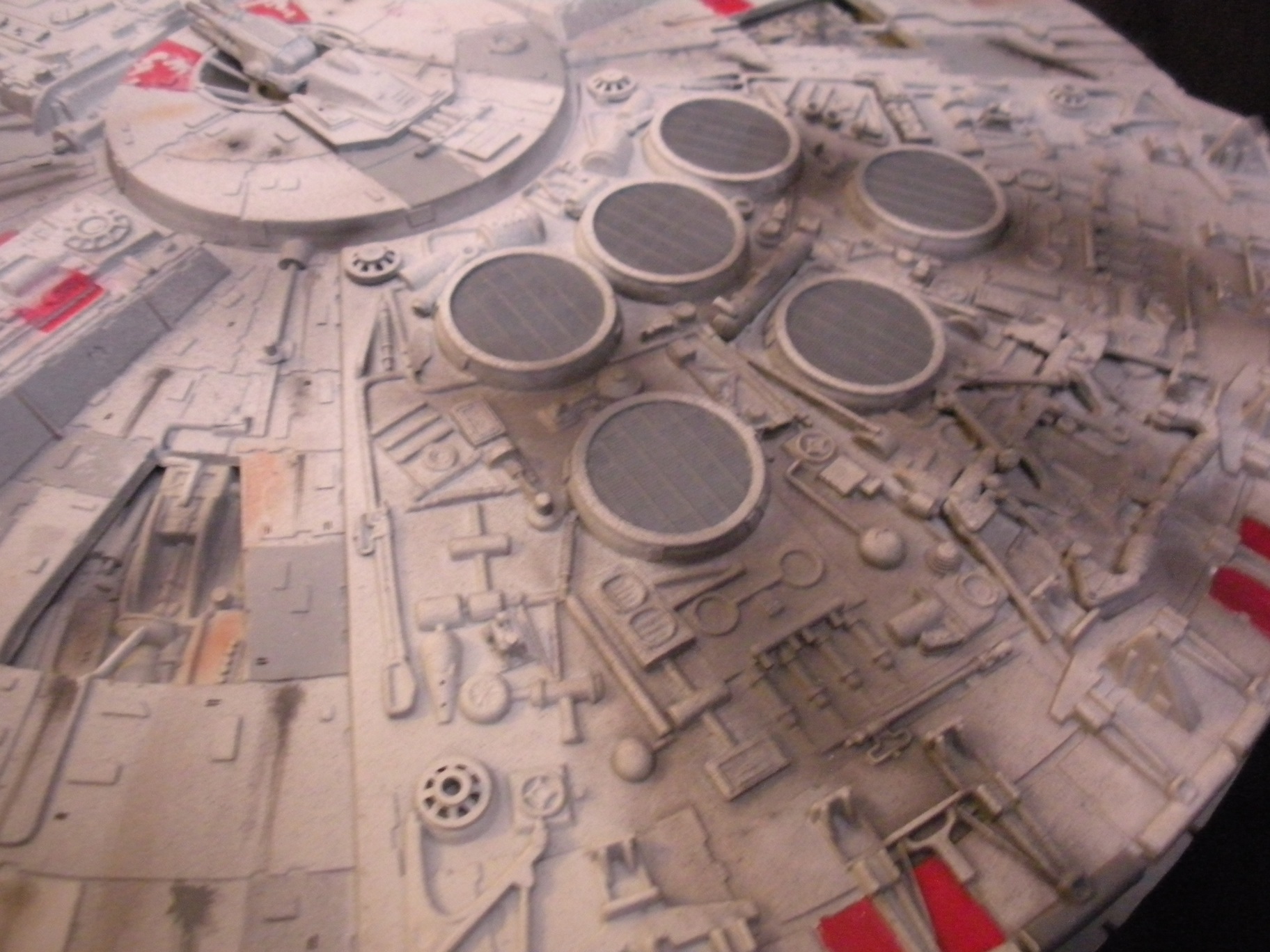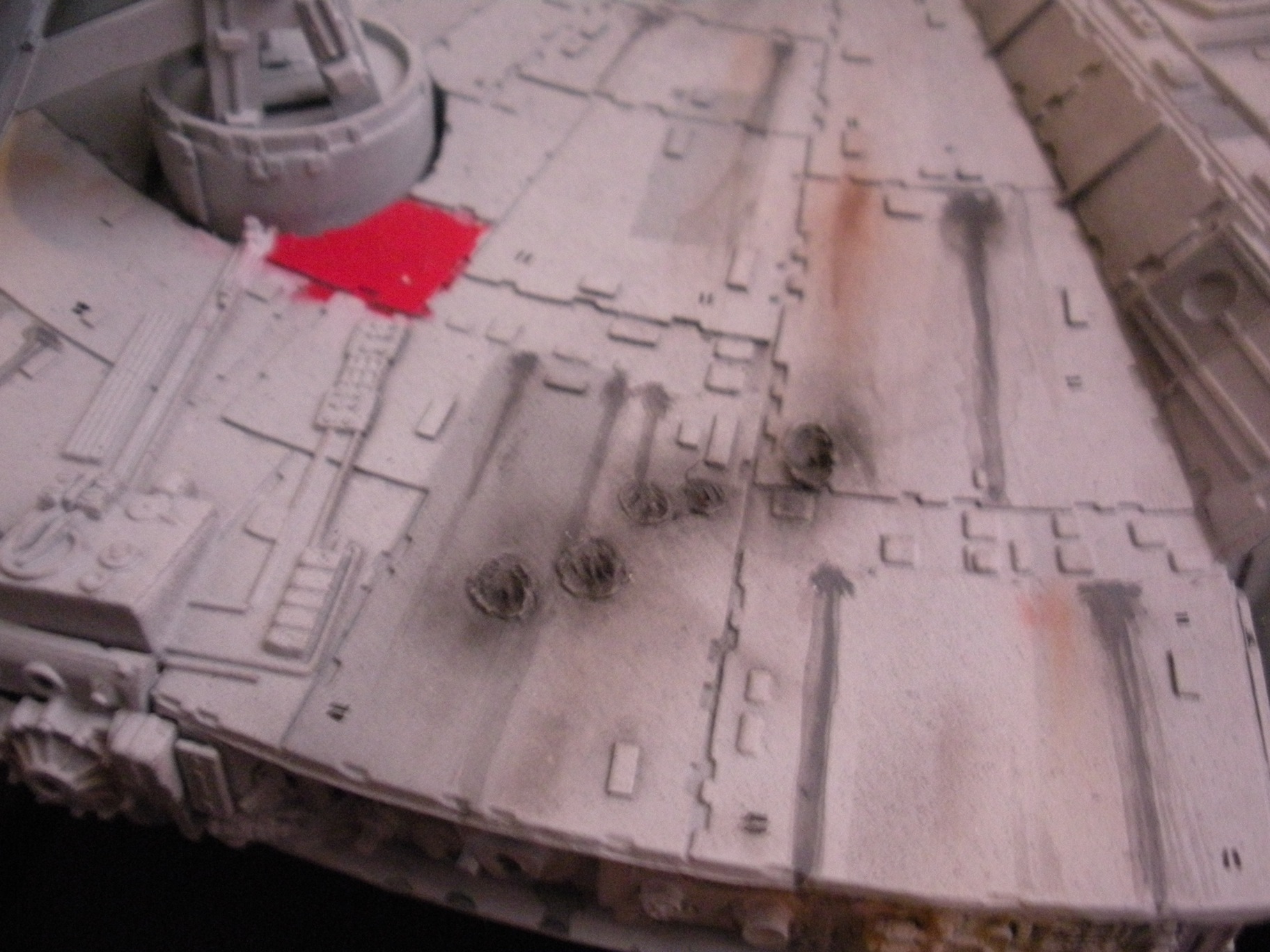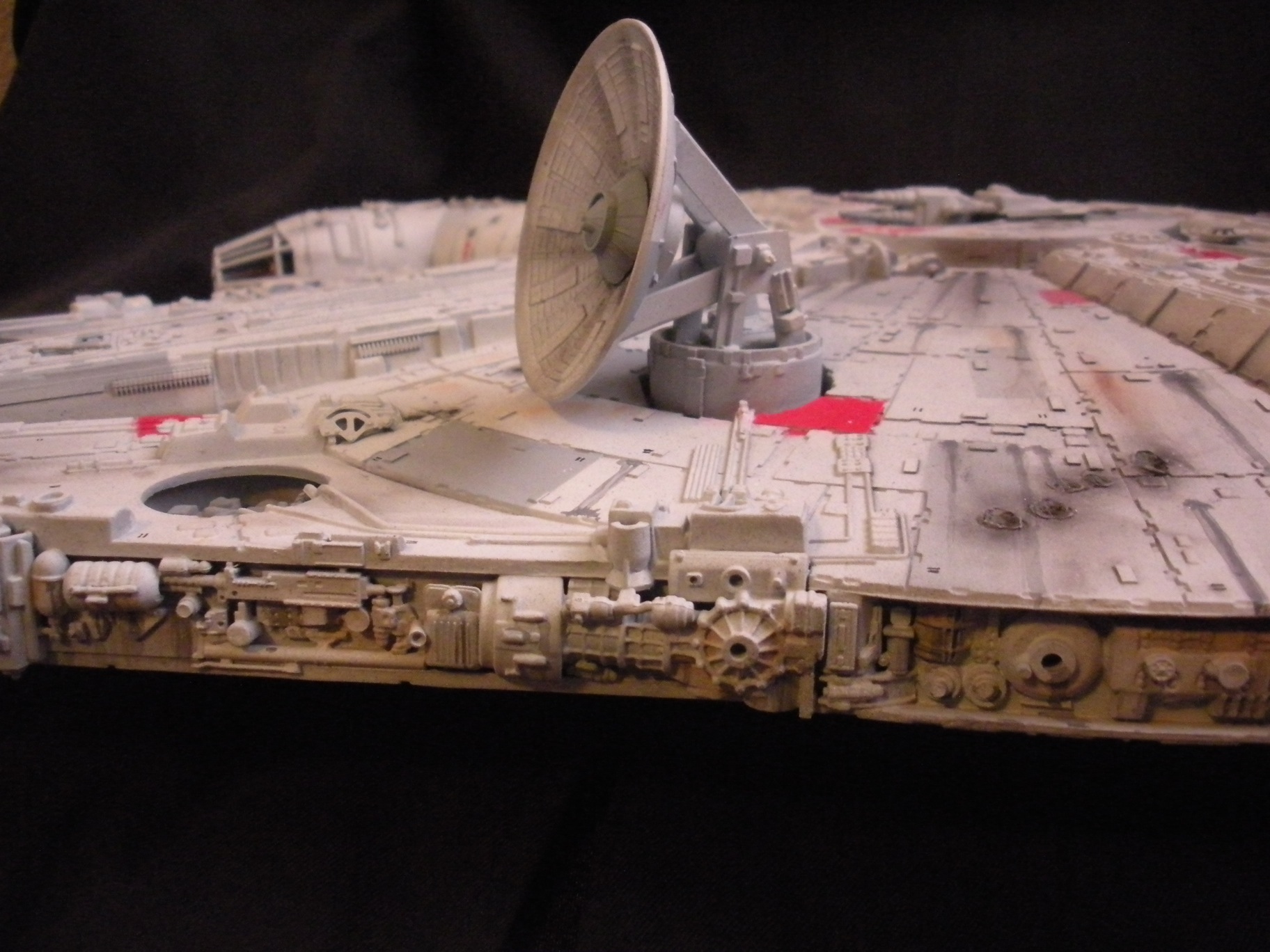 It’s an ertl kit from 2005, I built the side walls out of scratch because the original walls were too tall and not detailed that well. I was able to get the perfect size because of some full-size blueprints I have of the 3 foot model from “Empire Strikes Back”. Then I purchased a 1:76 tank kit, Tamiya and Academy gun sets, two Enzo Ferrari kits and was given a bunch of leftovers from bi-plane kits that a friend of mine had. To add the damage to the hull, I simply used a heavy duty solder gun, waited until it was red hot and then carefully scarred the model in the right places. For the paint job I simply airbushed it a dark engine grey first as a primer. Then I tried the Tamiya light grey spray paint and it was to dark for light grey, so I airbrushed it again with a Testors Acryl light grey which ended up being the color I wanted. I then went about and added some distressing and colored the panels various shades of grey. For the main areas of distress I used pigment powders to simulate the damage and rust in the areas of the ship. The greasy streaks were applied with a mix of watered down paint and then the Acryl paint built up layers. I have photos of the actual Falcon model from ‘Empire’ including my ILM book from the ’80’s which has great photos of the falcon model, that assisted me greatly in the paint job for the model. The figures in the cockpit are from a Moebius Voyager kit, I built that for my dad and I thought I lost the figures and then found them and used them. The last touch was adding a matte finish to lock in the pigment powders and seal up the paint job and little. Since it has that finish I have to pick it up with nitrile gloves so I don’t dirty up the model and rub the paint job off because it’s a thin coat of paint all over the ship. Very much like the paint job on a studio model.