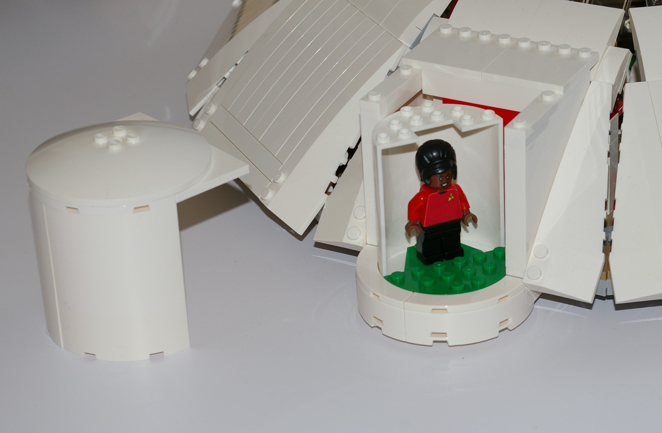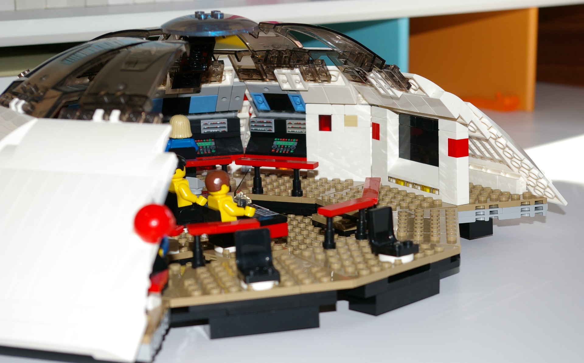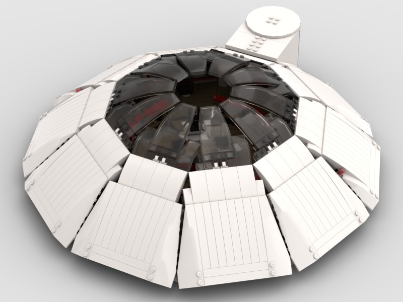 The goal for this build was to design a Minifig-scale bridge model that would be accurate to both the stage set (which was asymmetrical) and the filming model (the big one at the Smithsonian). That model is 3.4m long, making it 1:85 scale for a 289m starship. My model, at 1:39 scale, is considerably bigger—the saucer section alone would be 3.1m in diameter! A section of the outer hull and starboard-side consoles is removable to view the interior. These are the areas that would have been typically removed for filming on the stage set, which was built in modular sections on wheels. That way any section could be pulled out for the camera and crew, then replaced for reverse shots, giving the illusion of a fully-enclosed set. (Later sets didn’t have to accommodate such large cameras!) The asymmetry was put in at a late stage, so that the Captain would not have to turn completely around to see who was exiting the turbolift. Unfortunately this wasn’t communicated to the model builders, who kept the turboshaft along the ship’s centreline. I am using Franz Joseph’s solution, turning the bridge interior 36º to port. The turbolift doors are fixed but the hull is removable to access the turbolift car. Finally, I have made the overhead dome transparent, although this area is usually marked as the “stellar sensor array,” matching the planetary sensor array on the saucer bottom. We never see the ceiling of the bridge in the series, as it was open to the soundstage for lighting.