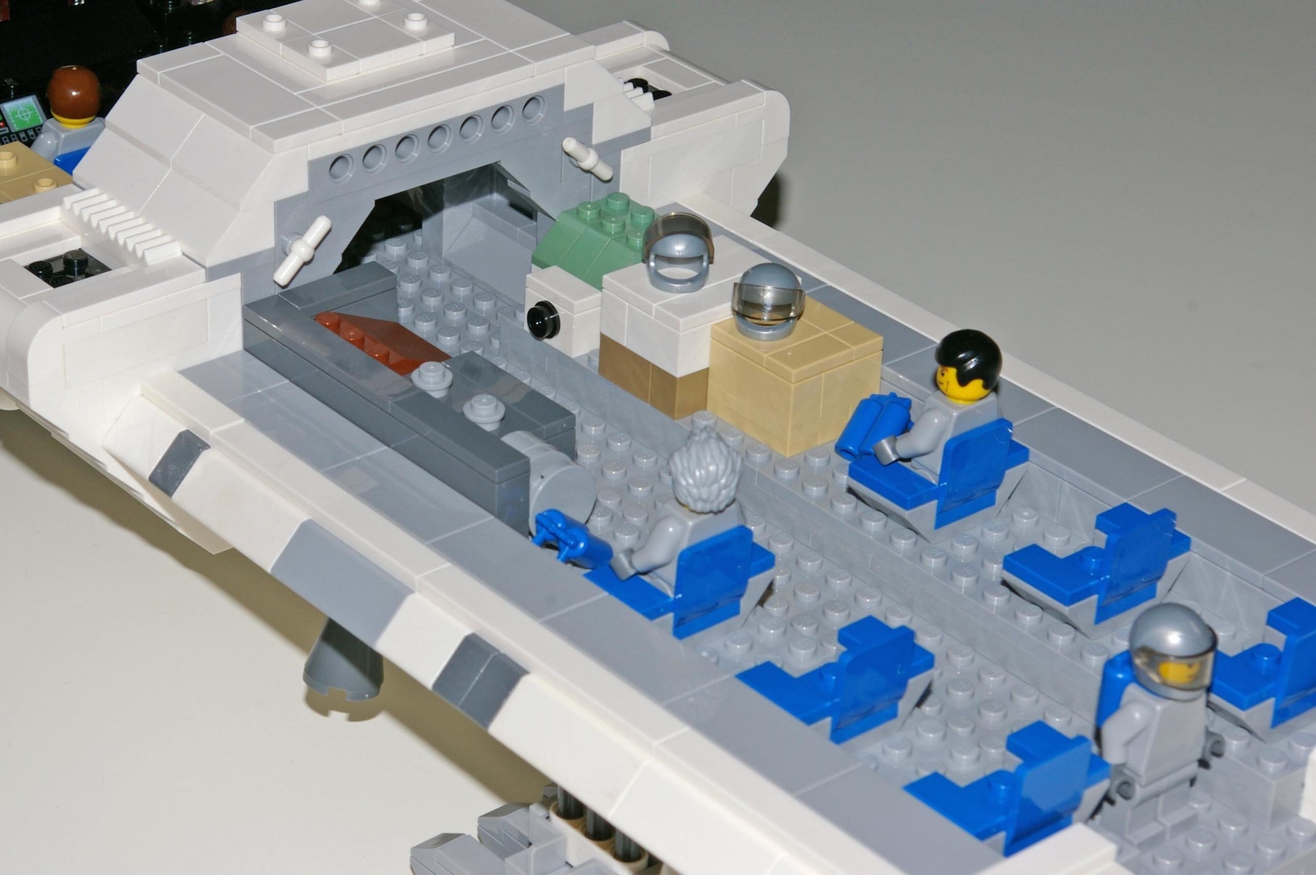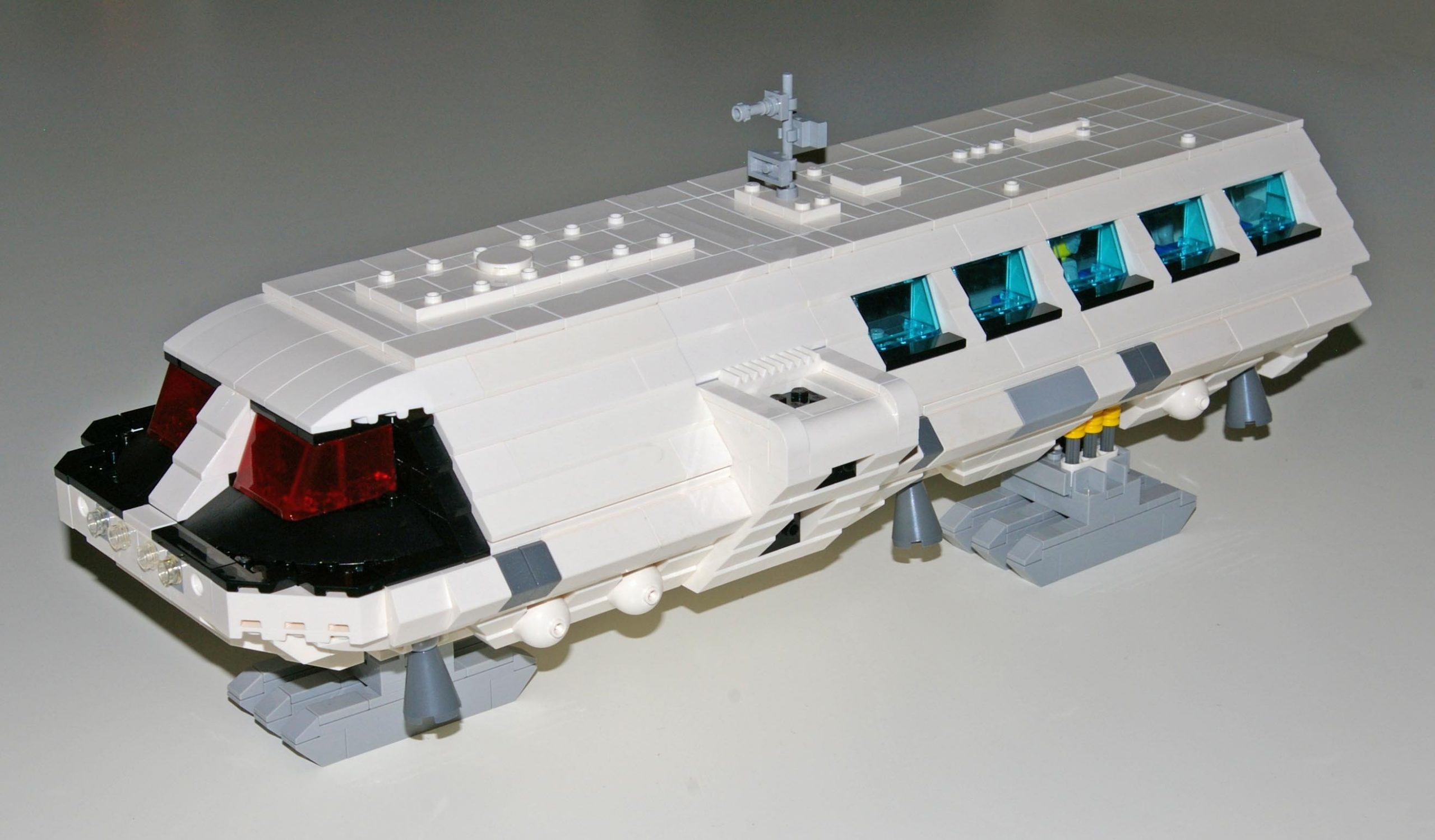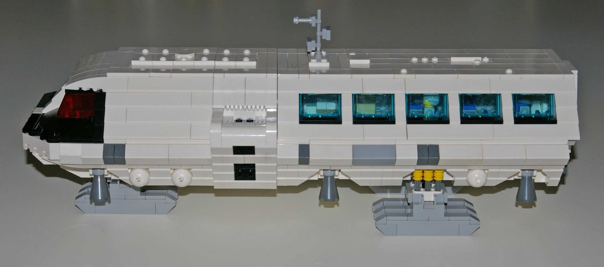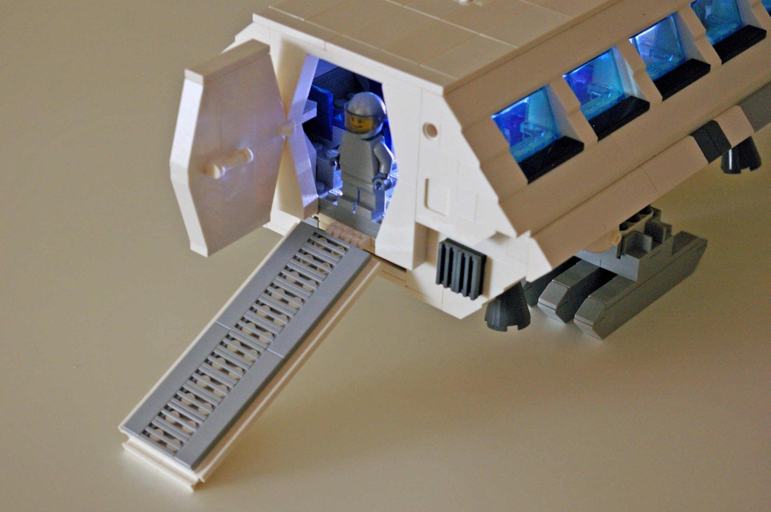 Today I am showing my largest model to date, the Moonbus from 2001: A Space Odyssey. I first designed it in 2016 and finally built it this year. The model is about 17″ long with over 1400 pieces (53 studs long, 24 studs wide). The scale is a bit bigger than Minifig scale, maybe 1:35 (normally I stay strictly to 1:39, so 1 stud=1 foot). The roof lifts off in two sections and the ramp stows neatly in the floor.