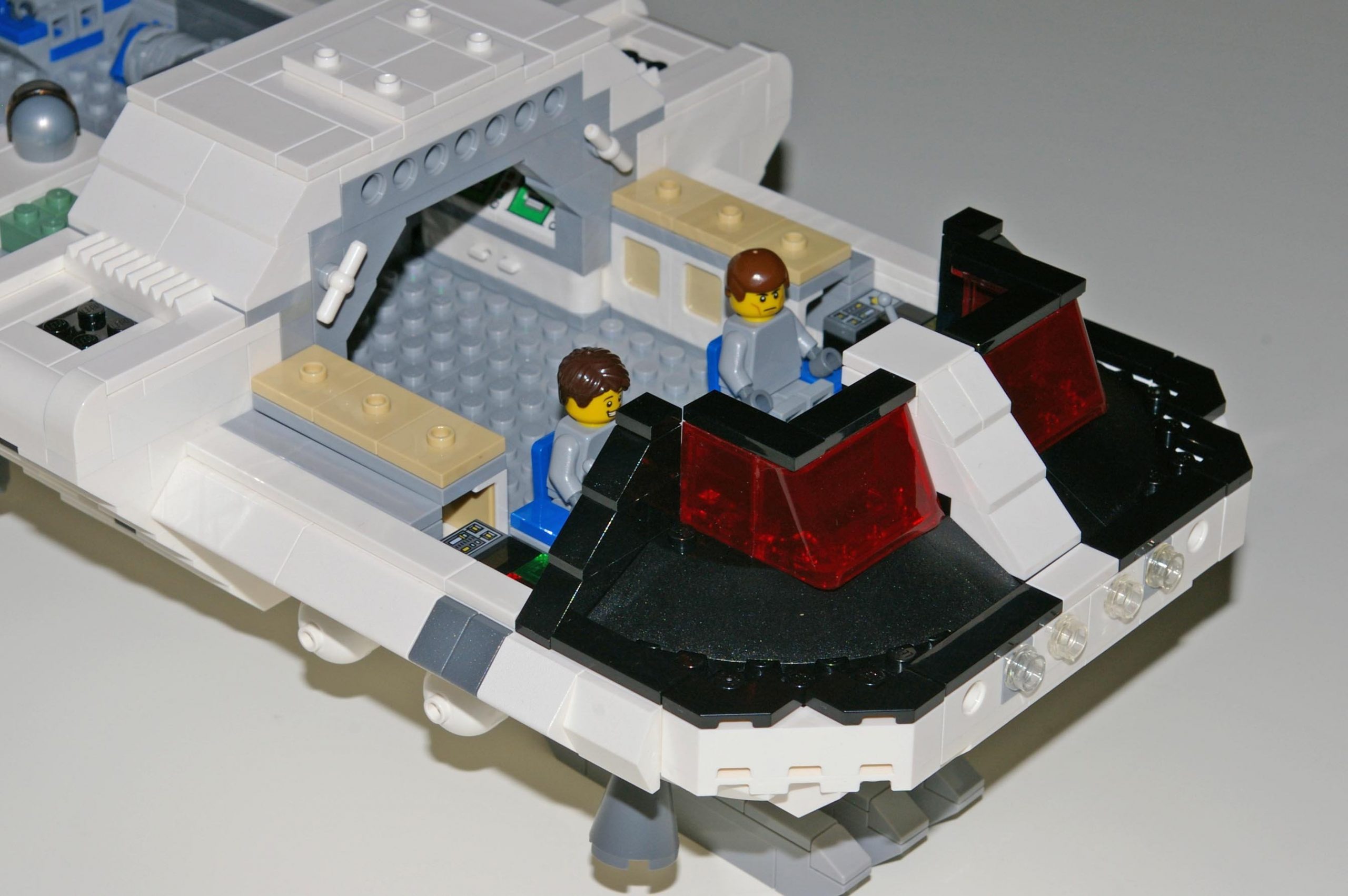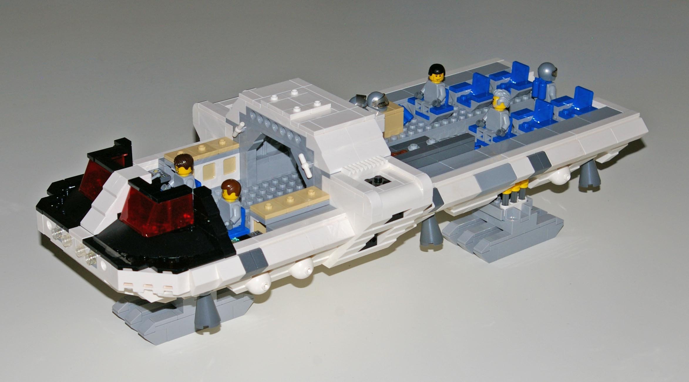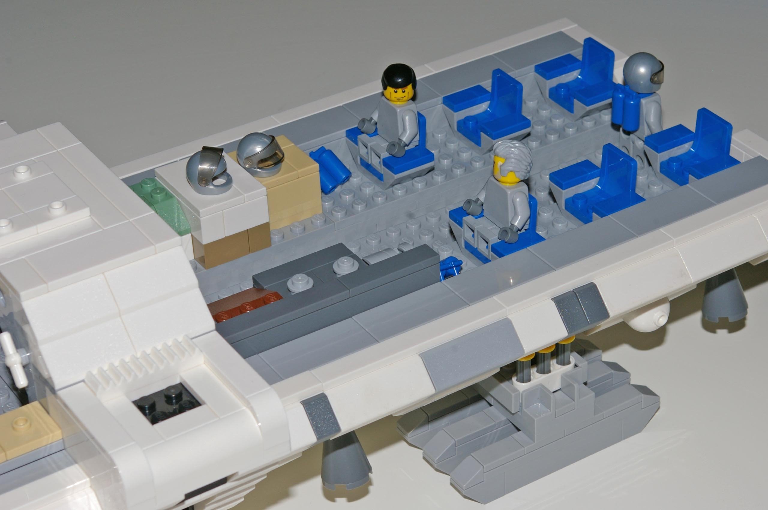 Today I am showing my largest model to date, the Moonbus from 2001: A Space Odyssey. I first designed it in 2016 and finally built it this year. The model is about 17″ long with over 1400 pieces (53 studs long, 24 studs wide). The scale is a bit bigger than Minifig scale, maybe 1:35 (normally I stay strictly to 1:39, so 1 stud=1 foot). The roof lifts off in two sections and the ramp stows neatly in the floor.