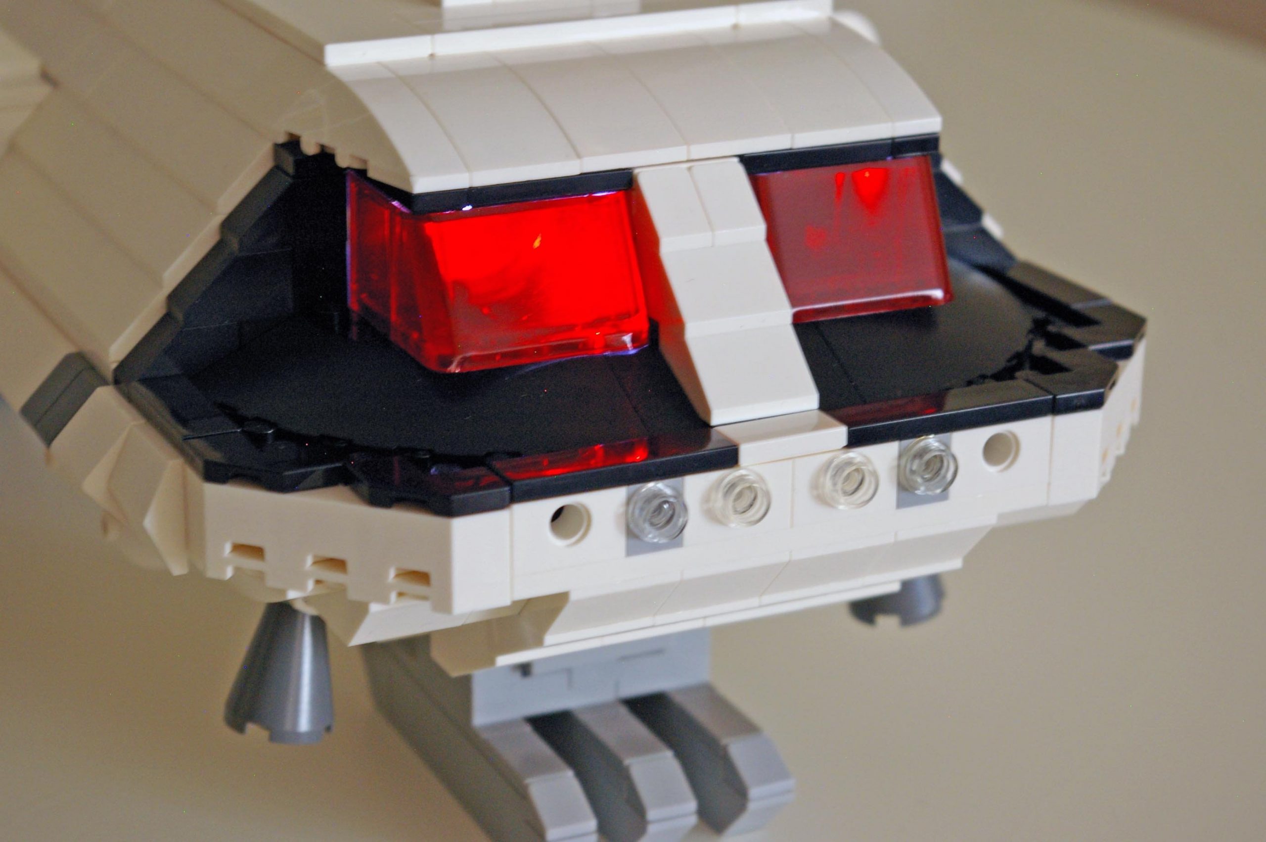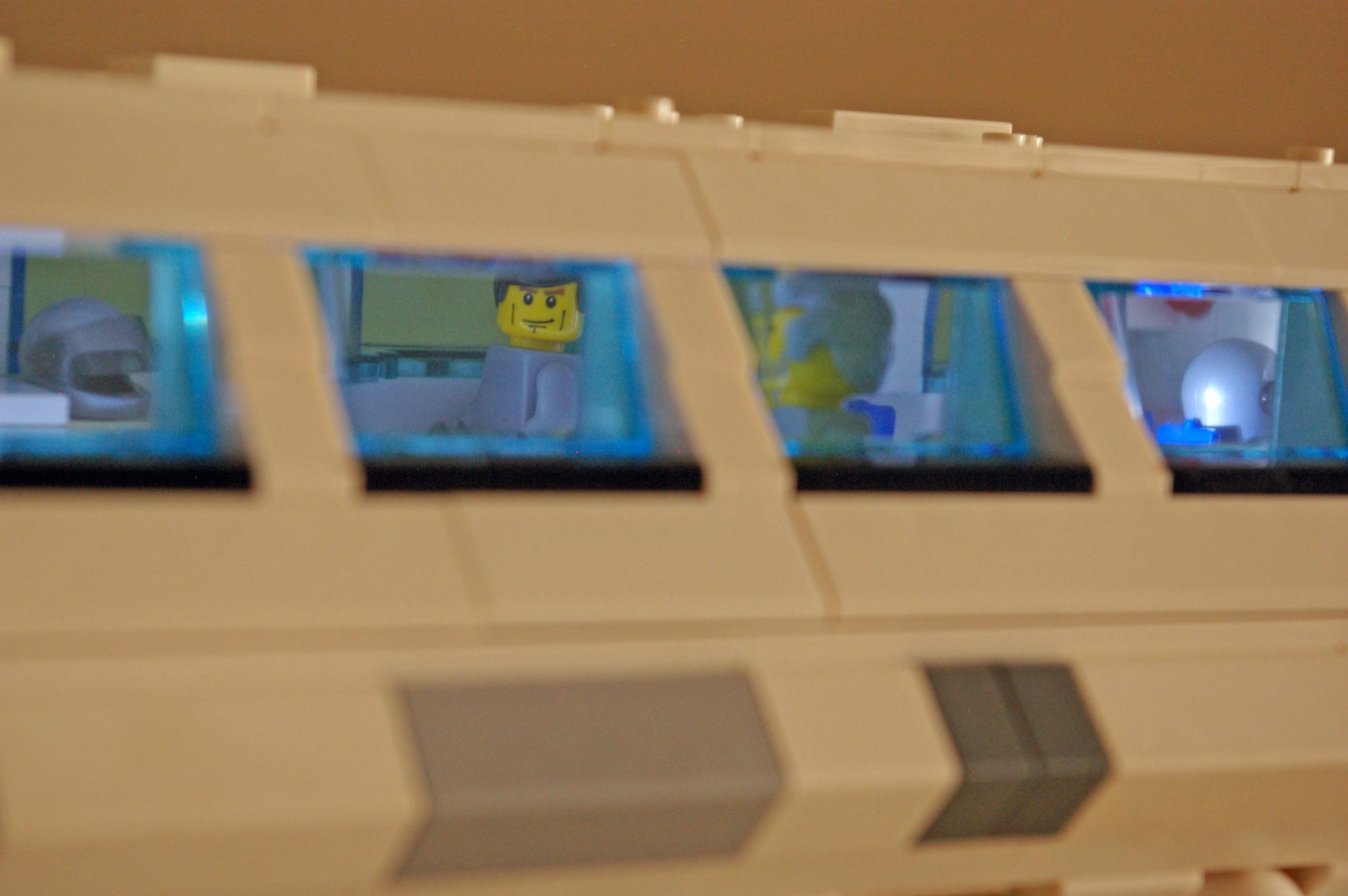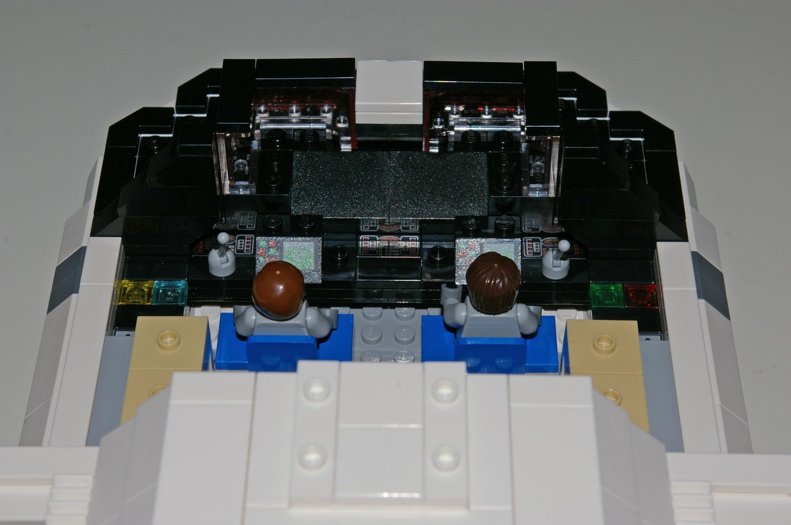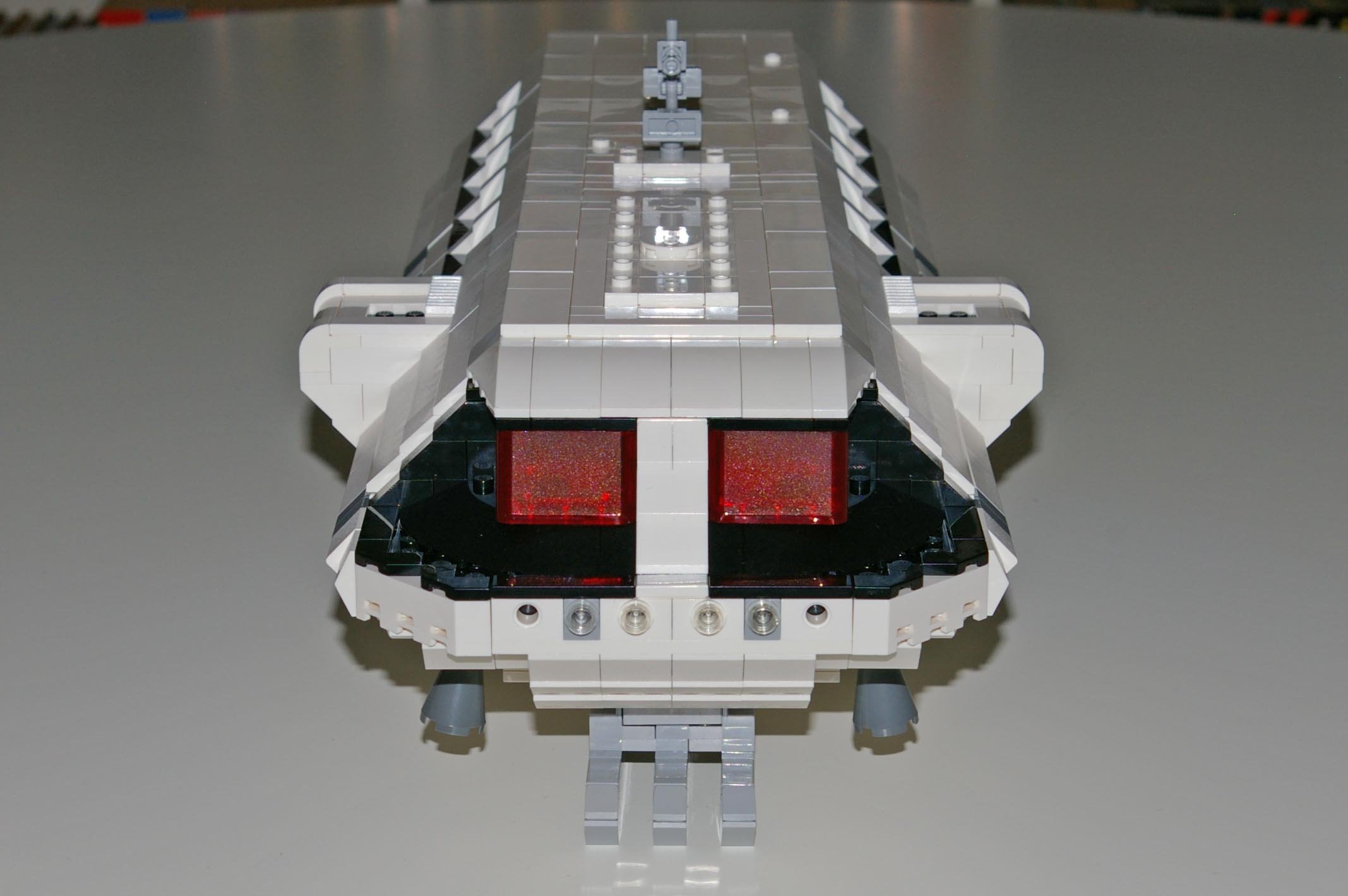 Today I am showing my largest model to date, the Moonbus from 2001: A Space Odyssey. I first designed it in 2016 and finally built it this year. The model is about 17″ long with over 1400 pieces (53 studs long, 24 studs wide). The scale is a bit bigger than Minifig scale, maybe 1:35 (normally I stay strictly to 1:39, so 1 stud=1 foot). The roof lifts off in two sections and the ramp stows neatly in the floor.