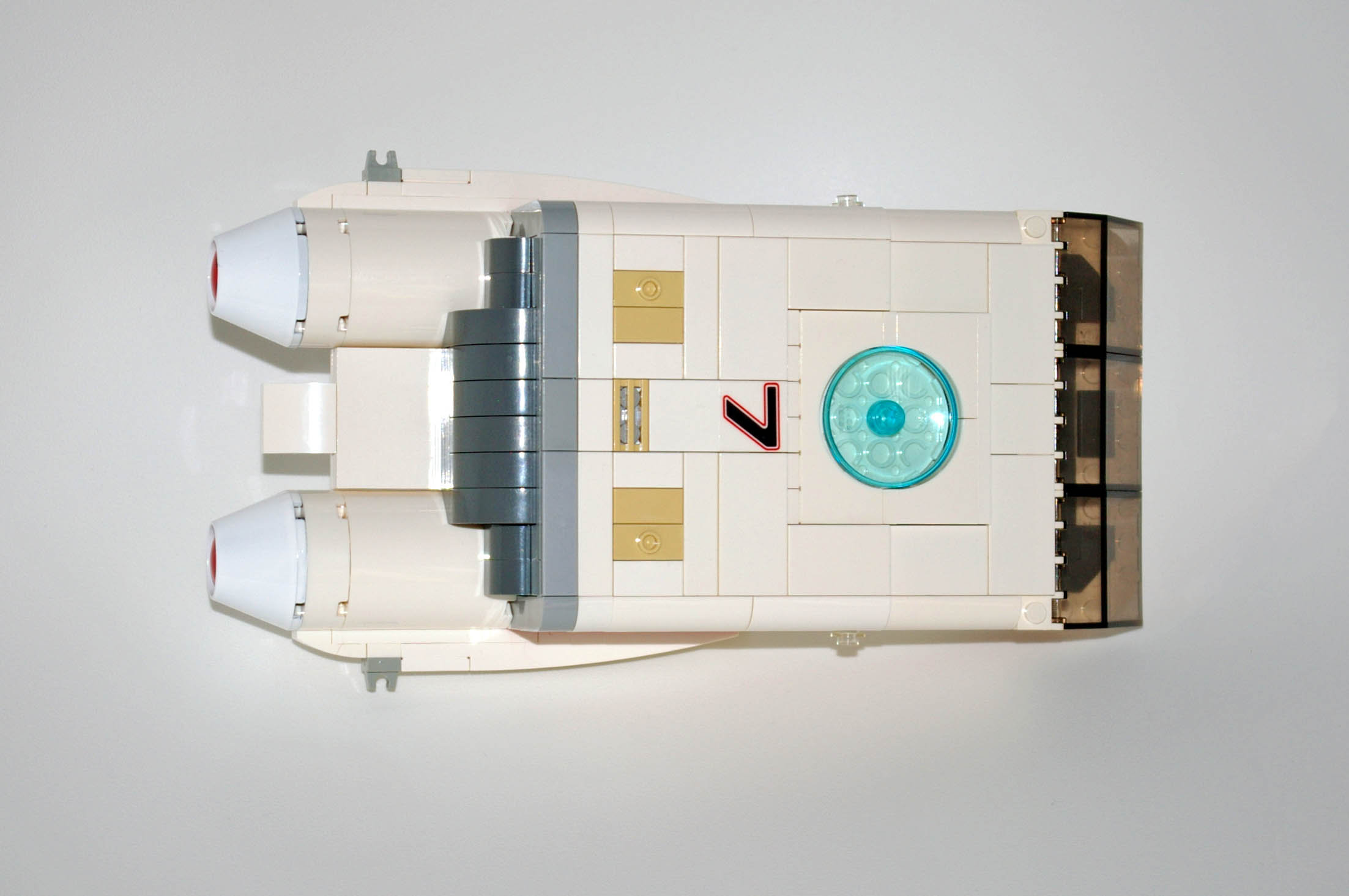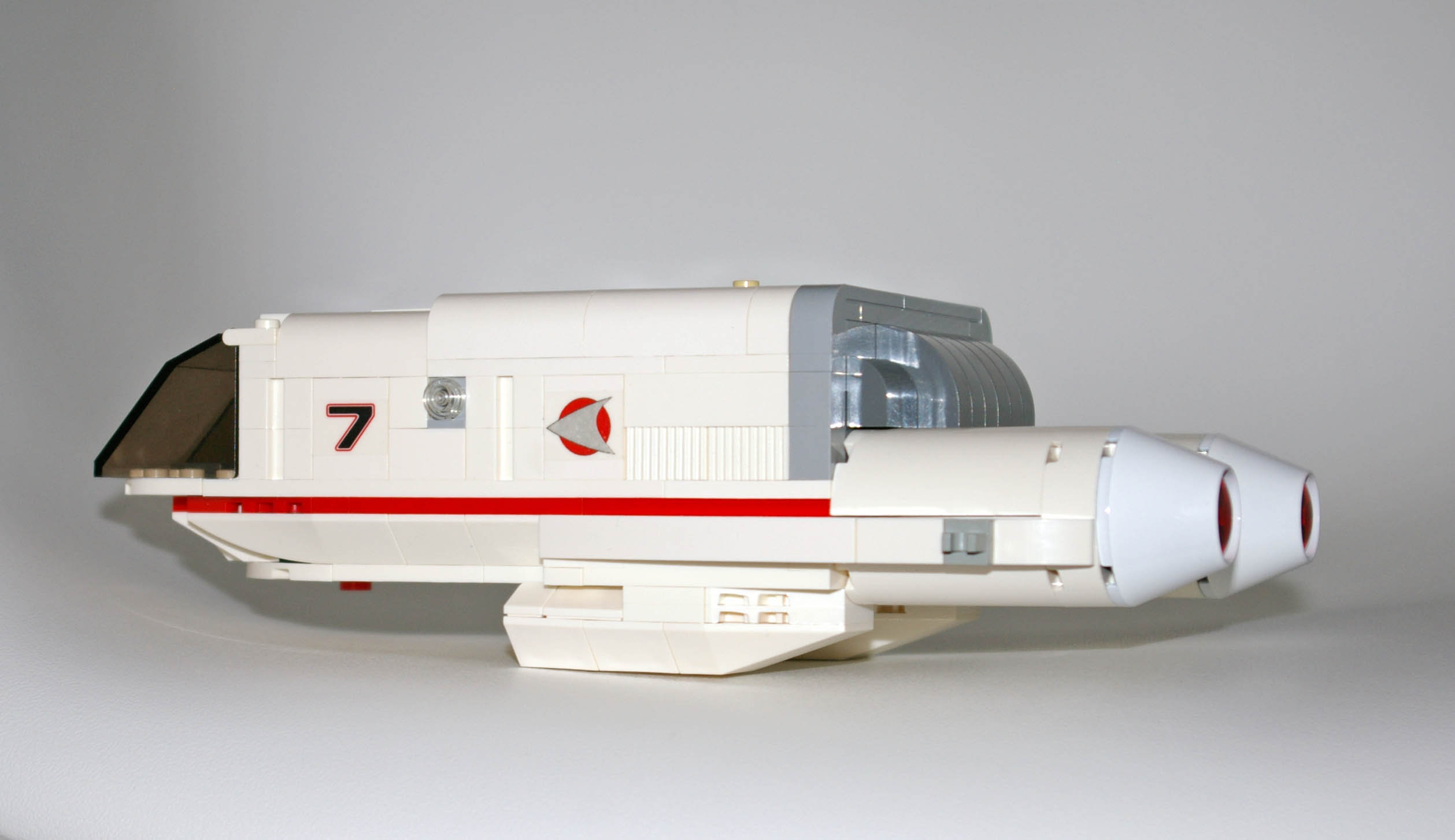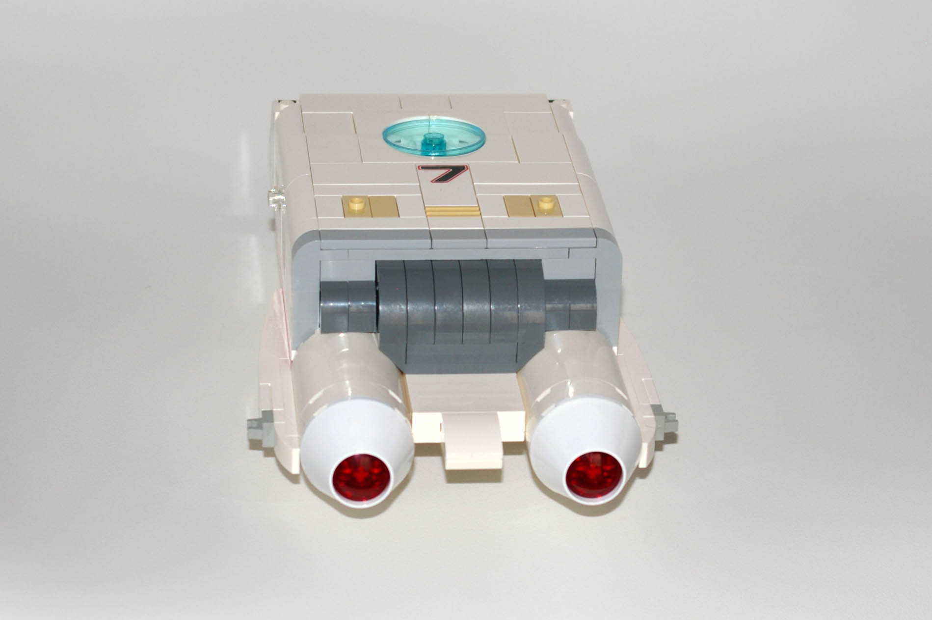 This is the Spacedock Tug / Orbital Shuttle first seen in Star Trek III in 1984. I first made a version of this craft in 2013 in Lego Digital Designer, but completely revised it in 2019 for a real-life build. It is a challenging model to capture accurately in bricks, given the many complex curves. It is minifig scale (about 1:39) and, given its small size, totally swooshable with one hand (sound effects optional). With two custom figures it is 322 pieces, measuring 28 studs in length (about 8.8″ or 22 cm).