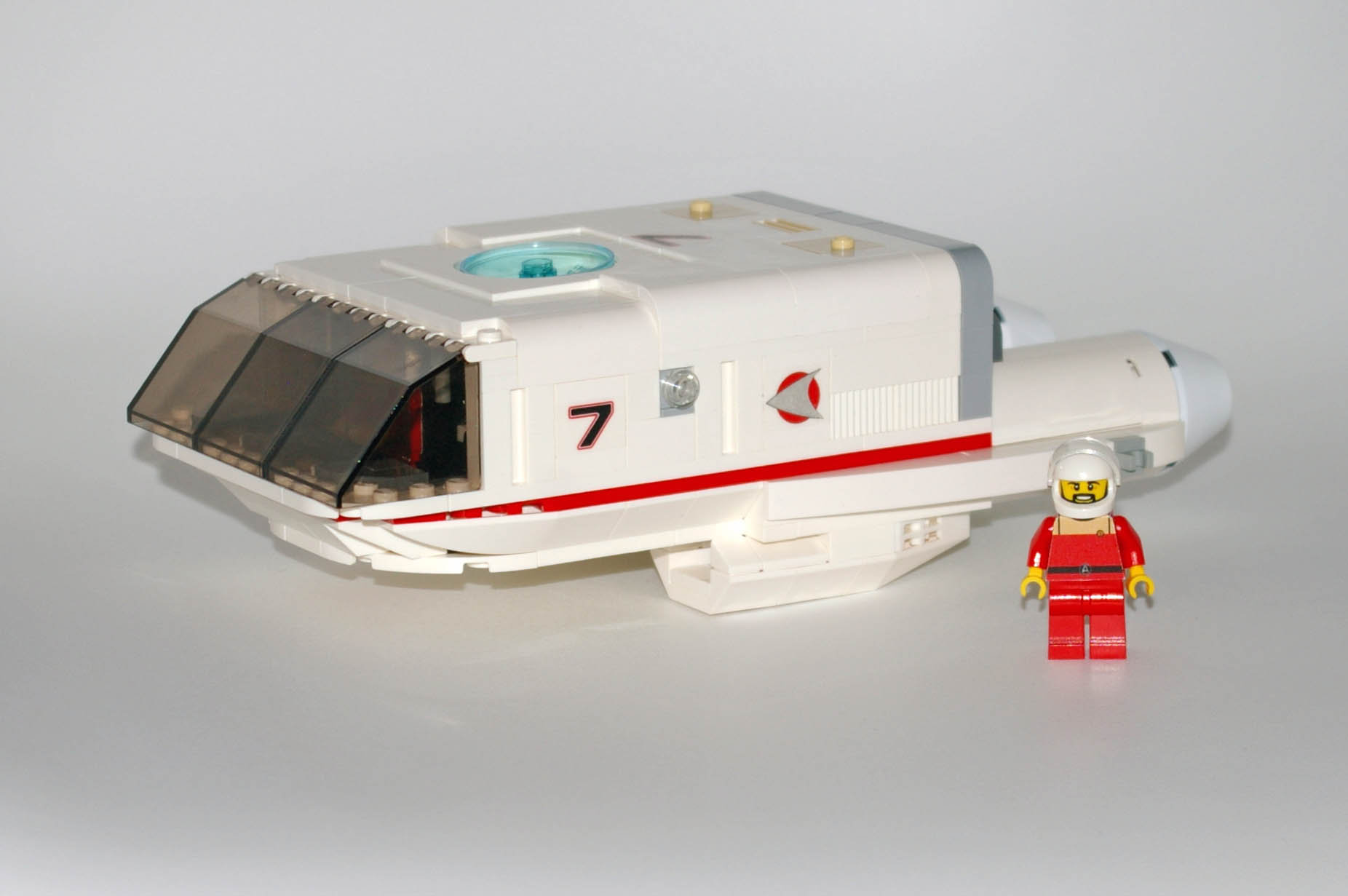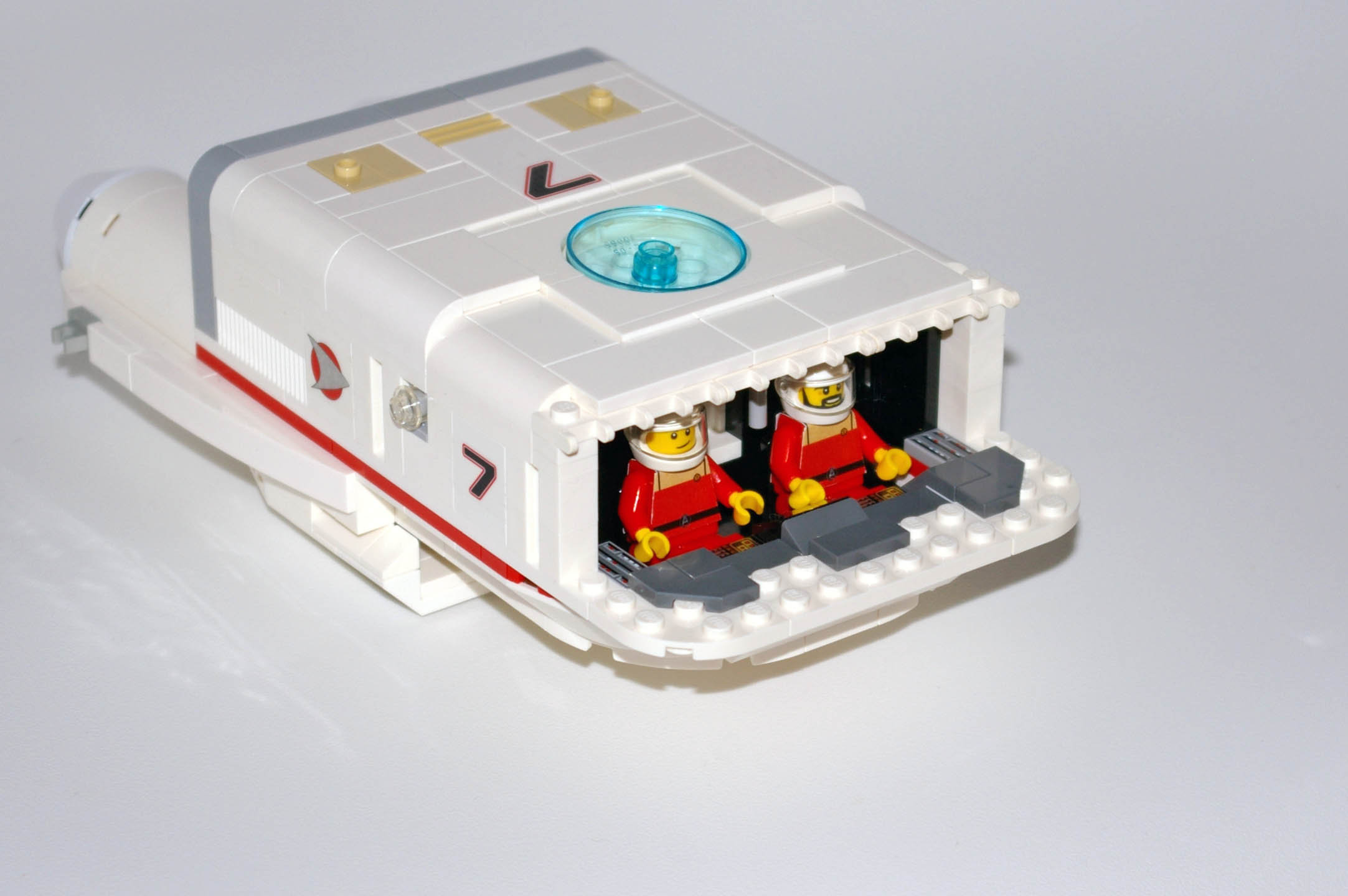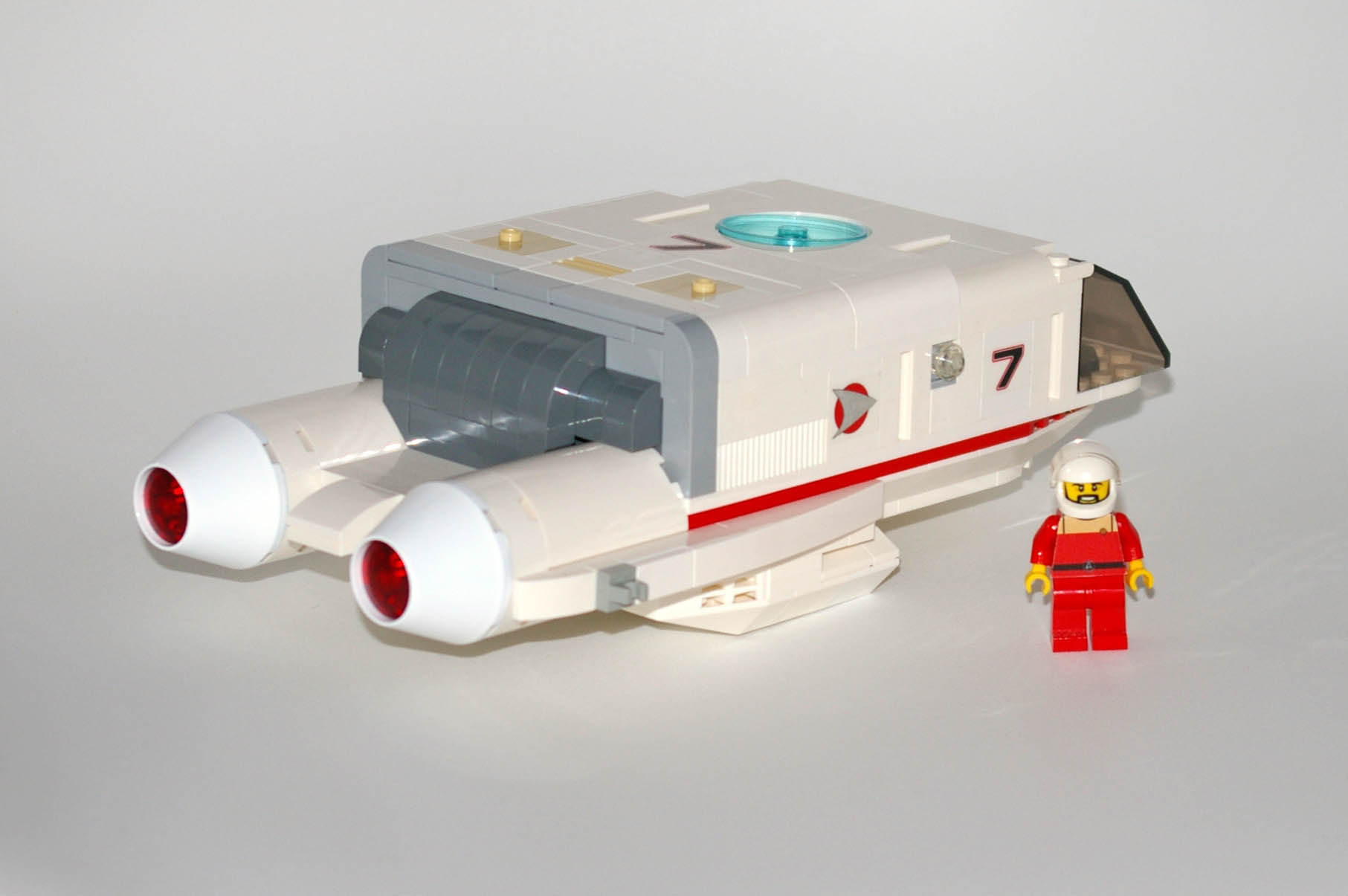 This is the Spacedock Tug / Orbital Shuttle first seen in Star Trek III in 1984. I first made a version of this craft in 2013 in Lego Digital Designer, but completely revised it in 2019 for a real-life build. It is a challenging model to capture accurately in bricks, given the many complex curves. It is minifig scale (about 1:39) and, given its small size, totally swooshable with one hand (sound effects optional). With two custom figures it is 322 pieces, measuring 28 studs in length (about 8.8″ or 22 cm).