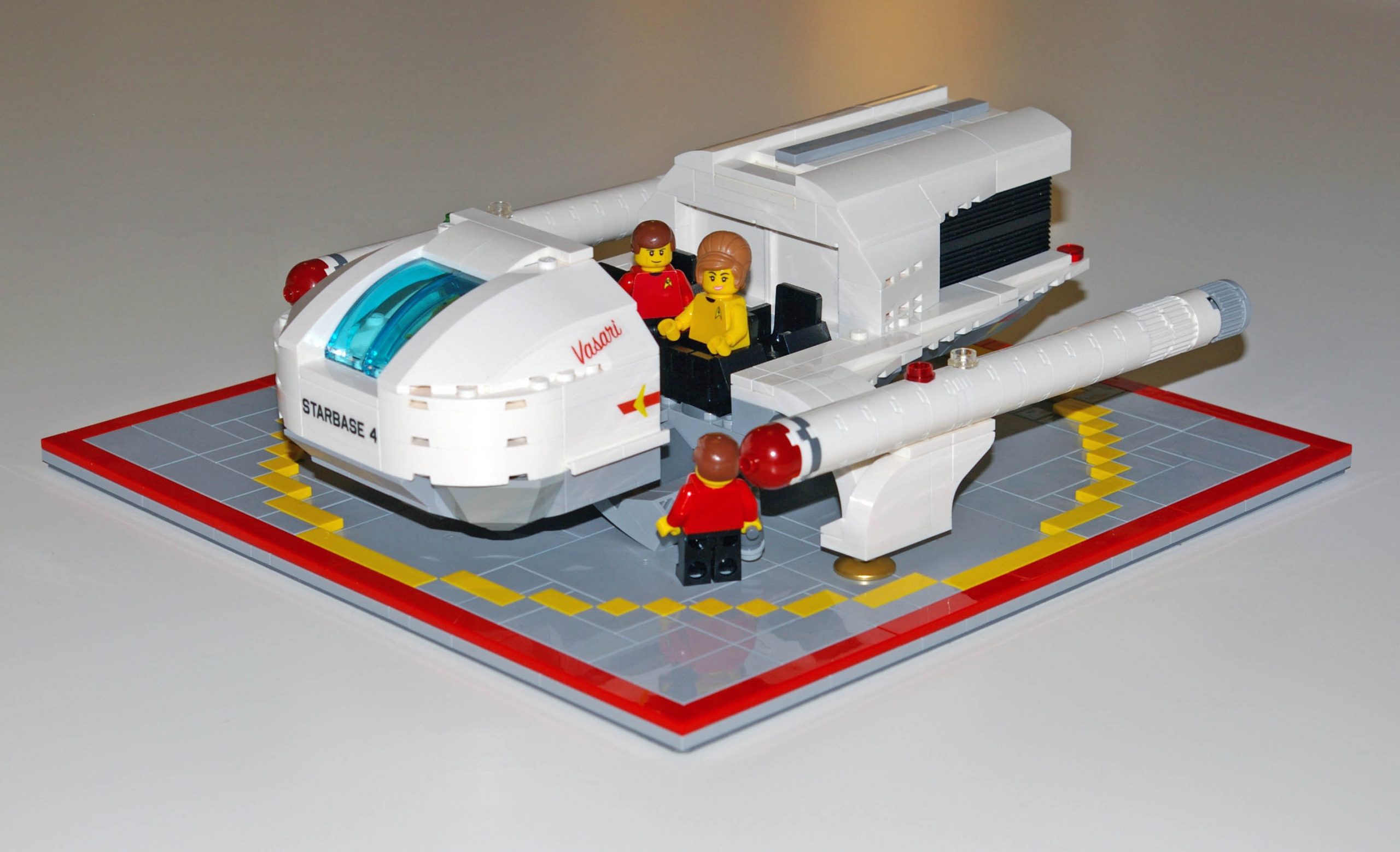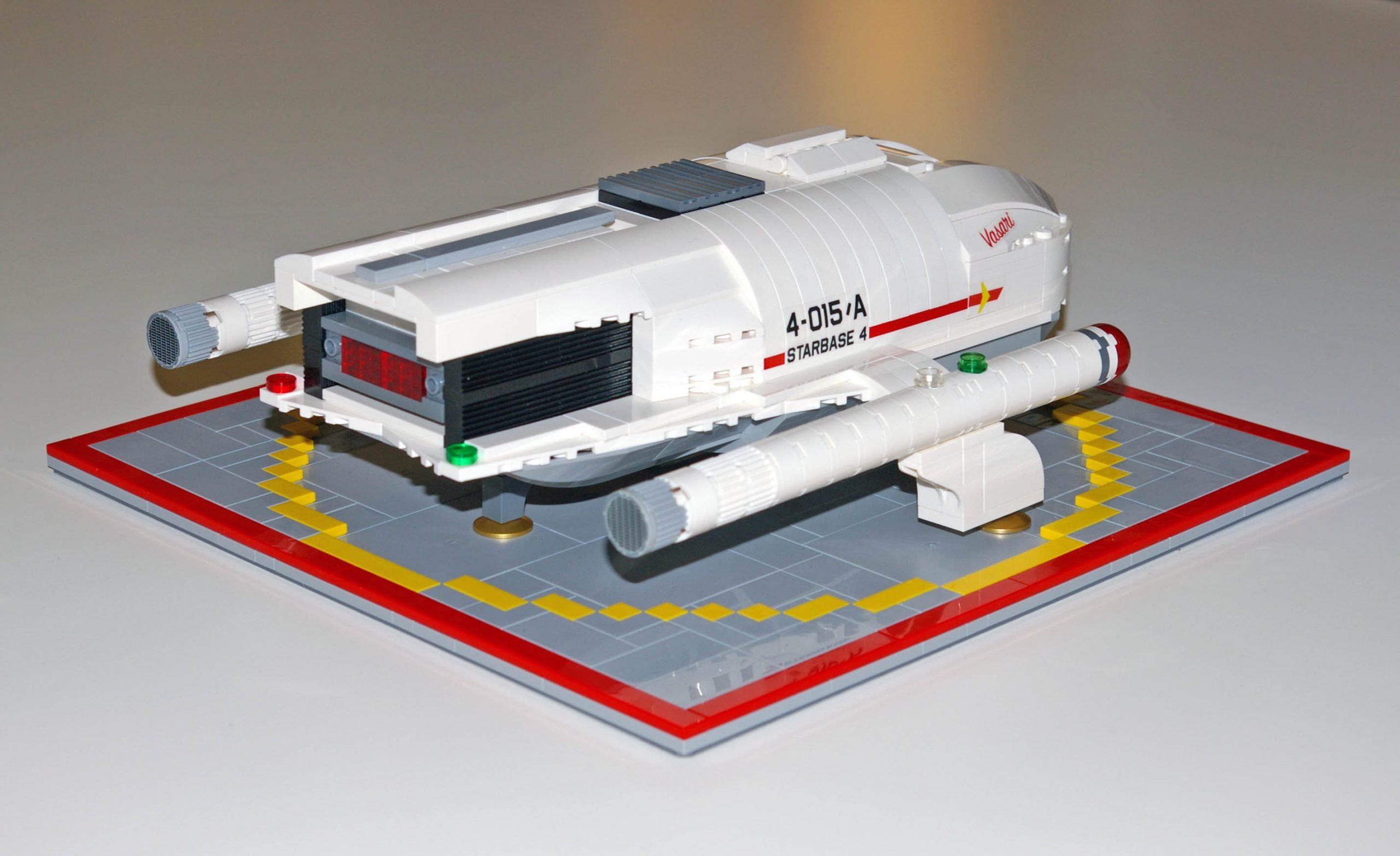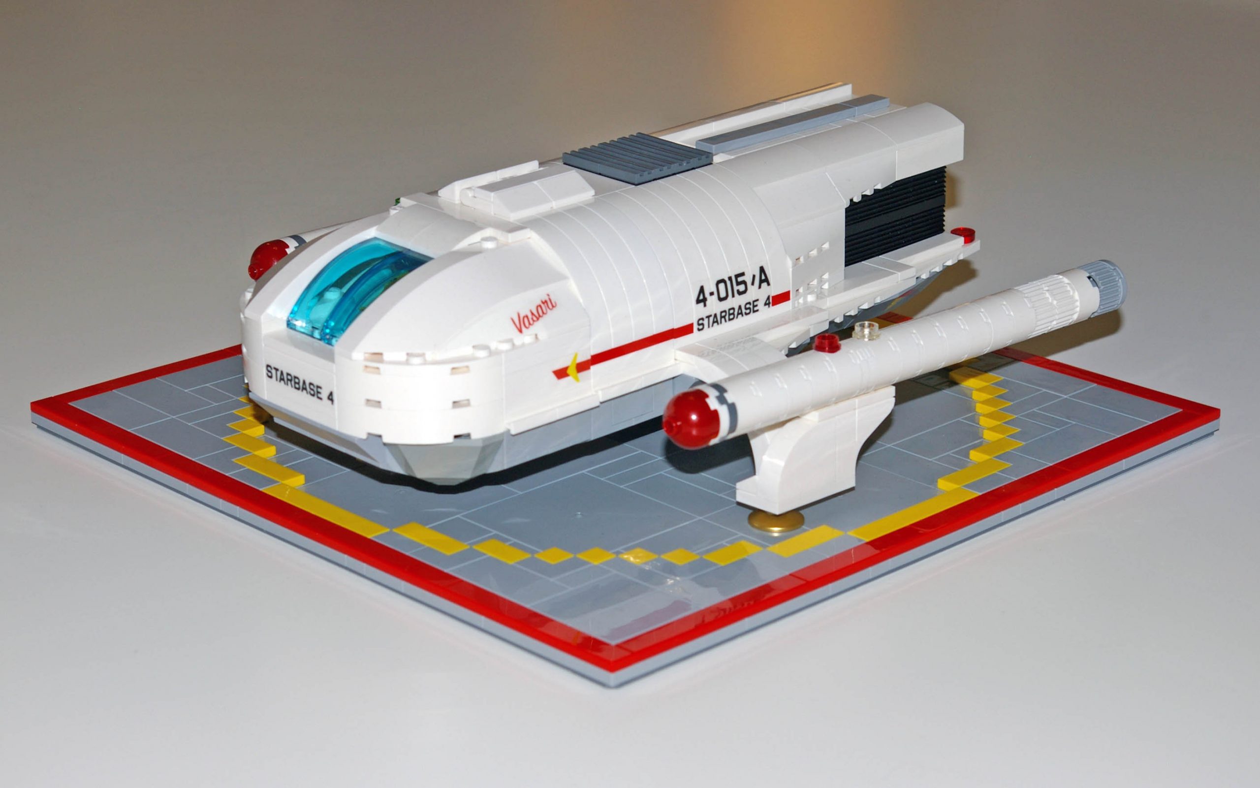 This craft is based on the original concept sketches by Matt Jefferies, which were abandoned due to the cost of constructing complex curves on a TV budget. First designed as a digital model in 2010, it was built in 2019 with minor changes to fit the scale of the boxy Class F shuttle (and to fit on the landing pad). The cabin accommodates five with a clamshell hatch, and the roof can be removed for access. Unlike the Class F shuttle there is no bathroom or engineering bay, but a much larger warp core and impulse manifold, providing greater delta-V and better atmospheric handling than other shuttle types. I chose the livery based on the “DaVinci” shuttle that appeared in the remastered episode “The Menagerie”.