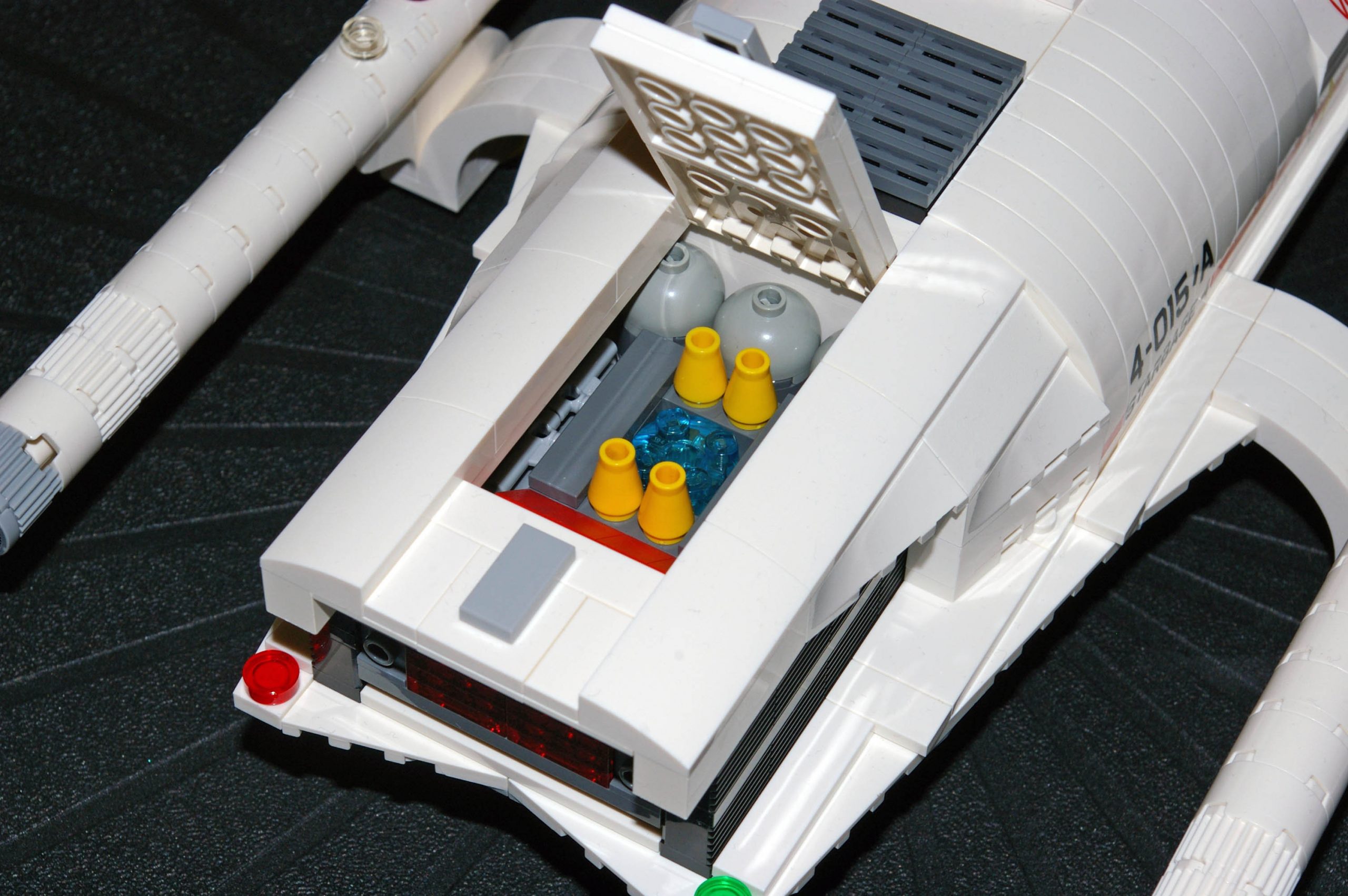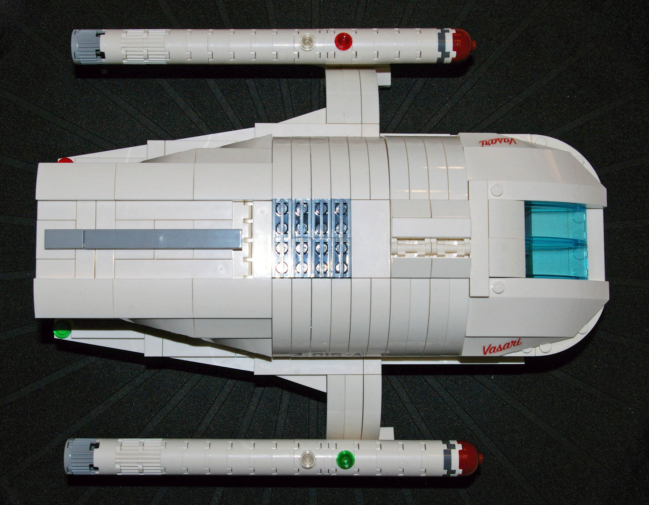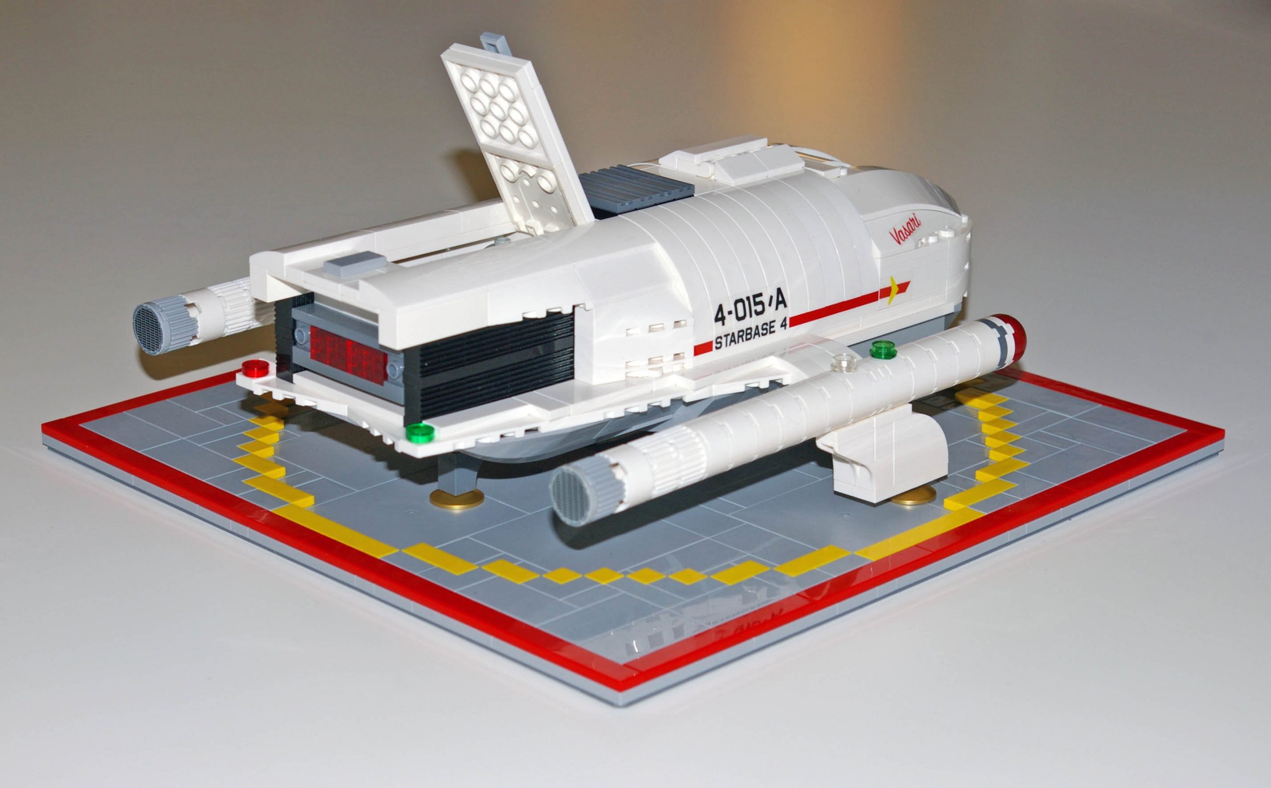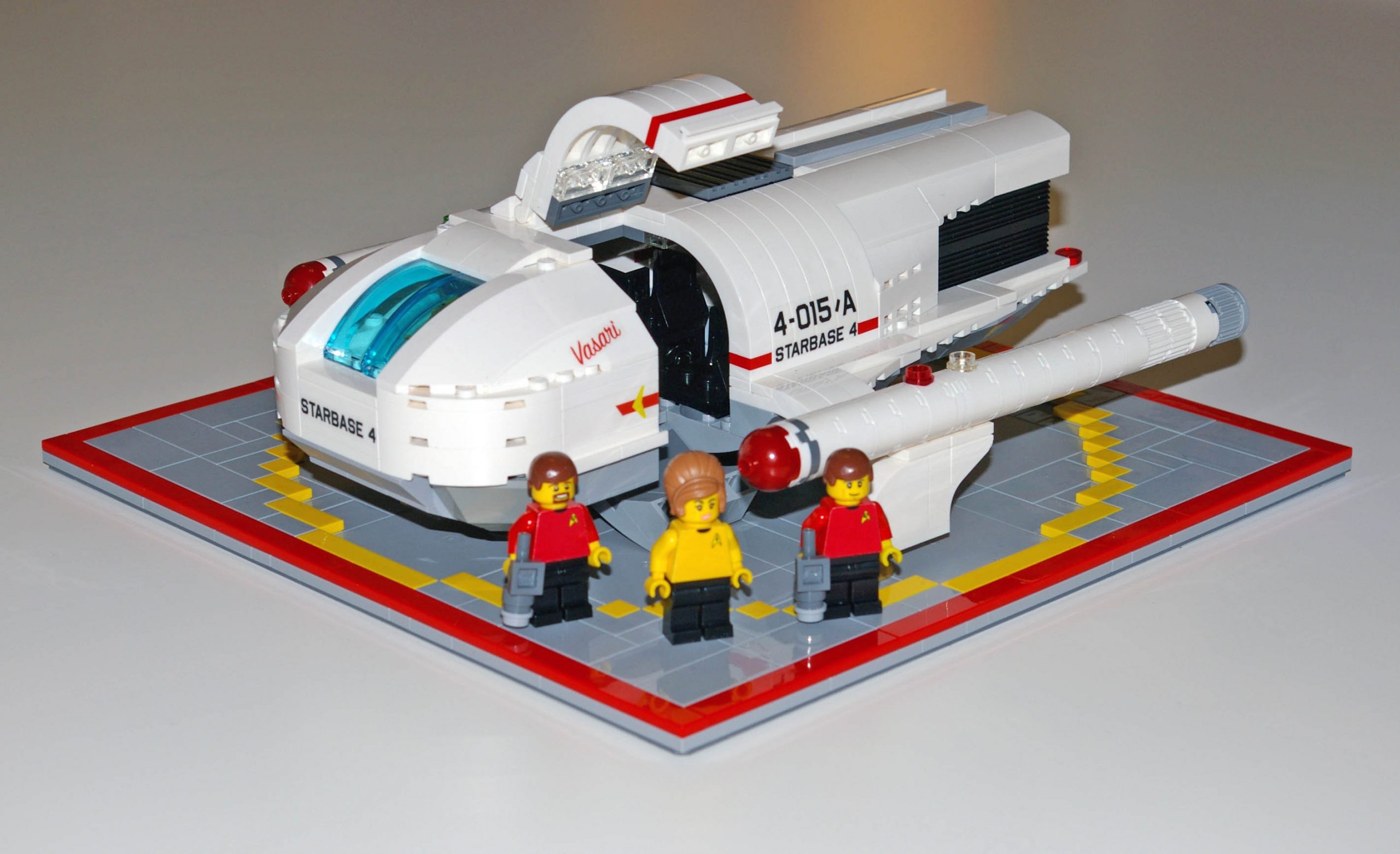 This craft is based on the original concept sketches by Matt Jefferies, which were abandoned due to the cost of constructing complex curves on a TV budget. First designed as a digital model in 2010, it was built in 2019 with minor changes to fit the scale of the boxy Class F shuttle (and to fit on the landing pad). The cabin accommodates five with a clamshell hatch, and the roof can be removed for access. Unlike the Class F shuttle there is no bathroom or engineering bay, but a much larger warp core and impulse manifold, providing greater delta-V and better atmospheric handling than other shuttle types. I chose the livery based on the “DaVinci” shuttle that appeared in the remastered episode “The Menagerie”.